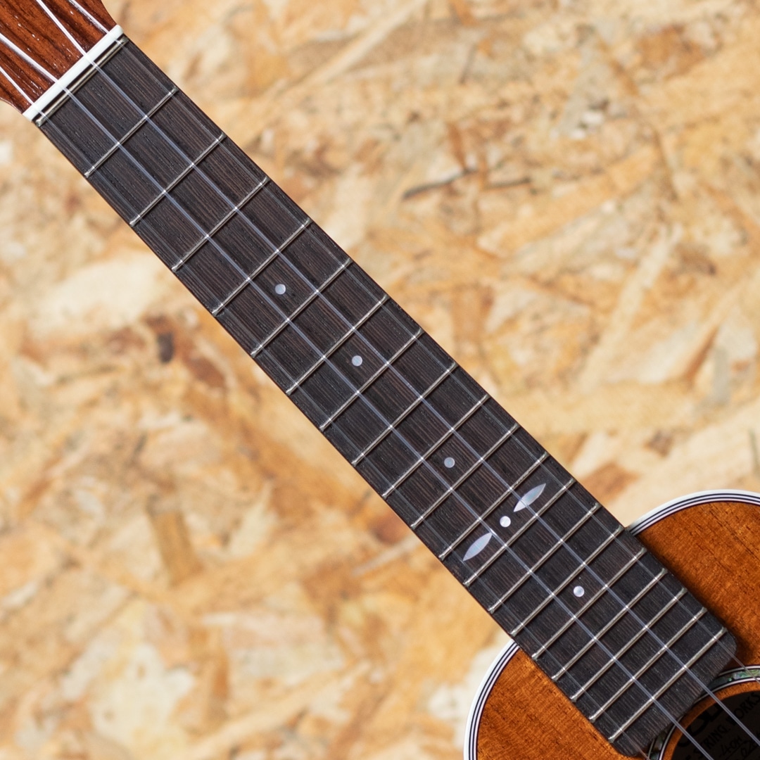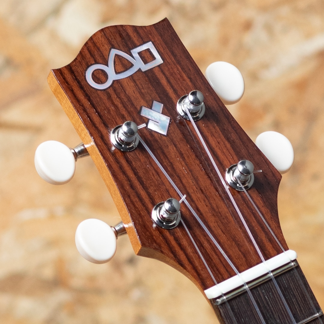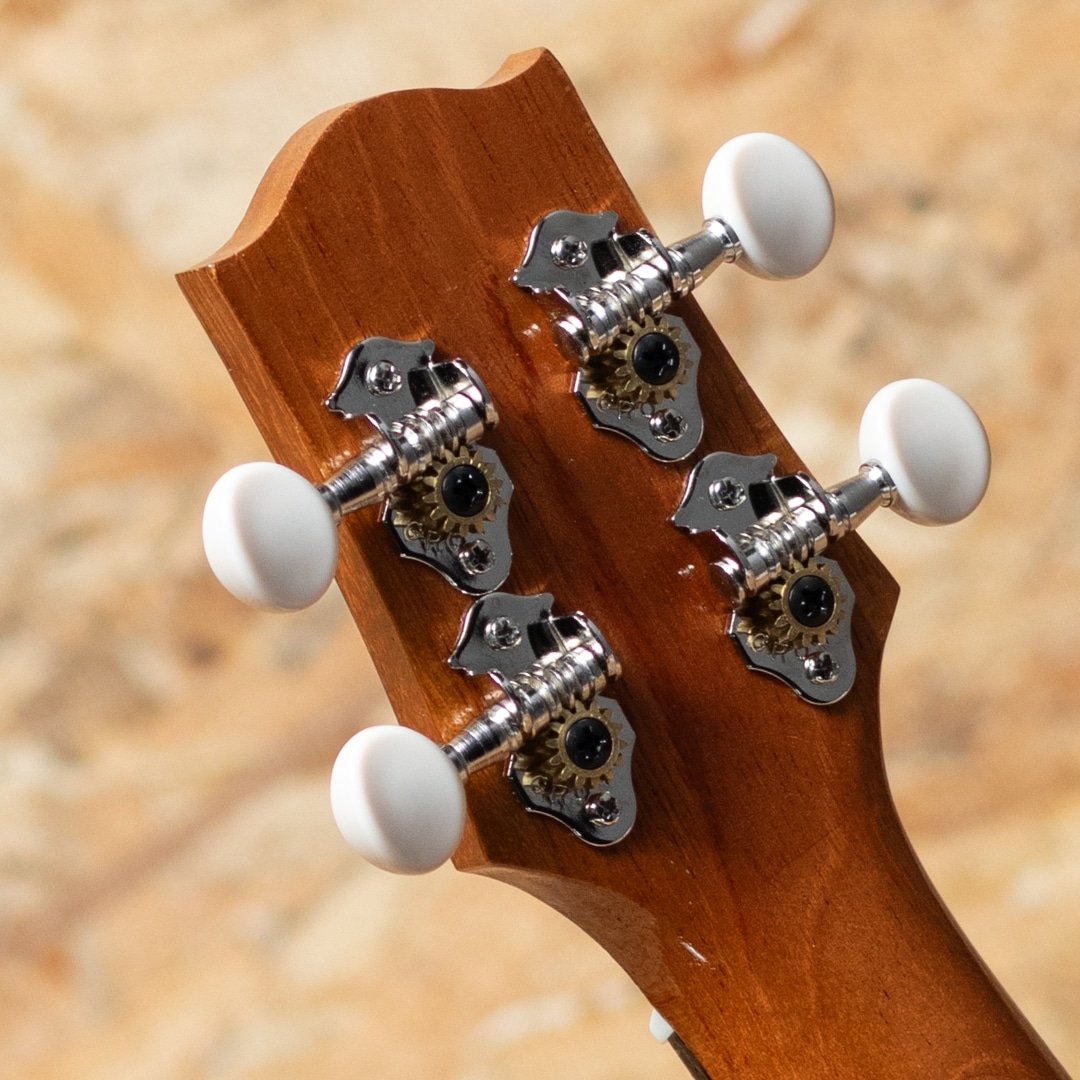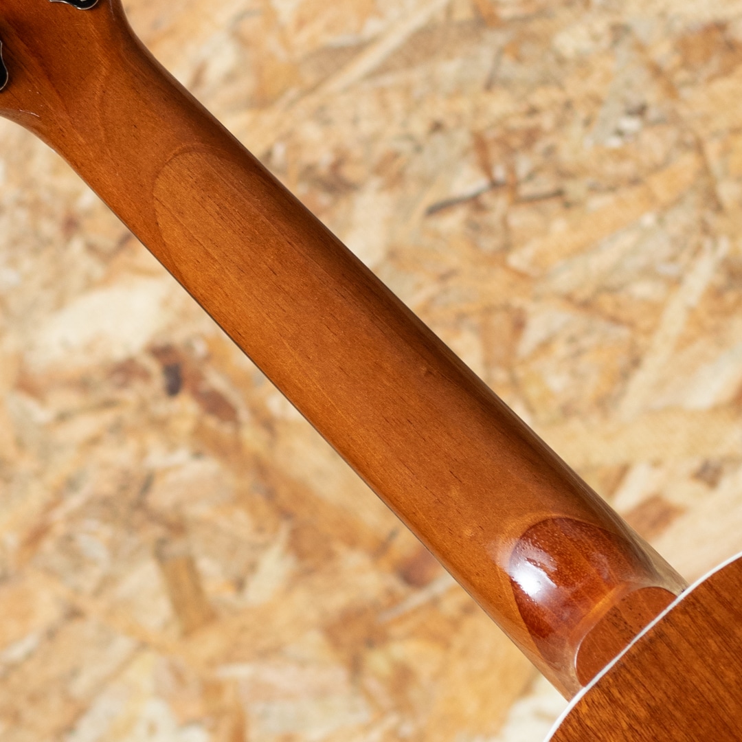 京都市の工房にて占部英明氏、息子の直宏氏によって製作される完全ハンドメイドウクレレ。本器はホンジュラス・マホガニーボディのソプラノモデル。ホンジュラスマホガニーネック、ウェンジ指板、ローズウッドブリッジ、ホワイトボディバインディング、アバロンロゼッタ、指板12フレット上キャツアイインレイ、グローバー製ギヤペグ。占部ウクレレ特有のやや薄めで握り易いネックシェイプ、0フレット仕様でローポジションの弾き易さは格別。ホンジュラスマホガニーの軽やかで軽快な響きとソプラノらしいコロコロとした雰囲気の音色の1本。ボディの大きさ、スケール等、扱い易いサイズ感ですので、女性の方にもオススメです。