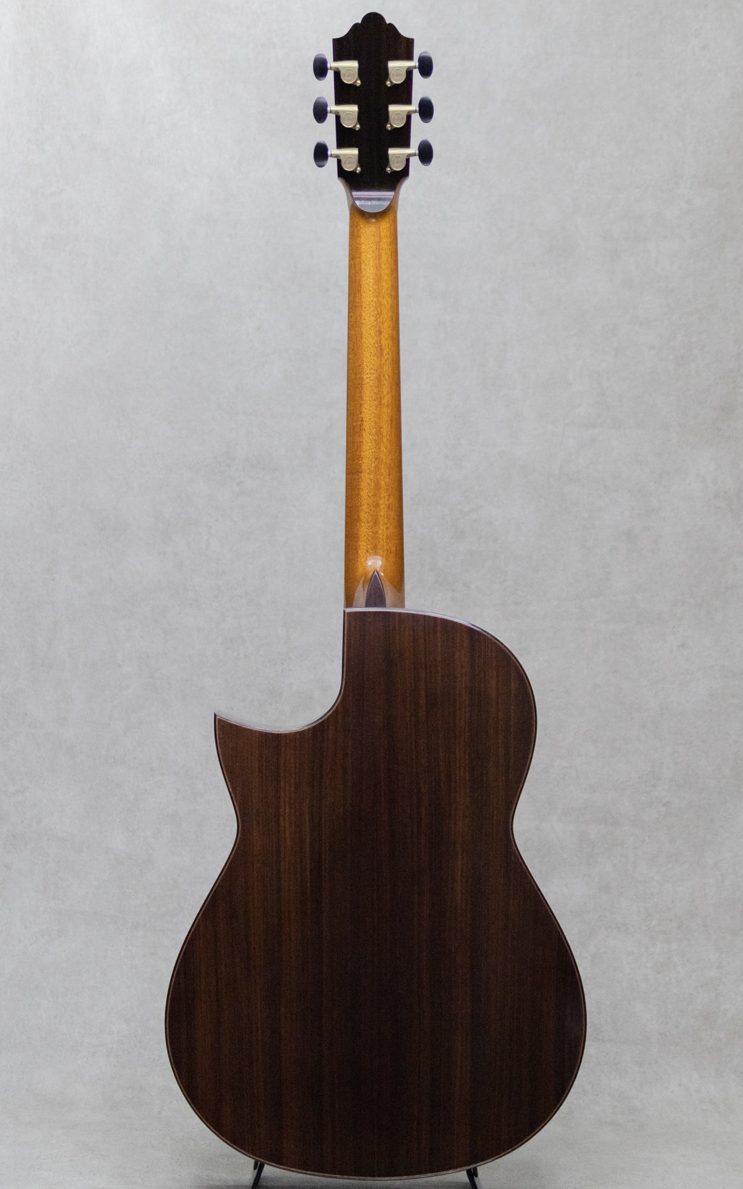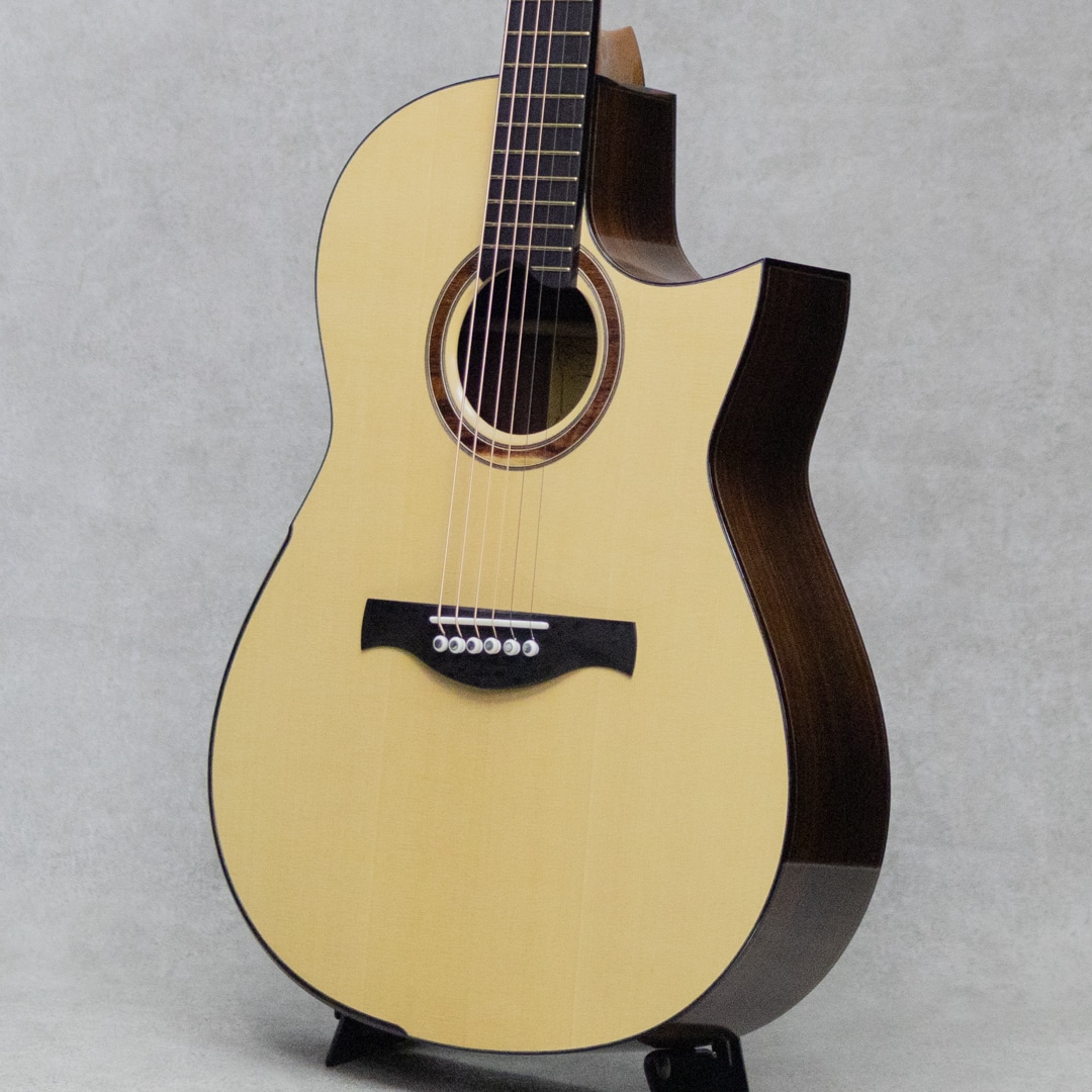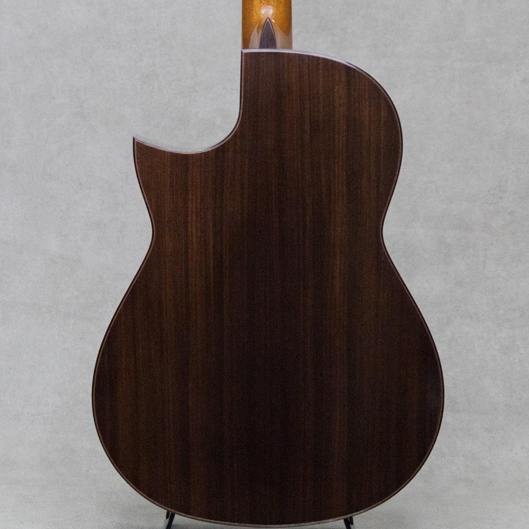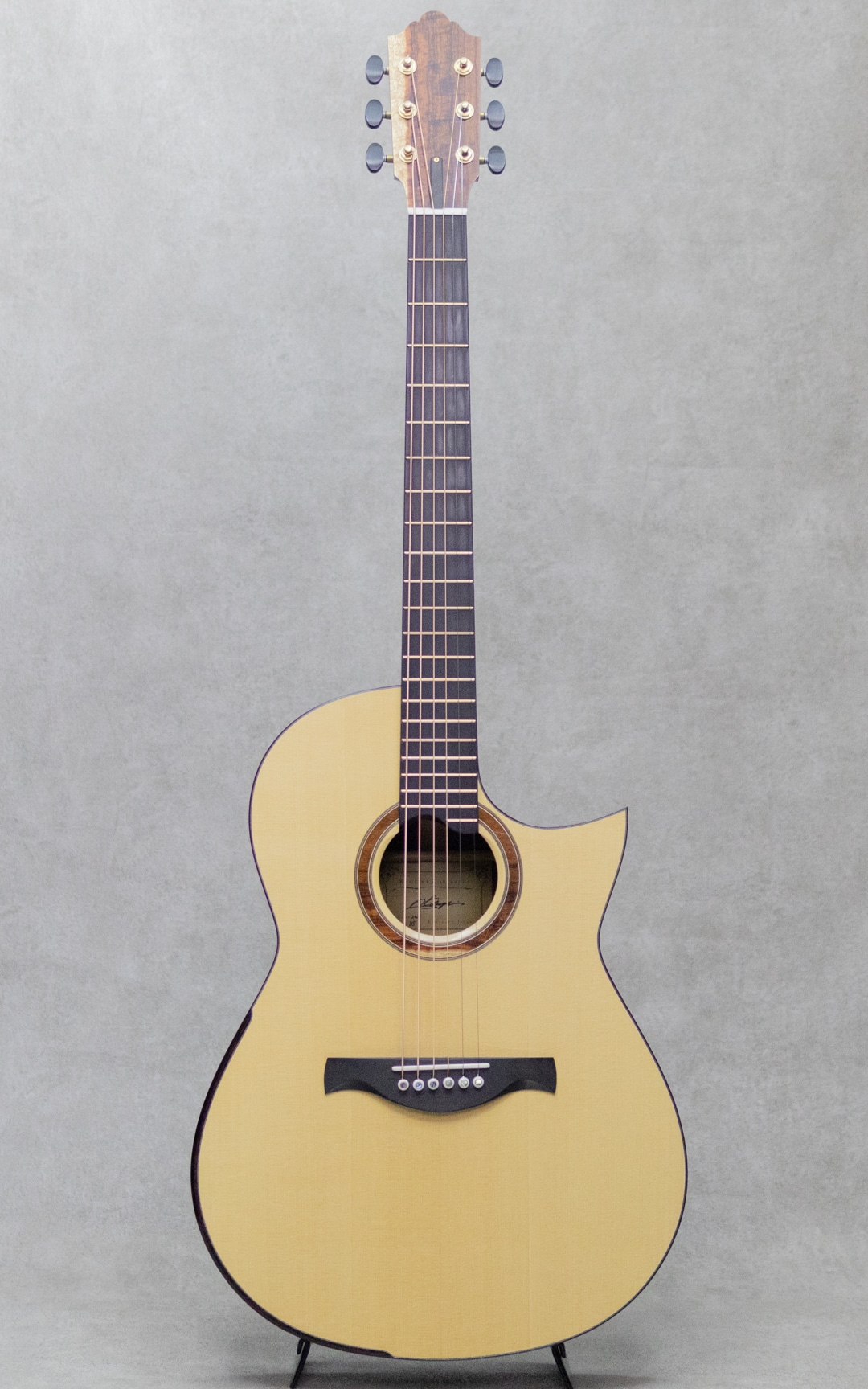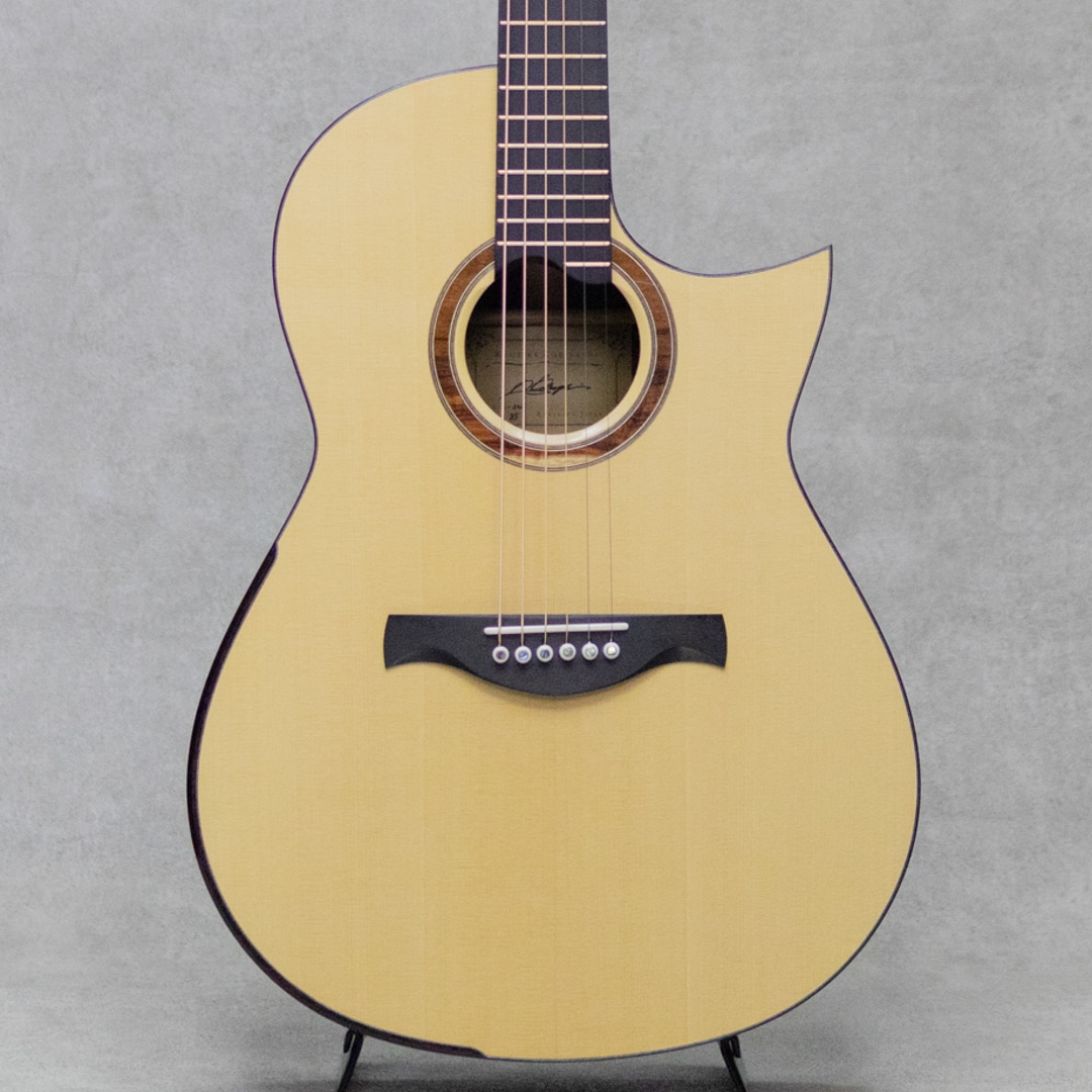 神奈川・相模原にて小林良輔氏により製作されるRyosuke Kobayashi Guitars。氏は数々の著名な作家を輩出しているロバート・ベン・スクールでギター製作を学び、スギクラフト・杉田健司氏に師事。その後カナダのマスタールシアー、サーゲ・デ・ヤングの所でさらに業を磨き、現在の工房を開設。さらなる高みを目指し日々実直に優れたギターの製作に勤しんでいます。本器は氏の最新作、”OO Cutaway”。サイドサウンドポート、マイクロアームレストを備えたOOカッタウェイモデル。トップは全面に柾目杢の浮き出た柔らかな表情のアラスカンイエローシダー、サイド&バックには美しく端正な杢目のインディアンローズウッドを使用。マホガニーネック、エボニー指板、エボニーブリッジ、フィギュアド杢が美しいグラナディロヘッドトップ天神板、ゴトー510ペグ、エボニーノブ、グラナディロロゼッタ、マッカーサーエボニーバインディング、クリアピックガード、サイドサウンドポート(オプション)、マイクロアームレスト(オプション)、オリジナルXブレイシング。ボディ塗装は小林ギターお得意、質の高いフレンチポリッシュ仕上げです。艶やかで密度の濃い倍音。耳障りでなく心地の良い高音。主張しすぎずしっかりと支えてくれる低音。OOサイズですが、軽くなくしっかりと太いミドルと心地よい低音感で、永くいつまでも弾いていたくなる、良き相棒を感じさせる1本です。セラック独特の過敏さは少なく弾きやすいバッファーを備えながら、そのレンジ感はラッカー塗装では得られない唯一無二な響き。繊細に生々しく、時にダイナミックでアグレッシブに、プレイヤーのタッチを立体的に表現してくれます。またサウンドと一緒に行き渡る木の香りも小林氏のこだわりで、小脇に抱え時間を忘れ浸り切れるまさに相棒。多くの知識と高い技術、そして豊富なキャリアから充実期を迎える小林良輔氏。アメリカ、カナダ、そして日本と、3カ国でギター造りを学んだ氏ならではの広い視点の1本。そのこだわりと情熱を、是非お手元でお確かめください。
