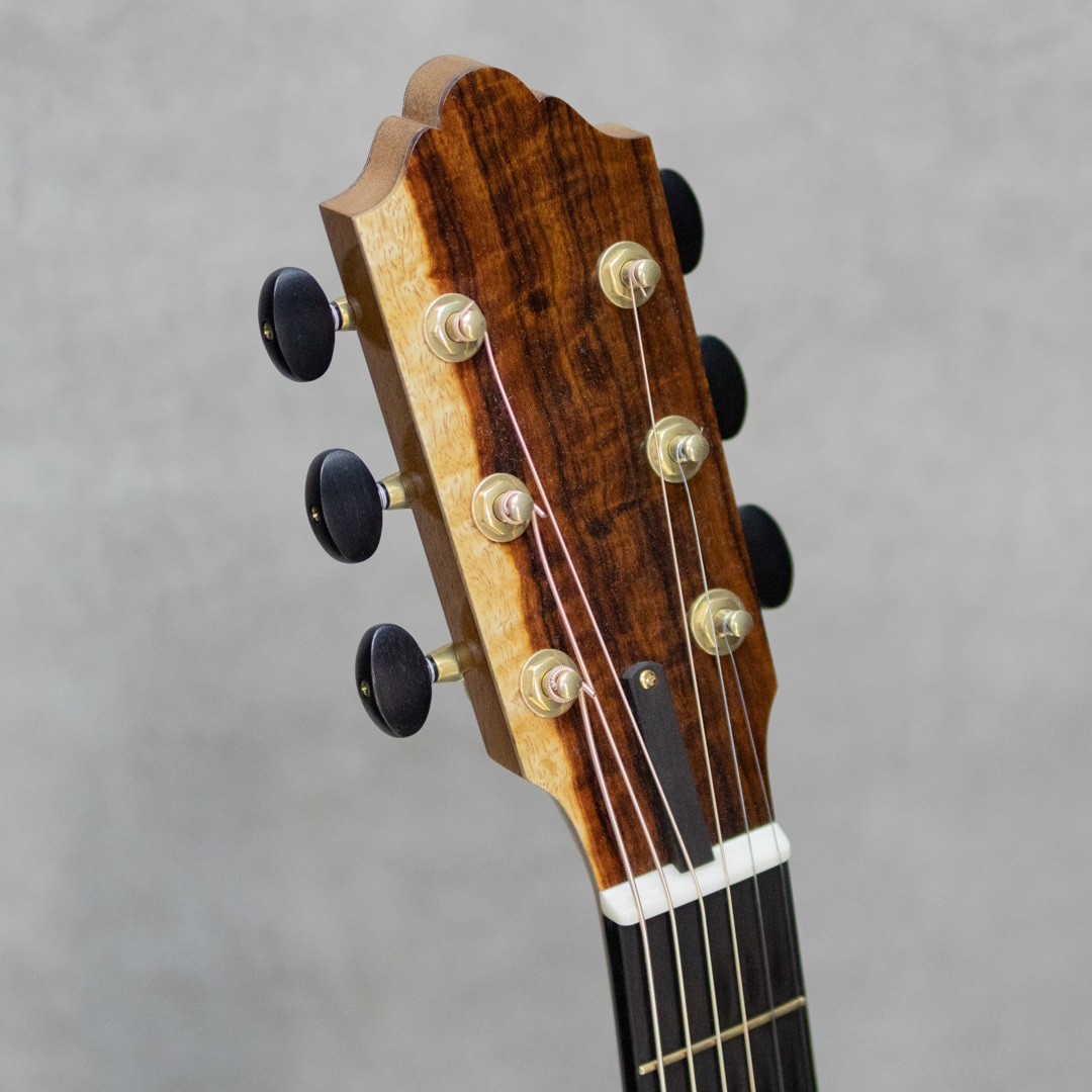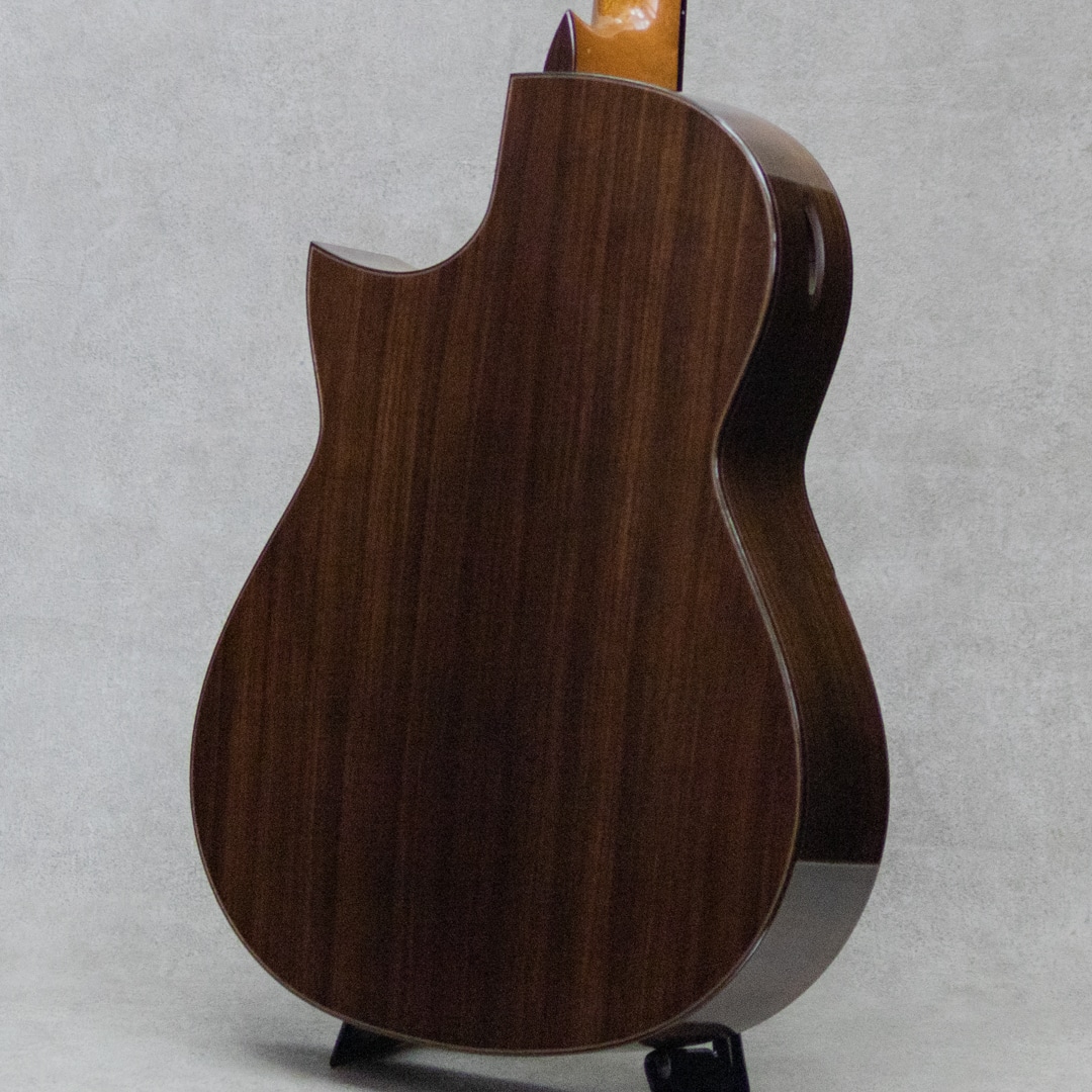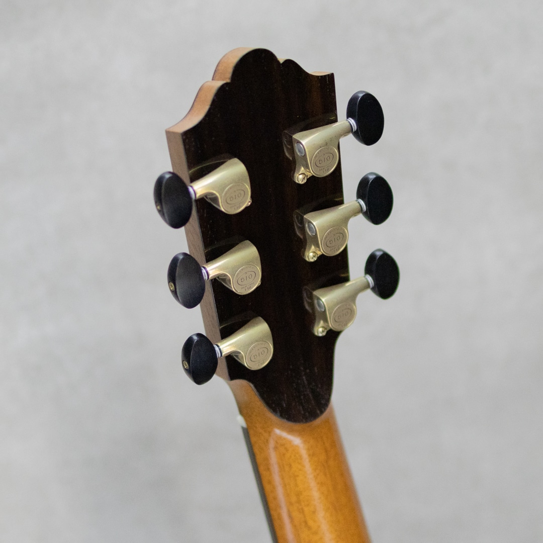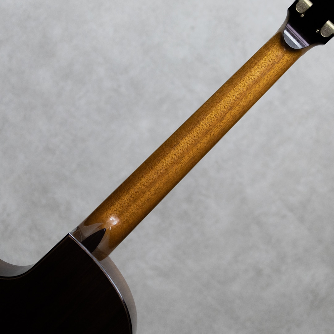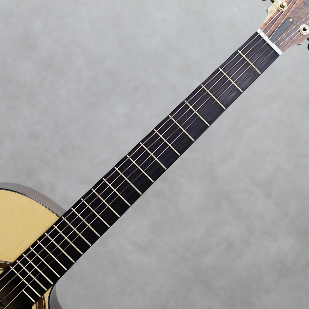神奈川・相模原にて小林良輔氏により製作されるRyosuke Kobayashi Guitars。氏は数々の著名な作家を輩出しているロバート・ベン・スクールでギター製作を学び、スギクラフト・杉田健司氏に師事。その後カナダのマスタールシアー、サーゲ・デ・ヤングの所でさらに業を磨き、現在の工房を開設。さらなる高みを目指し日々実直に優れたギターの製作に勤しんでいます。本器は氏の最新作、”OO Cutaway”。サイドサウンドポート、マイクロアームレストを備えたOOカッタウェイモデル。トップは全面に柾目杢の浮き出た柔らかな表情のアラスカンイエローシダー、サイド&バックには美しく端正な杢目のインディアンローズウッドを使用。マホガニーネック、エボニー指板、エボニーブリッジ、フィギュアド杢が美しいグラナディロヘッドトップ天神板、ゴトー510ペグ、エボニーノブ、グラナディロロゼッタ、マッカーサーエボニーバインディング、クリアピックガード、サイドサウンドポート(オプション)、マイクロアームレスト(オプション)、オリジナルXブレイシング。ボディ塗装は小林ギターお得意、質の高いフレンチポリッシュ仕上げです。艶やかで密度の濃い倍音。耳障りでなく心地の良い高音。主張しすぎずしっかりと支えてくれる低音。OOサイズですが、軽くなくしっかりと太いミドルと心地よい低音感で、永くいつまでも弾いていたくなる、良き相棒を感じさせる1本です。セラック独特の過敏さは少なく弾きやすいバッファーを備えながら、そのレンジ感はラッカー塗装では得られない唯一無二な響き。繊細に生々しく、時にダイナミックでアグレッシブに、プレイヤーのタッチを立体的に表現してくれます。またサウンドと一緒に行き渡る木の香りも小林氏のこだわりで、小脇に抱え時間を忘れ浸り切れるまさに相棒。多くの知識と高い技術、そして豊富なキャリアから充実期を迎える小林良輔氏。アメリカ、カナダ、そして日本と、3カ国でギター造りを学んだ氏ならではの広い視点の1本。そのこだわりと情熱を、是非お手元でお確かめください。