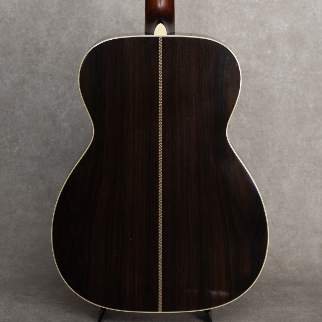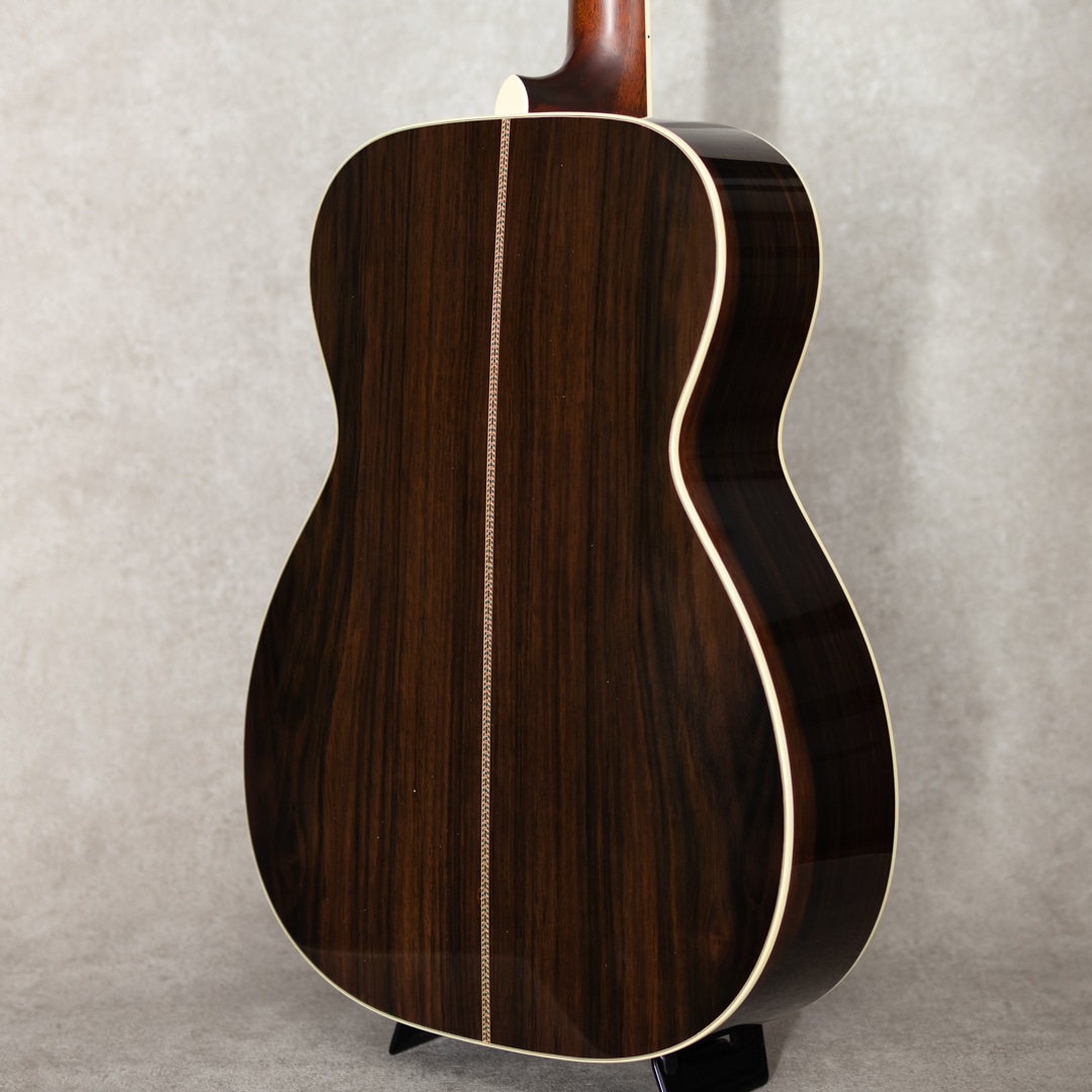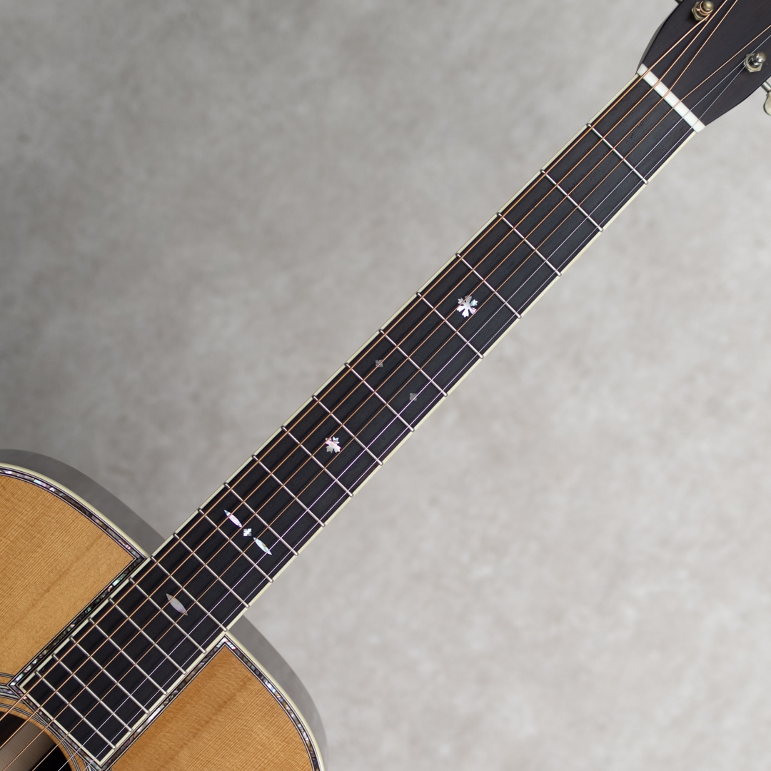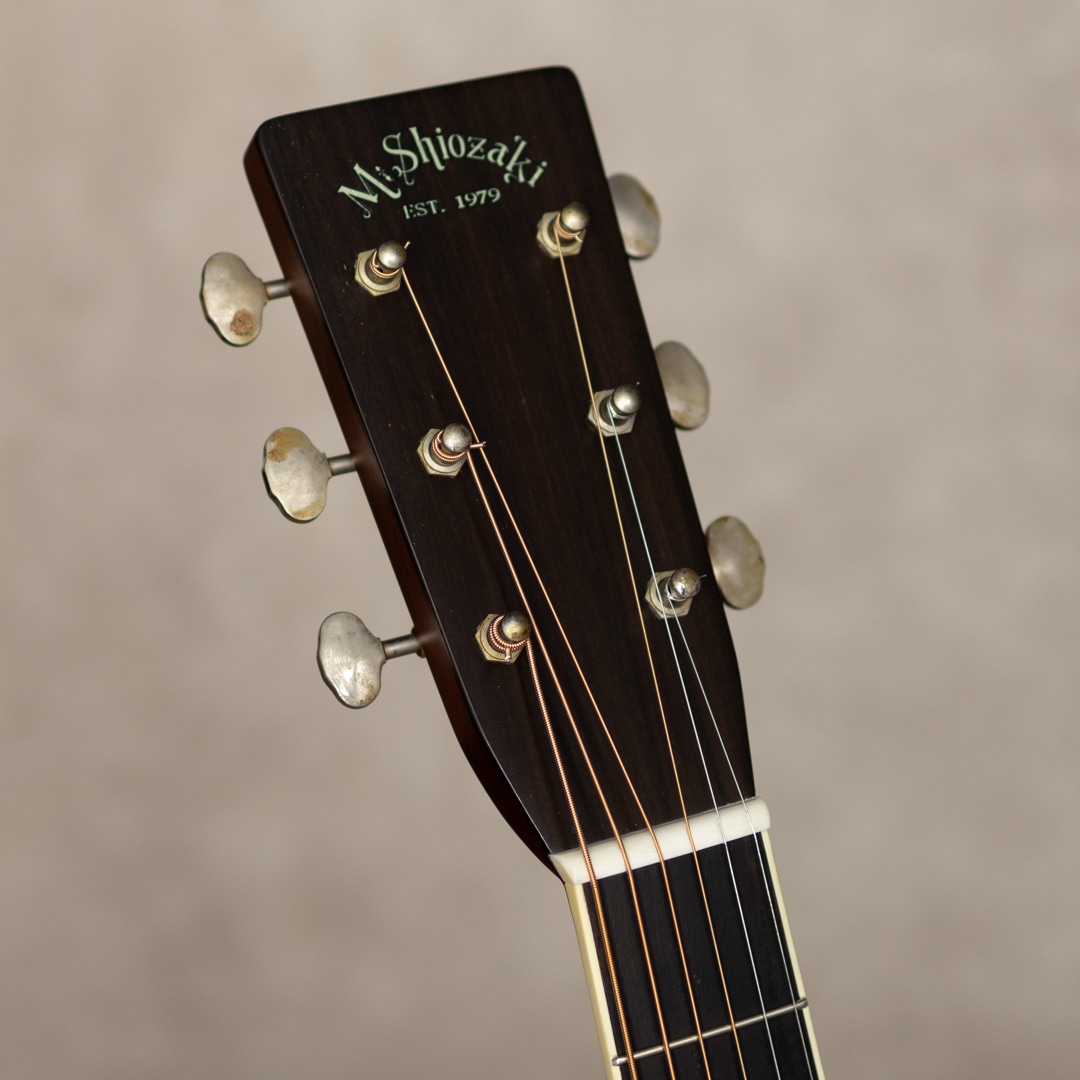 四国/愛媛はエム・シオザキ弦楽器工房の塩崎雅亮氏。日本におけるビンテージギター研究家・製作家の先駆け的存在とも呼べる巨匠ながら、今なおその研究熱心な姿勢に陰りを見せない進化する国内有数・ベテランルシアー。これまであらゆる年代の特徴を忠実に再現したMartin Guitarレプリカの製作や、自身の解釈や発展を大きく取り入れたオリジナルモデルの製作など多岐にわたえる作品を産み出しています。本器は、1939年製スタイル42にフォーカスした”OOO-5 Custom 1939 Mint Collection Jacaranda“。トップには端正で美しい杢目のトリファイドアディロンダックスプルース、サイド&バックには緑みのあるしっかりと柾目杢をセンターに配した美事な極上ハカランダを使用。ホンジュラス・マホガニー・ネック、Tバーネックロッド、エボニー指板&ブリッジ、ロングサドル、Waverly4076 Relicペグ、ハカランダ天神板、スノウフレイクス指板インレイ、塗り込みべっ甲柄セルロイドピックガード、メキシコ貝&日本アワビの45スタイル・ロゼッタ&トリム、アイボロイド・バインディング、モザイクバックストリップ、ニカワ接着。本モデルの表板とブレイシングにはトリファイド・アディロンダック・スプルースを使用し、手にした際のリアルな重量感はもちろんトップ厚も忠実に再現されています。また、塗装にはここ数年、とても高い評価を得ているミントコレクションエイジド・フィニッシュを採用。控えな傷加減とサウンド面に大きく影響するウェザーチェック、杢目に馴染むような質感がヴィンテージの風合いを醸しており、これまでにあるスペック・リイシューとは一線を画すより特別感のある仕上がりとなっています。42ならではの甘さときらびやかさが交錯するサウンド。重厚感のある倍音は45のそれとは異なり、42ならではの響きを魅せてくれます。このサウンドは塩崎氏が再現する”45”の倍音構成を持つサウンドボードならでは。手にした瞬間にリアルビンテージと錯覚する質感は、ビンテージマーチンを知り尽くした塩崎氏ならではの業です。ビンテージマーチンモデル製作のトップクラスを誇る塩崎氏の製作モデルは、近年ますますの円熟味を魅せる美事な完成度、、究極の42モデルを存分に味わっていただける1本となっています。この上ないスペックと高い当時再現度を誇る至高の1本。是非お手元に。