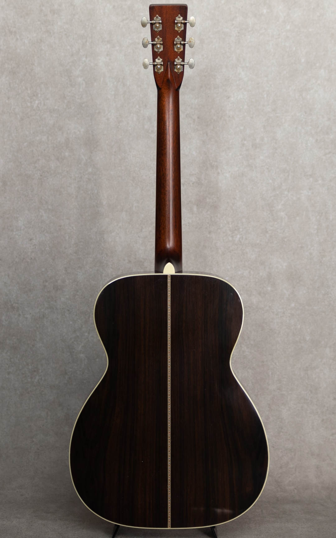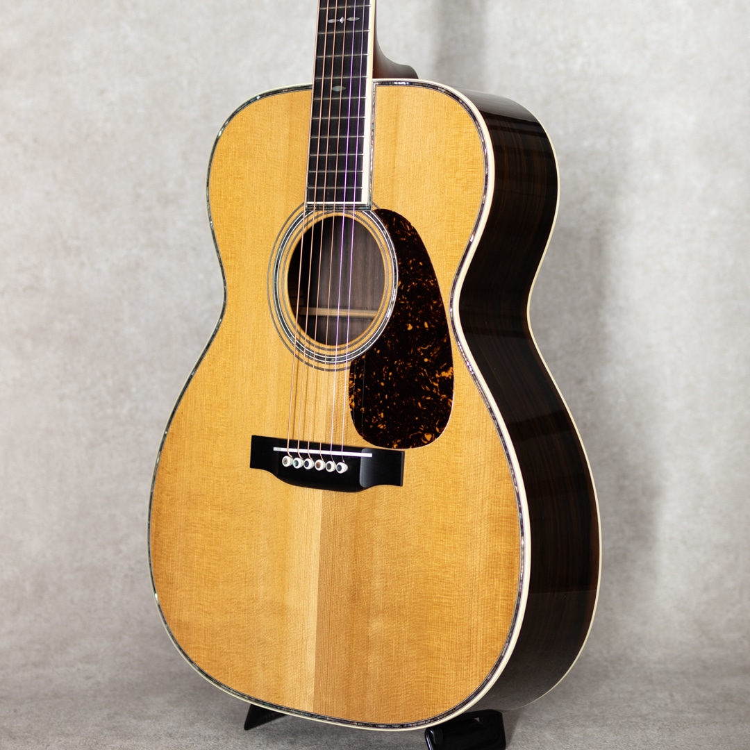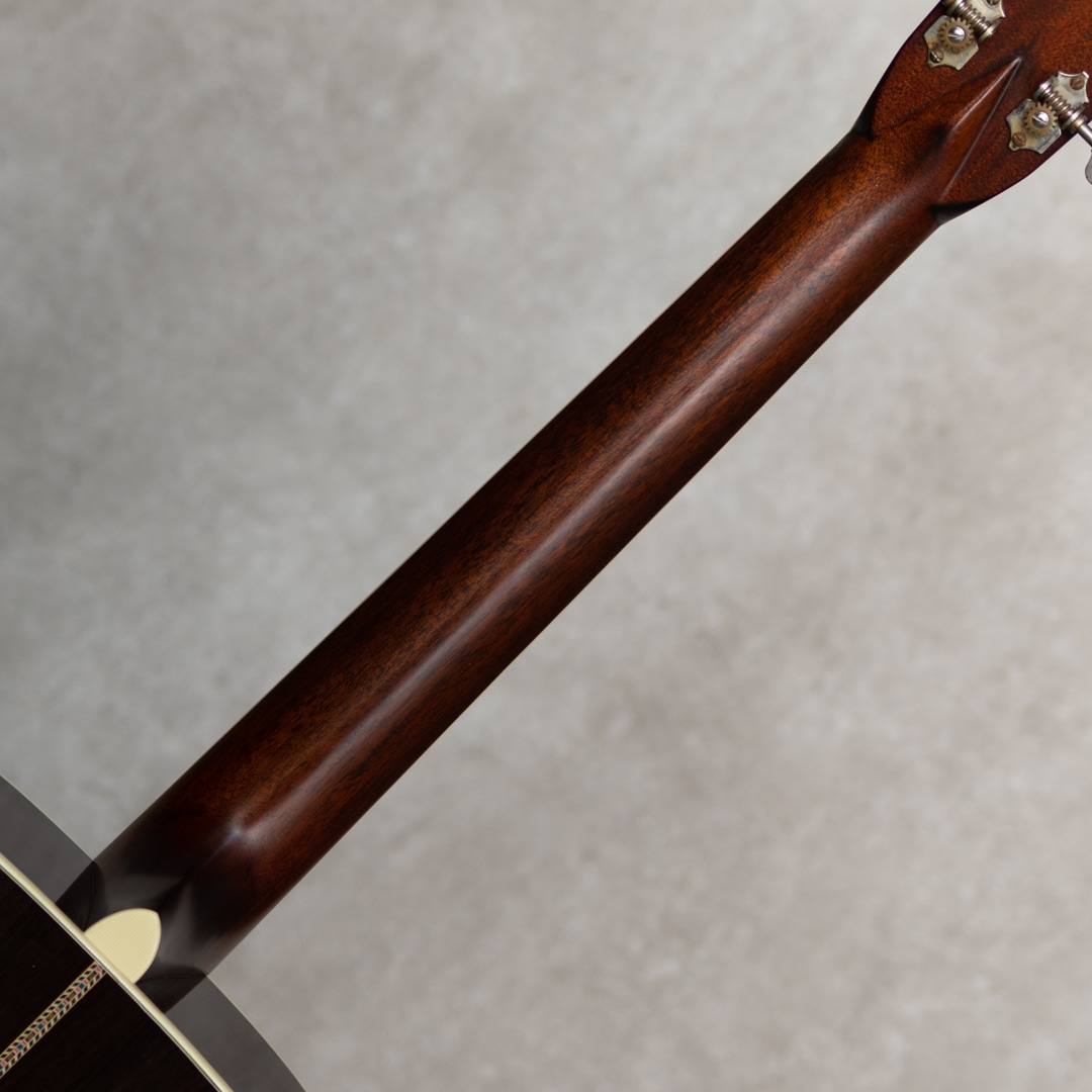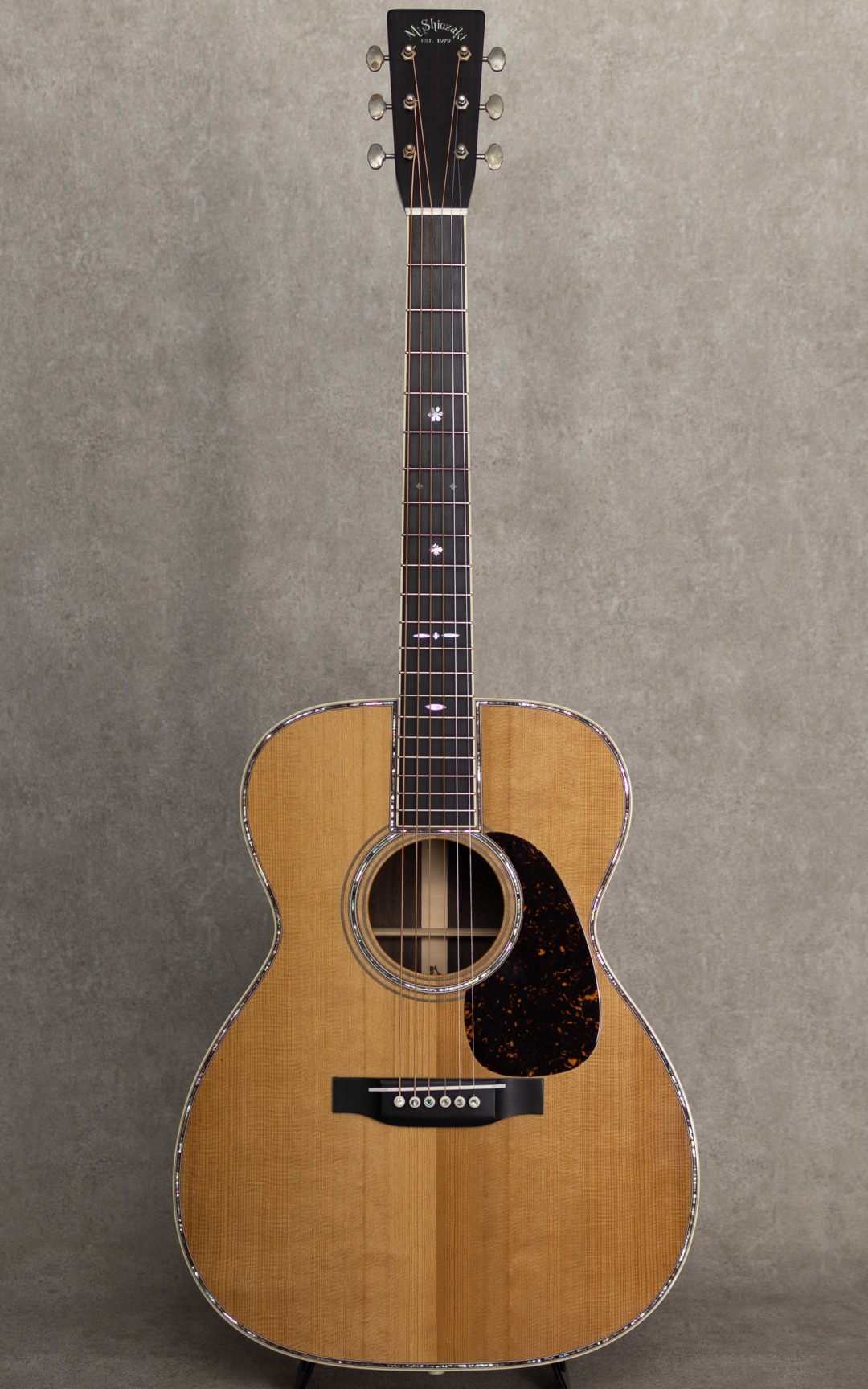 四国/愛媛はエム・シオザキ弦楽器工房の塩崎雅亮氏。日本におけるビンテージギター研究家・製作家の先駆け的存在とも呼べる巨匠ながら、今なおその研究熱心な姿勢に陰りを見せない進化する国内有数・ベテランルシアー。これまであらゆる年代の特徴を忠実に再現したMartin Guitarレプリカの製作や、自身の解釈や発展を大きく取り入れたオリジナルモデルの製作など多岐にわたえる作品を産み出しています。本器は、1939年製スタイル42にフォーカスした”OOO-5 Custom 1939 Mint Collection Jacaranda“。トップには端正で美しい杢目のトリファイドアディロンダックスプルース、サイド&バックには緑みのあるしっかりと柾目杢をセンターに配した美事な極上ハカランダを使用。ホンジュラス・マホガニー・ネック、Tバーネックロッド、エボニー指板&ブリッジ、ロングサドル、Waverly4076 Relicペグ、ハカランダ天神板、スノウフレイクス指板インレイ、塗り込みべっ甲柄セルロイドピックガード、メキシコ貝&日本アワビの45スタイル・ロゼッタ&トリム、アイボロイド・バインディング、モザイクバックストリップ、ニカワ接着。本モデルの表板とブレイシングにはトリファイド・アディロンダック・スプルースを使用し、手にした際のリアルな重量感はもちろんトップ厚も忠実に再現されています。また、塗装にはここ数年、とても高い評価を得ているミントコレクションエイジド・フィニッシュを採用。控えな傷加減とサウンド面に大きく影響するウェザーチェック、杢目に馴染むような質感がヴィンテージの風合いを醸しており、これまでにあるスペック・リイシューとは一線を画すより特別感のある仕上がりとなっています。42ならではの甘さときらびやかさが交錯するサウンド。重厚感のある倍音は45のそれとは異なり、42ならではの響きを魅せてくれます。このサウンドは塩崎氏が再現する”45”の倍音構成を持つサウンドボードならでは。手にした瞬間にリアルビンテージと錯覚する質感は、ビンテージマーチンを知り尽くした塩崎氏ならではの業です。ビンテージマーチンモデル製作のトップクラスを誇る塩崎氏の製作モデルは、近年ますますの円熟味を魅せる美事な完成度、、究極の42モデルを存分に味わっていただける1本となっています。この上ないスペックと高い当時再現度を誇る至高の1本。是非お手元に。