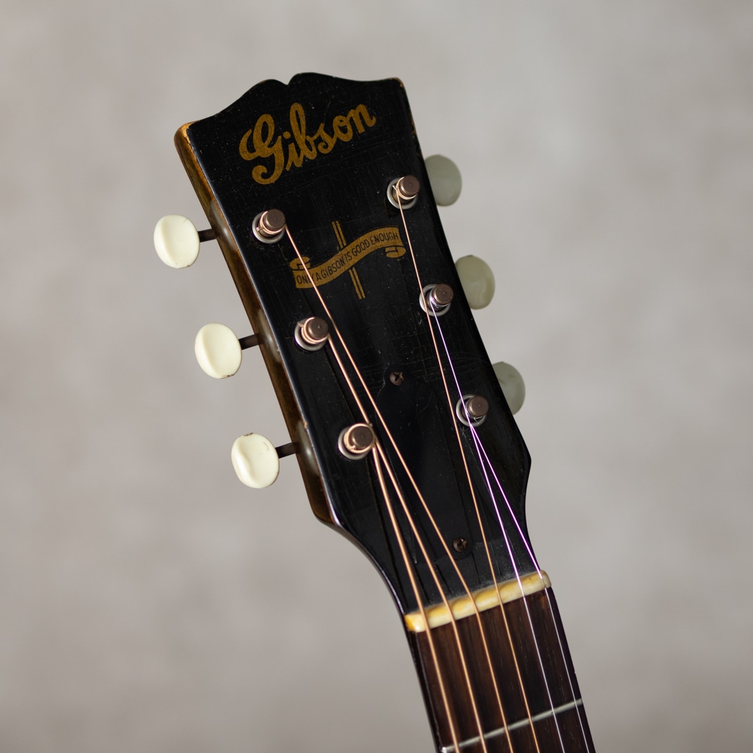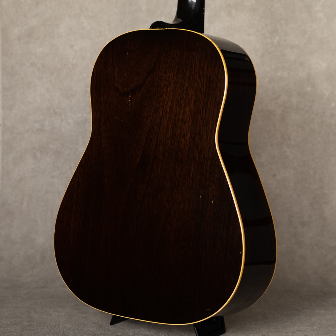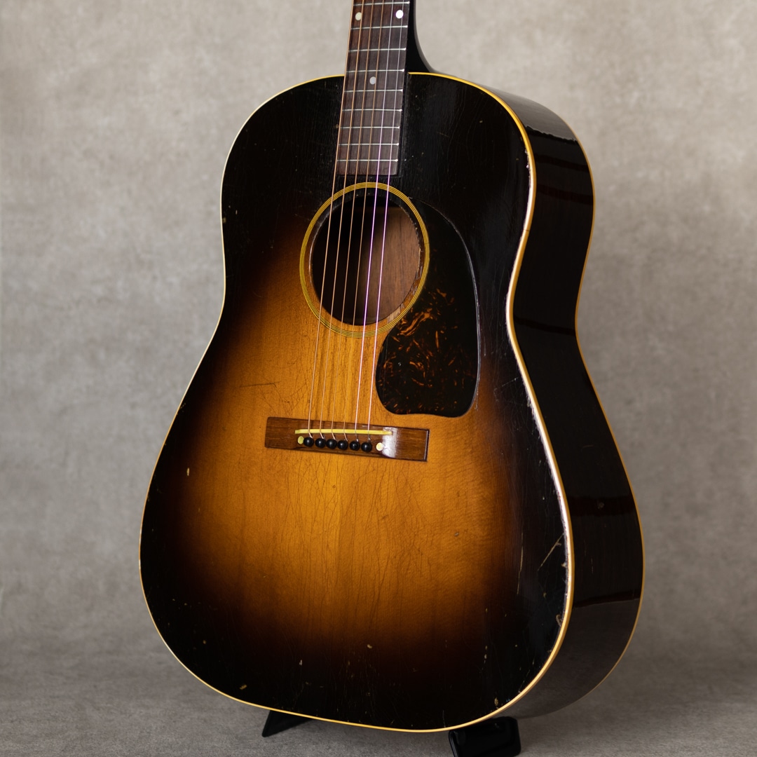 ワーキングホース"J-45"。ギブソンを代表するラウンドショルダーボディのジャンボモデル。1942年に登場した"J-45"は登場後すぐに戦中の物資不足などによる不遇な時期を迎え、その後数年間には様々な仕様の同モデルが製造販売されていました。本器もそんなウォータイムに造られたと見られる1942?43年製の1本。スプルーストップ、マホガニーサイド&バック、メイプルネック、19fハカランダ指板、ハカランダレクタングルブリッジ、バンナー&スクリプトヘッドロゴ、オリジナルクルーソン3-オン-プレートペグ、MOP指板ドット、7プライロゼッタ、べっ甲柄スモールピックガード、シングルバインディング、スキャロップドXブレイシング。42年後半から散見れるメイプルネック仕様ですが、本器はセンターストライプが見られないネック構造。とても芯のある荒々しいサウンド。ドライでいながらくたびれを感じさせず、分離の良い力強いサウンドを響かせてくれます。これぞワーキングホースの泥臭くかっこいいトーンは、後年のそれとは異なる変えられぬ魅力を持っています。全身に入った貫禄のウェザーチェック、経年による独特の色気を放つ艶加減、これぞ”J-45”の王道にして完成された1本です。バックに軽微なヘアラインクラックが見られますが、表面的なもので懸念も見られません。その他は大きな傷みも見られず良好な本器。ネックまわりも良好で、弾きやすいアクションをしっかりと保っています。直線的でキレとパンチのある”45”サウンド。バンナー”J-45"そのものが流通も少ない中、グッドコンディションの1本。是非要チェックください。その他の詳細や状態などもお気軽にお問い合わせください。ハードケース付属