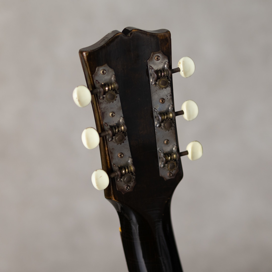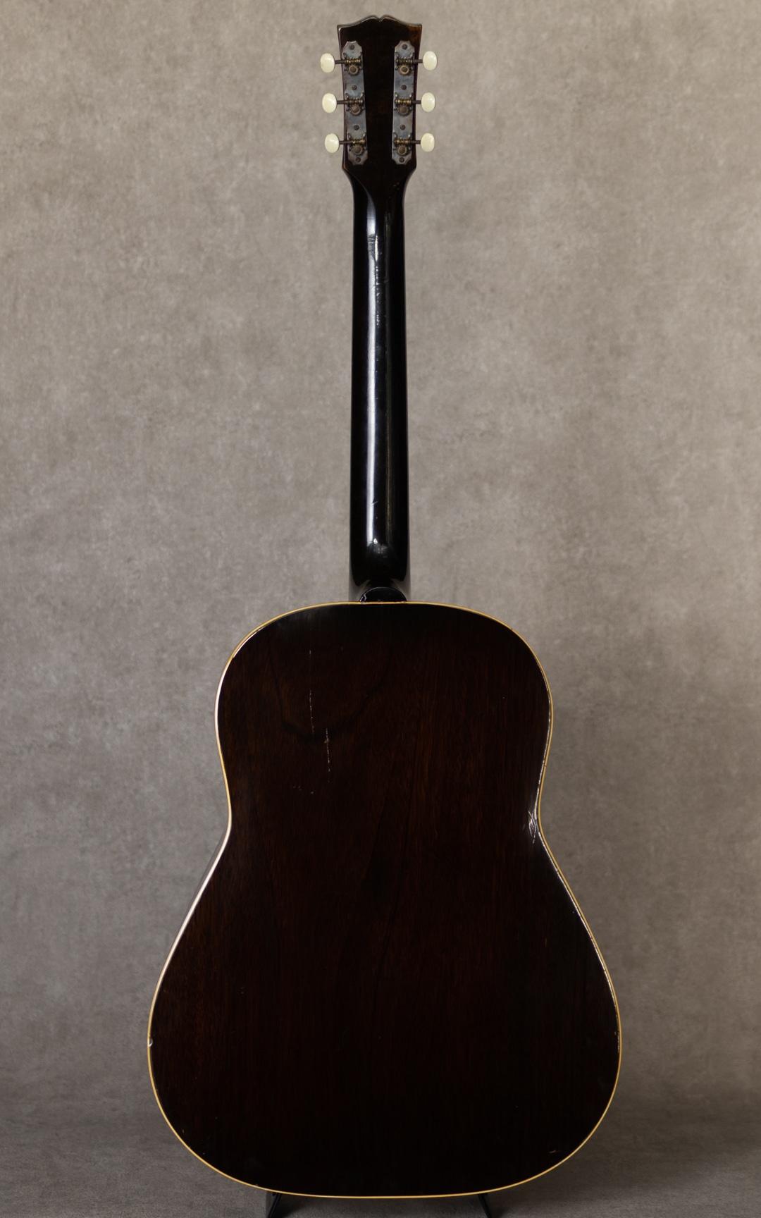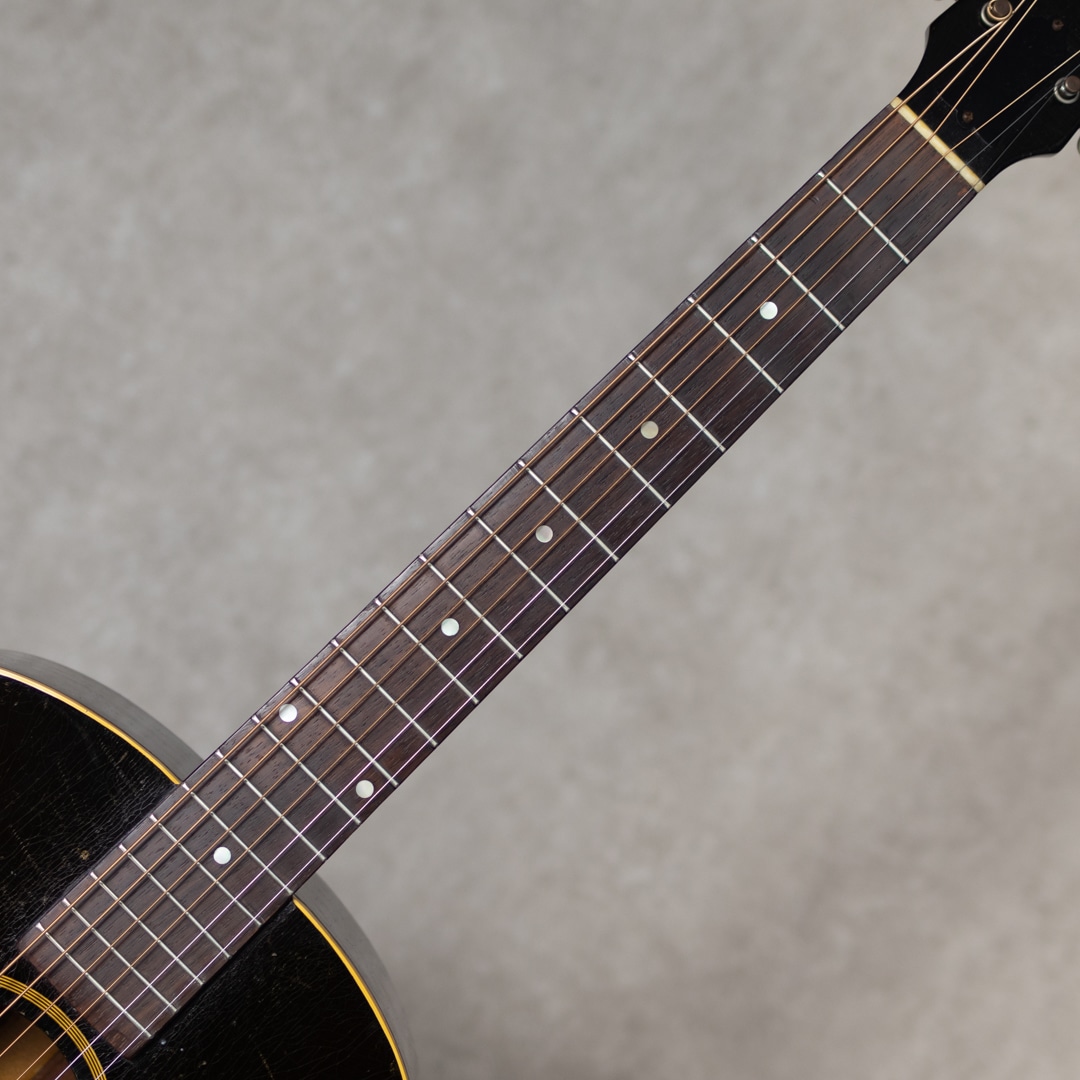 ワーキングホース"J-45"。ギブソンを代表するラウンドショルダーボディのジャンボモデル。1942年に登場した"J-45"は登場後すぐに戦中の物資不足などによる不遇な時期を迎え、その後数年間には様々な仕様の同モデルが製造販売されていました。本器もそんなウォータイムに造られたと見られる1942?43年製の1本。スプルーストップ、マホガニーサイド&バック、メイプルネック、19fハカランダ指板、ハカランダレクタングルブリッジ、バンナー&スクリプトヘッドロゴ、オリジナルクルーソン3-オン-プレートペグ、MOP指板ドット、7プライロゼッタ、べっ甲柄スモールピックガード、シングルバインディング、スキャロップドXブレイシング。42年後半から散見れるメイプルネック仕様ですが、本器はセンターストライプが見られないネック構造。とても芯のある荒々しいサウンド。ドライでいながらくたびれを感じさせず、分離の良い力強いサウンドを響かせてくれます。これぞワーキングホースの泥臭くかっこいいトーンは、後年のそれとは異なる変えられぬ魅力を持っています。全身に入った貫禄のウェザーチェック、経年による独特の色気を放つ艶加減、これぞ”J-45”の王道にして完成された1本です。バックに軽微なヘアラインクラックが見られますが、表面的なもので懸念も見られません。その他は大きな傷みも見られず良好な本器。ネックまわりも良好で、弾きやすいアクションをしっかりと保っています。直線的でキレとパンチのある”45”サウンド。バンナー”J-45"そのものが流通も少ない中、グッドコンディションの1本。是非要チェックください。その他の詳細や状態などもお気軽にお問い合わせください。ハードケース付属