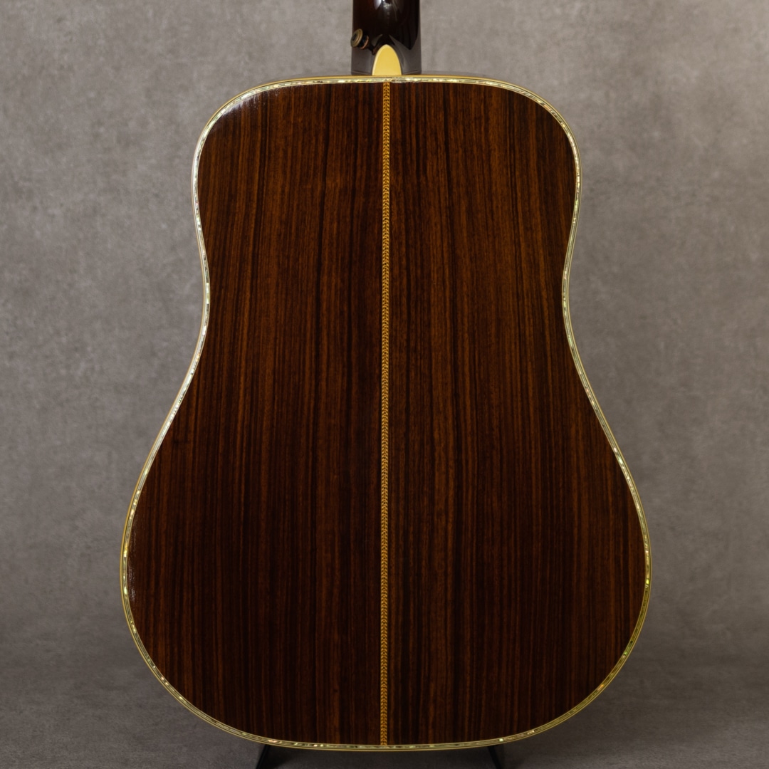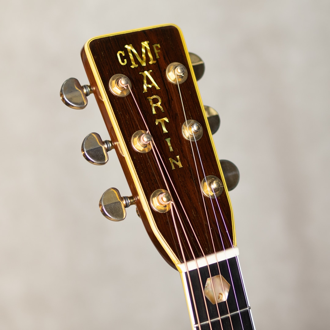 マーチン"D-45"はカントリーシンガー"Gene Autry(ジーン・オートリー)"からのからの特別オーダーから生まれたマーチンギターの最高級機種。1933年から1942年の間に91本が製造された後、1度その幕を閉じます。その後、マーチンギターの広報・研究家として活躍したMike Longworth(マイク・ロングワース)によって1968年に再生産が実現されました。マーチンスタイル45はこの型番に見合う材料を供給できない場合には生産されません。常にこの上ないクオリティを誇る最高のシリーズとなります。本器は、70年代頭にわずかに存在するジャーマントップ期の1本。美しい光沢をしっかりと保った1971年製"D45"。黄色味が美しいジャーマンスプルーストップ、美しい柾目杢のインディアンローズウッドサイド&バック、マホガニーネック、エボニー指板、エボニーブリッジ、ミルクボトルゴールドグローバーペグ、バーチカルヘッドロゴ、ヘキサゴン指板インレイ、アバロンロゼッタ&トリム、モザイクバックストリップ、ノンスキャロップド・Xブレイシング。ピックガードは同寸のブラックガードに交換されてます。奥深く甘い響きときらびやかな高音が織りなすジャーマンの魅力。パンチがありながら繊細さを持ち合わせるトーンは、マーチン社最高峰モデルのなせる45ならではのサウンドです。あらゆる奏法でその表現をサポートする高いポテンシャルを持ち合わせ、経年ならではの音の整いは経年に勝るチューニング無しと思わしめる1本です。光にかざせば分かる程度の軽いピッキングウェアがある程度とノンクラックでグッドコンディションの本器。マーチンクラックの補修、ブリッジプレートの補修など、経年で見られる劣化も丁寧に補修されています。ネックバインディングが経年でひび割れしていたのを丁寧に交換補修もされており、合わせてネック裏のみオーバースプレイもされていますが、とても良い質感で違和感を覚えません。ネックヒールにストラップピン増設。ネックコンディションもとても良好で、弾きやすいアクションをしっかりと保っています。年々価格高騰が顕著なオールドマーチン、特に70sの45は出にくく、グッドコンディションものも見かけにくい昨今。中でもジャーマンスプルース期の流通は相変わらず少なく、弾き心地とサウンドを楽しめる45は巡り合わせです。。お見逃しなく。。ハードケース付属