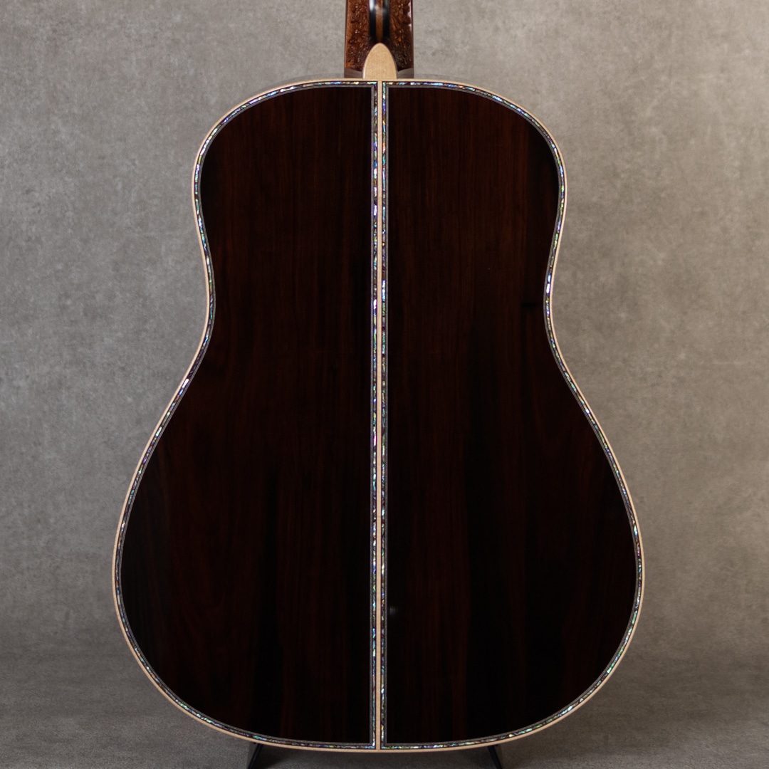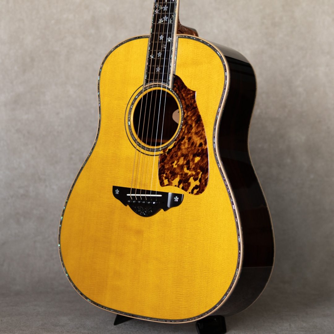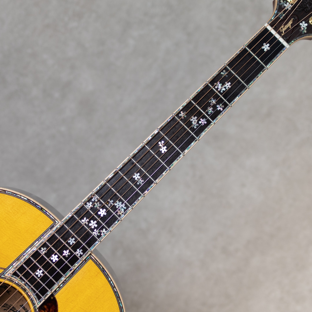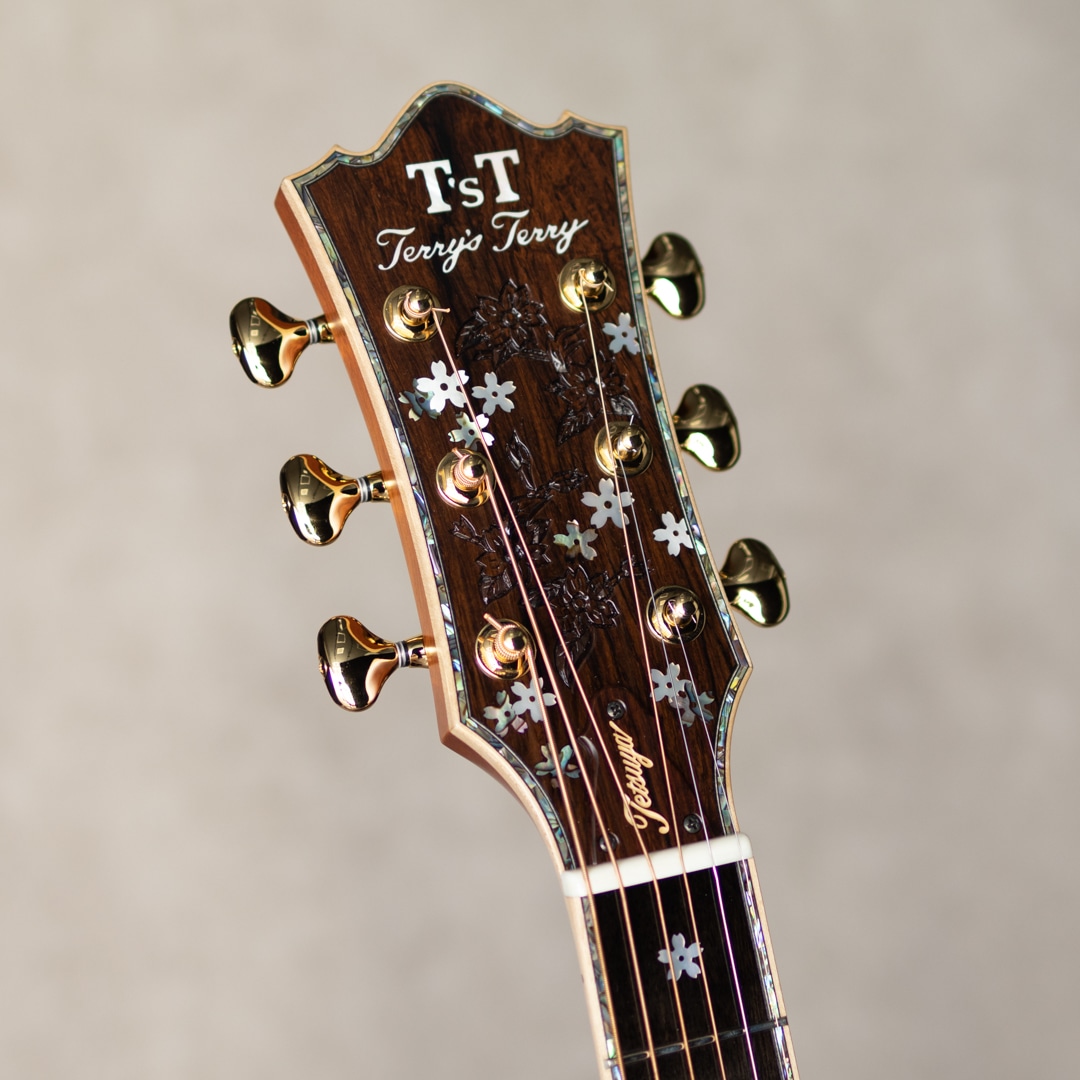 数々の楽器を手がけてきた国内屈指のギターデザイナー、テリー中本氏が1990年に立ち上げた"テリーズ・テリー"。国内外のトップアーティストらをも唸らせる完成度の高さを誇る、日本国内ではもっともカリスマ性のあるメーカーのひとつ。海外製ギターにはない日本製独自のサウンドやキャラクターを持ち、また世界でもトップクラスの作り込みの高さと仕上げの美しさを持つ日本が誇るジャパニーズブランドです。本器は、美しい桜が咲き乱れるテリー中本氏ならではの美事な1本、"TJ-100 Special Jacaranda”。全面に柾目痕がゆらめく極上スプルーストップ、黒々とした柾目杢が美事なプレミアムハカランダサイド&バック、マホガニー&黒檀積層ネック、エボニー指板&ブリッジ、群生桜のヘッド&指板アバロンインレイ、アバロン指板トリムボーダーインレイ、ボディトップ&サイド&バックアバロンインレイ、指板サイドアバロントリムインレイ、アバロンロゼッタ、桜アバロンブリッジインレイ、ハカランダ化粧板、ゴトー510Zゴールドペグ、ヘッド&ブリッジ桜彫刻、ネックヒール桜彫刻、本べっ甲ピックガード、メイプルバインディング、ネーム入りロッドカバー、ボディ内セラック塗装、ノンスキャロップド・Xスブレイシング。桜咲き誇るデザインを基調とした落ち着きと品のある、鮮やかで華やかな本器。咲き乱れる桜が貝細工と彫刻で表現されており、日本らしい、テリー中本氏ならではのデザインセンスの光る1本。また本器の桜は、すべての箇所でセンタードットのある穴あき桜がデザイン採用されています。サウンドは氏の設計するジャンボモデルならではの、コシと芯のあるまっすぐ飛び出す迫力のサウンド。モタつかず、それでいて太身のある骨太なサウンドは、これぞジャパーニズサウンドの真骨頂です。見た目の美しさはもちろん、ギターとしてのポテンシャルも備えた才色兼備で、テリーズテリーらしい装飾を取り入れたテリー中本氏渾身の仕上がり。 テリー中本氏の凄さを魅せつけられる素晴らしい1本です。
