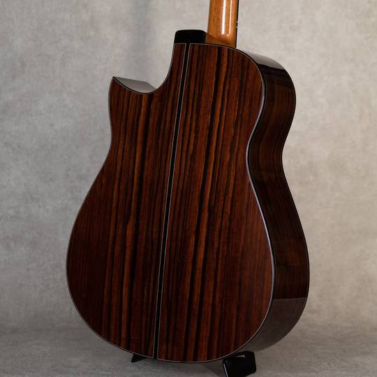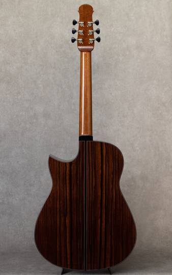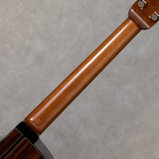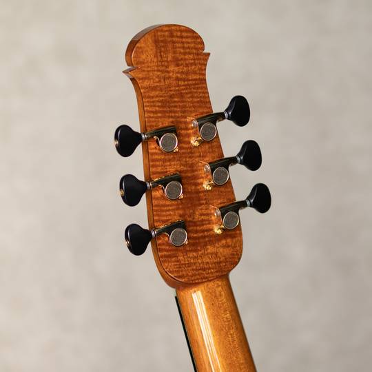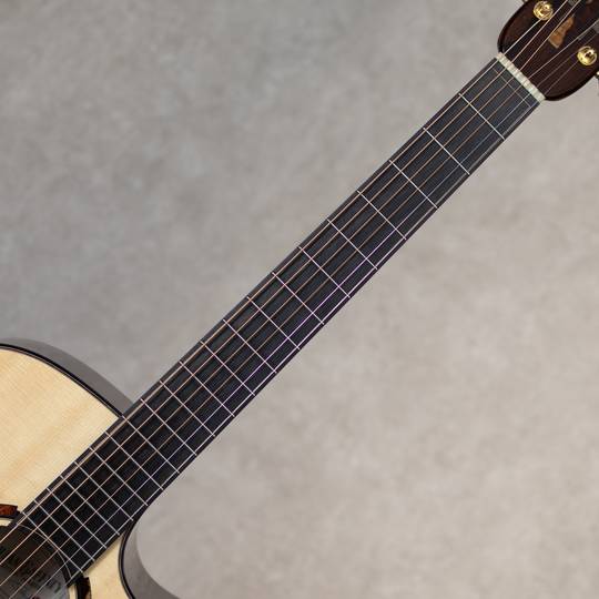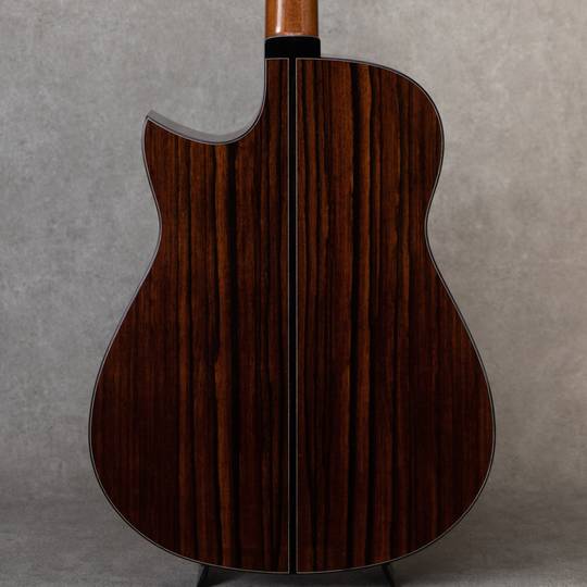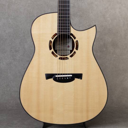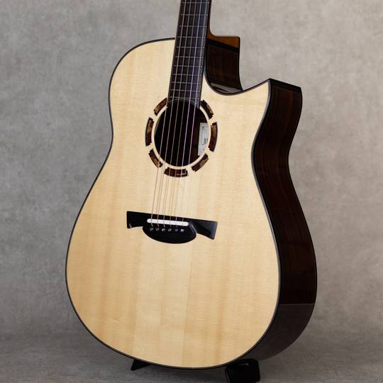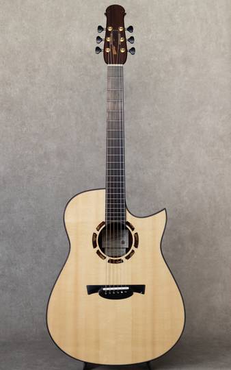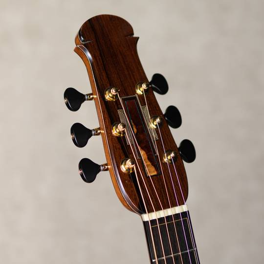 名工Ervin Somogyi氏の工房で働きながら、2014年より自身のブランドでもギター製作を行っている"Julian Gaffney(ジュリアン・ガフニィー)”。Sadowskyでの製作キャリアも持つ、確かな技術とセンスを備えた逸材です。本器は美しいマダガスカルRWを使用した"Modified-D Cutaway Madagascar Rosewood”。2019年製USED品。美しいスイススプルーストップ、美事なまでの柾目杢の極上マダガスカルローズウッドサイド&バック(サイドはダブルレイヤーです)、ワンピースマホガニーネック、エボニー指板&ブリッジ、ゴトー510ペグ、ウッドセグメント天神板&ロゼッタ、エボニーバインディング、フローレンタインカッタウェイ、オリジナルラティスブレイシング、ボディ内部塗装。とてもふくよかで奥深い響き。重厚で何層にも織り重なる倍音は決してくどくなく、ギター和音の可能性を魅せます。クリアでクイックなレスポンスは繊細なタッチをも再生し、各弦の発声も明瞭かつサスティナブルなトーンで立体的に響きます。この和音の響き方はこのギターならではの和音の響きで、レギュラーチューニング、オープンチューニング、ドロップチューニングなど、近年のギター変則チューニングの美しさにも更なる色添えを施してくれます。光にかざせば分かる程度の爪先が当たったような小傷が若干伺える程度のグッドコンディション。ネック周りもとても良好で、弾きやすいアクションをしっかりとサドルマージンを残し保っています。年々世界的にその人気を如実に伸ばす実力派ルシアー “ジュリアン・ガフニー”。国内の入荷もまだまだ少なく、巡り会えるチャンスも少ないです。是非、要チェックください。Hoffee製オリジナルハードケース付属