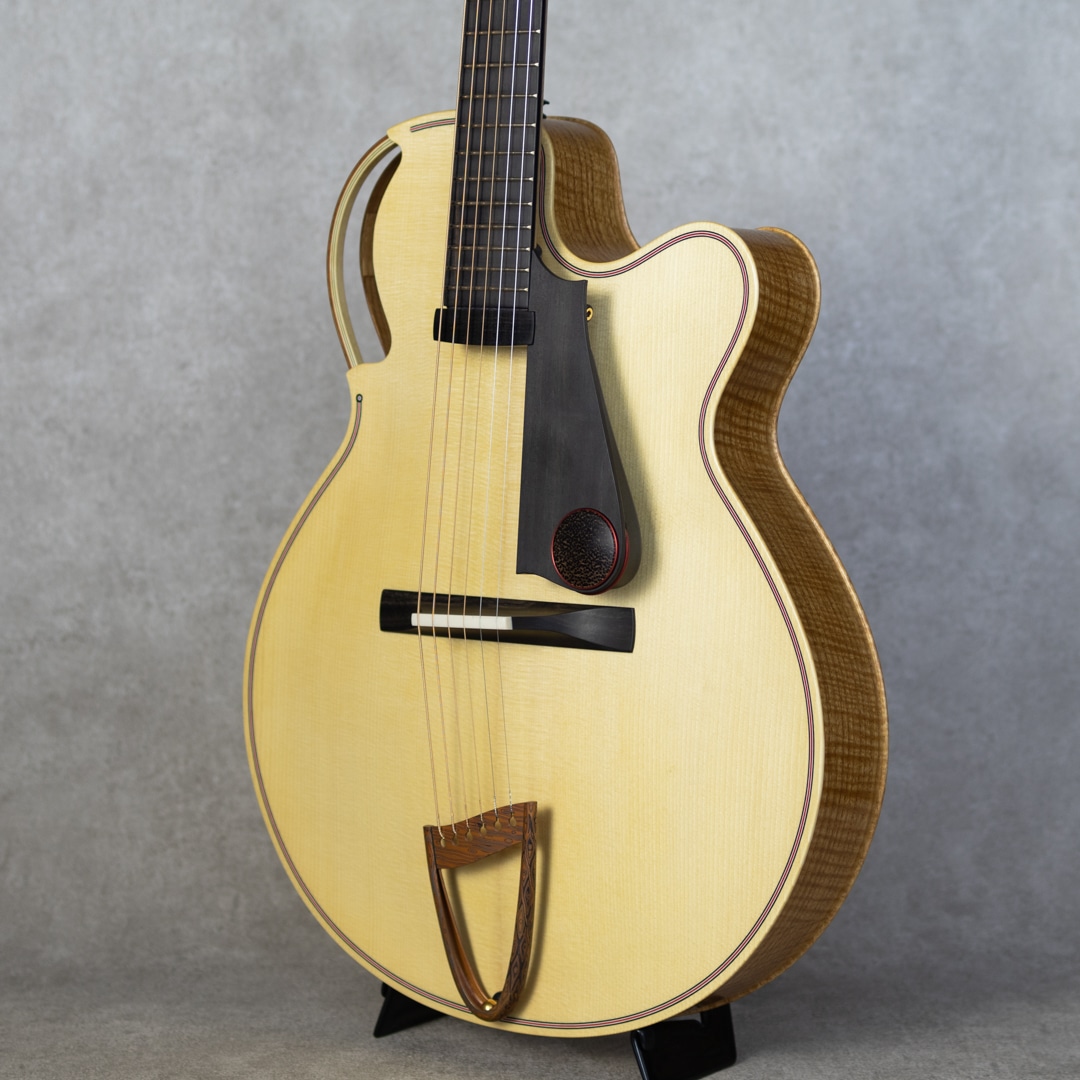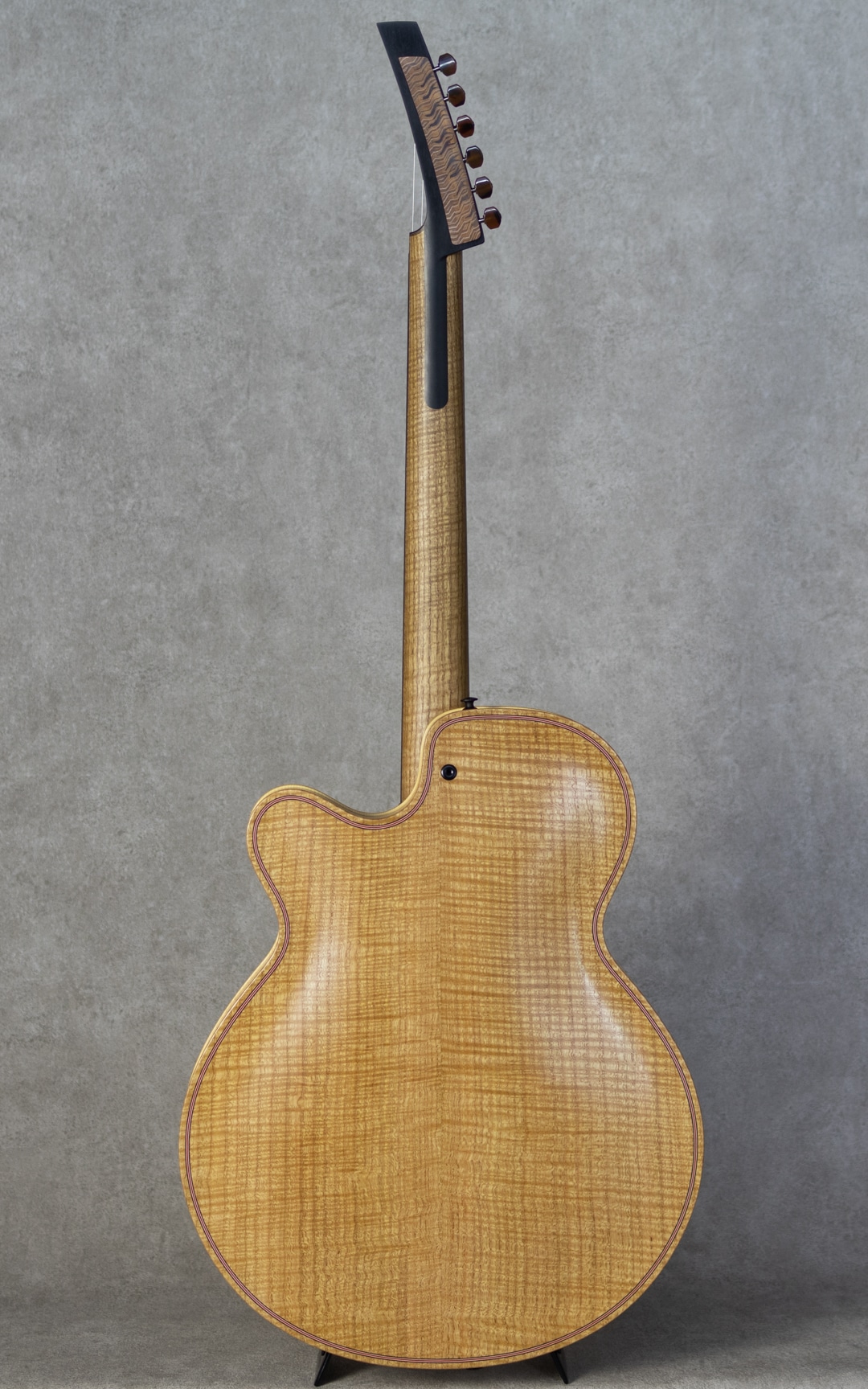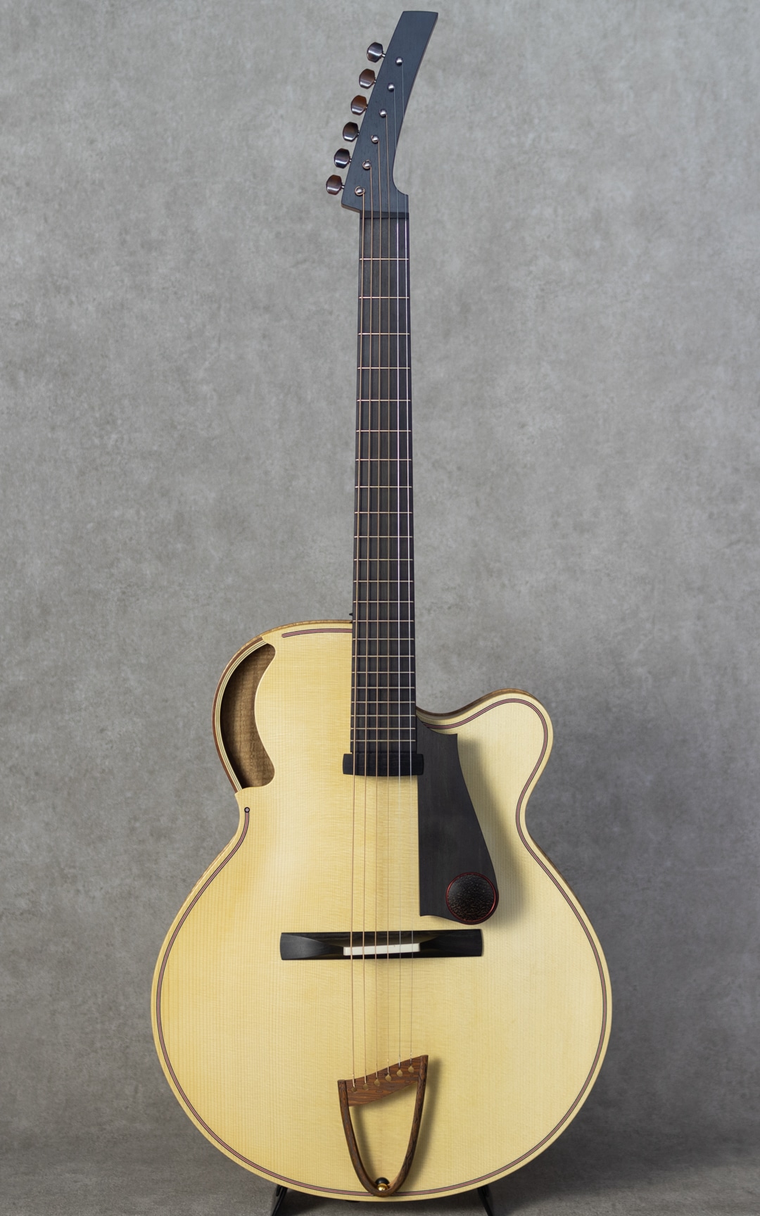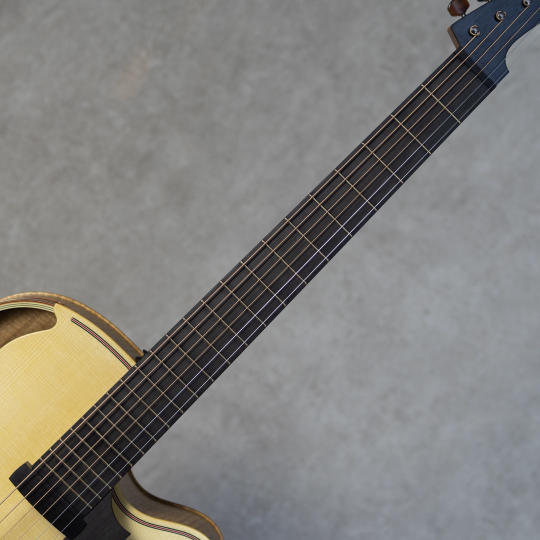 米国マサチューセッツ州にてアーチトップギター製作をする"Ken Parker(ケン・パーカー)"。パーカーと言えば"Parker Fly"が有名で、Larry Fishman(ラリー・フィッシュマン)と遊び心溢れるデザインパートナーシップを取り、技術とテクノロジーを共有しながらギタリストにとっての新しいツールを想像し完成させたのが"Fly"ギタープロジェクトでした。その斬新なルックスとサウンドと設計は近未来のギターと言わしめた他とは一線を画すものでした。しかし、彼は"Parker Fly"/ "Nightfly"そして"Fly Bass"等々で得た功績も内から溢れる新たなる情熱の元に数年のうちに手放し、現在はアーチトップギターの更なる可能性を信じアコースティックアーチトップギターの製作に勤しんでます。本器は、そんな彼が創る"Butterscotch”。斬新な設計と構造を持つ、心血をそそぎ製作された逸品。色白で柔らかな木肌のアルパインスプルーストップ、全面に均一な縮み杢が浮き出るイタリアンチェスナットサイド&バック、独自の構造と利点を持ったリムーバブル・エレベーテッドネックにも縮み杢が出るイタリアンチェスナットが使用されています。エボニー指板&ブリッジ、EVOフレット、Duneland Labs”Bronzeville"ピックアップ、Magic Knob内臓エボニーピックガード、木目金ブリッジ&サウンドホールスパン&ヘッドバックプレート、Gotohステルスギアペグ。交点を持たないトップXブレイシングは、トップのアクションを妨げず驚くほどの音量と反応します。とてもよく響くボディ、そして楽器全体から響き渡るサウンド。手にして驚くその軽さはもちろん、いたる所を見返す常識を覆す構造は、もはや芸術品の域です。また、Bronzevilleピックアップはブロンズ弦の為に6年間の研究とテストを費やされたシステムで、パッシブながらに低ノイズ高ダイナミクスを有するシステム。斬新なルックスのMagicノブを備えたボリュームを通してアウトされます。そして、Ken Paker独特のネック構造はアクションを自在にコントロール出来るばかりではなく簡単にネック自体を取外す事も可能で、様々なシチューエションでの利点を持ちます。また指板は、複数の指板Rを組み合わせた設計になっており、正確なピッチと演奏性をもたらします。Ken Parker Archtopsには、全てのギターに固有の名前が付けられており、それぞれの使用材を最大限に活かした作り込みがされているのも特徴。かねてより彼は、様々なピックアップやアンプ技術の進歩に反し大きな発展を見せにくかったアコースティックアーチトップギターにはまだまだ未知なる大きな可能性が秘められていると信じ、今なお初心を忘れる事なく刺激的な情熱を持って製作されています。その情熱が込められ具現化されたKen Paker Archtops。楽器としてのポテンシャルもですが、その外観・仕上げの美しさもかなりのもので、そのデザイン性と技術の高さは芸術品の域。012ゲージ弦で使用する事を前提に設計された本格的なアコースティックアーチトップギター、この衝撃は実際にお手元でお確かめ下さい。Hoffee製ポロックフィニッシュのハードケース、サウンドピークの異なる専用ケーブル2本が付属します。