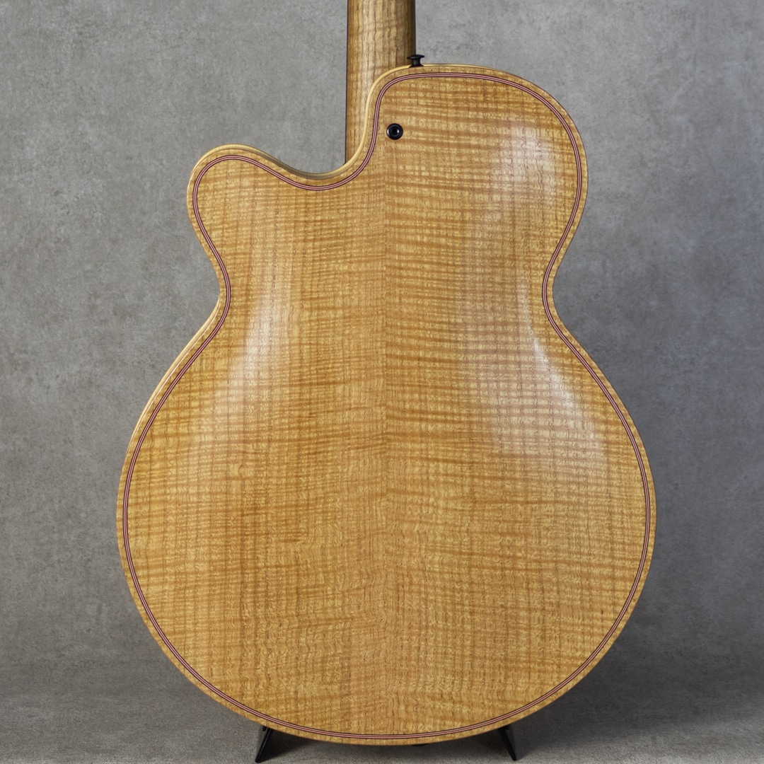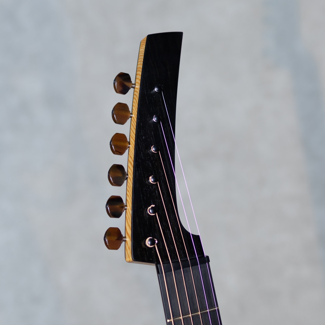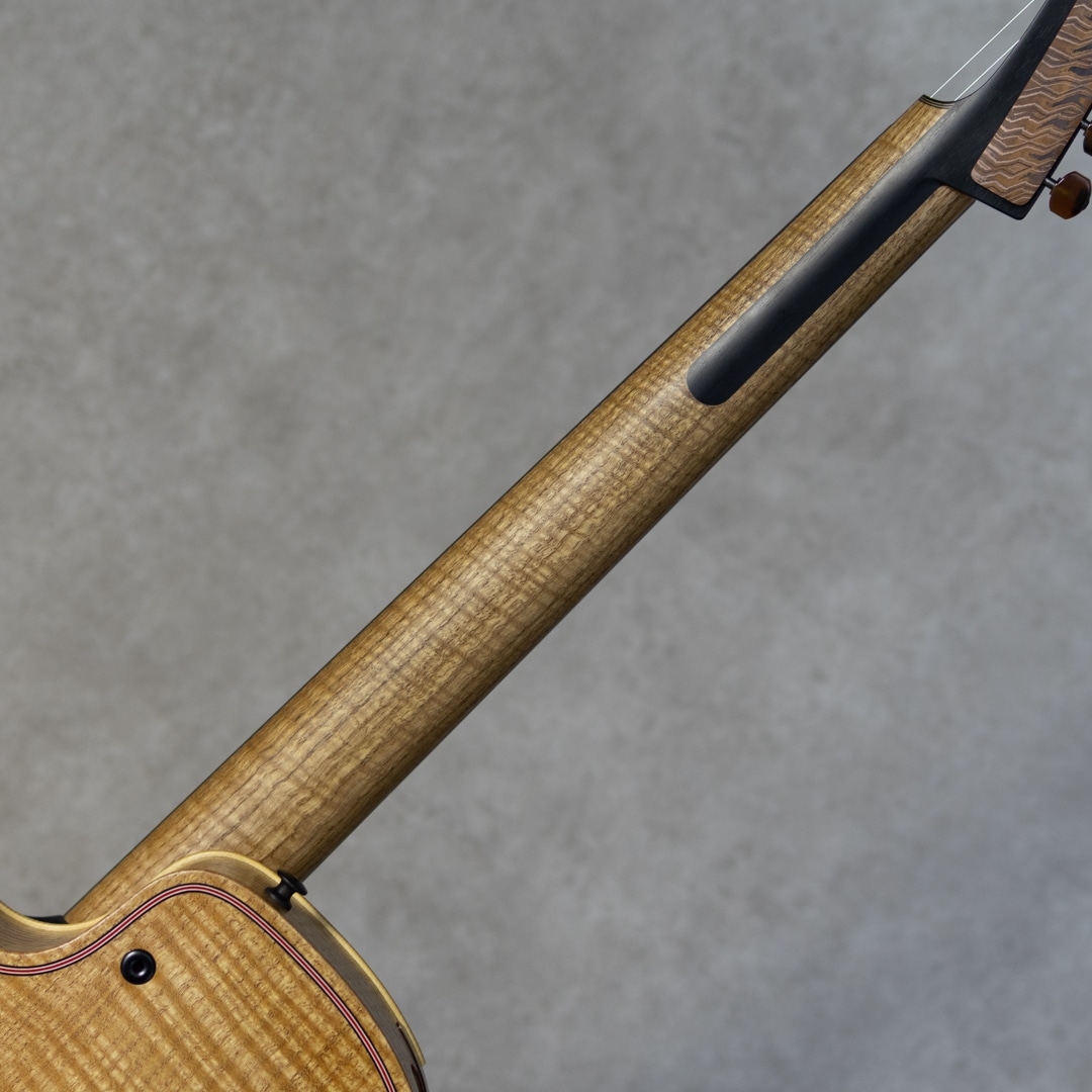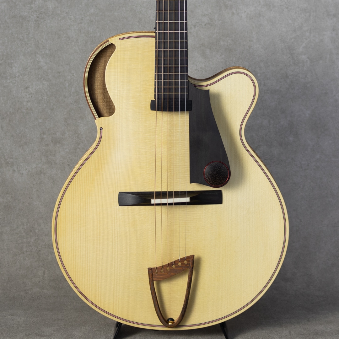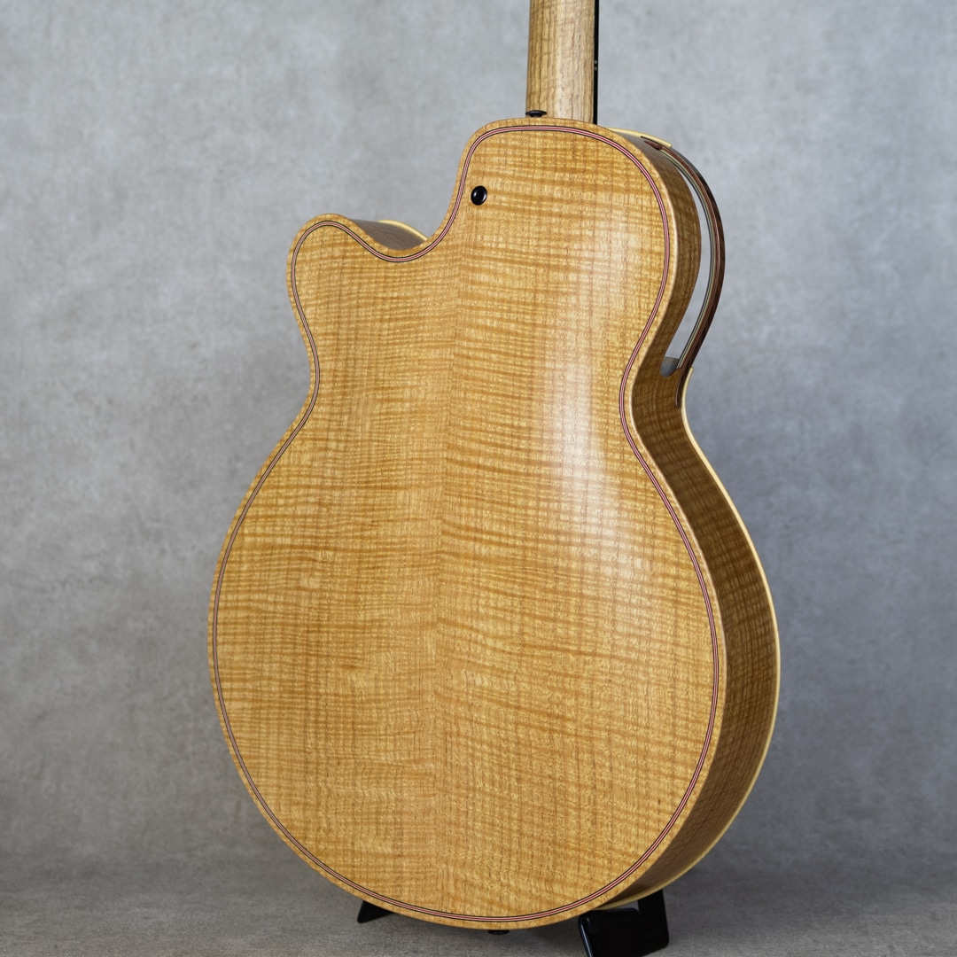 米国マサチューセッツ州にてアーチトップギター製作をする"Ken Parker(ケン・パーカー)"。パーカーと言えば"Parker Fly"が有名で、Larry Fishman(ラリー・フィッシュマン)と遊び心溢れるデザインパートナーシップを取り、技術とテクノロジーを共有しながらギタリストにとっての新しいツールを想像し完成させたのが"Fly"ギタープロジェクトでした。その斬新なルックスとサウンドと設計は近未来のギターと言わしめた他とは一線を画すものでした。しかし、彼は"Parker Fly"/ "Nightfly"そして"Fly Bass"等々で得た功績も内から溢れる新たなる情熱の元に数年のうちに手放し、現在はアーチトップギターの更なる可能性を信じアコースティックアーチトップギターの製作に勤しんでます。本器は、そんな彼が創る"Butterscotch”。斬新な設計と構造を持つ、心血をそそぎ製作された逸品。色白で柔らかな木肌のアルパインスプルーストップ、全面に均一な縮み杢が浮き出るイタリアンチェスナットサイド&バック、独自の構造と利点を持ったリムーバブル・エレベーテッドネックにも縮み杢が出るイタリアンチェスナットが使用されています。エボニー指板&ブリッジ、EVOフレット、Duneland Labs”Bronzeville"ピックアップ、Magic Knob内臓エボニーピックガード、木目金ブリッジ&サウンドホールスパン&ヘッドバックプレート、Gotohステルスギアペグ。交点を持たないトップXブレイシングは、トップのアクションを妨げず驚くほどの音量と反応します。とてもよく響くボディ、そして楽器全体から響き渡るサウンド。手にして驚くその軽さはもちろん、いたる所を見返す常識を覆す構造は、もはや芸術品の域です。また、Bronzevilleピックアップはブロンズ弦の為に6年間の研究とテストを費やされたシステムで、パッシブながらに低ノイズ高ダイナミクスを有するシステム。斬新なルックスのMagicノブを備えたボリュームを通してアウトされます。そして、Ken Paker独特のネック構造はアクションを自在にコントロール出来るばかりではなく簡単にネック自体を取外す事も可能で、様々なシチューエションでの利点を持ちます。また指板は、複数の指板Rを組み合わせた設計になっており、正確なピッチと演奏性をもたらします。Ken Parker Archtopsには、全てのギターに固有の名前が付けられており、それぞれの使用材を最大限に活かした作り込みがされているのも特徴。かねてより彼は、様々なピックアップやアンプ技術の進歩に反し大きな発展を見せにくかったアコースティックアーチトップギターにはまだまだ未知なる大きな可能性が秘められていると信じ、今なお初心を忘れる事なく刺激的な情熱を持って製作されています。その情熱が込められ具現化されたKen Paker Archtops。楽器としてのポテンシャルもですが、その外観・仕上げの美しさもかなりのもので、そのデザイン性と技術の高さは芸術品の域。012ゲージ弦で使用する事を前提に設計された本格的なアコースティックアーチトップギター、この衝撃は実際にお手元でお確かめ下さい。Hoffee製ポロックフィニッシュのハードケース、サウンドピークの異なる専用ケーブル2本が付属します。