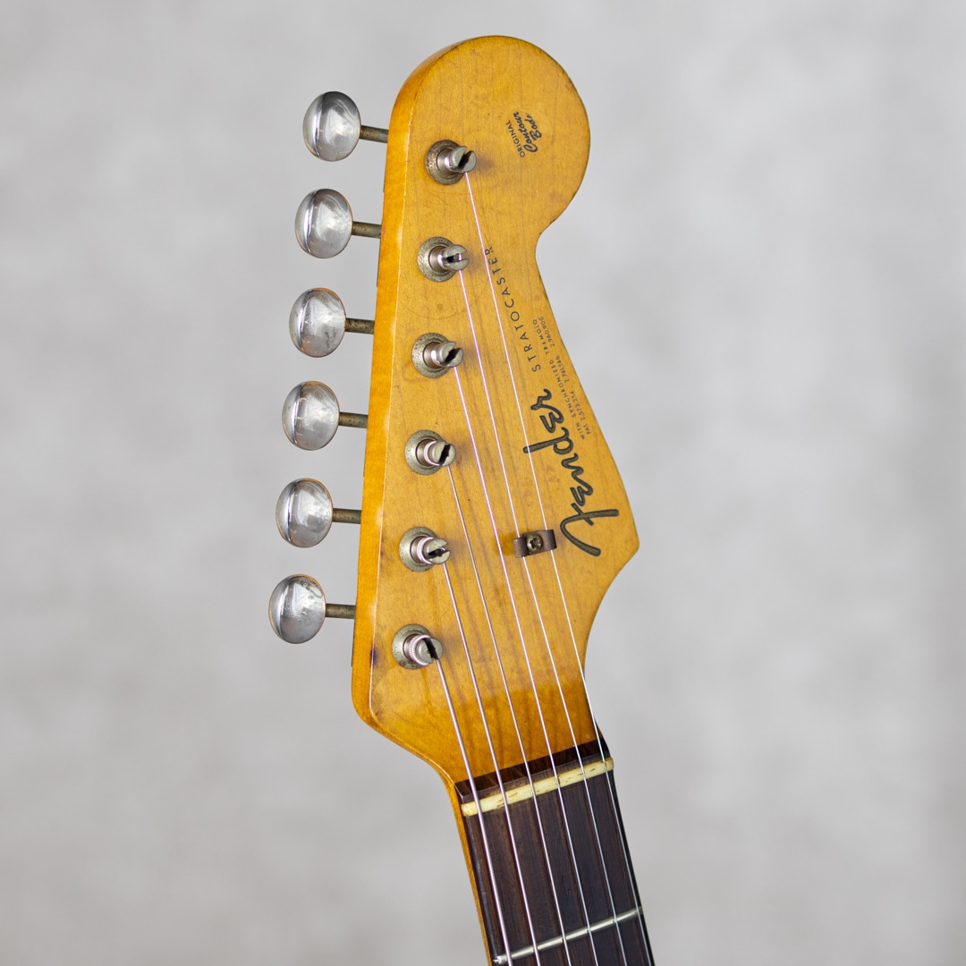ビンテージ・フェンダーの魅力のひとつ、カスタムカラー。鮮やかで色とりどりのカラーでまとわれたオリジナル・ビンテージ・フェンダーは、その美しさに魅せられるとその本物がゆえの美しさの深みに入り込むことでしょう。本器は、カスタムカラーの中でも数少ない”Dakota Red(ダコタ・レッド)”のオリジナルカスタムカラー”Startocaster”。とても良いコンディションで保たれた1963年製極上Vintage品。有名な赤色系のカスタムカラーは、”Fiesta Red(フェスタ・レッド)”、”Candy Apple Red(キャンディ・アップル・レッド)”などがありますが、中でも”Dakota Red”はとても少なく、カスタムカラーの中でもレアカラーとしてファンの間では人気が高いカスタムカラーです。アルダー2pcsボディ、ハカランダ・ラウンドボード指板、うっすらとフレイム杢が揺らめくクウォータソーン目取りのメイプルネック、スモールヘッドに冠する3パテントナンバー入りのスパゲティロゴ。指板材の減りもほとんどなく、ネックコンディションも抜群。オリジナルフレットは6割ほどと少し低いですが、音詰まりもなくしっかりとプレイできます。ブラックボビンピックアップ、3wayセレクタースイッチ、POT、セラミックディスクコンデンサーなどのアッセンブリーも年代マッチングのオリジナルで、ナット、シングルラインクルーソンデラックスペグ、ストリングガイド、サドル、トレモロアッセンブリーに至るまでオリジナルかつグッドコンディションの1本です。(サドルハイトスクリューとトレモロスプリングのみ一部年代アンマッチングパーツの可能性あり)オリジナル3plyミントガードは若干の縮みが見られますが、割れ・欠損もなくとても良い表情を魅せてくれます。オールドと思えない、コシと立ち上がりの優れたグレイトサウンドの本器。くたびれた印象を一切与えないトーンと元気で粘りのあるサスティン。ビンテージならではの甘い倍音と、それに負けない基音がとても快活で艶やかなサウンドです。また、経年・使用に伴う幾らかの塗装の欠けや打痕、コンター部の塗装ハゲ、バックル傷は見られますが、いずれも小範囲かつイヤな印象の傷は見られず、とても貫禄と色気のある顔つき。しっかりと光沢を魅せ、美しいカスタムカラーを存分に楽しませてくれる1本です。