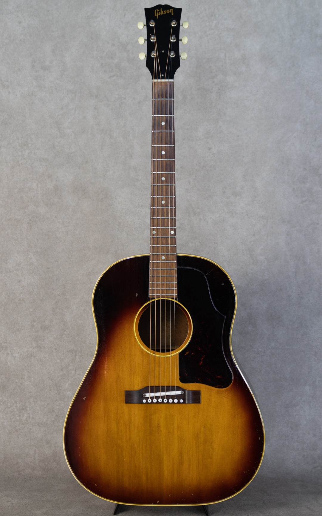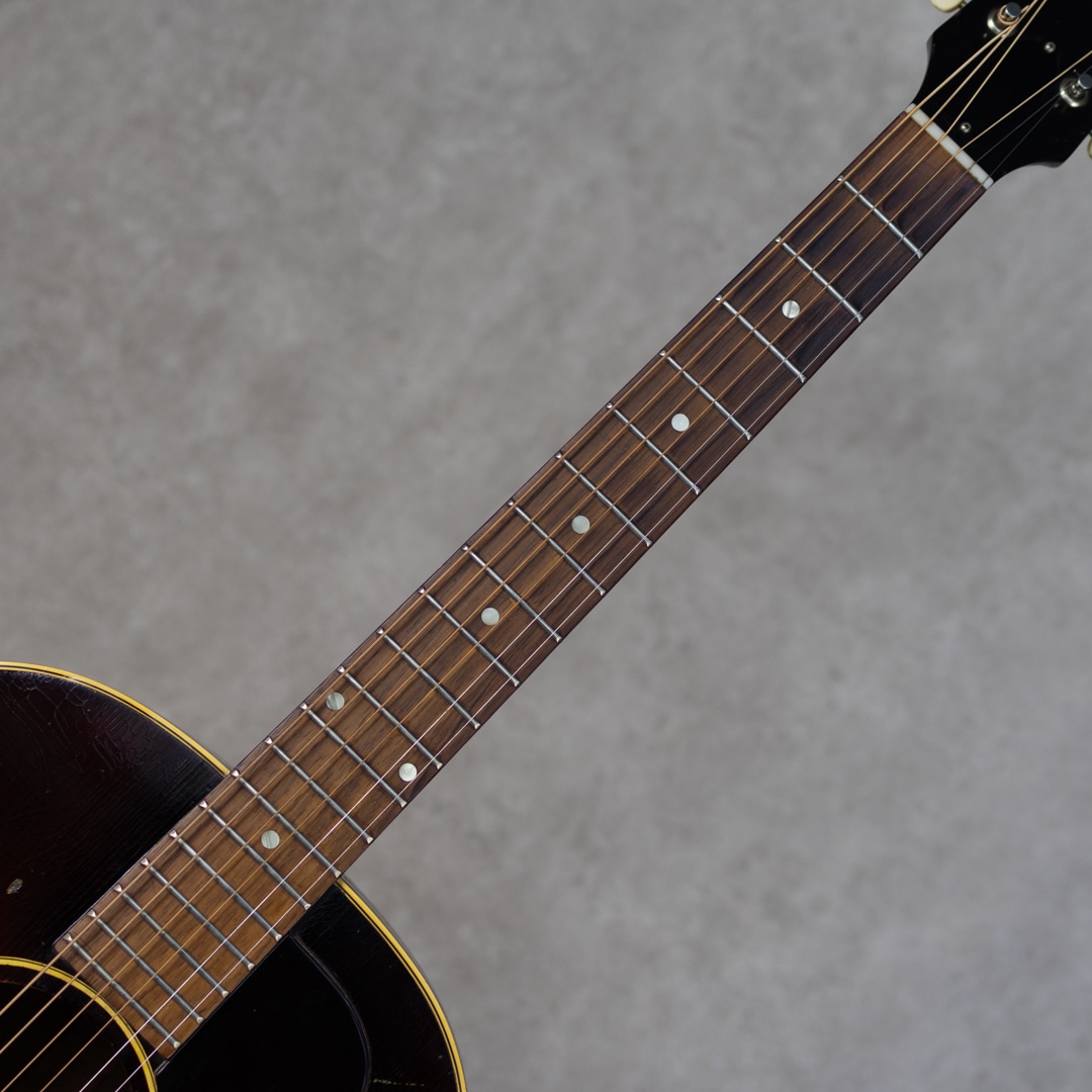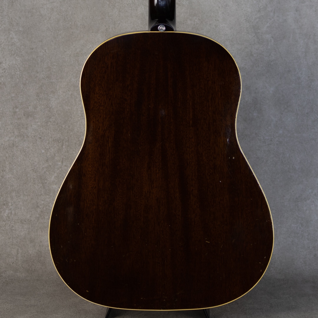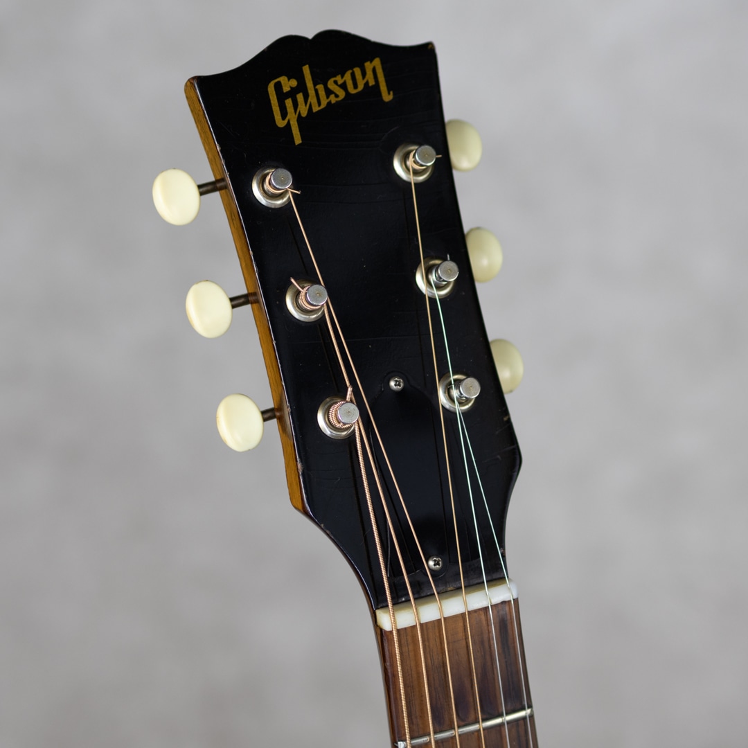 フラットトップにおけるもうひとつの憧れ、ワーキングホースGibson"J-45"。1942年に登場した"J-45"、その後幾つかのマイナーチェンジを繰り返しながらも、今尚トップシーンで欠かせないGibsonを代表するラウンドショルダーボディのジャンボモデル。本器は1959年製の1本。スプルーストップ、マホガニーサイド&バック、マホガニーネック、シングルラインクルーソンデラックスペグ、ハカランダ指板、ハカランダブリッジ、セラミックサアジャスタブルブリッジ、ポインテッドシンピックガード、シングルリングロゼッタ、ノンスキャロップド・Xブレイシング。アジャスタブルスクリューのみ、後年のものに変わっています。ガランとしながらパンチのあるこれぞJ45の響き。ガランとしながらパンチのあるこれぞJ45の響き。よく乾いた分離の良いトーン、それでいて折り重なる泥臭くも無骨なテイストはまさにワーキングホース。各音域のバランスがとてもよく、高域まで耳通りの良いサウンドです。経年・使用に伴う小キズは見られますが大きくエグるようなものはなく、ノンクラックのグッドコンディション。ピックガード端にステッカー痕のような塗装負けが見られますが、光にかざせばわかる程度です。艶かしい色気ある光沢がたまらない1本です。ネックコンディションもとてもよく、弾きやすいアクションで小気味良いサウンドを聞かせてくれます。59年の魅力はそのネックグリップ。エレキギター・アコースティックギターを問わず、日本人の手にも馴染みやすい太くなく細くない馴染みの良いシェイプで、細すぎないネックならではの抜けが良くも太いレスポンスが魅力的です。グッドコンディションのワーキングホース”J-45”。お見逃しなく要チェックください。ハードケース付属