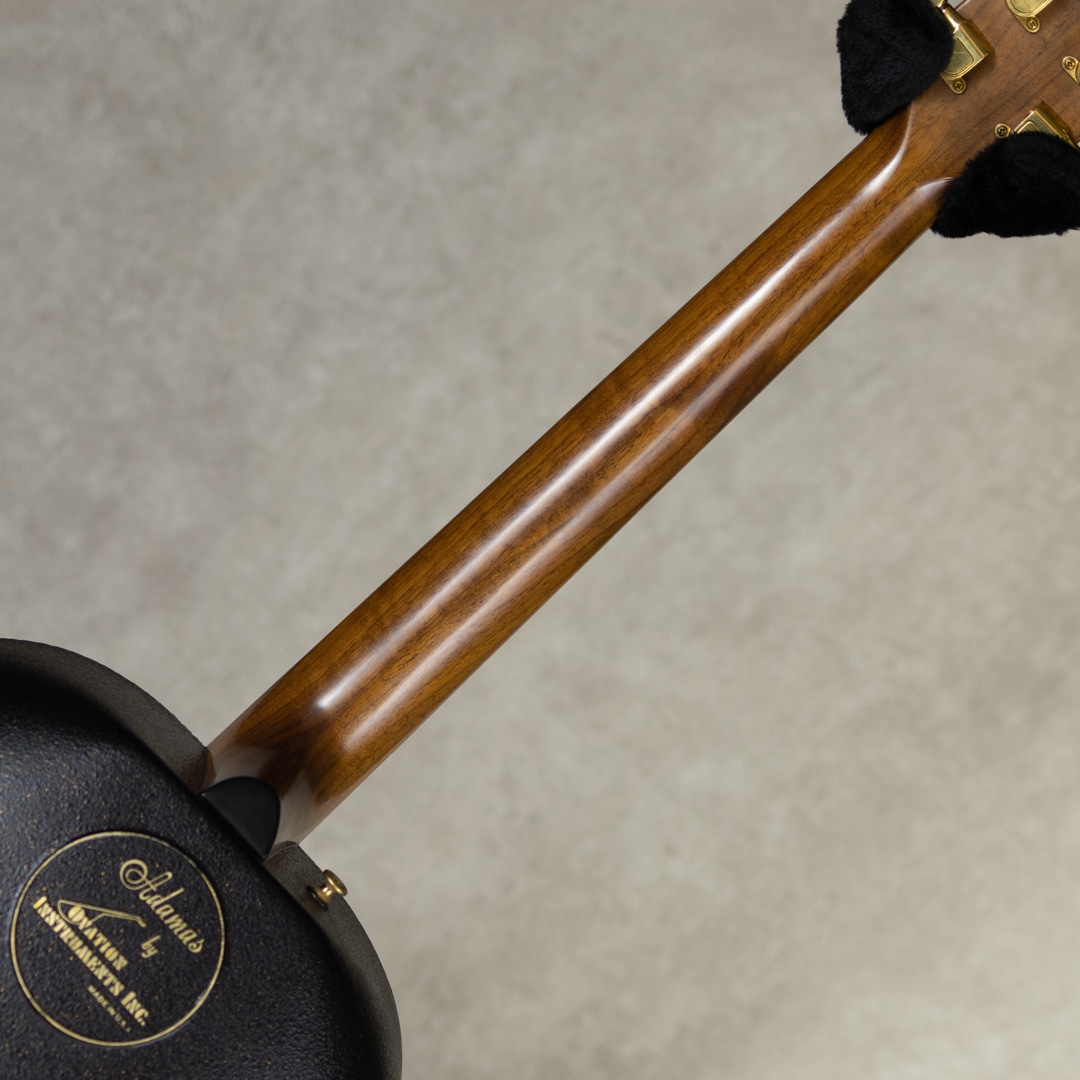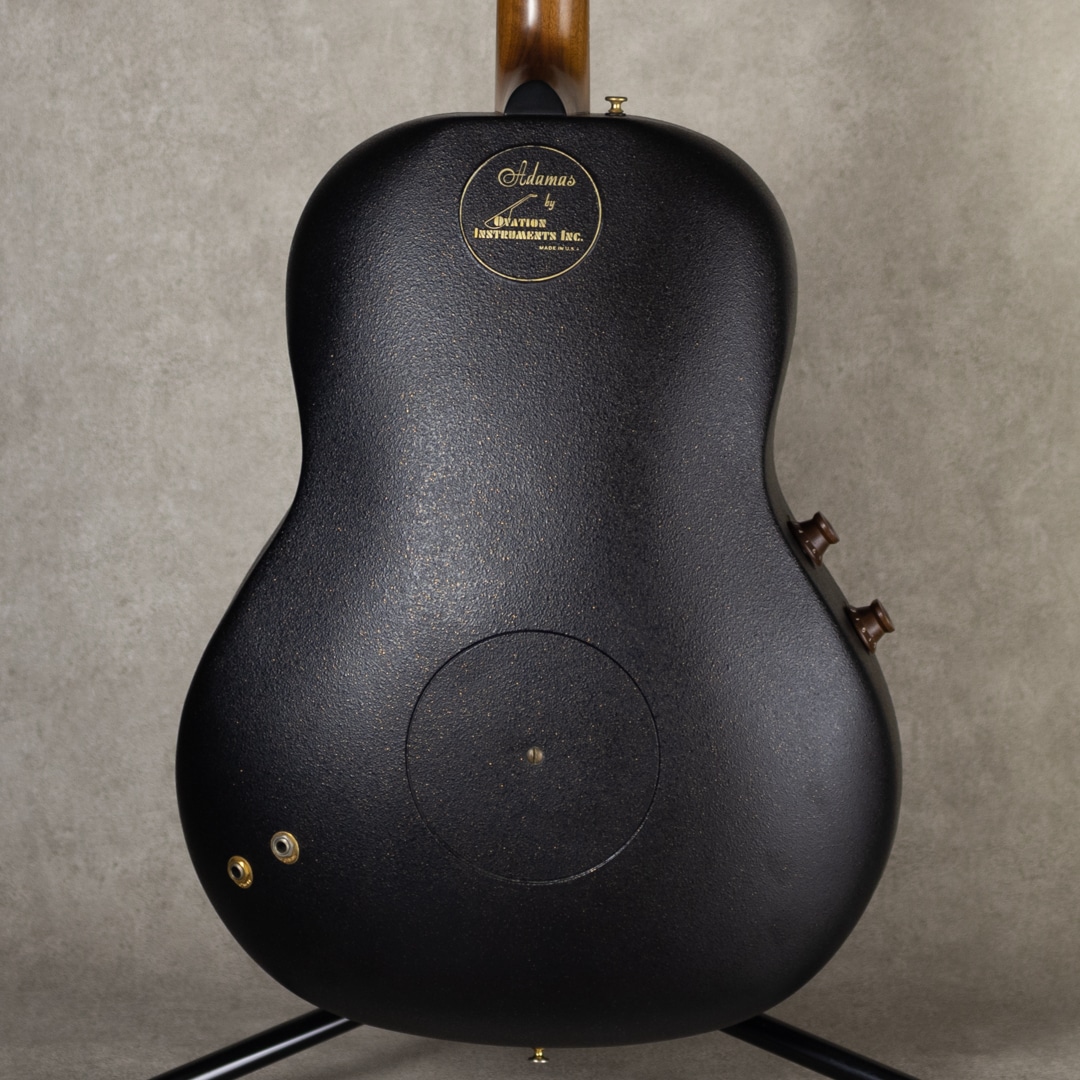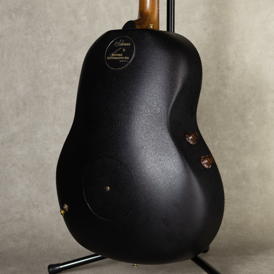 1966年、ヘリコプターの製造会社の社長であり、有名なギタリストでもあったチャールズ・カーマンによって設立されたオベーションは航空機の技術をギターに活かしたエレクトリックアコースティックギターを発売。保守的なミュージシャンにも受け入れられ、エレアコの代名詞的ブランドへと成長します。オべーション創始者チャーリー・カマンの生音へのさらなる探究心から1976年に誕生したアダマス。1976-77年にプロトタイプを多く生産し、1978年頃から今も残るスタイルのモデルを製造してきました。本器はブルーカラーの"1687-8”。2ノブ/ステレオアウトの初期仕様。1982年製極上USED品。ウッドトップの約3分の1の薄さでも十分な強度を得られるアダマス独自のカーボングラファイトトップ、リラコード樹脂ディープボウル、ウォルナットネック、ウォルナット指板&ブリッジ、ゴールドシャーラーペグ、ウッド指板インレイ、マルチプルエポーレットサウンドホール、ステレオアウト仕様。ウッドの指板ポジションやエポーレット、艶艶したヘッドと駒の彫刻等、この頃ならではともいえる精巧な仕上げの本器。ディープボウルのアダマスならではの奥深いサウンド。歯切れが良く、コンプがかったレスポンスは弾きやすくアグレッシブにプレイできます。メロウなプレイからファンキーなカッティング、ダイナミックなストロークまで、あらゆるプレイスタイルを網羅するバーサタイルなスタイルは、多くのプレイヤーによってそのサウンドを残してきました。シンプルな回路からは現行品には無い、線の太いラインサウンドも魅力です。とてもコンディションが良い本器。トップ・ボウルバックのラメも多く、ゴージャスな外観。バックのロゴ塗装もほとんど剥がれておらず、目立つ外傷も見られず。トップの変形もほとんどなく、またエポーレットウッドの剥がれも見られません。ネック周りも良好で弾きやすいアクションをしっかりと保っています。エクセレントコンディションの初期ものアダマス。コレクターズピースの1本です。オリジナルブラウンカラーハードケース付属