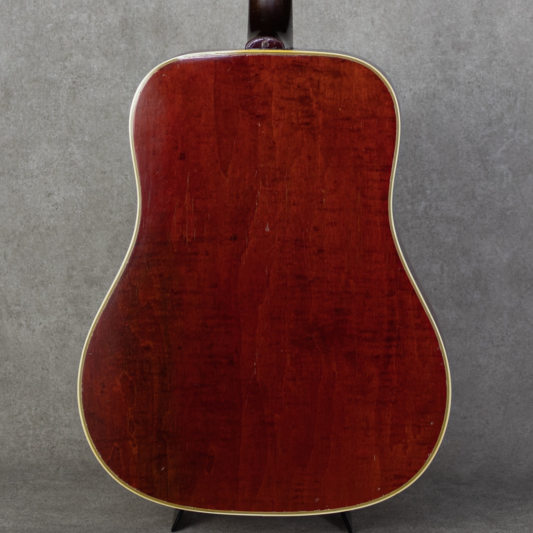 貫禄の外観と味わいあるインレイPGが印象的なフラッグシップモデル"Dove”。ギブソンとしては初となるスクエアショルダ型のハミングバードが好調だった理由で1962年にリリースが決まったが、フタを開けてみるとその生産規模はとても小さいものでした。しかし、その外観とサウンドは”King of Rock’n Roll"エルビスプレスリーも愛した特徴的で唯一無二なものでした。本器はナチュラルカラーの1968年製Vinatage品。スプルーストップ、メイプルサイド&バック、マホガニーネック、ハカランダ指板&ブリッジ、チューンOマチックサドル、クルーソンワッフルバックペグ、クラウンヘッドインレイ、ダブルパラレログラム指板インレイ、MOPダブインレイピックガード、7プライバインディング、ノンスキャロップブレイシング、ナット幅39mm、ヘッド角14度。オリジナルABR-1には、現在はブラスサドルが装着されています。弾き込まれた貫禄の外観。その外観に恥じない、荒々しくもロックなグッドサウンド。プレイヤーにドシっと響き返る乱暴な低音、歯切れよくドライな高音、最高でクールな外観。何がどうとかの理屈抜きに、ただただかっこよく、気持ちいいです。歴戦の勇者が如く、そのおびただしい傷やピックウェアなども、本物が魅せる貫禄。しかしながら割れなどはなく、ネック周りも秀逸で、くたびれ感のない快活なサウンドと弾き心地をもたらしてくれます。ボディサイドにジャック穴の埋め加工がりますが、さほど目立たず良い感じです。プレイヤーが楽器を育てる見本のような本器。まさにヴィンテージの醍醐味のひとつです。是非そのお手元で、直にご体感ください。ハードケース付属。その他の詳細もお気軽にお問い合わせ下さい。