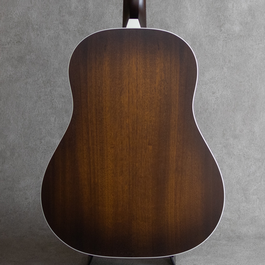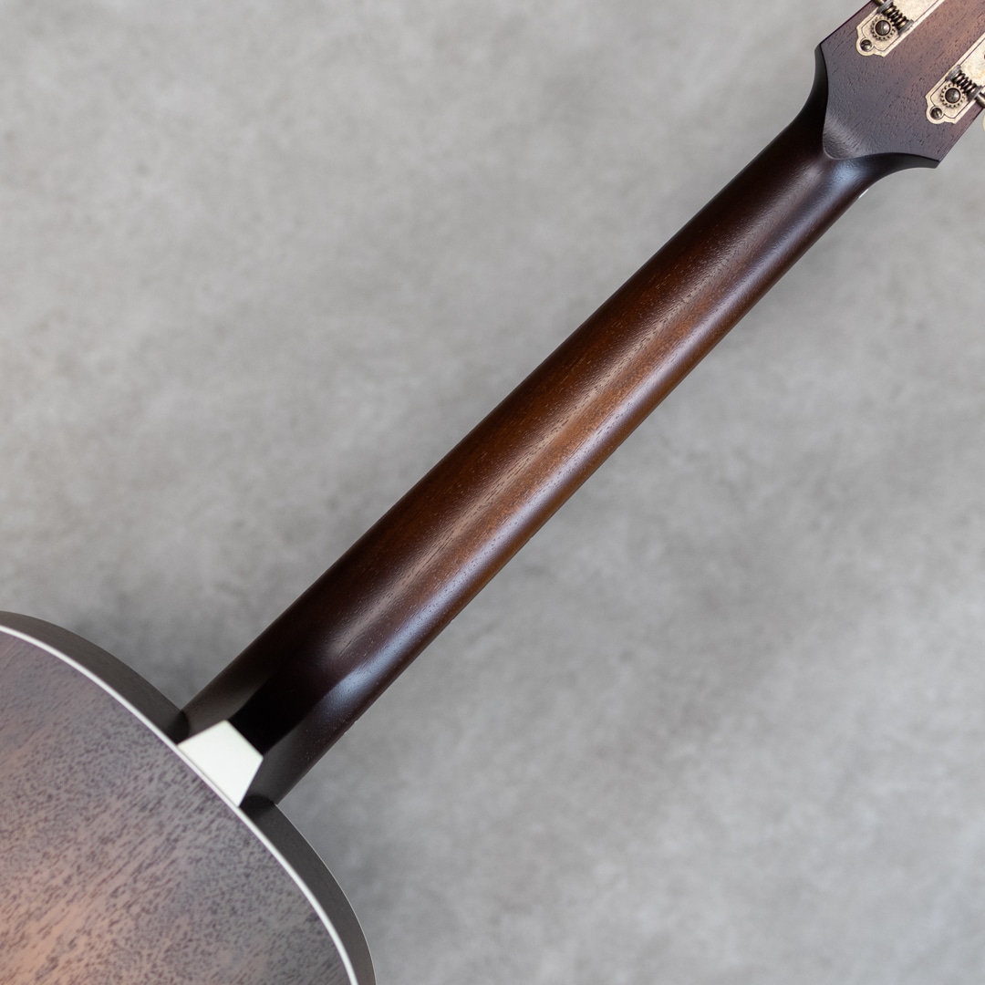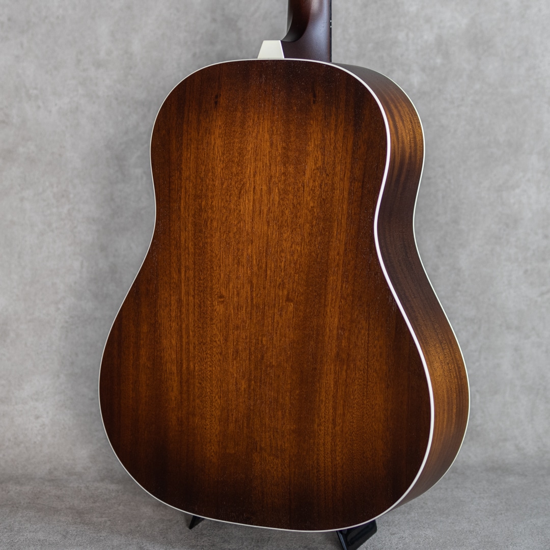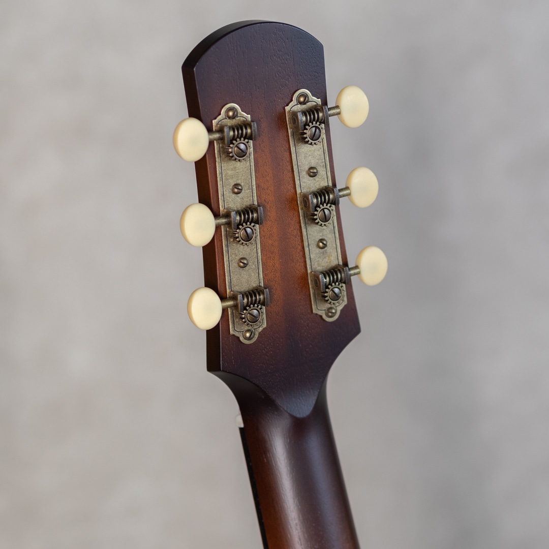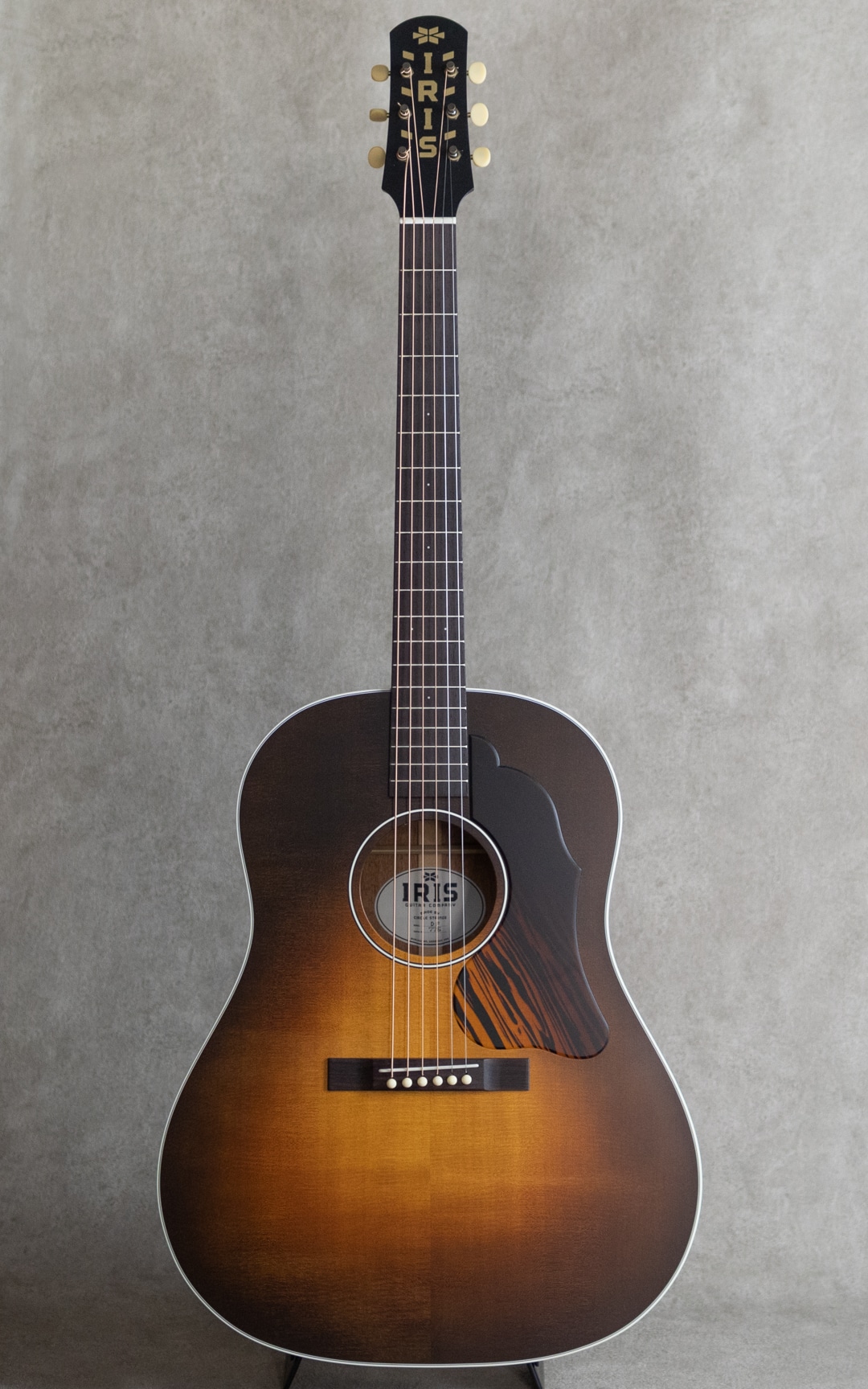 バーモント州バーリントンにて2018年に設立された”IRIS GUITAR COMPANY(アイリス・ギター・カンパニー)”。"Froggy Bottom"出身で現サークルストリングスの設立者Adam Buchwald氏と、"Fairbanks Guitars"のDale Fairbanks氏によって共同設立され、スタッフにはコリングス、サンタクルーズ、Pava、Ellisなどの名だたるアメリカンブランドで活躍したエキスパートスタッフが揃っています。Made in U.S.Aのハイクオリティーを実現しながら入手しやすい価格でプレーヤーに使えるギターを提供する事を考え、高い技術と経験を持つ少数精鋭のルシアー達のチームにより、ビンテージギターにインスパイアされたトーンと美学を捉えたモダンな楽器の製作がされています。本器は、”DF Model Adirondack Spruce Tobacco Burst”。伝統的なラウンドショルダードレッドノウト。共同設立者の1人でGibson Styleのギター製作において評価の高い"Dale Fairbanks"に因んで名付けられたモデル。アディロンダックスプルーストップ、マホガニーサイド&バック、マホガニーネック、ローズウッド指板、ローズウッドレクタングルブリッジ、ファイアーストライプピックガード、Golden Ageレリックブラスペグ、アディロンダックスプルーススキャロップドブレイシング、ボルトオンネックジョイント、木の導管が浮かぶ極薄のオープンポアサテンニトロセルロースラッカーフィニッシュ、ナット幅42.9mm、635mmスケール。テーパードヘッドやPGデザインなど随所に拘りを感じるディティールと、ヒール形状やロゴデザインがレトロでいい雰囲気を醸し出しています。スキャロップらしいふくよかで奥深い響き。30sやEarly40sのラウウンドショルダーを思わせる奥深く響きの強いボトム、それに埋もれない抜けの良いアタック、そして分離の良い倍音とコード感。一見して想像できるスタイルを裏切らない方向性と手にして驚く完成度は、待っていましたの実力派です。アディロントップモデルは、柔らかで広がりのあるレンジ感がが魅力。包み込むように広がる倍音と程よいレスポンスのタッチは、ストロークはもちろん、ラグタイムなどのフィンガースタイルにもしっかりとはまります。ハイクオリティのラウンドショルダーモデル。古き良きオーセンティックなアメリカンギターの存在感を持ちながらも現代的で確かな技術で造られるアイリスギター。現在アメリカでも話題のブランドです。是非、直にお手元でご体感下さい。
