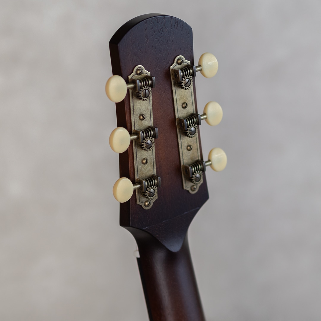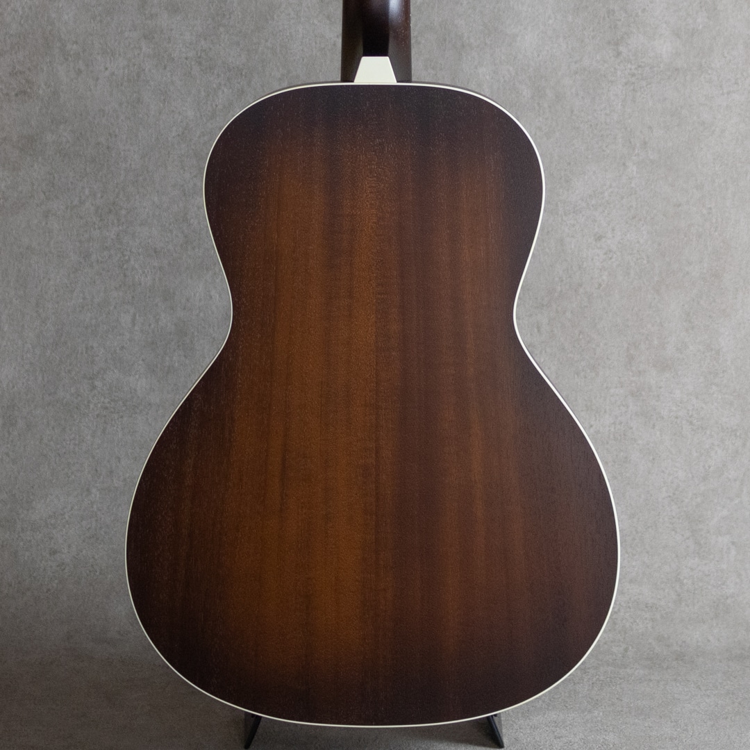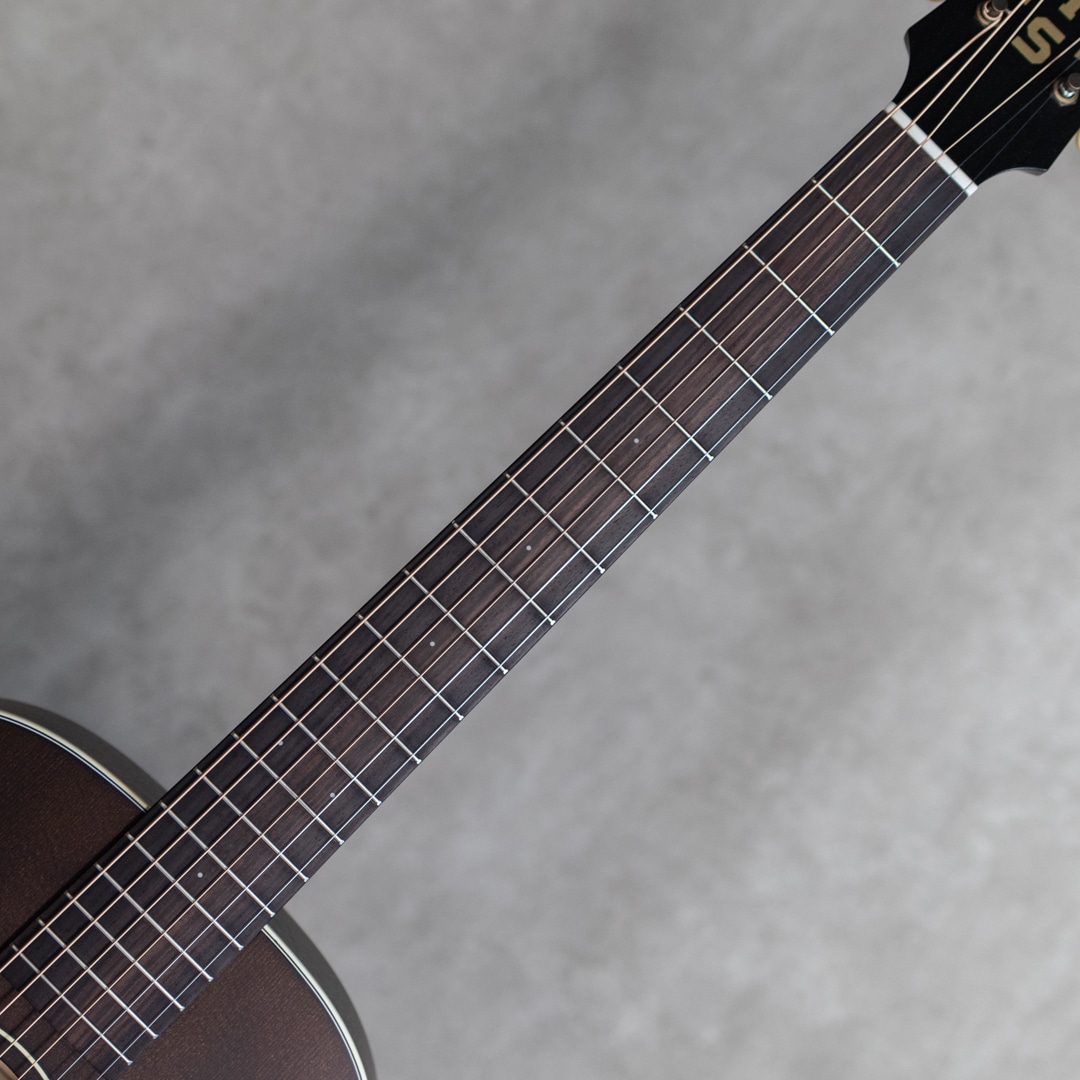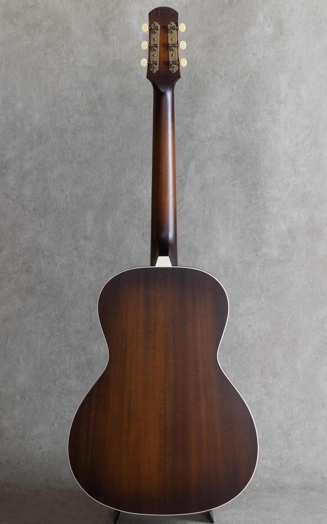 バーモント州バーリントンにて2018年に設立された”IRIS GUITAR COMPANY(アイリス・ギター・カンパニー)”。"Froggy Bottom"出身で現サークルストリングスの設立者Adam Buchwald氏と、"Fairbanks Guitars"のDale Fairbanks氏によって共同設立され、スタッフにはコリングス、サンタクルーズ、Pava、Ellisなどの名だたるアメリカンブランドで活躍したエキスパートスタッフが揃っています。Made in U.S.Aのハイクオリティーを実現しながら入手しやすい価格でプレーヤーに使えるギターを提供する事を考え、高い技術と経験を持つ少数精鋭のルシアー達のチームにより、ビンテージギターにインスパイアされたトーンと美学を捉えたモダンな楽器の製作がされています。本器は、”MS-00 Model Tobacco Burst”。ショートスケールで30年代半ばの小ぶりな00スタイル。非常に才能のある弦楽器製作者であり、ビンテージギブソンギターの専門家でも有名な、フォークウェイミュージックの”Mark Stutman"の主張に基づき開発され、名前の由来となったモデル。シトカスプルーストップ、マホガニーサイド&バック、マホガニーネック、ローズウッド指板、ローズウッドレクタングルブリッジ、ファイアーストライプピックガード、Golden Ageレリックブラスペグ、アディロンダックスプルーススキャロップドブレイシング、ボルトオンネックジョイント、木の導管が浮かぶ極薄のオープンポアサテンニトロセルロースラッカーフィニッシュ、ナット幅42.9mm、628.65mmスケール。テーパードヘッドやPGデザインなど随所に拘りを感じるディティールと、ヒール形状やロゴデザインがレトロでいい雰囲気を醸し出しています。小気味良く快活なレスポンス。暴れすぎず硬すぎず、それでいてタイトで分離良いトーン。30年代半ばの00の良さを存分に表現し体得したスモールモデル。一見して想像できるスタイルを裏切らない方向性と手にして驚く完成度は、待っていましたの実力派です。シトカトップモデルは、コシのあるアタックと太いサスティンが魅力。小気味良くしっかりと前に出るサウンドは、ラグタイムなどのフィンガースタイルはもちろん、ストロークにもしっかりとはまります。ハイクオリティのショートスケールスモールモデル。古き良きオーセンティックなアメリカンギターの存在感を持ちながらも現代的で確かな技術で造られるアイリスギター。現在アメリカでも話題のブランドです。是非、直にお手元でご体感下さい。
