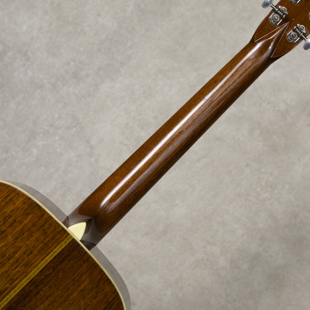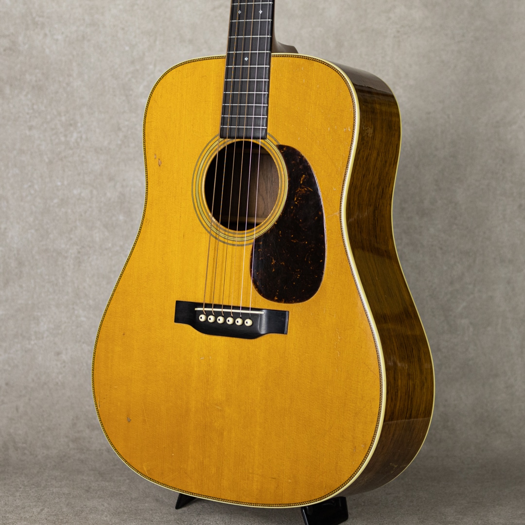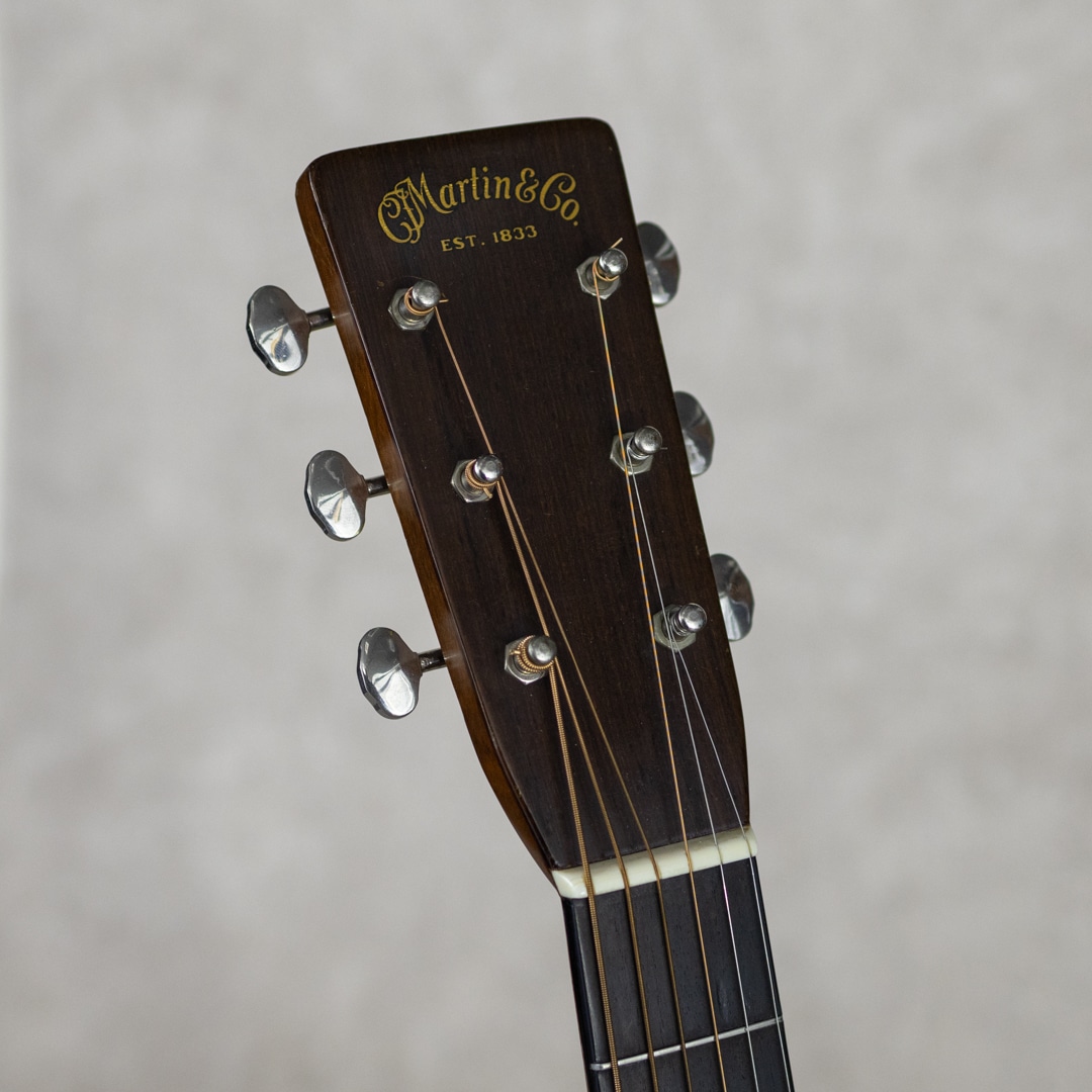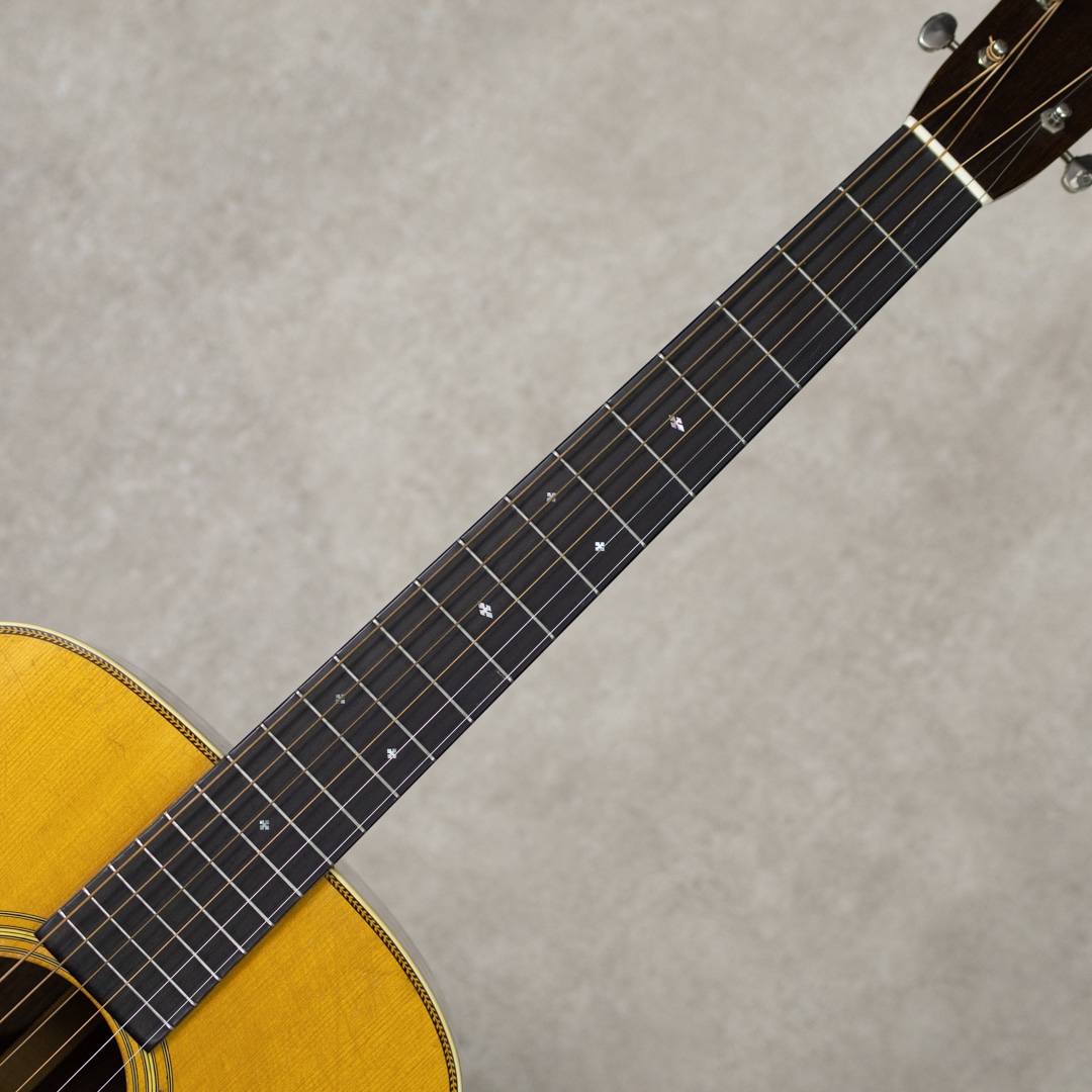 マーチンギターの中で最も有名なモデルと言えば、"D-28”。スクエアショルダーにベルシェイプのボディを持つ14fジョイントのドレッドノウトモデルはアコースティックギターの定番とも言われ、全てのフラットトップギターの基本とされてきたと言っても過言ではないワールドスタンダードモデルです。ドレッドノウトモデル自体は、1916年に”Oliver Ditson Company(オリバー・ディットソン・カンパニー)”用の商品として誕生しました。当時のドレッドノウトモデルは12fジョイントで、ボディ形状もそれまでにあった小型の”Concert”サイズを拡大した形状でした。その後、1930年にDitoson社が売却されたことを受け、Martinは自社用のモデルとしてMartinドレッドノウトモデルの製造を開始します。1931年から出荷されたMartin”D-28(12fジョイント)”ですが、その出だしは決して順調ではなく、売れ行きもまちまちだったようです。その原因のひとつには、Martin社がドレッドモデルを完全に採用することを躊躇していたのか、カタログにも掲載されていなかったそうです。そんな”D-28”ですが、1934年初頭に14fジョイントモデルへと進化します。この時に、今では当たり前に見られ定番と称されるボディ形状が誕生しました。しかし、その存在は依然として変わらず、カタログにも掲載されず売れ行きも低迷していたそうです。そんな”D-28”は1935年7月にカタログに掲載されると、その売れ行きや知名度は劇的に変化し、その後のワールドスタンダードへと成長していきます。本器は、ファーストイヤーとなる1934年製”D-28”。14fジョイントモデルのドレッドノウト初年度となる逸品です。ドレッドノウトモデルのアイコンであるヘリンボーントリムやベルシェイプボディなどは、この初年度から変わらず引き継がれていることが確認できます。トップにはアディロンダックスプルース、サイド&バックにはハカランダ、マホガニーネック、エボニー指板&ブリッジ、ロングサドル、グローバーオープンバックペグ、べっ甲柄セルロイドピックガード、スロッテドダイヤモンド指板インレイ、ジグザグバックストリップ、アイボロイドバインディング、、などなどの現在のレプリカモデルで見られる特徴も、しっかりと実在しています。また、戦前のドレッドモデルで有名なスキャロップドXブレイシングですが、もちろん本器でも採用されています。戦前モデルのブレイシング位置で有名なのはフォワードシフテッドXブレイシングですが、実は34年?35年の途中まではブレイシング位置が異なります。サウンドホールからの位置が、フォワードシフトの場合25,4mm(1”)なのに対し、本器では約30mm(約1.15”)とほんの僅かにブリッジ寄りに配されています。また、34年はネック補強芯や使用フレットの仕様変更過渡期でもあり、本器はエボニーロッドにバーフレットと言った、初期の仕様になっています。ヘッド裏のスタンプ刻印も14fモデルではまずお目にかかれず、その全てが歴史的遺産とも言える1本です。1934年製の”D-28"は後の35年製以降と異なり、製造本数も極めて少なく50数本程度しか存在しません。その中でもここまでのエクセレントコンディションかつフルオリジナルのものはまずお目にかかれない、ワールドクラスのレアアイテムです。世界で最も有名なギターのひとつ”D-28”、その初年度となる1本、さらには奇跡的なコンディションの歴史的1本。この機会を逃しては2度とお目にかかれない可能性が高い逸品です。その他詳細などはお問い合わせください。