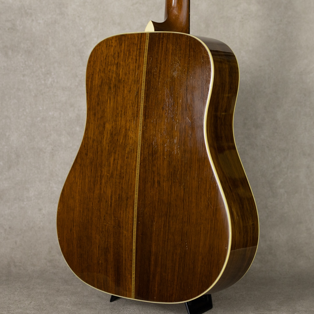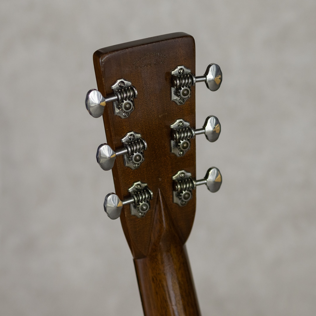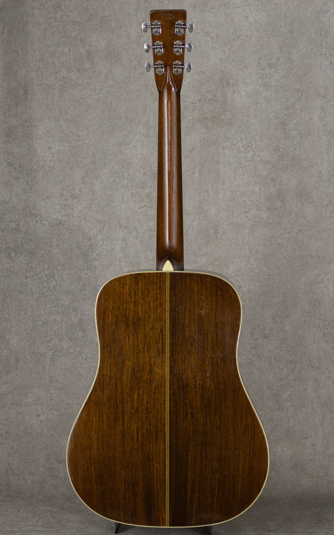 マーチンギターの中で最も有名なモデルと言えば、"D-28”。スクエアショルダーにベルシェイプのボディを持つ14fジョイントのドレッドノウトモデルはアコースティックギターの定番とも言われ、全てのフラットトップギターの基本とされてきたと言っても過言ではないワールドスタンダードモデルです。ドレッドノウトモデル自体は、1916年に”Oliver Ditson Company(オリバー・ディットソン・カンパニー)”用の商品として誕生しました。当時のドレッドノウトモデルは12fジョイントで、ボディ形状もそれまでにあった小型の”Concert”サイズを拡大した形状でした。その後、1930年にDitoson社が売却されたことを受け、Martinは自社用のモデルとしてMartinドレッドノウトモデルの製造を開始します。1931年から出荷されたMartin”D-28(12fジョイント)”ですが、その出だしは決して順調ではなく、売れ行きもまちまちだったようです。その原因のひとつには、Martin社がドレッドモデルを完全に採用することを躊躇していたのか、カタログにも掲載されていなかったそうです。そんな”D-28”ですが、1934年初頭に14fジョイントモデルへと進化します。この時に、今では当たり前に見られ定番と称されるボディ形状が誕生しました。しかし、その存在は依然として変わらず、カタログにも掲載されず売れ行きも低迷していたそうです。そんな”D-28”は1935年7月にカタログに掲載されると、その売れ行きや知名度は劇的に変化し、その後のワールドスタンダードへと成長していきます。本器は、ファーストイヤーとなる1934年製”D-28”。14fジョイントモデルのドレッドノウト初年度となる逸品です。ドレッドノウトモデルのアイコンであるヘリンボーントリムやベルシェイプボディなどは、この初年度から変わらず引き継がれていることが確認できます。トップにはアディロンダックスプルース、サイド&バックにはハカランダ、マホガニーネック、エボニー指板&ブリッジ、ロングサドル、グローバーオープンバックペグ、べっ甲柄セルロイドピックガード、スロッテドダイヤモンド指板インレイ、ジグザグバックストリップ、アイボロイドバインディング、、などなどの現在のレプリカモデルで見られる特徴も、しっかりと実在しています。また、戦前のドレッドモデルで有名なスキャロップドXブレイシングですが、もちろん本器でも採用されています。戦前モデルのブレイシング位置で有名なのはフォワードシフテッドXブレイシングですが、実は34年?35年の途中まではブレイシング位置が異なります。サウンドホールからの位置が、フォワードシフトの場合25,4mm(1”)なのに対し、本器では約30mm(約1.15”)とほんの僅かにブリッジ寄りに配されています。また、34年はネック補強芯や使用フレットの仕様変更過渡期でもあり、本器はエボニーロッドにバーフレットと言った、初期の仕様になっています。ヘッド裏のスタンプ刻印も14fモデルではまずお目にかかれず、その全てが歴史的遺産とも言える1本です。1934年製の”D-28"は後の35年製以降と異なり、製造本数も極めて少なく50数本程度しか存在しません。その中でもここまでのエクセレントコンディションかつフルオリジナルのものはまずお目にかかれない、ワールドクラスのレアアイテムです。世界で最も有名なギターのひとつ”D-28”、その初年度となる1本、さらには奇跡的なコンディションの歴史的1本。この機会を逃しては2度とお目にかかれない可能性が高い逸品です。その他詳細などはお問い合わせください。