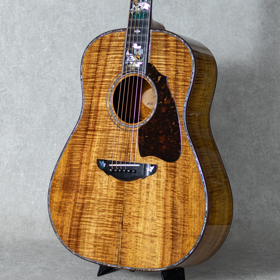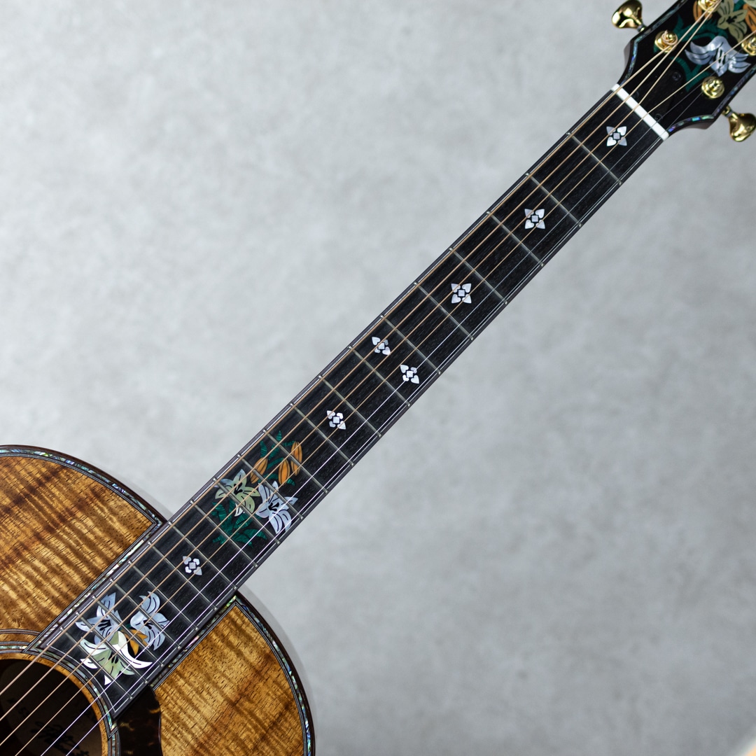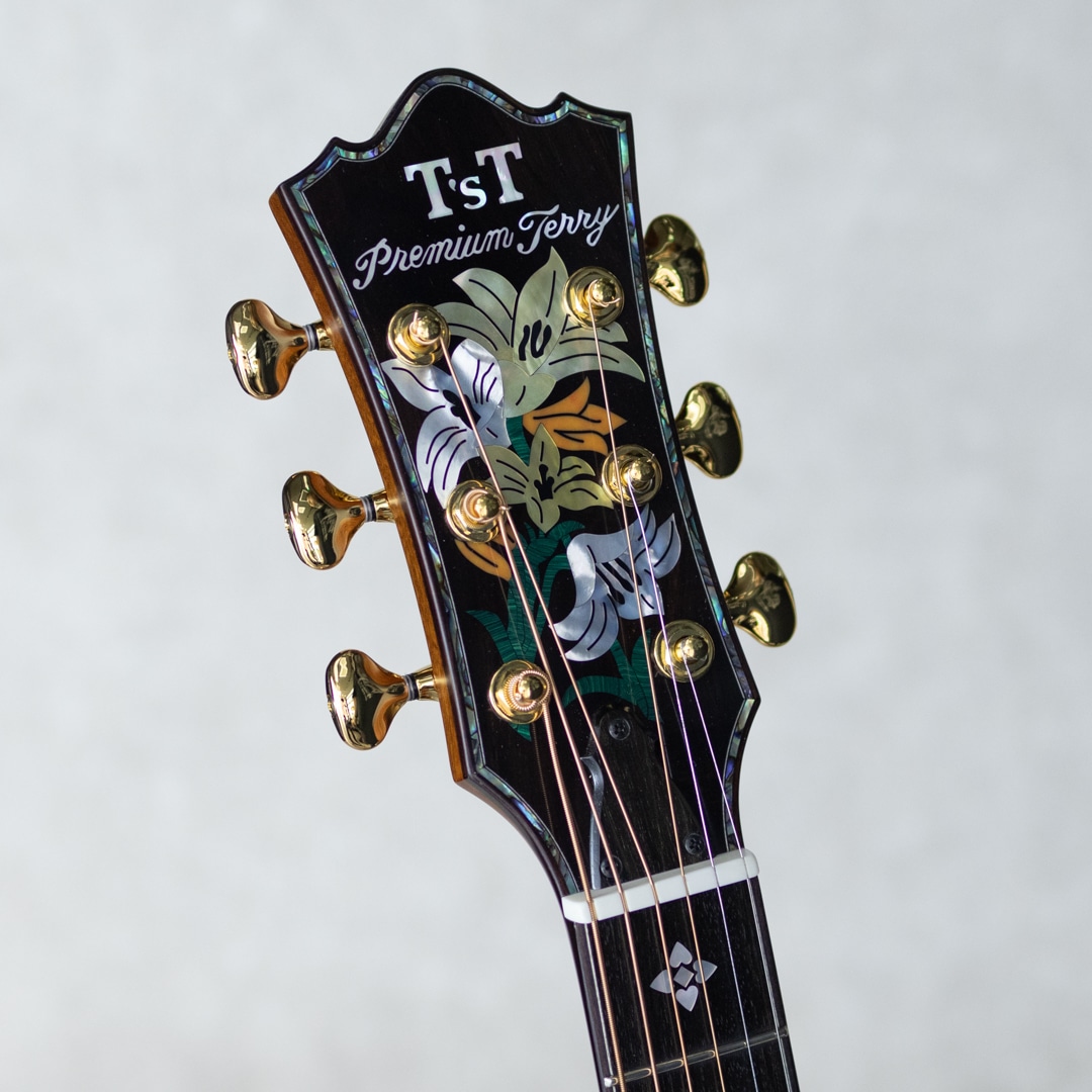 日本にカスタムギターを根付かせた最大の功労者といえるテリー中本氏が贈るT'sTのニューブランド、"Premium Terry(プレミアム・テリー)"。Terry's Terry直系の本格的なアコースティックギターで、今まで氏が培ってきたノウハウがこれでもかというほど詰め込まれています。本器は、オールコアモデルの"PTJ-100 K2 YURI”。大きく揺らめく極上のハワイアンコアを使用した、テリーズテリーの代表モデルでもあるTJ/オリジナルジャンボボディの1本。2022年製極上USED品。全面に揺らめく縮み杢の浮き出た極上フィギュアドハワイアンコアをトップ&サイド&バックに採用。ホンジュラスマホガニー&メイプル積層ネック、エボニー指板&ブリッジ、オリジナルゴトー510ペグ、本べっ甲ピックガード、アバロンロゼッタ&トリム、ローズウッドバインディング。ヘッドと指板には、大ぶりで美麗なユリをモチーフにインレイワークが施されています。眺めているだけでため息の出てくるテリーズデザインの妙。派手で美しい佇まいながら、大味過ぎずしっかりと主張を伴うデザインは、テリー中本のお得意どころ。見た目の精巧さはもちろんながら、その音色も美事で、奥深く響きの大きいサウンドはドレッドらしく派手さを伴うトーンです。コアならではの軽やかさを伴う太い響きと、テリーズ直径のシャイニーな響きは、本モデルでも十二分に味わっていただけます。目立つ使用感も伺いにくい極上コンディションの本器。ネック周りも良好で、弾きやすいアクションをしっかりと保っています。近年、良質なハワイアンコア材は少なくなっており、材の入手も困難。またドレッドサイズでこれほどの杢を楽しめる材はなおさらです。憧れのテリーズギター、そして希少なマテリアルと高い完成度。。是非、お手元で味わっていただきたい至極の1本。新品発売時に即完売となったレアモデルが極上コンディションで。。お見逃しなく。。オリジナルハードケース付属