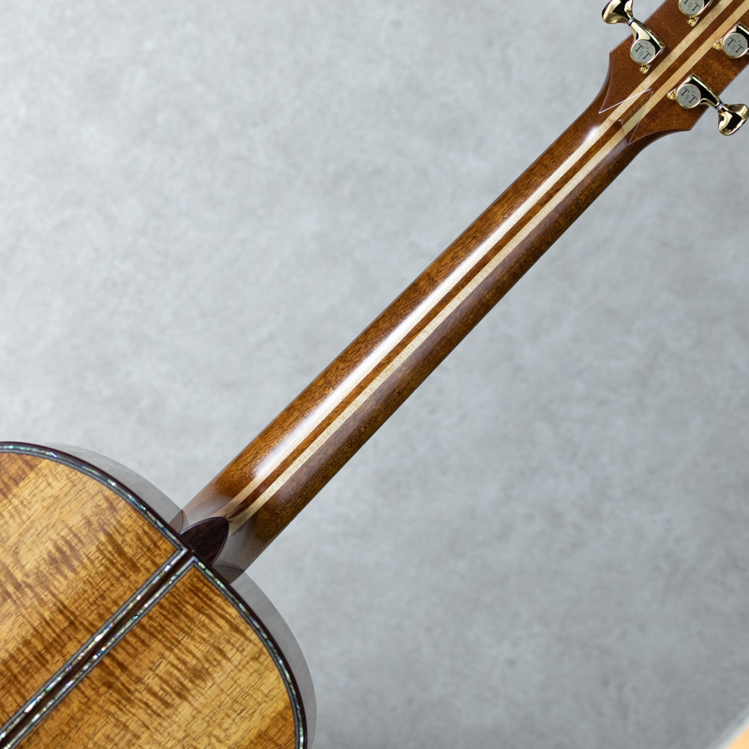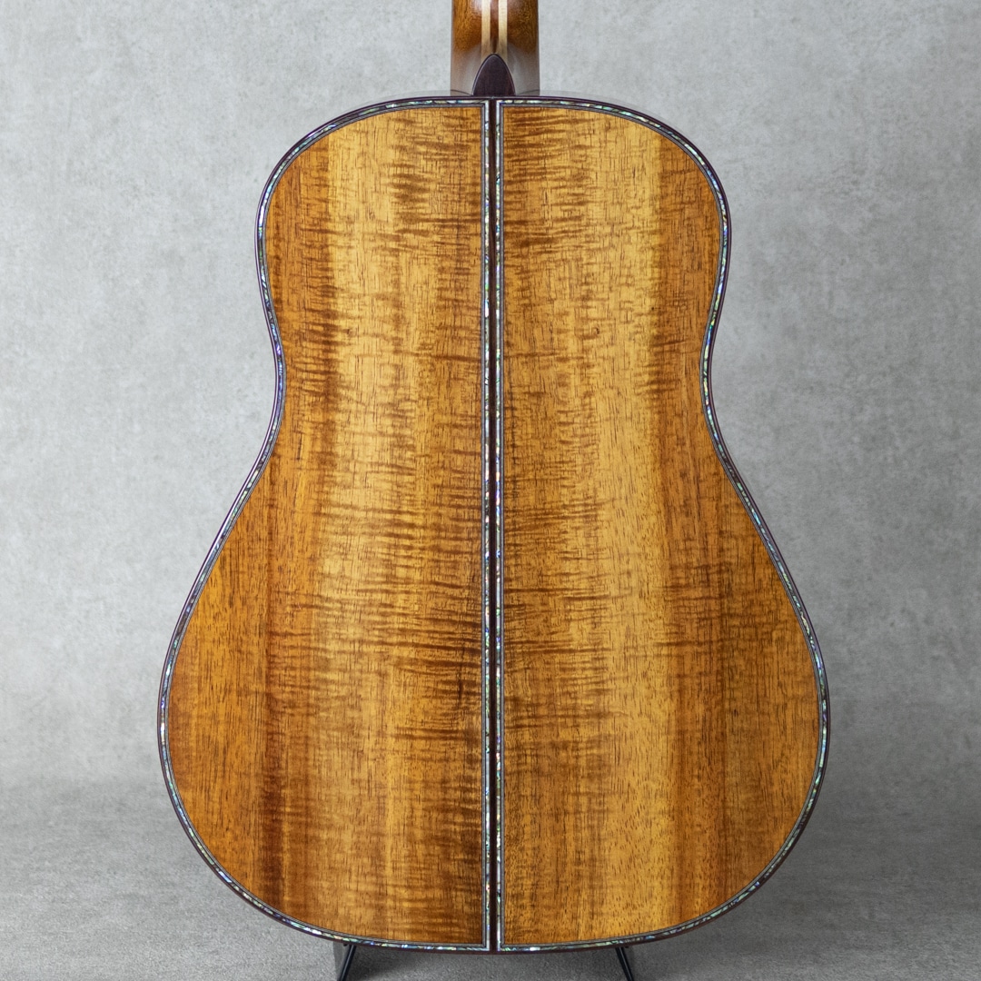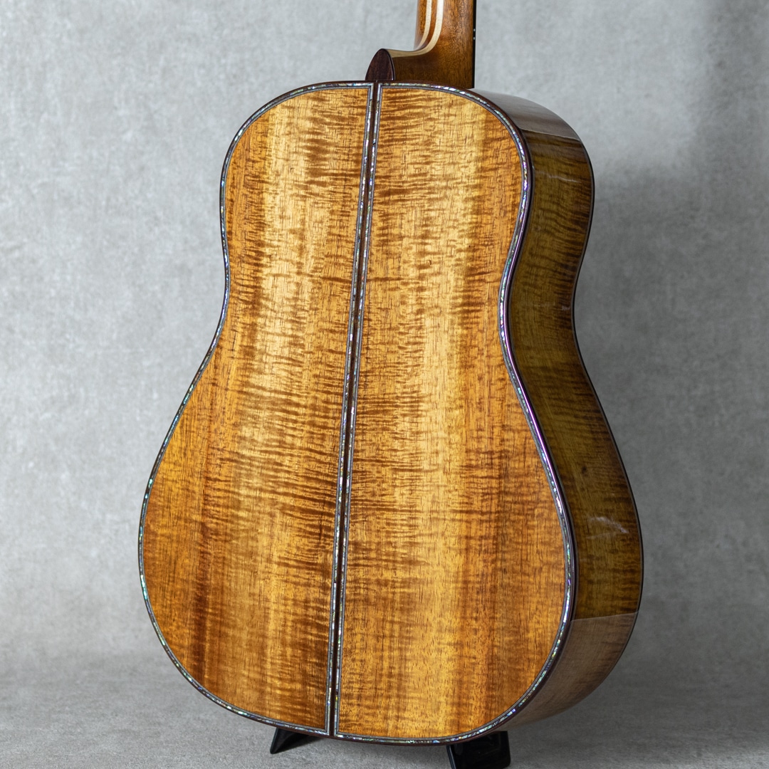 日本にカスタムギターを根付かせた最大の功労者といえるテリー中本氏が贈るT'sTのニューブランド、"Premium Terry(プレミアム・テリー)"。Terry's Terry直系の本格的なアコースティックギターで、今まで氏が培ってきたノウハウがこれでもかというほど詰め込まれています。本器は、オールコアモデルの"PTJ-100 K2 YURI”。大きく揺らめく極上のハワイアンコアを使用した、テリーズテリーの代表モデルでもあるTJ/オリジナルジャンボボディの1本。2022年製極上USED品。全面に揺らめく縮み杢の浮き出た極上フィギュアドハワイアンコアをトップ&サイド&バックに採用。ホンジュラスマホガニー&メイプル積層ネック、エボニー指板&ブリッジ、オリジナルゴトー510ペグ、本べっ甲ピックガード、アバロンロゼッタ&トリム、ローズウッドバインディング。ヘッドと指板には、大ぶりで美麗なユリをモチーフにインレイワークが施されています。眺めているだけでため息の出てくるテリーズデザインの妙。派手で美しい佇まいながら、大味過ぎずしっかりと主張を伴うデザインは、テリー中本のお得意どころ。見た目の精巧さはもちろんながら、その音色も美事で、奥深く響きの大きいサウンドはドレッドらしく派手さを伴うトーンです。コアならではの軽やかさを伴う太い響きと、テリーズ直径のシャイニーな響きは、本モデルでも十二分に味わっていただけます。目立つ使用感も伺いにくい極上コンディションの本器。ネック周りも良好で、弾きやすいアクションをしっかりと保っています。近年、良質なハワイアンコア材は少なくなっており、材の入手も困難。またドレッドサイズでこれほどの杢を楽しめる材はなおさらです。憧れのテリーズギター、そして希少なマテリアルと高い完成度。。是非、お手元で味わっていただきたい至極の1本。新品発売時に即完売となったレアモデルが極上コンディションで。。お見逃しなく。。オリジナルハードケース付属