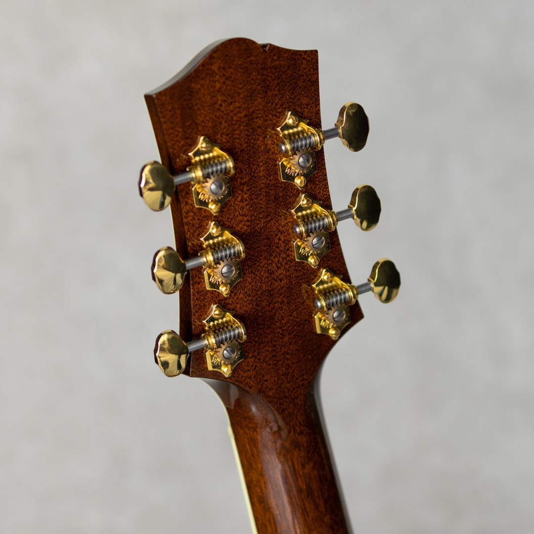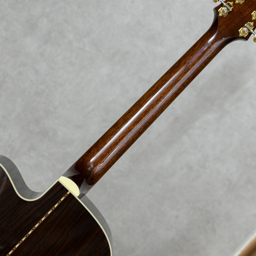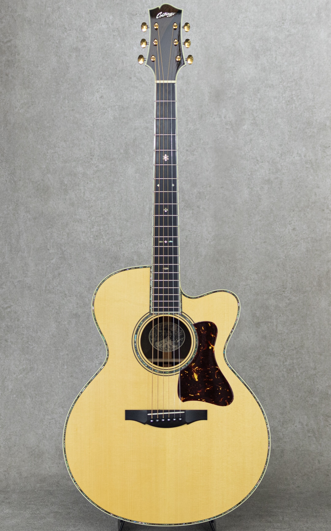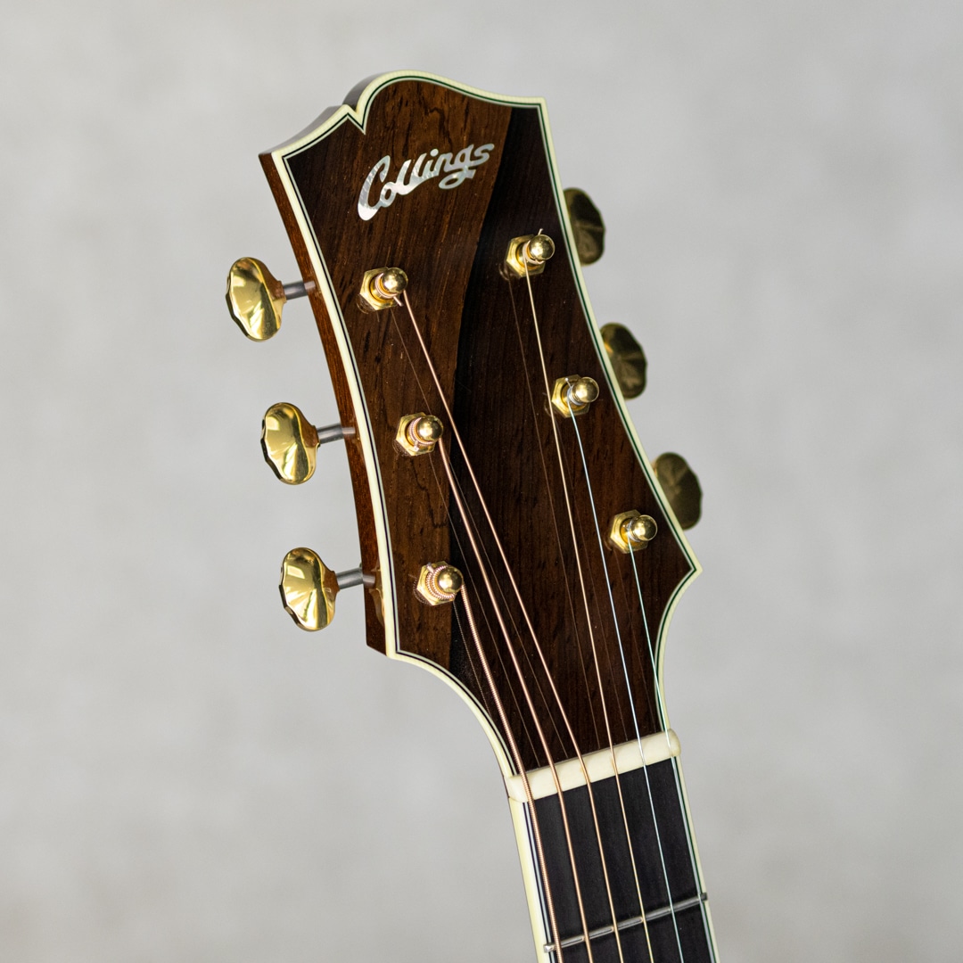 世界的にもっとも高い評価を得ているブランドの一つであるコリングスギター。コリングスの高く保たれたその完成度は、プレイヤーがその楽器を手に持つだけで見惚れてしまう美しさを持ち、音を出せば納得する響きを放ちます。本器は、極上オプションを満載したカスタムメイドの”SJ42 BaaaA Cutaway”。現在ではまずお目にかかれない極上マテリアルを贅沢に使用した逸品。2009年製極上USED品。目幅が狭く柾目杢が美しく揺らめく極上アディロンダックスプルーストップ、全体に本柾目杢を配し黒々とした極上ハカランダサイド&バック、ホンジュラスマホガニーネック、エボニー指板、エボニーブリッジ、ウェバリーオープンバックペグ、ハカランダ天神板、Style42ショートパターンスノウフレイクス指板インレイ、べっ甲柄ピックガード、Style42アバロンインレイトップパーフリング、アバロンロゼッタ、モザイクバックストリップ、アイボロイドバインディング、カッタウェイボディ、トップ構造は戦前マーチンの問題点を考慮したオリジナルスキャロップブレイシング。エキゾチックウッドS&Bモデル自体が流通少なく、またハカランダモデルは他社に比べても珍しいコリングス。その中でも”aaa”グレードの柾目ハカランダの16”オーバーのボディサイズものはさらに少ないです。またコリングスと言えばアディロンダックと言えるほどの強いこだわりを見せますが、ここまでの均一で狭い目幅のアディロン材は最近では存在自体がレア。また同じく16”オーバーのサイズでの使用は困難この上ないです。それもこれも同じくコリングスの中でも流通少ない人気オプションのStyle42のパーフリングオプションを合わせたオーダーだから実現されたのではないでしょうか。コリングスSJは隠れた実力派モデルで、あまり流通しないのでご存知でない方も多いかもしれませんが、多くのプレイヤーを魅了する完成度の高いモデルのひとつです。ふくよかで柔らかな倍音、ハリがあり重厚感のあるサウンド、それらがバランスよく大音量でアウトされるコリングスSJモデル。より実戦向きでとても素晴らしいサウンドを放つ魅惑の1本です。またカッタウェイオプションも少なく魅力的。Style42パーフリングはカッタウェイと合わせるとさらに製造精度が難しくなることから、ノンカッタウェイとは別オプションに設定されているほどです。光にかざせばいくらかの使用感や小傷は伺えますが、目立つ傷はなくグッドコンディションの本器。ネック周りはいわずもがな、さすがコリングスのパーフェクトコンディションで、弾きやすいアクションを保っています。さまざまなレアオプション&マテリアルを満載したコリングスのトップモデルの1本。是非お見逃しなくよう要チェックください。この素晴らしさは是非お手元で。。オリジナルハードケース付属