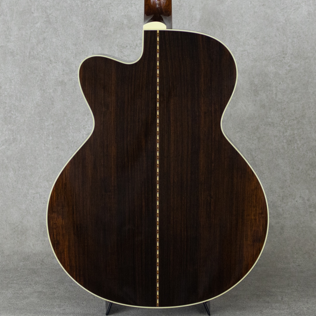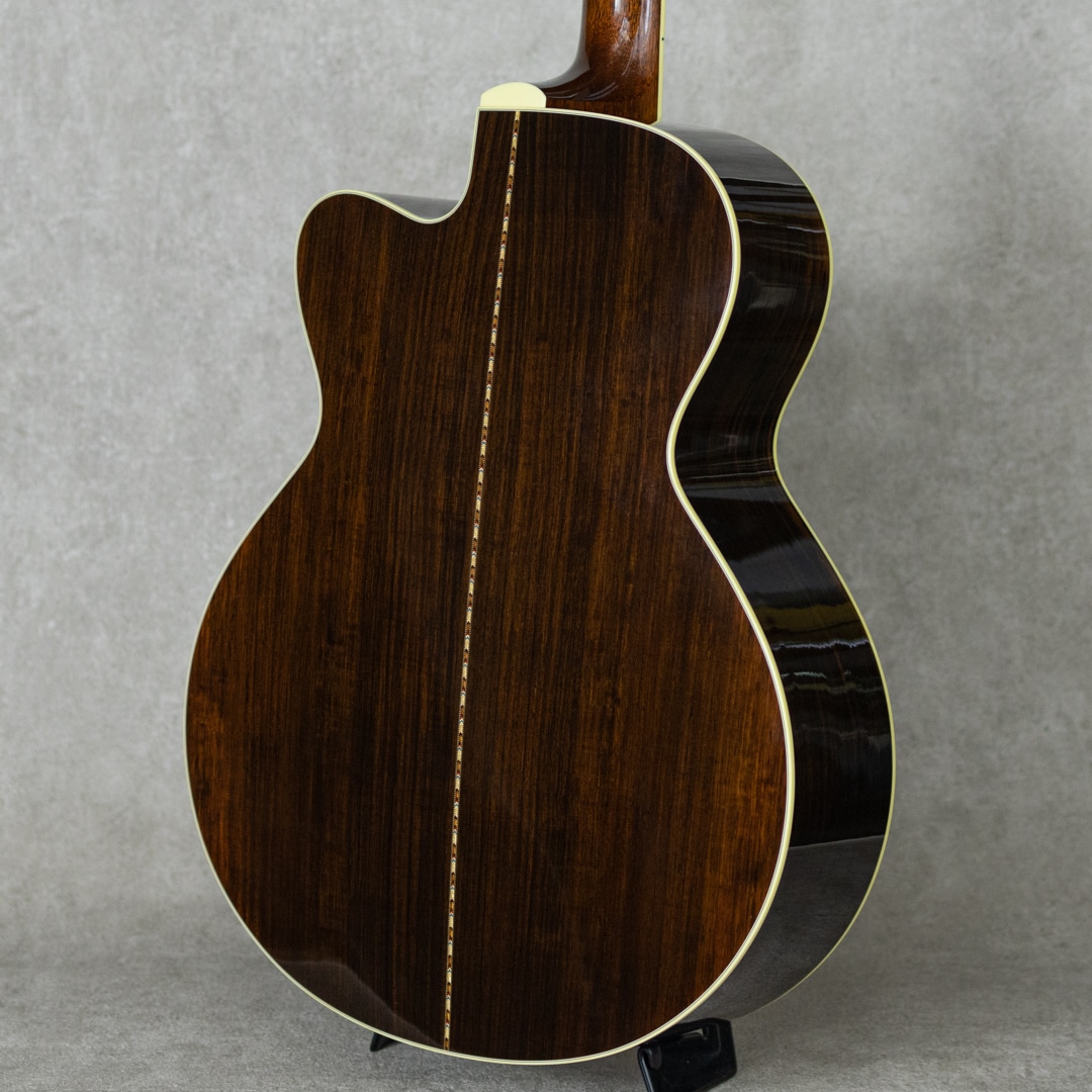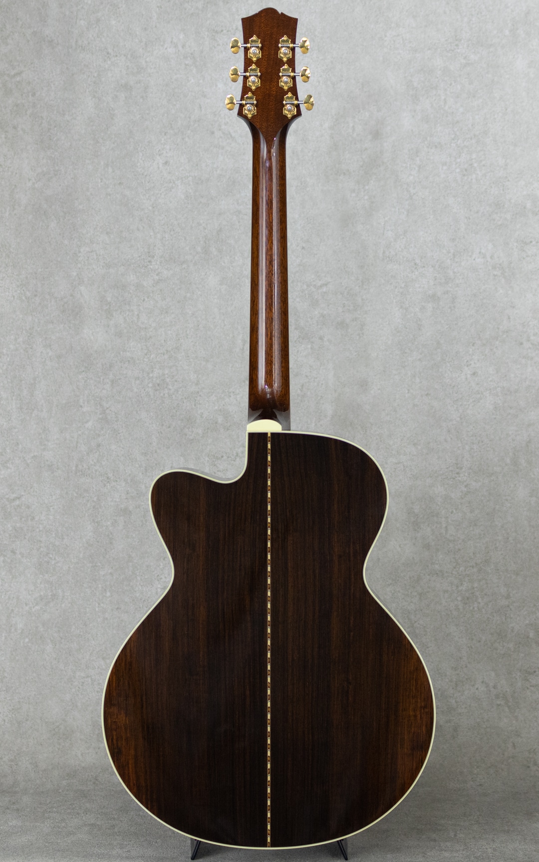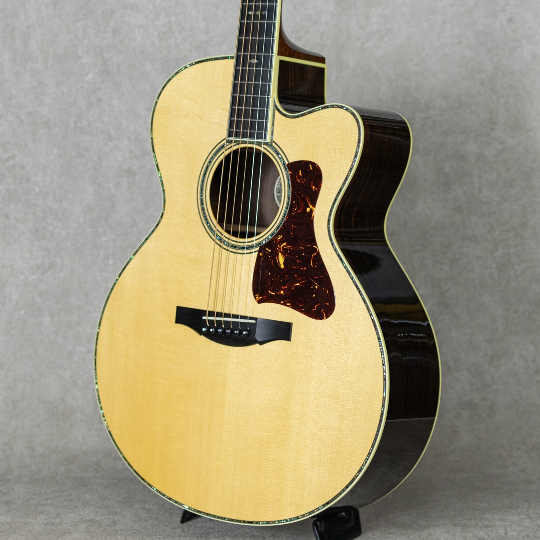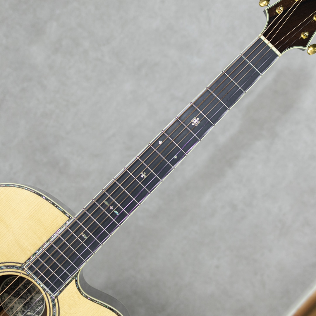 世界的にもっとも高い評価を得ているブランドの一つであるコリングスギター。コリングスの高く保たれたその完成度は、プレイヤーがその楽器を手に持つだけで見惚れてしまう美しさを持ち、音を出せば納得する響きを放ちます。本器は、極上オプションを満載したカスタムメイドの”SJ42 BaaaA Cutaway”。現在ではまずお目にかかれない極上マテリアルを贅沢に使用した逸品。2009年製極上USED品。目幅が狭く柾目杢が美しく揺らめく極上アディロンダックスプルーストップ、全体に本柾目杢を配し黒々とした極上ハカランダサイド&バック、ホンジュラスマホガニーネック、エボニー指板、エボニーブリッジ、ウェバリーオープンバックペグ、ハカランダ天神板、Style42ショートパターンスノウフレイクス指板インレイ、べっ甲柄ピックガード、Style42アバロンインレイトップパーフリング、アバロンロゼッタ、モザイクバックストリップ、アイボロイドバインディング、カッタウェイボディ、トップ構造は戦前マーチンの問題点を考慮したオリジナルスキャロップブレイシング。エキゾチックウッドS&Bモデル自体が流通少なく、またハカランダモデルは他社に比べても珍しいコリングス。その中でも”aaa”グレードの柾目ハカランダの16”オーバーのボディサイズものはさらに少ないです。またコリングスと言えばアディロンダックと言えるほどの強いこだわりを見せますが、ここまでの均一で狭い目幅のアディロン材は最近では存在自体がレア。また同じく16”オーバーのサイズでの使用は困難この上ないです。それもこれも同じくコリングスの中でも流通少ない人気オプションのStyle42のパーフリングオプションを合わせたオーダーだから実現されたのではないでしょうか。コリングスSJは隠れた実力派モデルで、あまり流通しないのでご存知でない方も多いかもしれませんが、多くのプレイヤーを魅了する完成度の高いモデルのひとつです。ふくよかで柔らかな倍音、ハリがあり重厚感のあるサウンド、それらがバランスよく大音量でアウトされるコリングスSJモデル。より実戦向きでとても素晴らしいサウンドを放つ魅惑の1本です。またカッタウェイオプションも少なく魅力的。Style42パーフリングはカッタウェイと合わせるとさらに製造精度が難しくなることから、ノンカッタウェイとは別オプションに設定されているほどです。光にかざせばいくらかの使用感や小傷は伺えますが、目立つ傷はなくグッドコンディションの本器。ネック周りはいわずもがな、さすがコリングスのパーフェクトコンディションで、弾きやすいアクションを保っています。さまざまなレアオプション&マテリアルを満載したコリングスのトップモデルの1本。是非お見逃しなくよう要チェックください。この素晴らしさは是非お手元で。。オリジナルハードケース付属