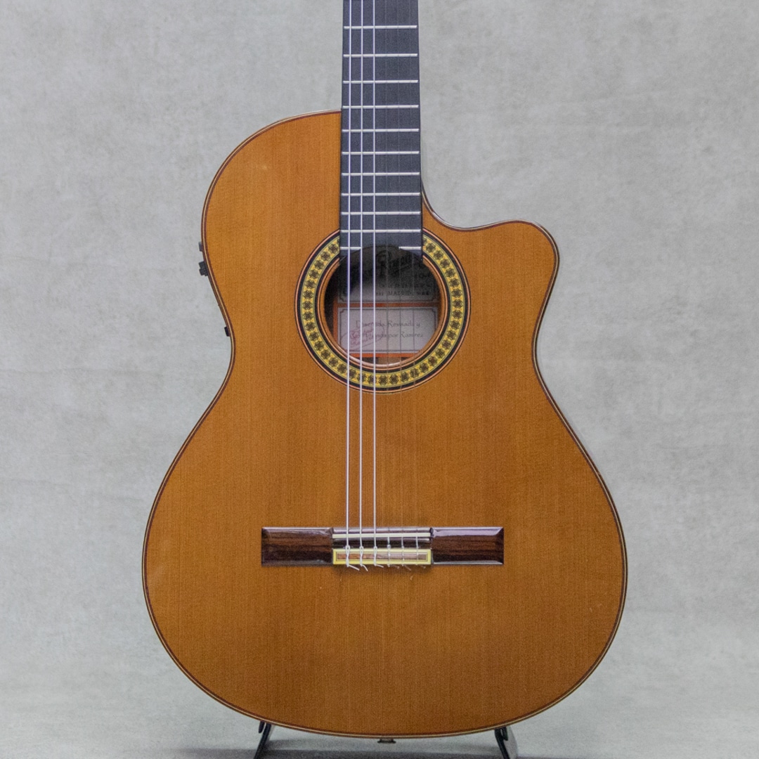 スペイン製クラシックギター名門ブランド"Jose Ramirez(ホセ・ラミレス)"。1882年頃、ホセ・ラミレス1世によってスペイン・マドリードに立ち上げられた工房に端を発し、その後も兄弟、子孫へと引き継がれてきた"Jose Ramirez"。由緒正しく広く知られるスパニッシュギターの雄として現在もジャンルの一翼を大きく担い続け、伝統的な高級手工モデルから、スペイン国内の専門工場にて生産されるミドルモデルまで手掛けています。本器は、幅広い層に向けたエレクトリックカッタウェイシリーズの"4CWE"。シダートップ、インディアンローズウッドサイド&バック、シダーネック、エボニー指板、ローズウッドブリッジ、ローズウッドバインディング、FISHMAN Prefix Pro Blend搭載、カッタウェイ仕様。大胆なカッタウェイとも合わさってバーサタイルなスタイルのエレガットながら、下位モデルとは一線を画す単板仕様による豊かな生鳴のポテンシャルを持ったモデル。単音にしっかりと芯のある骨太な音色はレスポンスも素晴らしく、トーンバランスの整った高いクオリティで、クラシックのみならずポップス、ジャズ、ボサノバと幅広くお楽しみいただけます。PU出力では、アンダーサドルピエゾ+コンディンサーマイクのミックスでナチュラルかつ幅広い出力が可能。若干の小傷・打痕や弦飛び傷は見受けられますが、大きくエグるような木部のダメージは見られず、板割れなどもなく良好なコンディション。ネックまわりの状態も良好で気持ちの良い演奏性でご利用いただけます。幅広く活躍する本格的なエレガットモデル。是非ご活躍ください。オリジナルハードケース付属