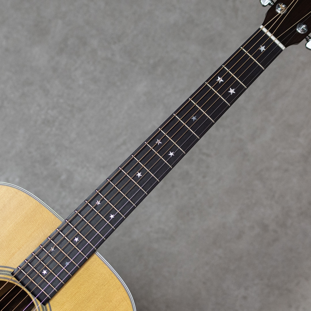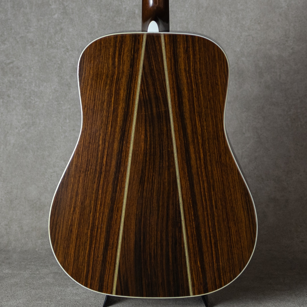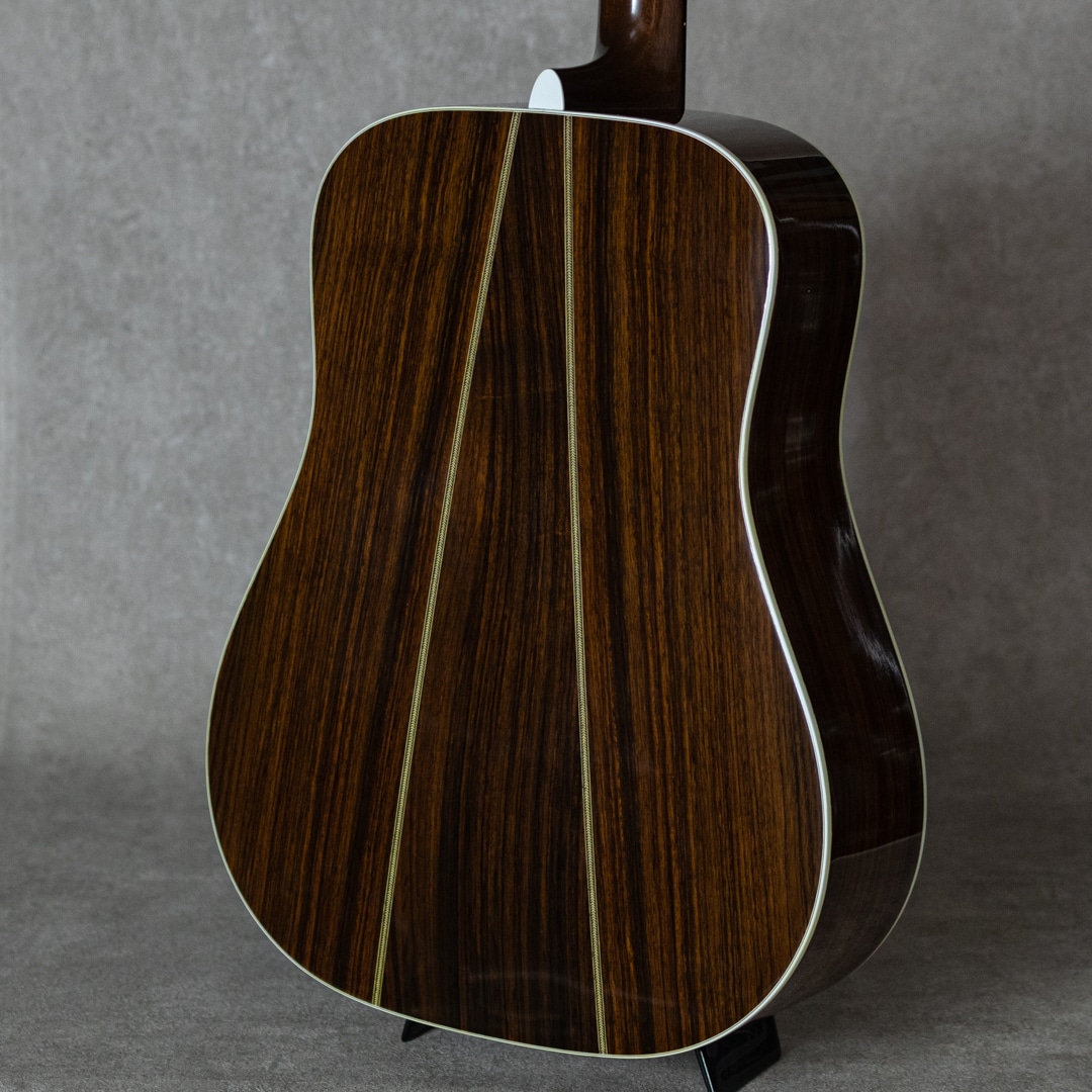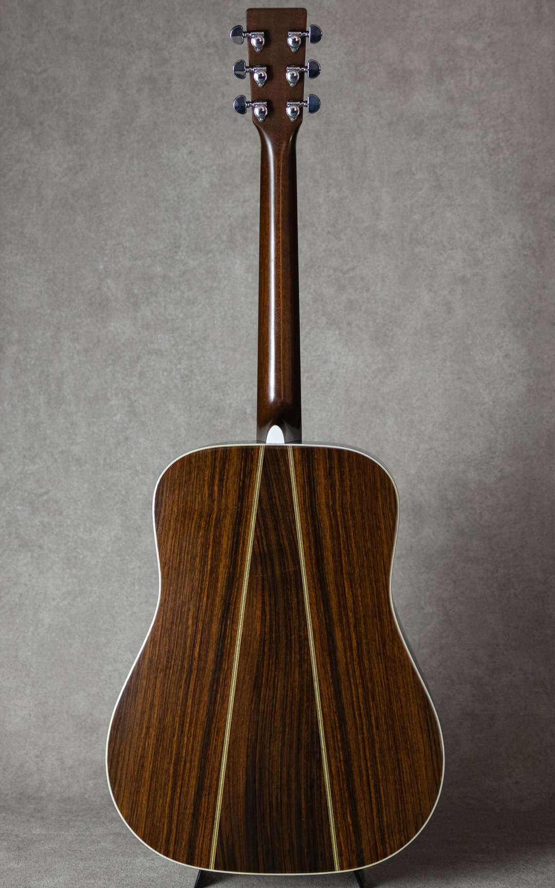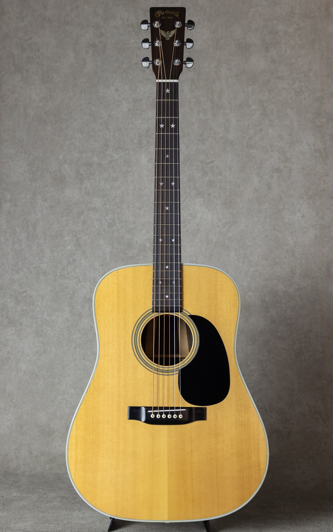 アメリカ建国200周年記念の1976年に1976本限定で生産された"D-76"。1776年の独立宣言から200年を記念して生産されたもっとも有名なリミテッドモデルのひとつで、ギターの”D-76”とバンジョーの”V-76”がリリースされました。”D-76”は200年に因んで1975年に200本、1976年には1776本の計1976本が2年間にわたって製造されました。当時のD-45と同グレードの材で製作されたモデルで、ミュージシャンの使用なども相まって人気の高いモデルです。本器は1976年製造分の1本。シトカスプルーストップ、インディアンローズウッドサイド&バック、マホガニーネック、エボニー指板&ブリッジ、ミルクボトルグローバーペグ、MOP指板スターインレイ、ヘリンボーンロゼッタ&バックストリップ、スクエアネックロッド、ラージローズウッドブリッジプレート、ノンスキャロップブレイシング。イーグルヘッドインレイや、指板には独立当時の13州を星に見立てて入れられていたり、ヘリンボーンの装飾など、拘りの詰まったデザイン。マーチン社のとっても歴史的意味合いの深いモデルです。また本器には、当時の購入者証明書やワランティ、当時付属していた1867年フィラデルフィア万博へのアメリカ建国100周年記念出展賞状のレプリカや当時のカタログなどの紙面資料などが揃ったクローゼットコンディションのマスターピースです。76は35ベースデザインで軽やかな響きですが、45と同等で倍音構成は45のそれと同じでサスティンの長いゴージャスな響きもはらんでいます。トップの色焼け・褪色なども少なく、金属パーツのくすみなどもなく、極上コンディション。流石に若干の小傷やマーチンクラックの補修とピックガード交換はされていますが、驚くほどのニアミントコンディションの1本です。また付属のブルーケースにも色焼けもほとんど見られず、底鋲や蝶番の金属パーツにサビも見られない、5つ鍵・ブルーインナーの年代マッチングケースです。この上ないコレクタブルな1本、このご機会お見逃しなく。。