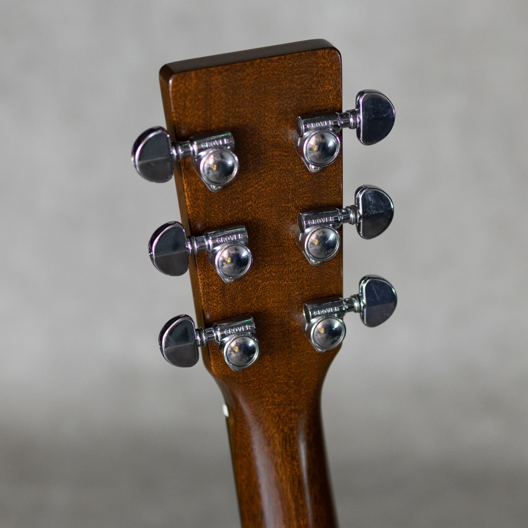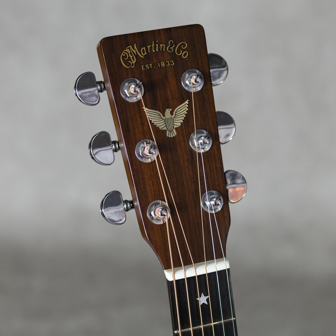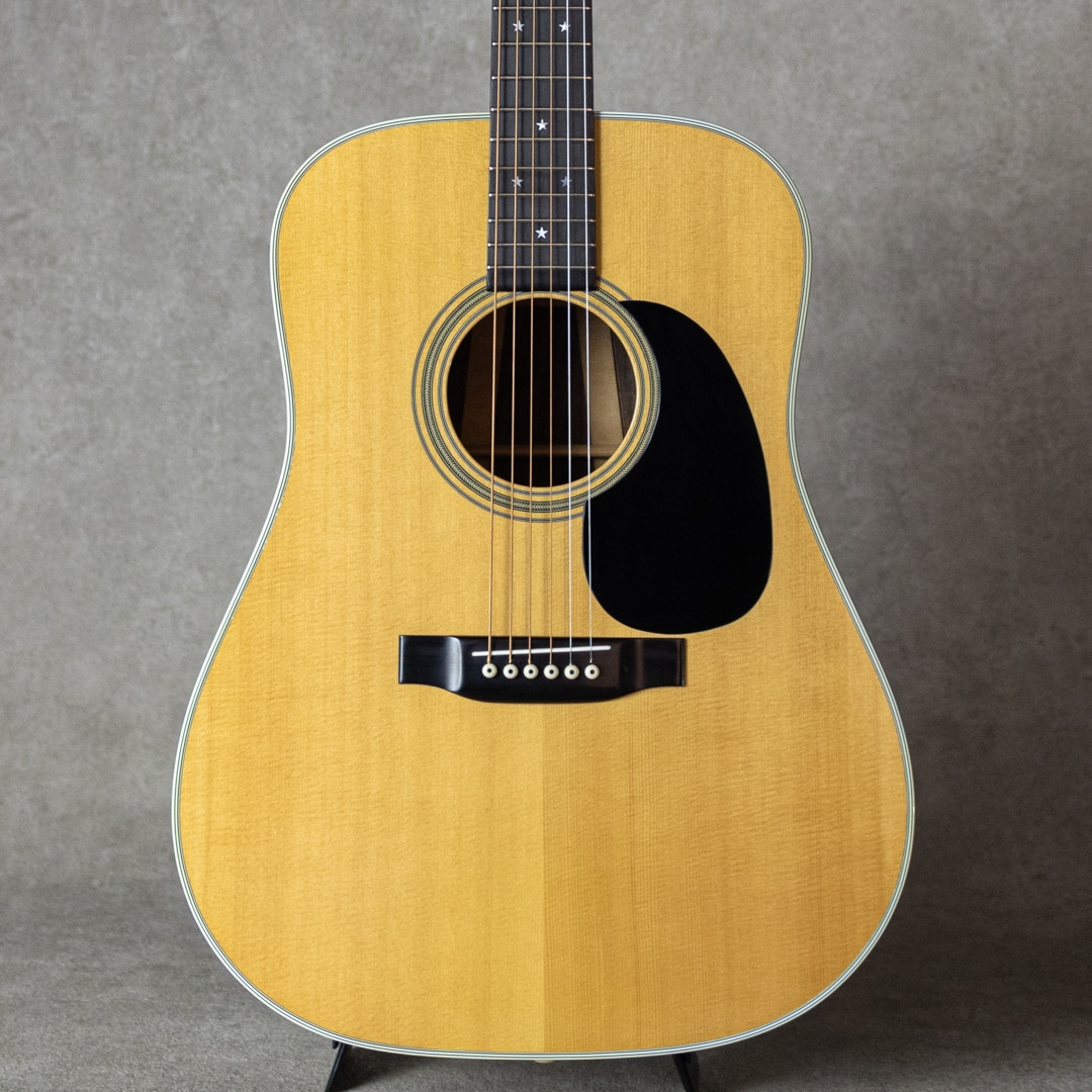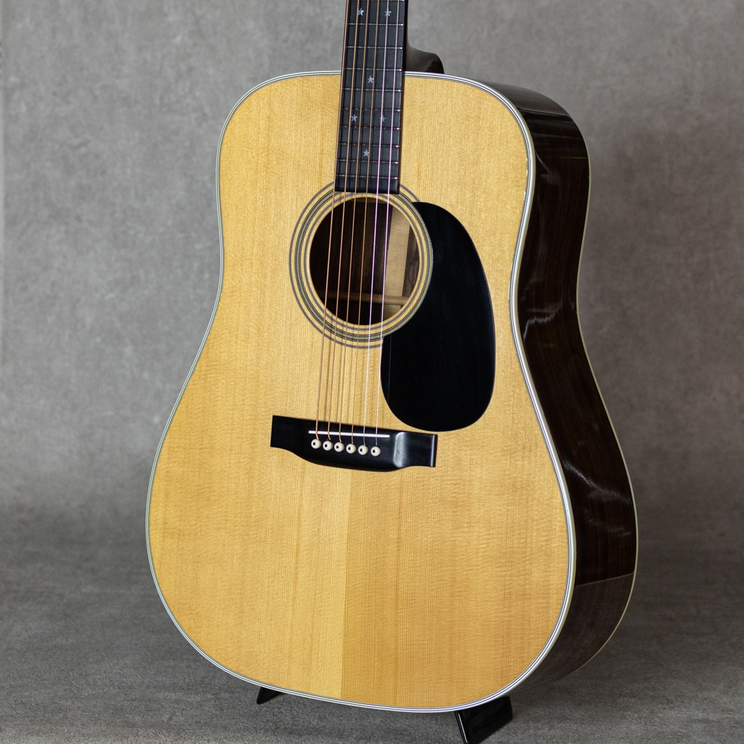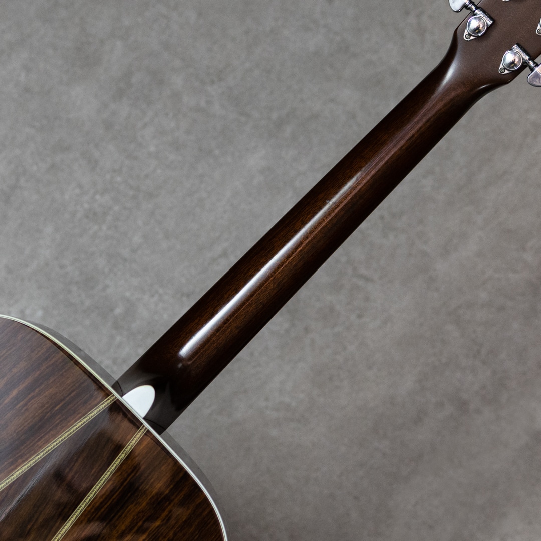 アメリカ建国200周年記念の1976年に1976本限定で生産された"D-76"。1776年の独立宣言から200年を記念して生産されたもっとも有名なリミテッドモデルのひとつで、ギターの”D-76”とバンジョーの”V-76”がリリースされました。”D-76”は200年に因んで1975年に200本、1976年には1776本の計1976本が2年間にわたって製造されました。当時のD-45と同グレードの材で製作されたモデルで、ミュージシャンの使用なども相まって人気の高いモデルです。本器は1976年製造分の1本。シトカスプルーストップ、インディアンローズウッドサイド&バック、マホガニーネック、エボニー指板&ブリッジ、ミルクボトルグローバーペグ、MOP指板スターインレイ、ヘリンボーンロゼッタ&バックストリップ、スクエアネックロッド、ラージローズウッドブリッジプレート、ノンスキャロップブレイシング。イーグルヘッドインレイや、指板には独立当時の13州を星に見立てて入れられていたり、ヘリンボーンの装飾など、拘りの詰まったデザイン。マーチン社のとっても歴史的意味合いの深いモデルです。また本器には、当時の購入者証明書やワランティ、当時付属していた1867年フィラデルフィア万博へのアメリカ建国100周年記念出展賞状のレプリカや当時のカタログなどの紙面資料などが揃ったクローゼットコンディションのマスターピースです。76は35ベースデザインで軽やかな響きですが、45と同等で倍音構成は45のそれと同じでサスティンの長いゴージャスな響きもはらんでいます。トップの色焼け・褪色なども少なく、金属パーツのくすみなどもなく、極上コンディション。流石に若干の小傷やマーチンクラックの補修とピックガード交換はされていますが、驚くほどのニアミントコンディションの1本です。また付属のブルーケースにも色焼けもほとんど見られず、底鋲や蝶番の金属パーツにサビも見られない、5つ鍵・ブルーインナーの年代マッチングケースです。この上ないコレクタブルな1本、このご機会お見逃しなく。。