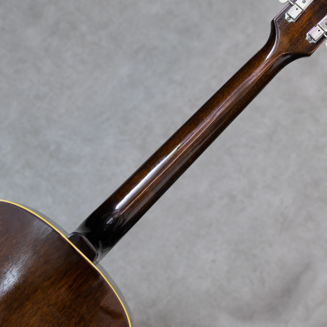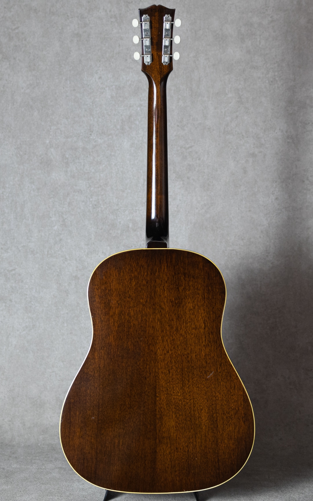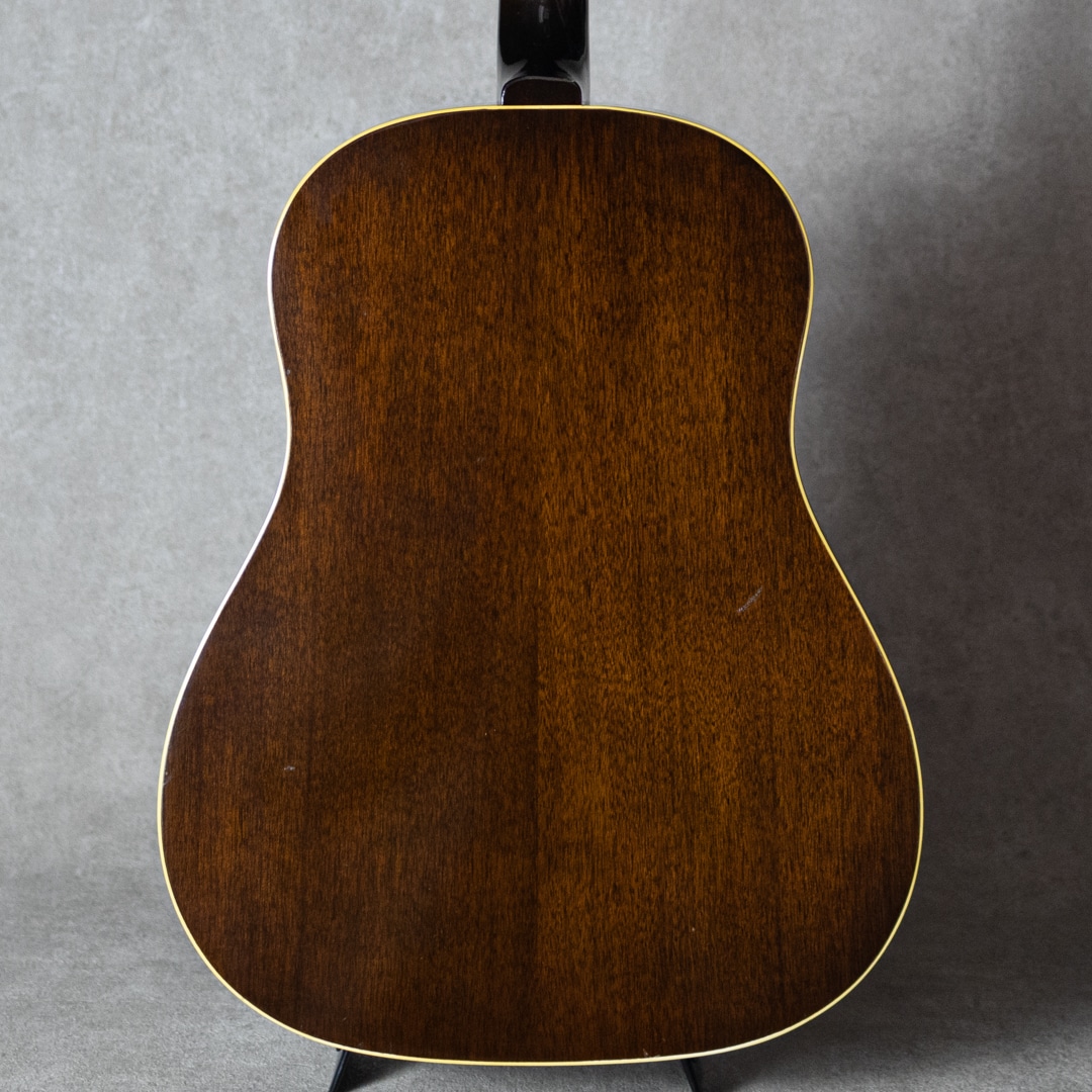 フラットトップにおけるもうひとつの憧れ、ワーキングホースGibson"J-45"。1942年に登場した"J-45"、その後幾つかのマイナーチェンジを繰り返しながらも、今尚トップシーンで欠かせないGibsonを代表するラウンドショルダーボディのジャンボモデル。アイコンとも言うべきダークカラーのサンバーストは、1961年にチェリーサンバーストへとマイナーチェンジされます。1967年に再びブラウンバーストが復活し、再びそのルックスは継承されることとなります。本器はそんな1967年製の1本。スプルーストップ、マホガニーサイド&バック、マホガニーネック、ダブルライン3連クルーソンデラックスペグ、ハカランダ指板、ハカランダブリッジ、ローズウッドアジャスタブルブリッジ、ポインテッドチックピックガード、ダブルリングロゼッタ、ナット幅約39.5mmネック、14度ヘッド角、ノンスキャロップド・Xブレイシング。この年代独特のダークで歯切れ良い反応の早いサウンド。ナロウピッチならではのE-to-eの早いコード感、憂い感のある響き、その他のアコギとは奏法すら異なるこの年代のラウンドショルダーは、音楽的にも唯一無二の存在です。また、ロゴマークなしのチックガードを備えたブラウンバーストはこの年の特徴で、このルックスを追い求めるファンも多いアイコニックな1本。若干の経年・使用に伴う小キズは見られますが大きくエグるようなものはなく、ノンクラックのグッドコンディション。経年でしか表現されない艶かしい色気ある美しい光沢がたまらない1本です。ネックコンディションもとてもよく、弾きやすいアクションで小気味良いサウンドを聞かせてくれます。グッドコンディションのナロウネック・ブラウンバースト”J-45”。お見逃しなく要チェックください。ハードケース付属