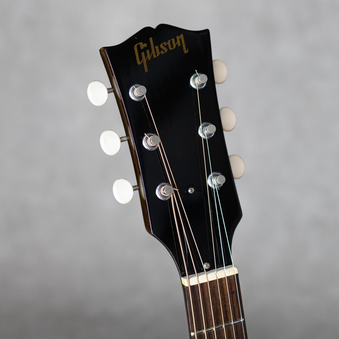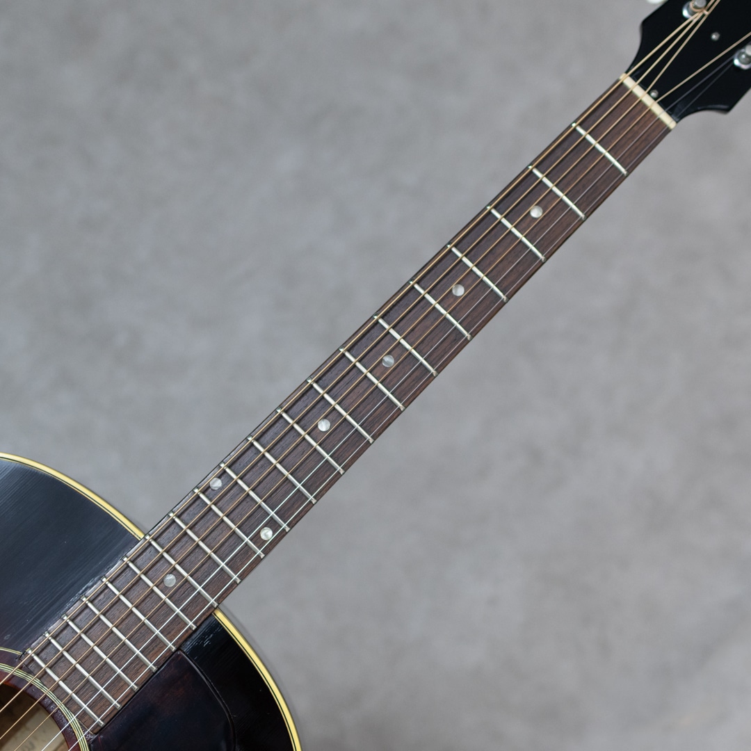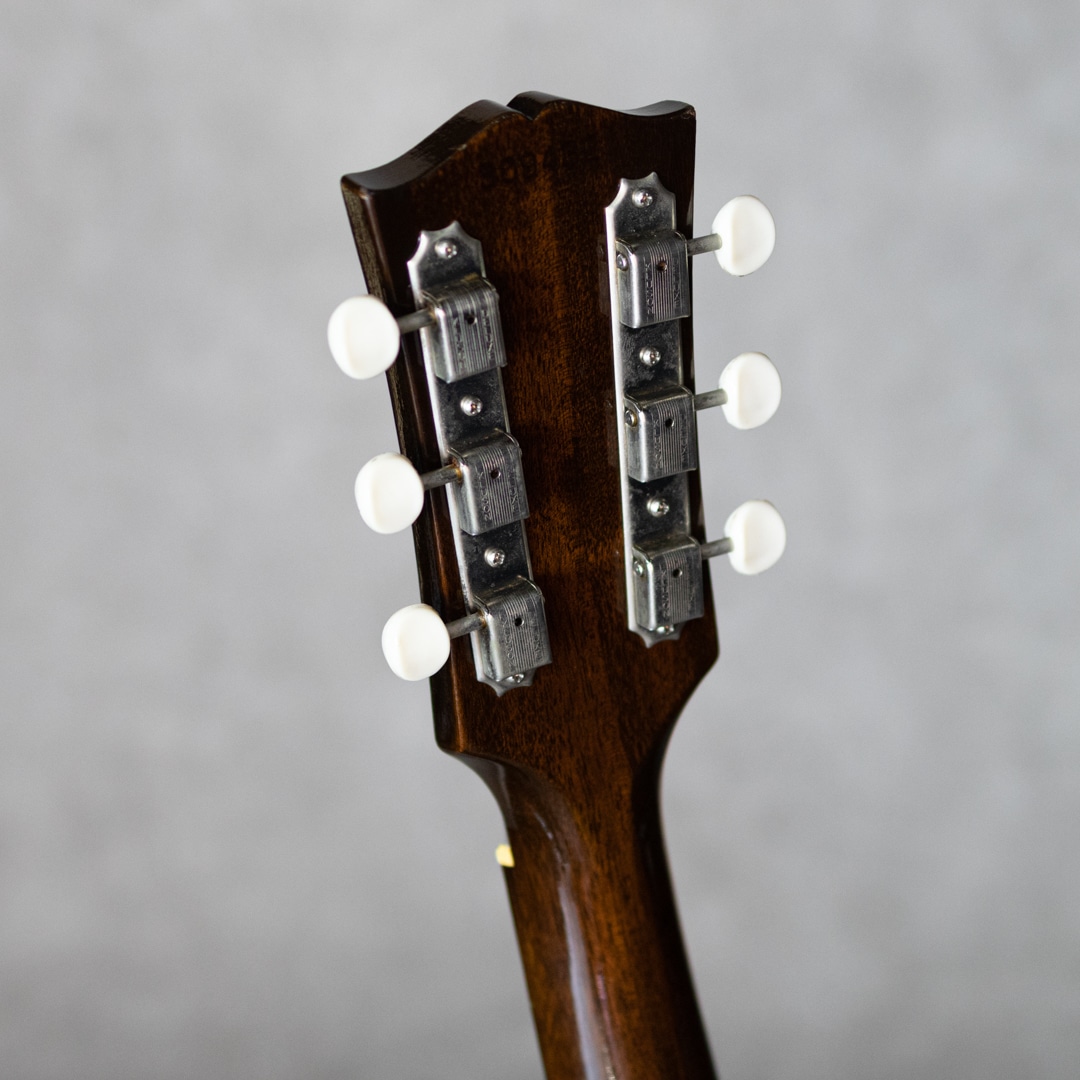フラットトップにおけるもうひとつの憧れ、ワーキングホースGibson"J-45"。1942年に登場した"J-45"、その後幾つかのマイナーチェンジを繰り返しながらも、今尚トップシーンで欠かせないGibsonを代表するラウンドショルダーボディのジャンボモデル。アイコンとも言うべきダークカラーのサンバーストは、1961年にチェリーサンバーストへとマイナーチェンジされます。1967年に再びブラウンバーストが復活し、再びそのルックスは継承されることとなります。本器はそんな1967年製の1本。スプルーストップ、マホガニーサイド&バック、マホガニーネック、ダブルライン3連クルーソンデラックスペグ、ハカランダ指板、ハカランダブリッジ、ローズウッドアジャスタブルブリッジ、ポインテッドチックピックガード、ダブルリングロゼッタ、ナット幅約39.5mmネック、14度ヘッド角、ノンスキャロップド・Xブレイシング。この年代独特のダークで歯切れ良い反応の早いサウンド。ナロウピッチならではのE-to-eの早いコード感、憂い感のある響き、その他のアコギとは奏法すら異なるこの年代のラウンドショルダーは、音楽的にも唯一無二の存在です。また、ロゴマークなしのチックガードを備えたブラウンバーストはこの年の特徴で、このルックスを追い求めるファンも多いアイコニックな1本。若干の経年・使用に伴う小キズは見られますが大きくエグるようなものはなく、ノンクラックのグッドコンディション。経年でしか表現されない艶かしい色気ある美しい光沢がたまらない1本です。ネックコンディションもとてもよく、弾きやすいアクションで小気味良いサウンドを聞かせてくれます。グッドコンディションのナロウネック・ブラウンバースト”J-45”。お見逃しなく要チェックください。ハードケース付属