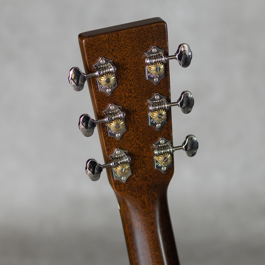世界に一つだけのカスタムモデル。マーティンカスタムショップ製ギターとはマーティンファクトリー内のほんの一郭にて少数精鋭の熟練職人により手掛けられる超一級ギターのこと。オーセンティックシリーズや、特注品、一点モノのギターなどの生産がそれに当たります。本器はシンカーマホガニー材を用いて製作されたカスタムショップ製モデル"CTM D-18"。シンカーマホガニーとは川や湖などの水中に沈んでいたマホガニー材のことで、バクテリアの有機物質分解により、シーズニングを経ることで非常に硬く軽量な材となり、音の伝達性、音響特性に優れた材とされています。シトカスプルーストップ、シンカーマホガニーサイド&バック、マホガニーネック、エボニー指板&ブリッジ、グローバーオープンバックペグ、フォワードシフトスキャロップドXブレーシング。ドレッドノートサイズボディでパワー、音量ともに充分。18らしいパンチとキレのあるサウンドで、スタンダードモデルよりもドライでレンジが広い印象です。ローズウッドバインディングやポリッシュドヘッドプレート、マザーオブパールによるスクリプトヘッドロゴなど、アレンジされたルックスも魅力。全体的に目立った外傷は見られず、美しい外観を保っております。ネックの状態含めプレイコンディションも大変良好。スタンダードモデルじゃ物足りないという方にオススメな1本。