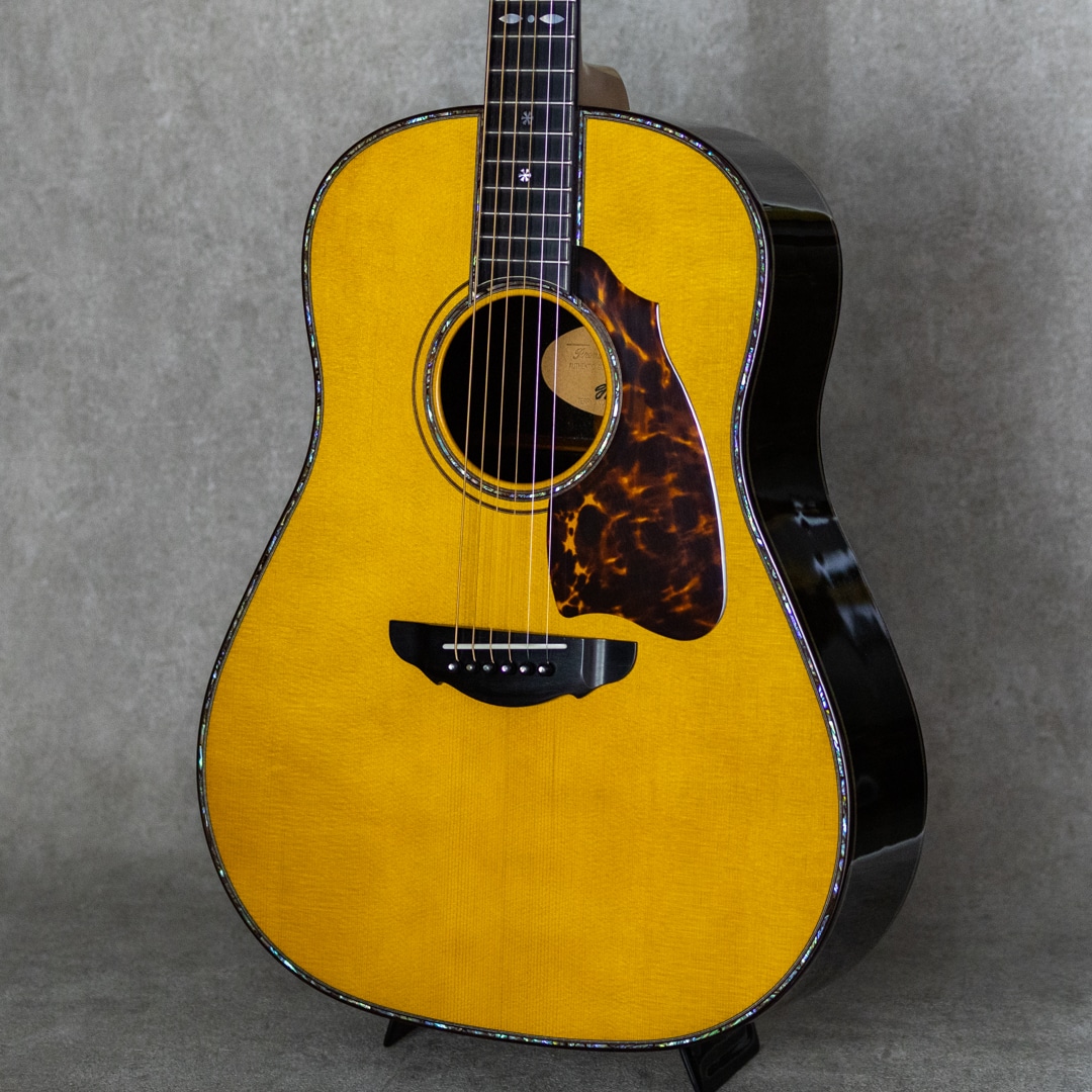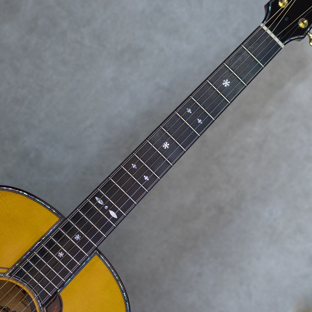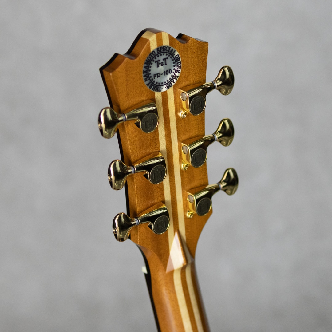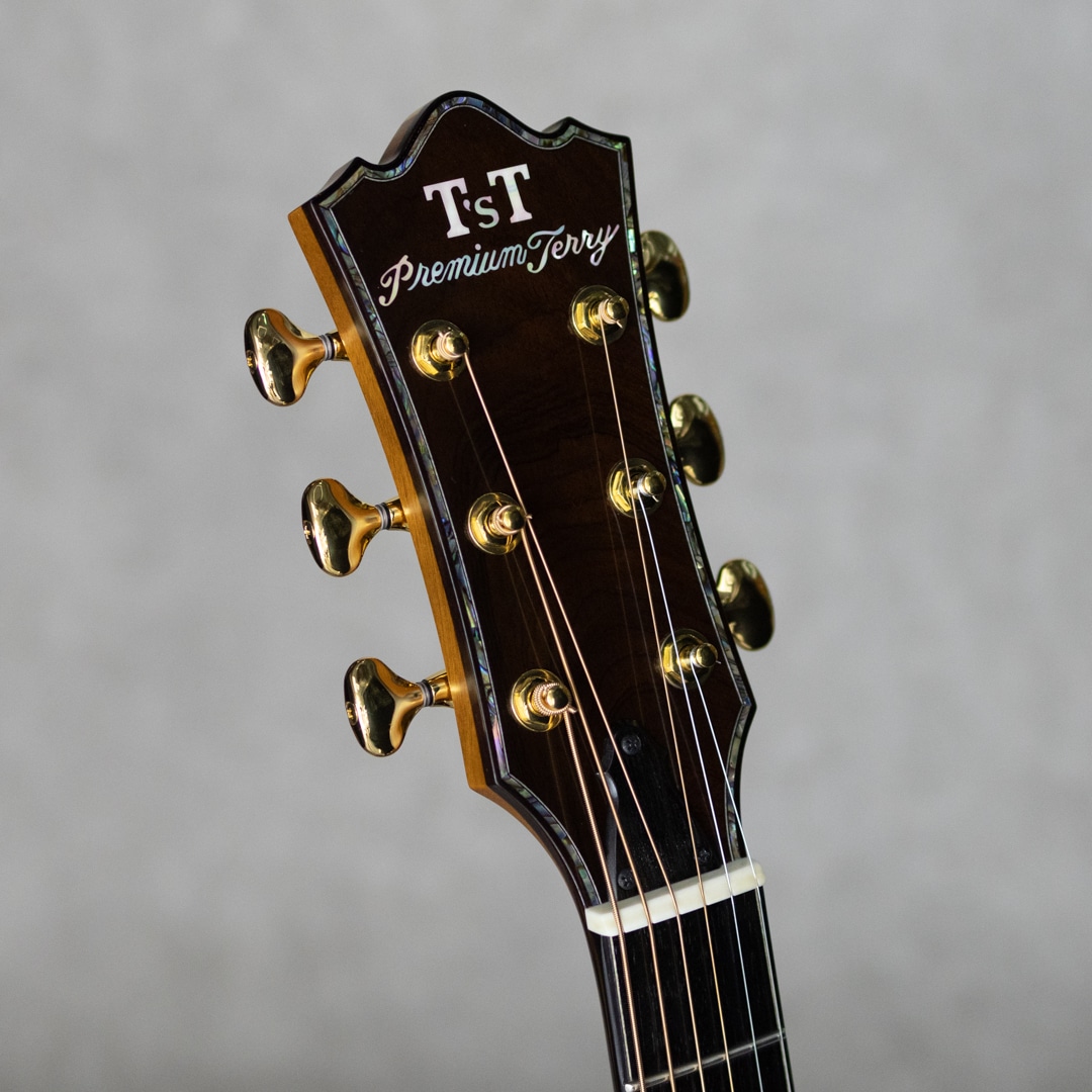 日本にカスタムギターを根付かせた最大の功労者といえるテリー中本が贈るT'sTのニューブランド"Premium Terry(プレミアム・テリー)"。テリーズ・テリーの廉価版という位置付けではなく、T'sTでは採用しなくなった過去のアイデアの掘り起こしや、より実験的なアイデアを実現させていくT'sTの別ラインです。本器は、テリーズテリーの代表モデルであるTJ-100オリジナルジャンボボディを基に、アコギファンの憧れでもあるジャーマン/ハカランダのスペックを備えた”PTJ-100 German/Jacaranda”。2021年製極上USED品。柾目痕ゆらめく美しい極上ジャーマンスプルーストップ、極上の毛柾目杢の美事な極上ハカランダサイド&バック。ホンジュラスマホガニー&メイプル積層ネック、エボニー指板&ブリッジ、オリジナルゴトー510ペグ、スノーフレークス&キャッツアイ指板インレイ、本べっ甲ピックガード、アバロンロゼッタ&トリム、ローズウッドバインディング、ボディ内塗装、スキャロップド・エックスブレイシング。ボリューム感たっぷりの本家直系の伝統的なジャパニーズ・アコギサウンドの1本。サスティンに富み、倍音溢れるサウンド。重厚な箱鳴りに、キラリと響く美しい高音。T'sTブランド直系ならではの極上サウンドは、往年のフォークはもちろん、現在の音楽シーンにも適合する伝統的なジャパニーズ・アコースティックギター・サウンドを持ち合わせます。TJボディシェイプは、ロウワバウトに比べアッパーバウトが少し小ぶりなデザインで、他では見られない美しいフォルムも本器の魅力のひとつ。テリーズ・テリーの技術が投入されていながらコストパフォーマンスにも優れており、しかしながら設計や最終検品はすべて中本氏が指揮を執り、採用する木材も高級で一切妥協の無いモデルです。トップに爪先が当たったような極僅かな小傷と3ペグ筐体部に少しの打痕が見られますが、それ以外はとてもキレイで美しいグッドコンディションを保った本器。ネック周りも良好で、弾きやすいアクションをしっかりと保っています。豊かなボリューム感はもとより、果てしなくクリアな音像を持つトップクラスの日本製ギター"Premium Terry”。しっかりとがんがん弾いていただきたい1本。是非お手元でお楽しみください。オリジナルハードケース付属