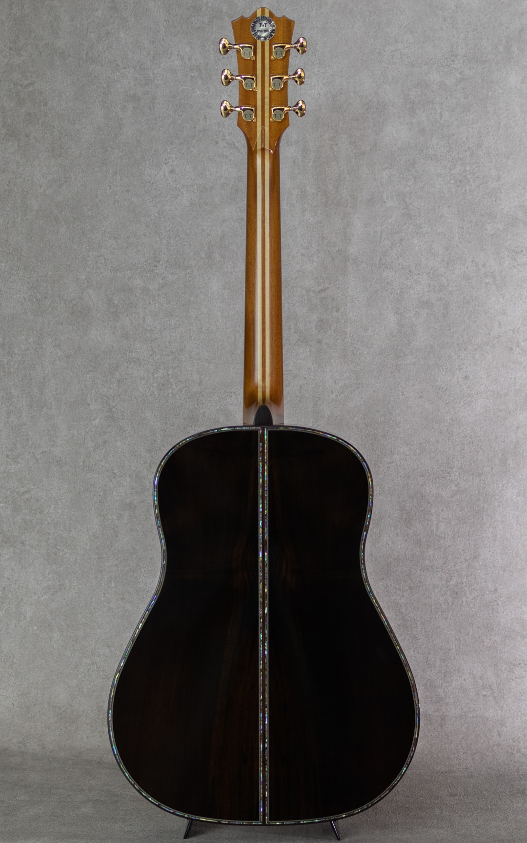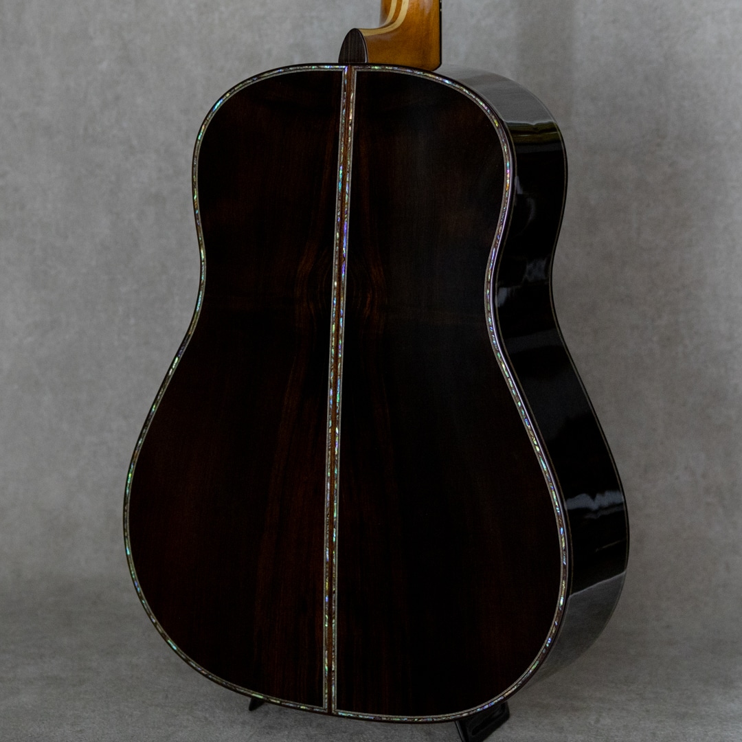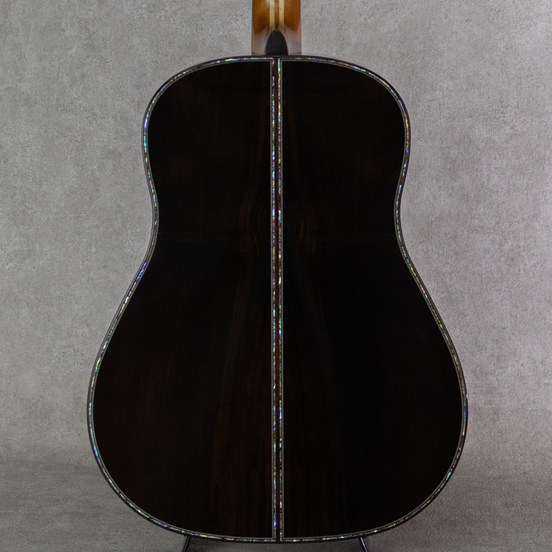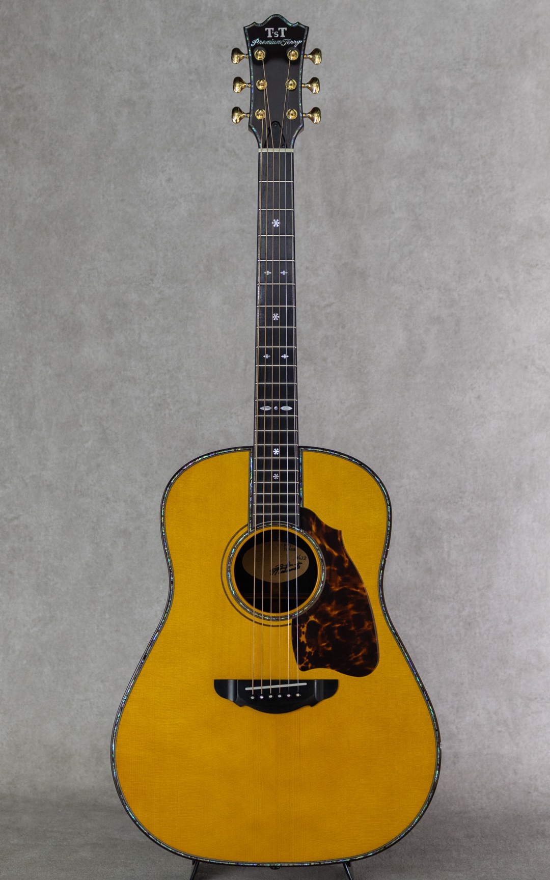 日本にカスタムギターを根付かせた最大の功労者といえるテリー中本が贈るT'sTのニューブランド"Premium Terry(プレミアム・テリー)"。テリーズ・テリーの廉価版という位置付けではなく、T'sTでは採用しなくなった過去のアイデアの掘り起こしや、より実験的なアイデアを実現させていくT'sTの別ラインです。本器は、テリーズテリーの代表モデルであるTJ-100オリジナルジャンボボディを基に、アコギファンの憧れでもあるジャーマン/ハカランダのスペックを備えた”PTJ-100 German/Jacaranda”。2021年製極上USED品。柾目痕ゆらめく美しい極上ジャーマンスプルーストップ、極上の毛柾目杢の美事な極上ハカランダサイド&バック。ホンジュラスマホガニー&メイプル積層ネック、エボニー指板&ブリッジ、オリジナルゴトー510ペグ、スノーフレークス&キャッツアイ指板インレイ、本べっ甲ピックガード、アバロンロゼッタ&トリム、ローズウッドバインディング、ボディ内塗装、スキャロップド・エックスブレイシング。ボリューム感たっぷりの本家直系の伝統的なジャパニーズ・アコギサウンドの1本。サスティンに富み、倍音溢れるサウンド。重厚な箱鳴りに、キラリと響く美しい高音。T'sTブランド直系ならではの極上サウンドは、往年のフォークはもちろん、現在の音楽シーンにも適合する伝統的なジャパニーズ・アコースティックギター・サウンドを持ち合わせます。TJボディシェイプは、ロウワバウトに比べアッパーバウトが少し小ぶりなデザインで、他では見られない美しいフォルムも本器の魅力のひとつ。テリーズ・テリーの技術が投入されていながらコストパフォーマンスにも優れており、しかしながら設計や最終検品はすべて中本氏が指揮を執り、採用する木材も高級で一切妥協の無いモデルです。トップに爪先が当たったような極僅かな小傷と3ペグ筐体部に少しの打痕が見られますが、それ以外はとてもキレイで美しいグッドコンディションを保った本器。ネック周りも良好で、弾きやすいアクションをしっかりと保っています。豊かなボリューム感はもとより、果てしなくクリアな音像を持つトップクラスの日本製ギター"Premium Terry”。しっかりとがんがん弾いていただきたい1本。是非お手元でお楽しみください。オリジナルハードケース付属