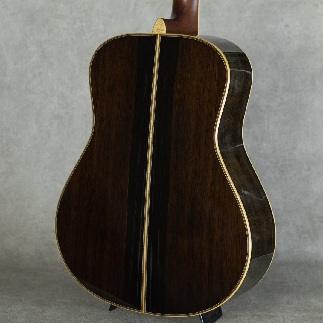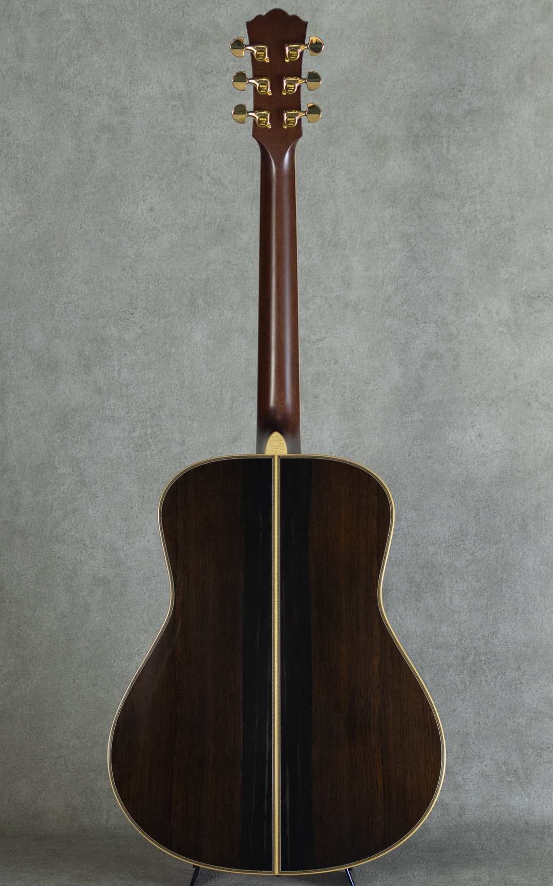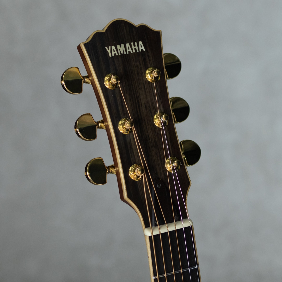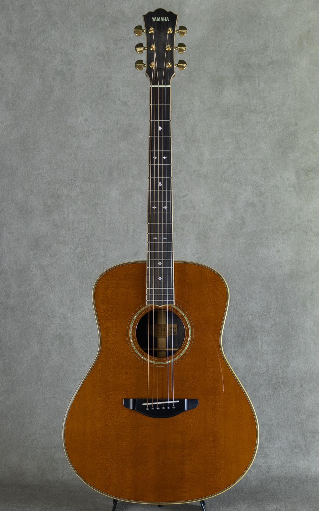 ヤマハを代表するギターとして、数多くの一流アーティストをはじめ、多くのギターファンに愛されてきたLシリーズ。“FG”シリーズの上位機種として1974年にL-31を発表して以来、時代のミュージックシーンを彩り、数多くのアーティ ストやギターファンに愛され、日本の音楽シーンを支えて参りました。"L=Luxury(豪華)"を冠にした本シリーズは、伝統を継承しながらも現代のニーズを反映させ、細部にわたり改良を施されたシリーズです。そのLシリーズにおいて各項目を好みに選び作り上げる、オンリーワンの1本をオーダーできる"スペシャルオーダーメイドシステム”。惜しまれながらも2014年にオーダーストップとなり、今なお復活を望む数多くのファンがいる大人気のオーダーシステムです。本器はヤマハが産み出した秀逸作LAシェイプの”LA-58X”。黒々とした本柾目のハカランダ2ピースバックを使用した1本。1998年製USED品。フィギュアドのようにびっしりと浮き出た柾目痕が美しいスプルーストップ、黒々とした全面柾目取りの極上ハカランダサイド&バック、マホガニーネック、エボニー指板&ブリッジ、白蝶貝スノウフレイクス指板インレイ、ボディトップ&バックウッドパーフリング、アバロンロゼッタ、メイプルバインディング、TM-67Gゴールドペグ。ひとまわり小振りな独自のボディーシェイプといまだ人気の高いLAヘッドシェイプが印象的な"LA”は、テリー中本氏デザインの秀逸作。石川鷹彦氏、井上陽水氏の使用でも有名で、多くにミュージシャンが愛用したモデル。これまでのカスタムモデルとは異なるエゾ松ではなく米唐檜(スプルース)と3ピースバックを採用した”LA”は、ウエストコーストサウンドを思わせるタイトで抜けの良いサウンドは、それまでのヤマハサウンドとも一線を画すサウンドで多くプレイヤーを魅了してきました。本器では贅沢にも柾目ハカランダを2ピースで配した極上の1本。野太くゴツンと前に出るサウンドは、他メーカーでは得られない唯一無二のサウンドです。この年代のヤマハモデルは塗装面の白濁は否めないですが、ネック塗装とクリアピックガードはヤマハを熟知するベテラン職人によりキレイに修正されています。打痕や割れなどもなく、キレイに保たれた本器。ネックコンディションもとても良く、弾きやすいアクションがサドルマージンをしっかり残した持たれています。現在はオーダーできない”LA”モデル。極上ハカランダを使用した1本、グッドコンディションのコレクタブルアイテムです。お見逃しなく。。オリジナルハードケース付属