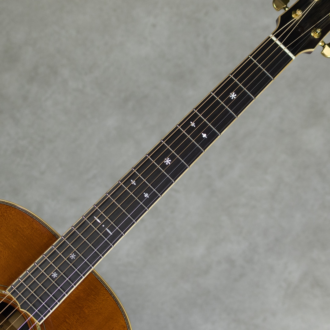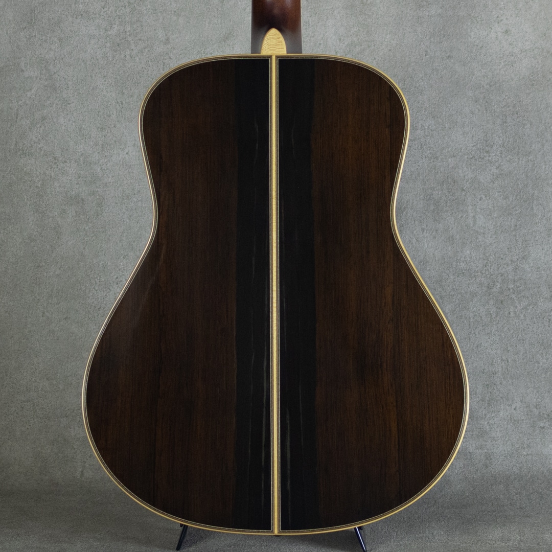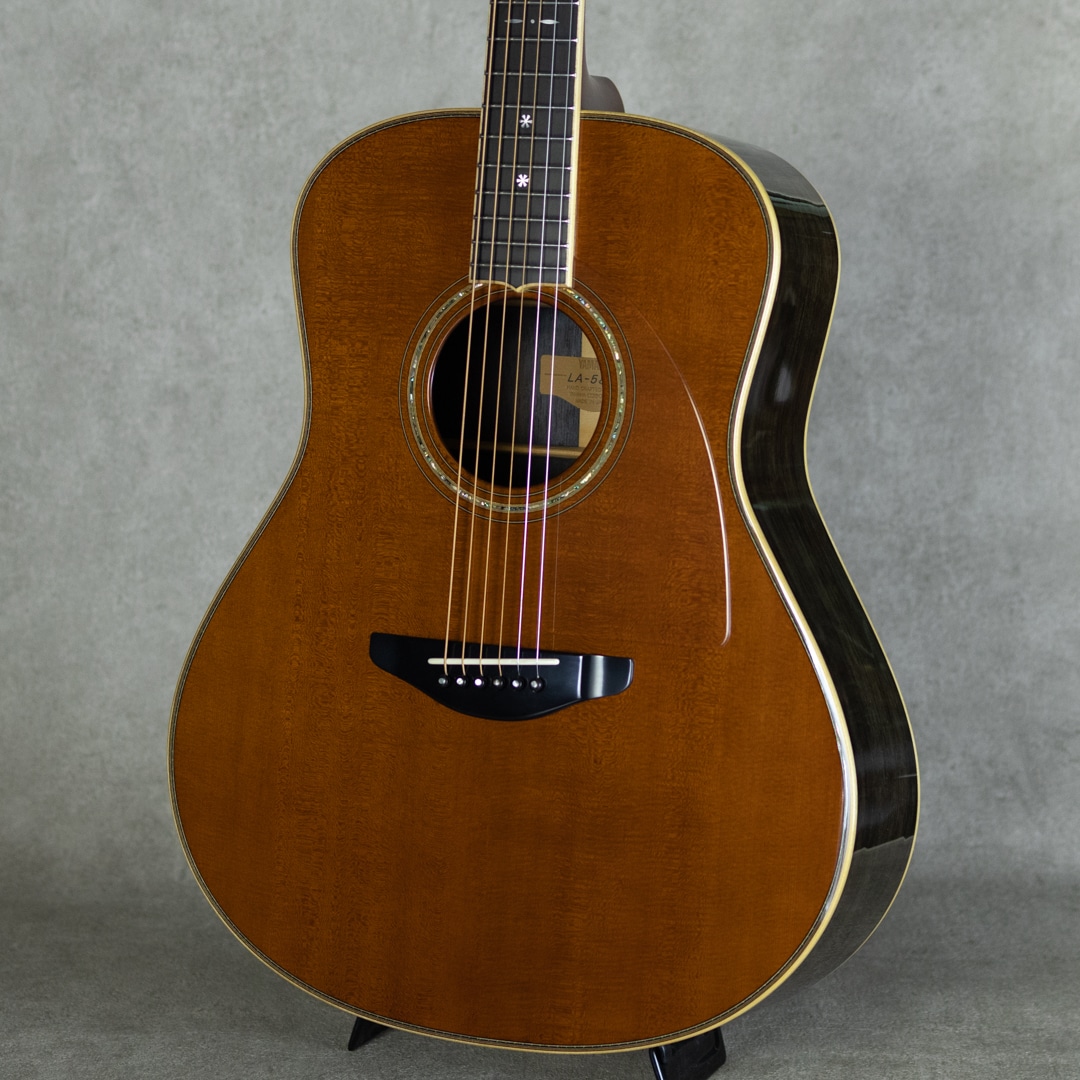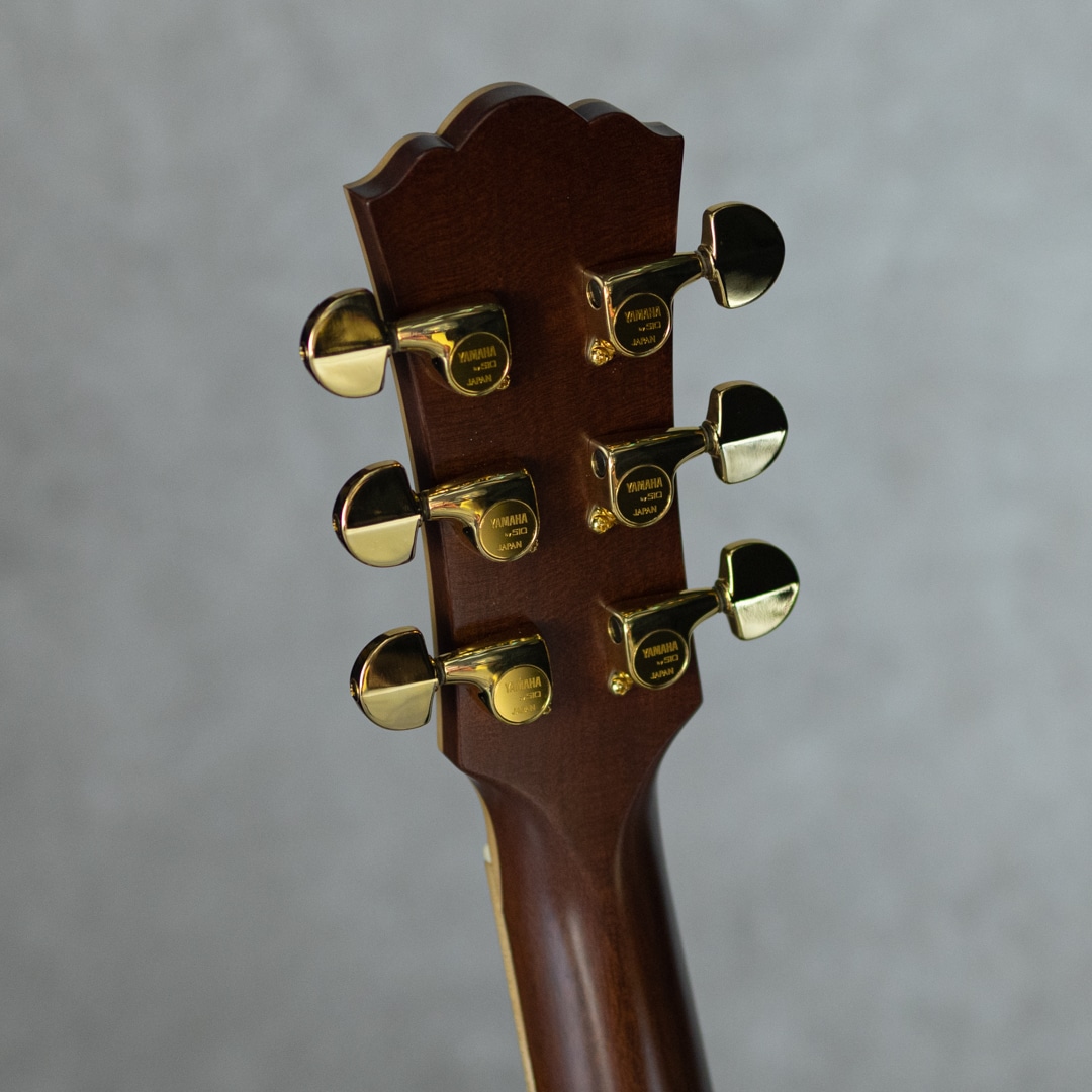 ヤマハを代表するギターとして、数多くの一流アーティストをはじめ、多くのギターファンに愛されてきたLシリーズ。“FG”シリーズの上位機種として1974年にL-31を発表して以来、時代のミュージックシーンを彩り、数多くのアーティ ストやギターファンに愛され、日本の音楽シーンを支えて参りました。"L=Luxury(豪華)"を冠にした本シリーズは、伝統を継承しながらも現代のニーズを反映させ、細部にわたり改良を施されたシリーズです。そのLシリーズにおいて各項目を好みに選び作り上げる、オンリーワンの1本をオーダーできる"スペシャルオーダーメイドシステム”。惜しまれながらも2014年にオーダーストップとなり、今なお復活を望む数多くのファンがいる大人気のオーダーシステムです。本器はヤマハが産み出した秀逸作LAシェイプの”LA-58X”。黒々とした本柾目のハカランダ2ピースバックを使用した1本。1998年製USED品。フィギュアドのようにびっしりと浮き出た柾目痕が美しいスプルーストップ、黒々とした全面柾目取りの極上ハカランダサイド&バック、マホガニーネック、エボニー指板&ブリッジ、白蝶貝スノウフレイクス指板インレイ、ボディトップ&バックウッドパーフリング、アバロンロゼッタ、メイプルバインディング、TM-67Gゴールドペグ。ひとまわり小振りな独自のボディーシェイプといまだ人気の高いLAヘッドシェイプが印象的な"LA”は、テリー中本氏デザインの秀逸作。石川鷹彦氏、井上陽水氏の使用でも有名で、多くにミュージシャンが愛用したモデル。これまでのカスタムモデルとは異なるエゾ松ではなく米唐檜(スプルース)と3ピースバックを採用した”LA”は、ウエストコーストサウンドを思わせるタイトで抜けの良いサウンドは、それまでのヤマハサウンドとも一線を画すサウンドで多くプレイヤーを魅了してきました。本器では贅沢にも柾目ハカランダを2ピースで配した極上の1本。野太くゴツンと前に出るサウンドは、他メーカーでは得られない唯一無二のサウンドです。この年代のヤマハモデルは塗装面の白濁は否めないですが、ネック塗装とクリアピックガードはヤマハを熟知するベテラン職人によりキレイに修正されています。打痕や割れなどもなく、キレイに保たれた本器。ネックコンディションもとても良く、弾きやすいアクションがサドルマージンをしっかり残した持たれています。現在はオーダーできない”LA”モデル。極上ハカランダを使用した1本、グッドコンディションのコレクタブルアイテムです。お見逃しなく。。オリジナルハードケース付属