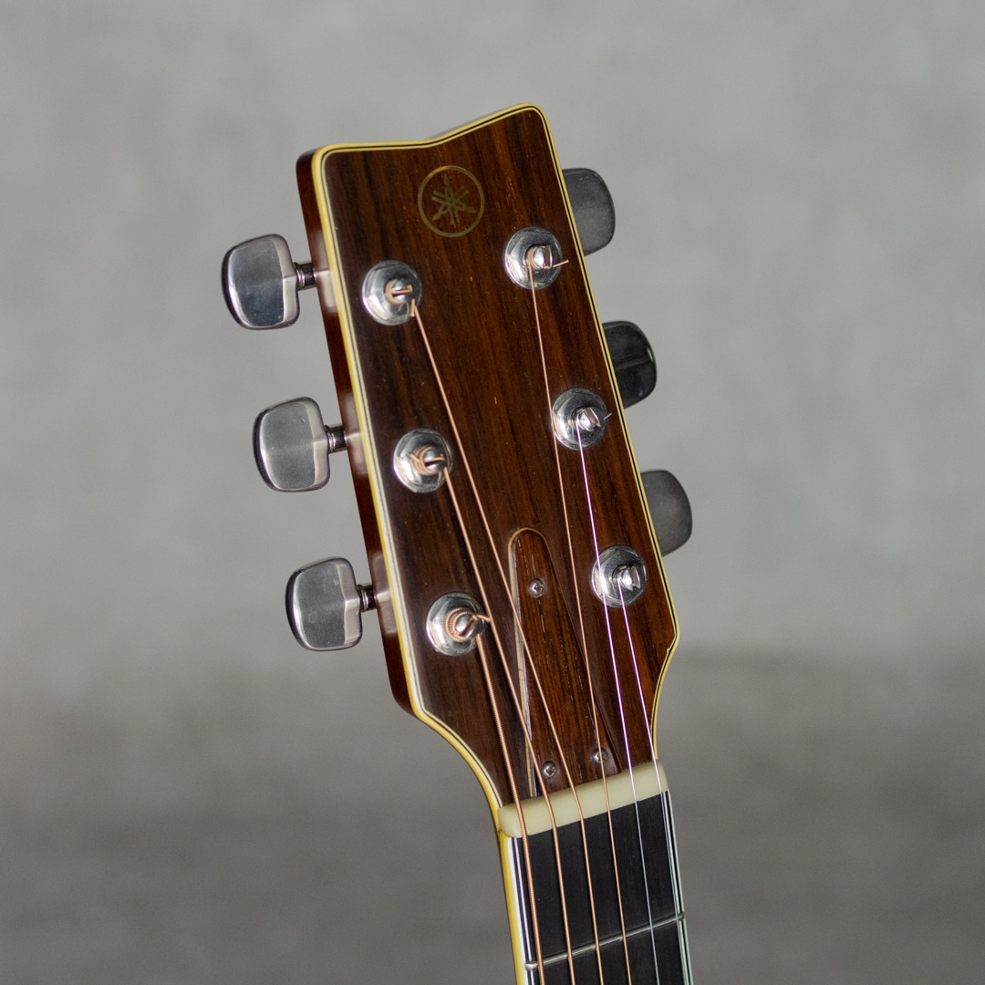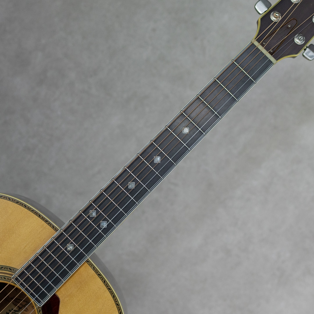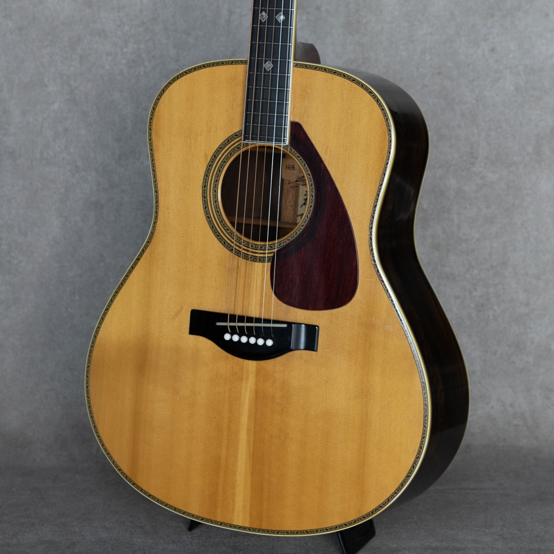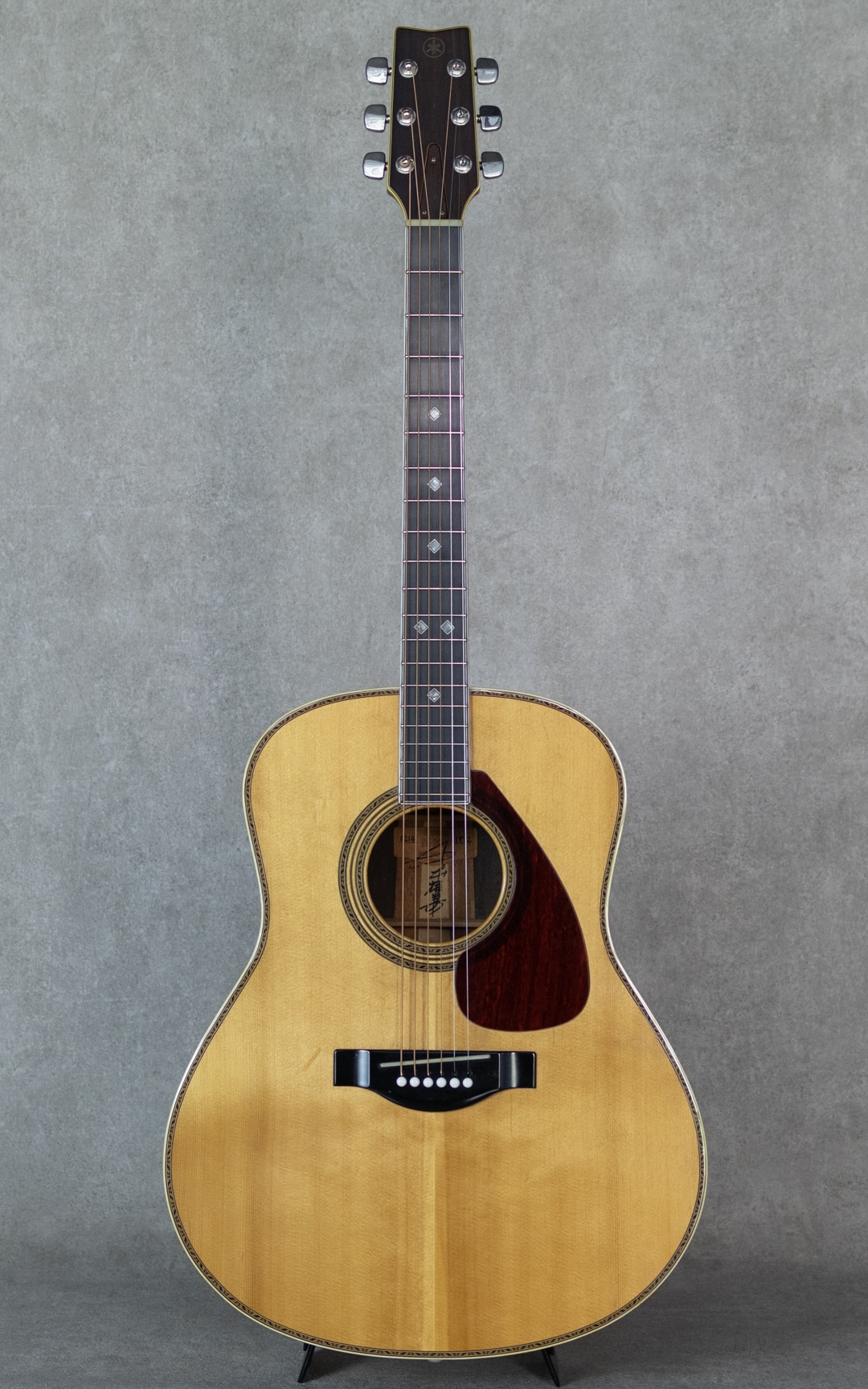 ヤマハフォークギターの”赤ラベル"が終わりを迎え1971年に登場した新しいFGシリーズ。その中で、当時のヤマハが持てる最高級の材料・パーツ・手工技術の全てを惜しげも無く投入し開発されたのが、高級手工ギター / ヤマハジャンボモデルの"FG-2000”です。当時のライン製品とは一線を画す品質で、その後のヤマハ高級モデルへの足掛かりとなったヤマハ史における重要なモデル。本器は1972年製USED品。トップに最高級エゾ松、サイド/バックは美しい毛柾目杢の最高級ハカランダを採用。バックはセンターに美しいトラ杢のメイプルを配したスリーピースになっています。ホンジュラスマホガニーネック、黒檀指板&ブリッジ、最高級ダイカストFTM-210ペグ、ハカランダ化粧板、音叉ヘッドマーク、ダイアモンド指板インレイ、寄木細工のロゼッタ&ボディトリム、べっ甲柄ピックガード、トップグロスフィニッシュ、サイド&バックセミグロスフィニッシュ、テリー中本サインの革ラベル、トップ構造は特徴的な細身で背丈の低いXブレイシングです。ジャンボボディから吐き出される迫力のボリューム、豊かな低音、硬質で透明度の高い高音が魅力。ストロークで力強く、アルペジオで繊細に鳴るギターです。トップのみ塗装の吹き直しが確認できますが、少し古い時期の作業だと思われます。その他に経年による弾き傷・小傷は見られますが全体にキレイな印象で、割れなどは見られずグッドコンディションです。ネック周りも良好で弾きやすいアクションをしっかりと保っています。高度成長期の真っ只中に産み出された最高級モデル、細かな所まで凝った作りとなった人気の高いモデルのひとつ。お手元でその完成度の高さをご体感ください。オリジナルハードケース付属