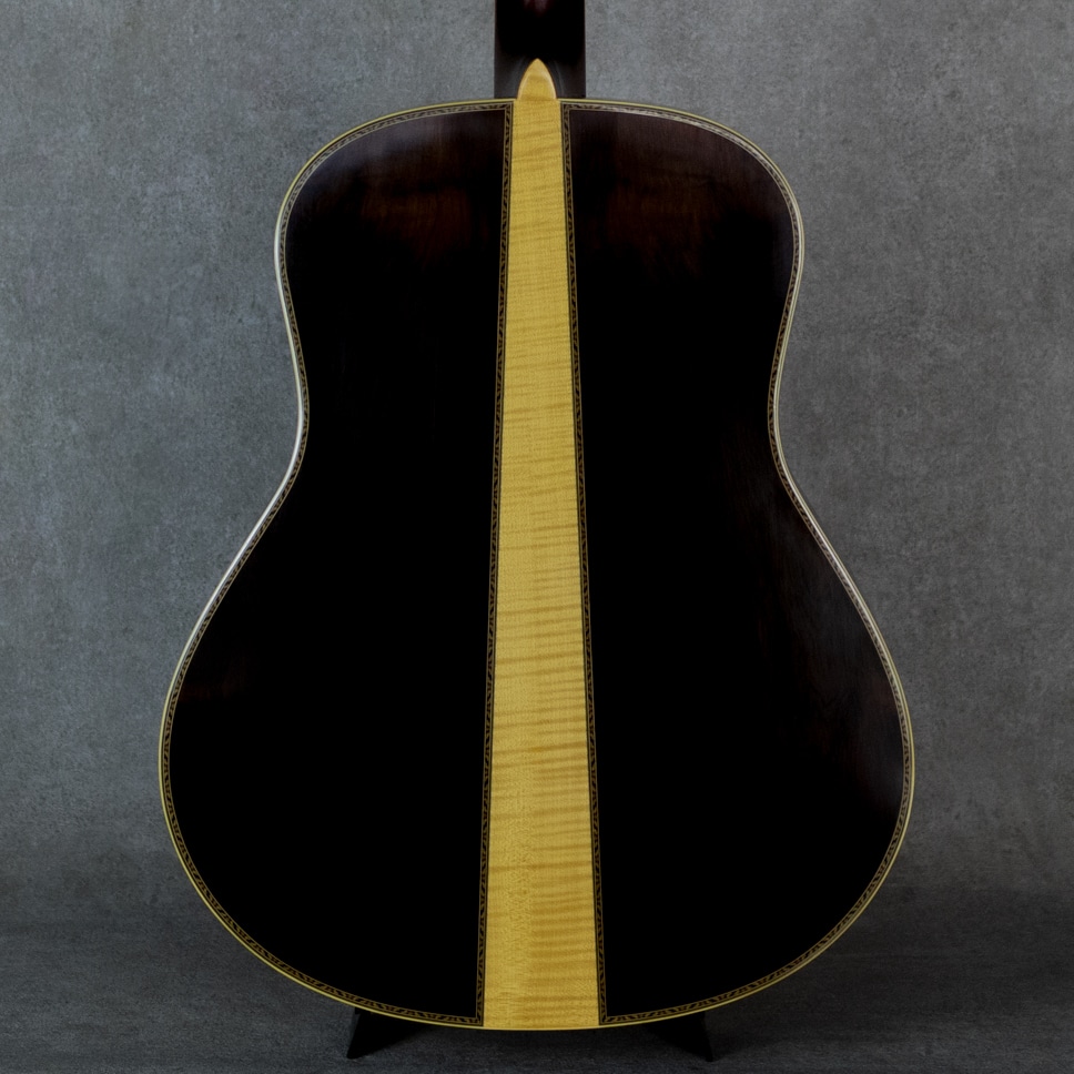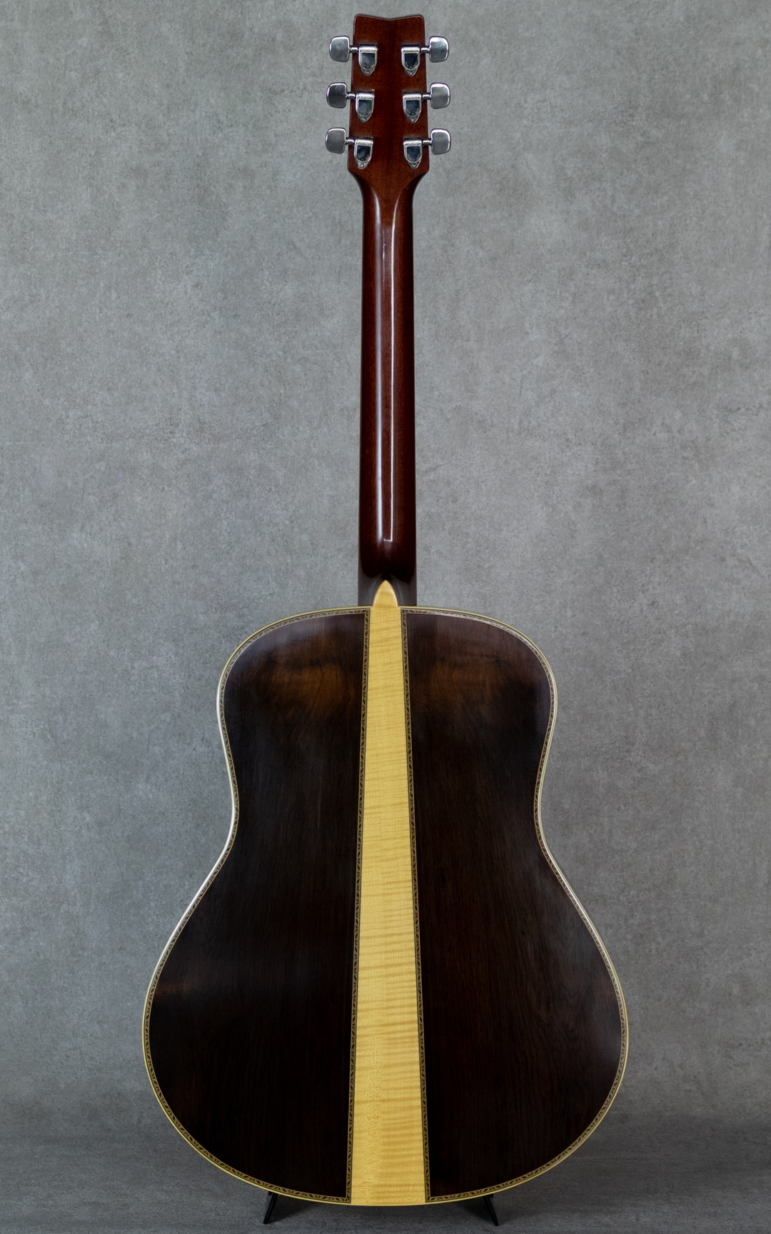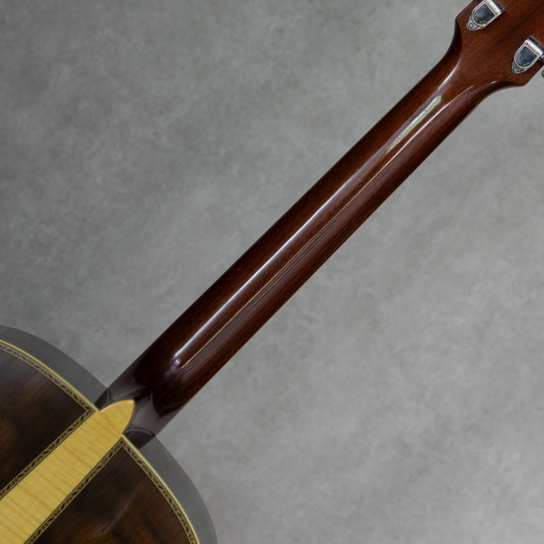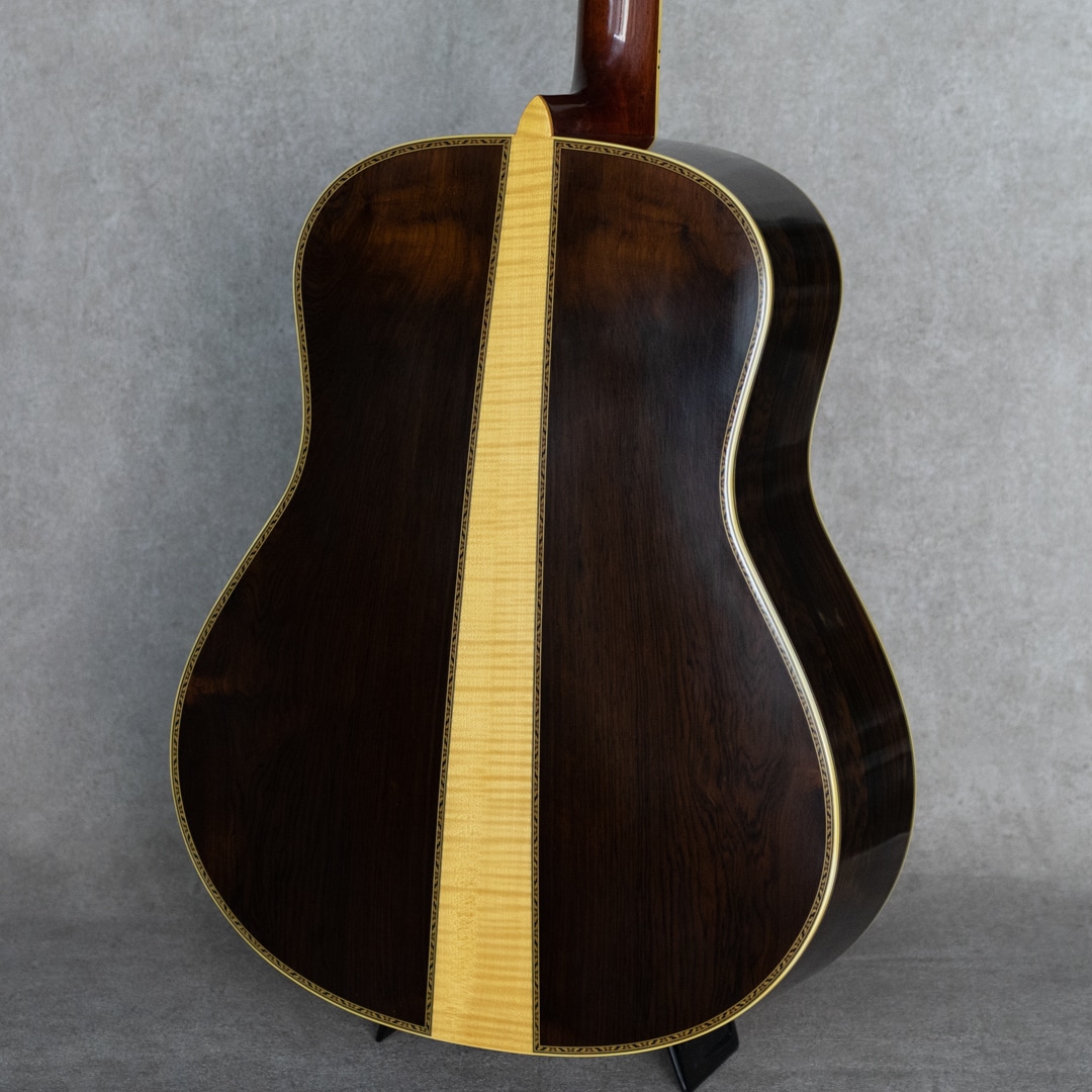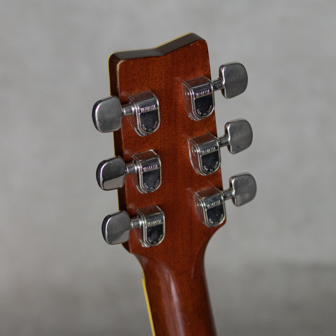 ヤマハフォークギターの”赤ラベル"が終わりを迎え1971年に登場した新しいFGシリーズ。その中で、当時のヤマハが持てる最高級の材料・パーツ・手工技術の全てを惜しげも無く投入し開発されたのが、高級手工ギター / ヤマハジャンボモデルの"FG-2000”です。当時のライン製品とは一線を画す品質で、その後のヤマハ高級モデルへの足掛かりとなったヤマハ史における重要なモデル。本器は1972年製USED品。トップに最高級エゾ松、サイド/バックは美しい毛柾目杢の最高級ハカランダを採用。バックはセンターに美しいトラ杢のメイプルを配したスリーピースになっています。ホンジュラスマホガニーネック、黒檀指板&ブリッジ、最高級ダイカストFTM-210ペグ、ハカランダ化粧板、音叉ヘッドマーク、ダイアモンド指板インレイ、寄木細工のロゼッタ&ボディトリム、べっ甲柄ピックガード、トップグロスフィニッシュ、サイド&バックセミグロスフィニッシュ、テリー中本サインの革ラベル、トップ構造は特徴的な細身で背丈の低いXブレイシングです。ジャンボボディから吐き出される迫力のボリューム、豊かな低音、硬質で透明度の高い高音が魅力。ストロークで力強く、アルペジオで繊細に鳴るギターです。トップのみ塗装の吹き直しが確認できますが、少し古い時期の作業だと思われます。その他に経年による弾き傷・小傷は見られますが全体にキレイな印象で、割れなどは見られずグッドコンディションです。ネック周りも良好で弾きやすいアクションをしっかりと保っています。高度成長期の真っ只中に産み出された最高級モデル、細かな所まで凝った作りとなった人気の高いモデルのひとつ。お手元でその完成度の高さをご体感ください。オリジナルハードケース付属