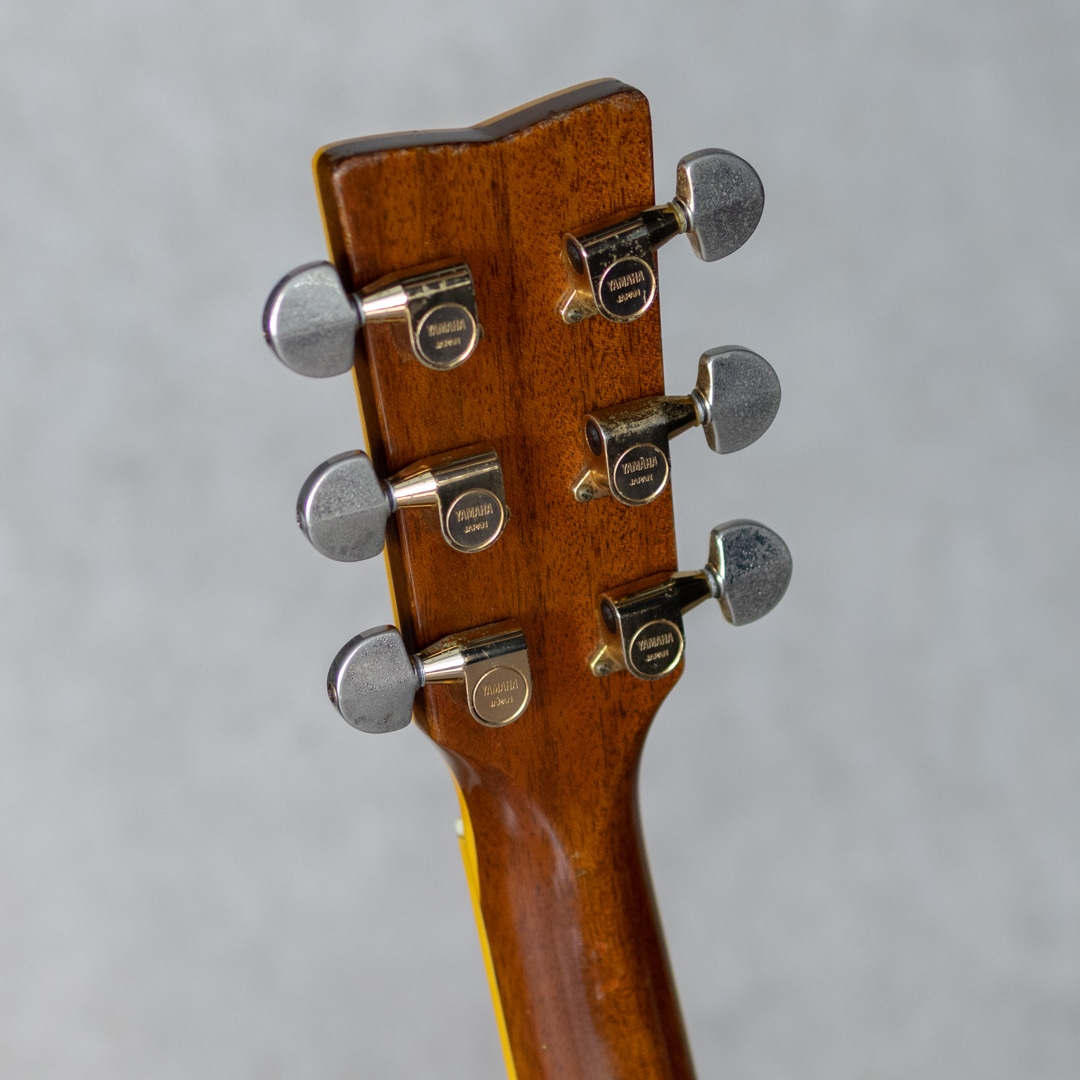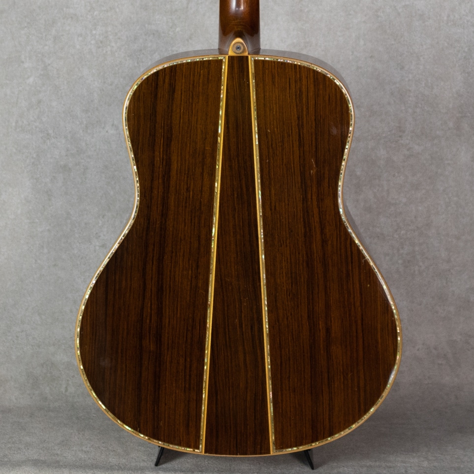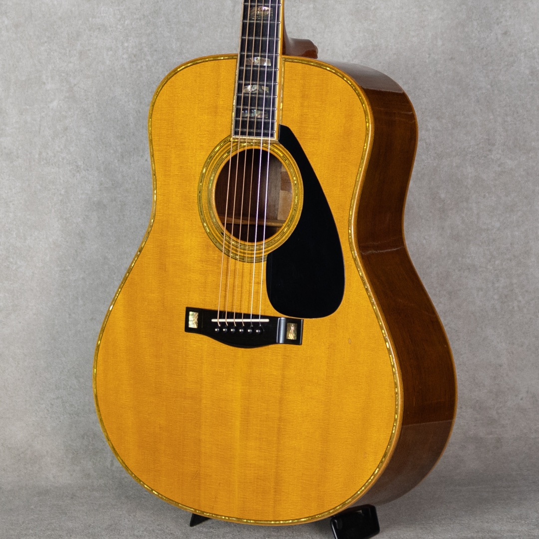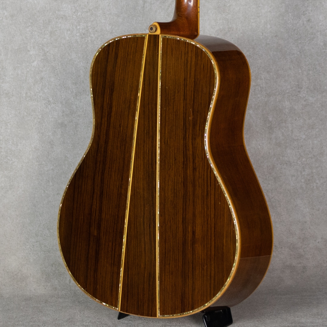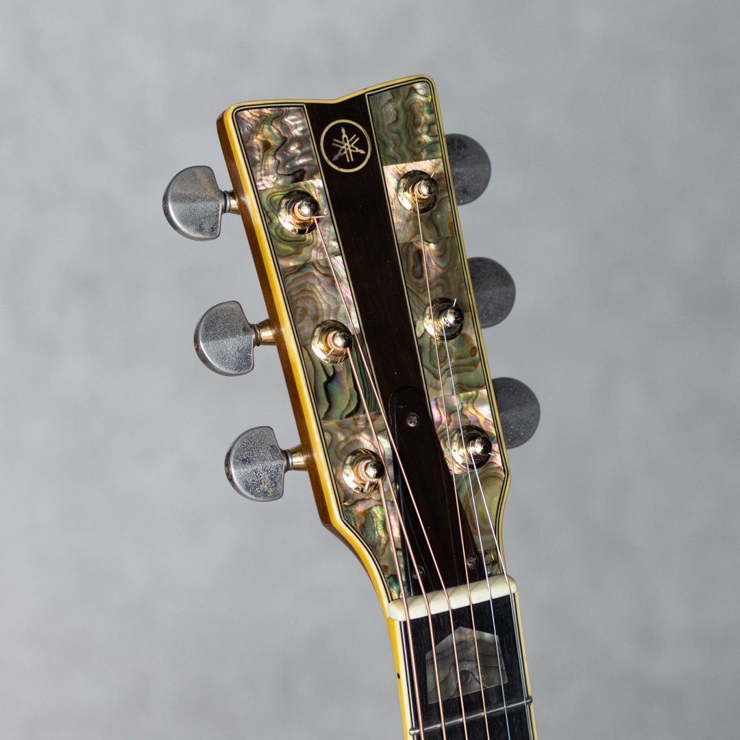 ヤマハを代表するギターとして、数多くの一流アーティストをはじめ、多くのギターファンに愛されてきたLシリーズ。“FG”シリーズの上位機種として1974年にL-31を発表して以来、時代のミュージックシーンを彩り、数多くのアーティ ストやギターファンに愛され、日本の音楽シーンを支えて参りました。"L=Luxury(豪華)"を冠にした本シリーズは、伝統を継承しながらも現代のニーズを反映させ、細部にわたり改良を施されたシリーズです。本器は、1985年よりラインナップされたハカランダモデル"LL-53D Custom Jacaranda”。1985年にラインナップ刷新で設計変更され、新しいサウンドメイクを加えられた四天からの系譜を受け継ぐテリー中本サインのヤマハジャンボモデル。1985年製USED品。よく日焼けして貫禄を魅せる最高級エゾ松トップ、しっかりと柾目で配された最高級ハカランダサイド&バック。バックは3ピース構造です。マホガニーネック、エボニー指板&ブリッジ、アバロンヘッドインレイ、アバロン指板インレイ、アバロンボディトリム、アバロンロゼッタ、メイプルバインディング、ブラックピックガード、TM-57Gゴールドペグ。75年の四天王発売からラインナップされる”53”。この年よりサウンドメイクが一新され、それまでの無骨で荒々しいサウンドから、パワフルかつクリアなサウンドへと変貌を遂げました。メインのXブレイシングと3本トーンバーの一部にスキャロップ加工がされるようになり、ふくよかで奥深くよく響く低域とヤマ"L”ならではのサスティンの効いた高音が同居されるようになりました。本器もしっかりと弾き込まれており、淀みない大きな音量を轟かせながら、爽やかでフォーキーな輝きを放っています。歴戦の経歴を伺わす貫禄めいた表情の本器。過去に塗装修正がされていますが、その後の経年もたっており全体にびっしりとウェザーチェックをまとっています。ボディトップセンターシーム補修やピッキングウェアなど、使用に伴う傷や補修こそ見られますが、しっかりと手入れされており俄然元気なコンディション。ネックまわりも良好で、弾きやすいアクションをサドルマージンをしっかりと残し保っています。ボディコンタクトピエゾピックアップ搭載。弾き語りにも持ってこいなヤマハ”L”を受け継ぐ80’sモデルの”53”。まだまだ現役の即戦力ギターです。お見逃しなく。その他修理履歴などの詳細はお気軽にお問い合わせください。オリジナルハードケース付属