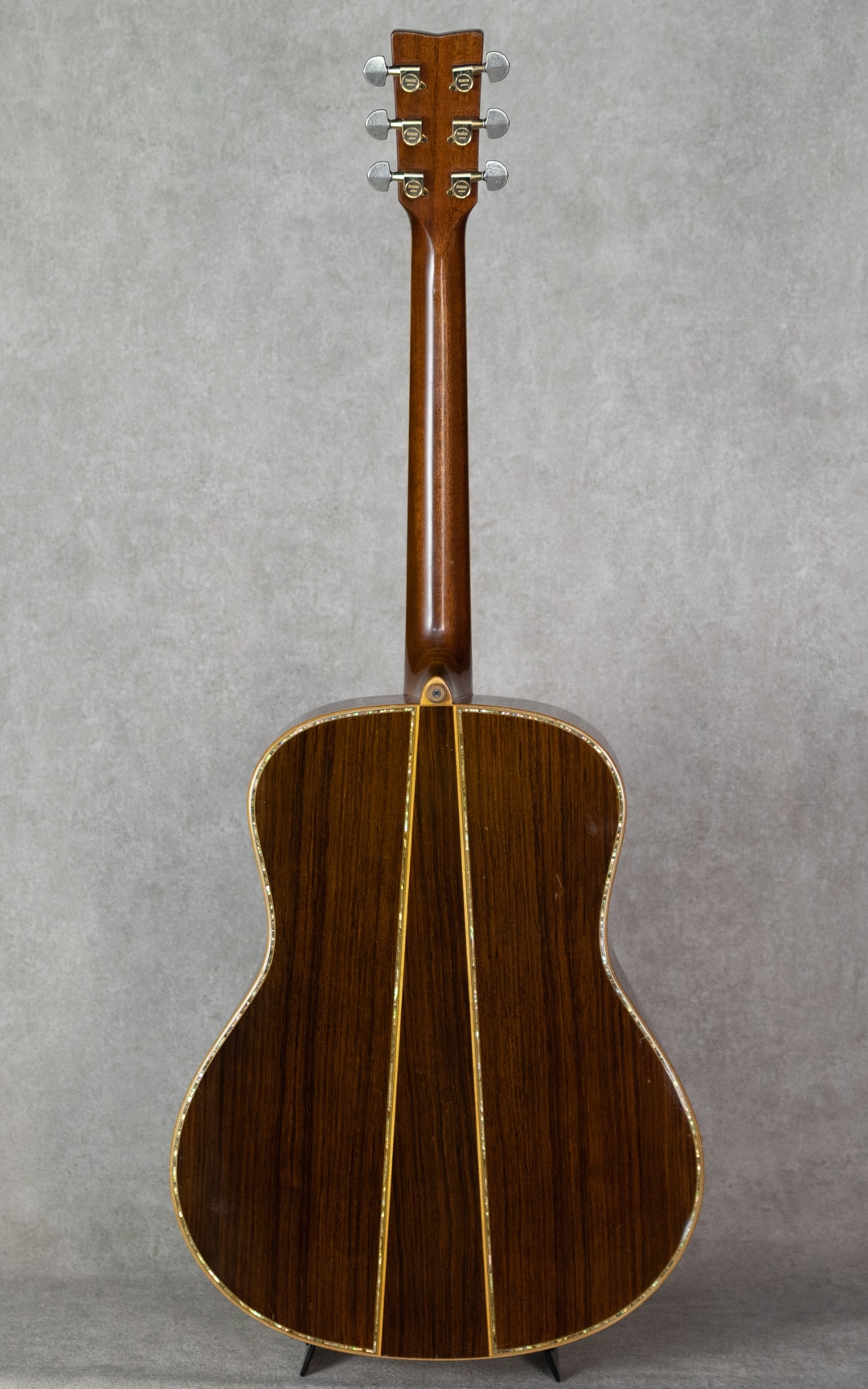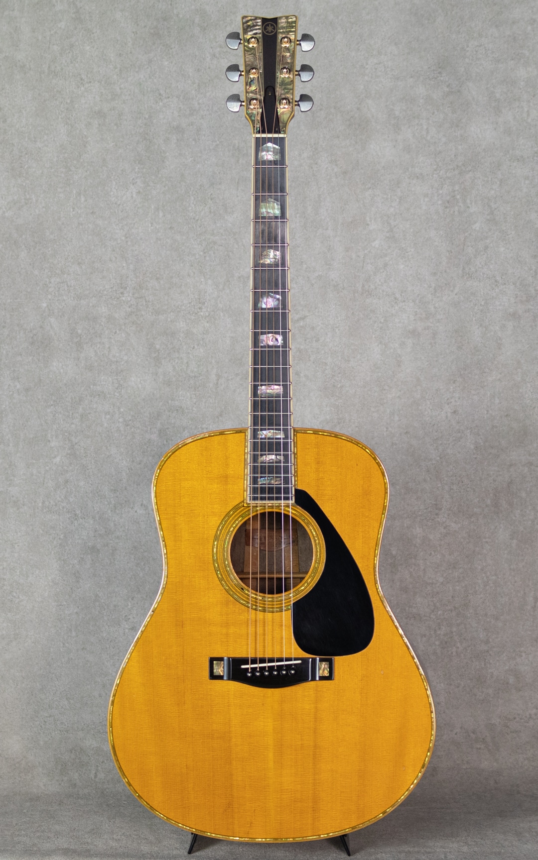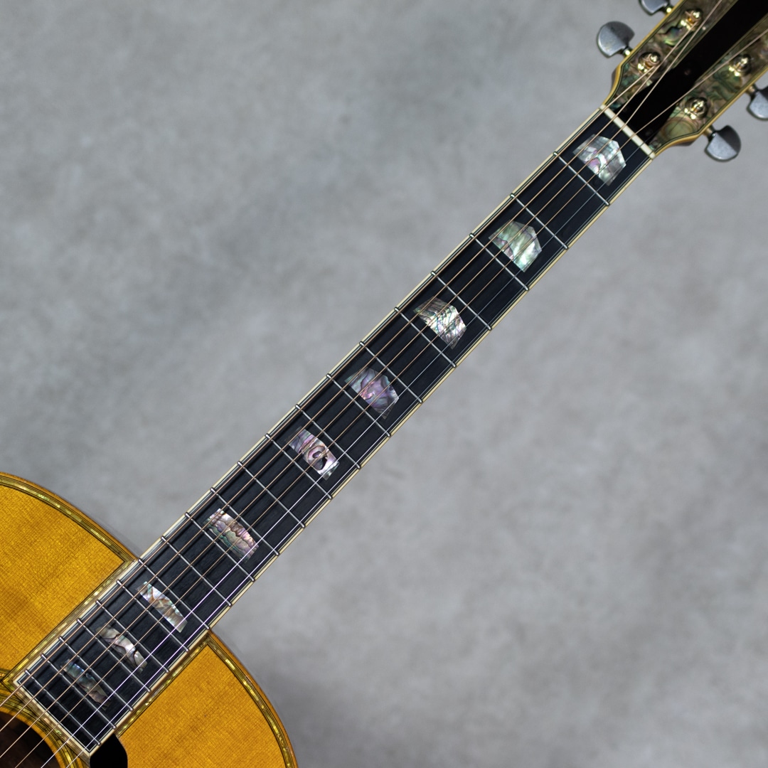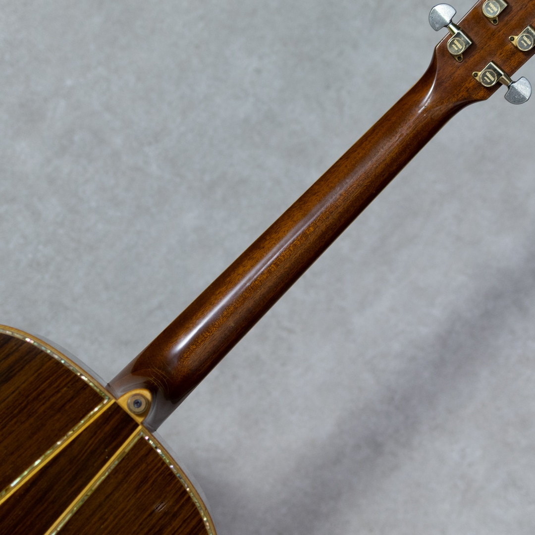 ヤマハを代表するギターとして、数多くの一流アーティストをはじめ、多くのギターファンに愛されてきたLシリーズ。“FG”シリーズの上位機種として1974年にL-31を発表して以来、時代のミュージックシーンを彩り、数多くのアーティ ストやギターファンに愛され、日本の音楽シーンを支えて参りました。"L=Luxury(豪華)"を冠にした本シリーズは、伝統を継承しながらも現代のニーズを反映させ、細部にわたり改良を施されたシリーズです。本器は、1985年よりラインナップされたハカランダモデル"LL-53D Custom Jacaranda”。1985年にラインナップ刷新で設計変更され、新しいサウンドメイクを加えられた四天からの系譜を受け継ぐテリー中本サインのヤマハジャンボモデル。1985年製USED品。よく日焼けして貫禄を魅せる最高級エゾ松トップ、しっかりと柾目で配された最高級ハカランダサイド&バック。バックは3ピース構造です。マホガニーネック、エボニー指板&ブリッジ、アバロンヘッドインレイ、アバロン指板インレイ、アバロンボディトリム、アバロンロゼッタ、メイプルバインディング、ブラックピックガード、TM-57Gゴールドペグ。75年の四天王発売からラインナップされる”53”。この年よりサウンドメイクが一新され、それまでの無骨で荒々しいサウンドから、パワフルかつクリアなサウンドへと変貌を遂げました。メインのXブレイシングと3本トーンバーの一部にスキャロップ加工がされるようになり、ふくよかで奥深くよく響く低域とヤマ"L”ならではのサスティンの効いた高音が同居されるようになりました。本器もしっかりと弾き込まれており、淀みない大きな音量を轟かせながら、爽やかでフォーキーな輝きを放っています。歴戦の経歴を伺わす貫禄めいた表情の本器。過去に塗装修正がされていますが、その後の経年もたっており全体にびっしりとウェザーチェックをまとっています。ボディトップセンターシーム補修やピッキングウェアなど、使用に伴う傷や補修こそ見られますが、しっかりと手入れされており俄然元気なコンディション。ネックまわりも良好で、弾きやすいアクションをサドルマージンをしっかりと残し保っています。ボディコンタクトピエゾピックアップ搭載。弾き語りにも持ってこいなヤマハ”L”を受け継ぐ80’sモデルの”53”。まだまだ現役の即戦力ギターです。お見逃しなく。その他修理履歴などの詳細はお気軽にお問い合わせください。オリジナルハードケース付属