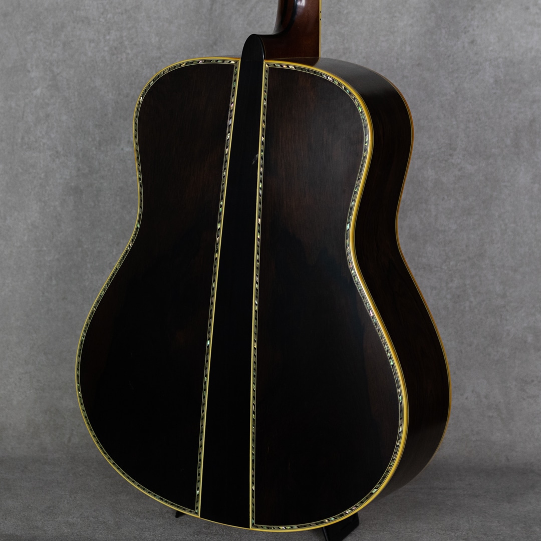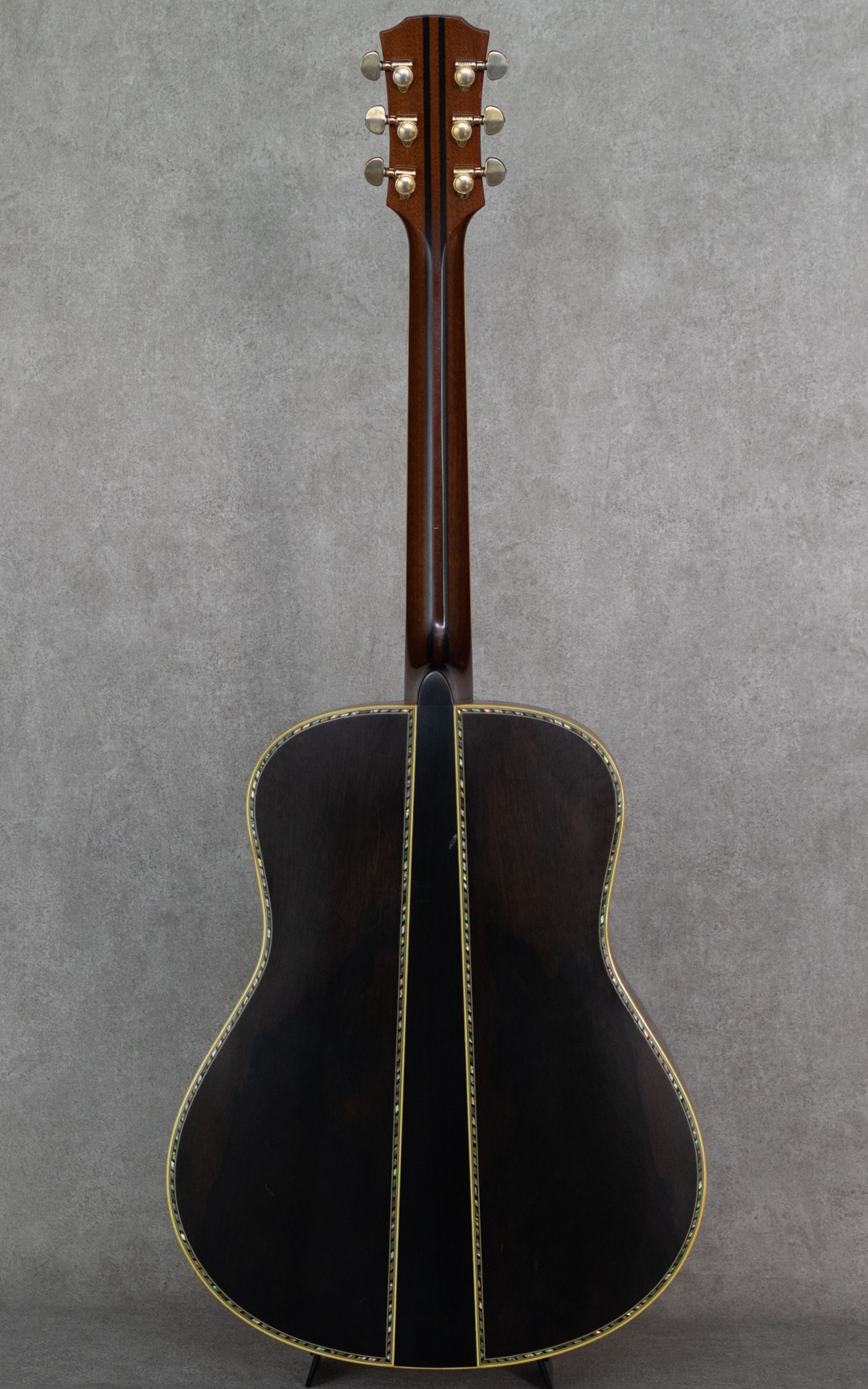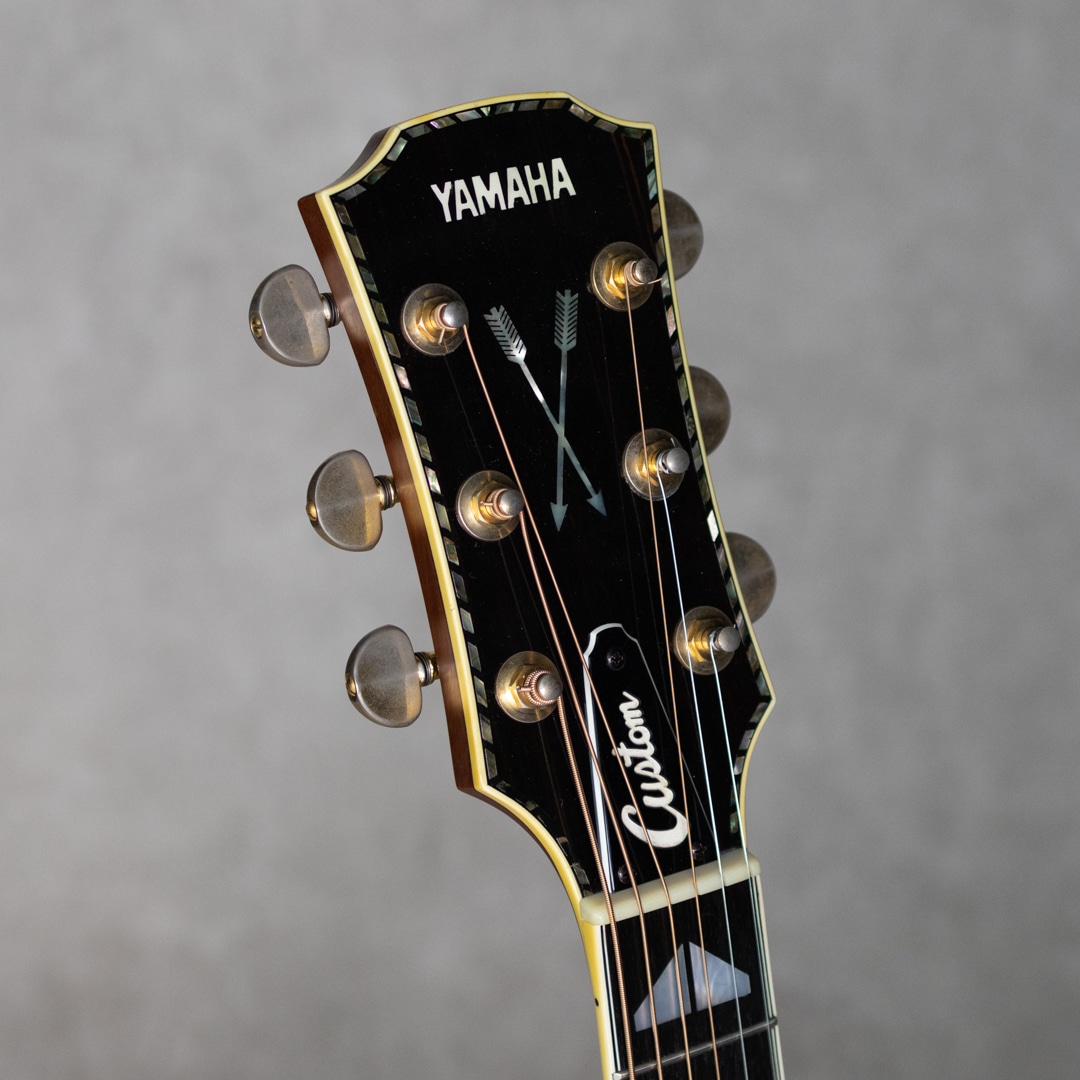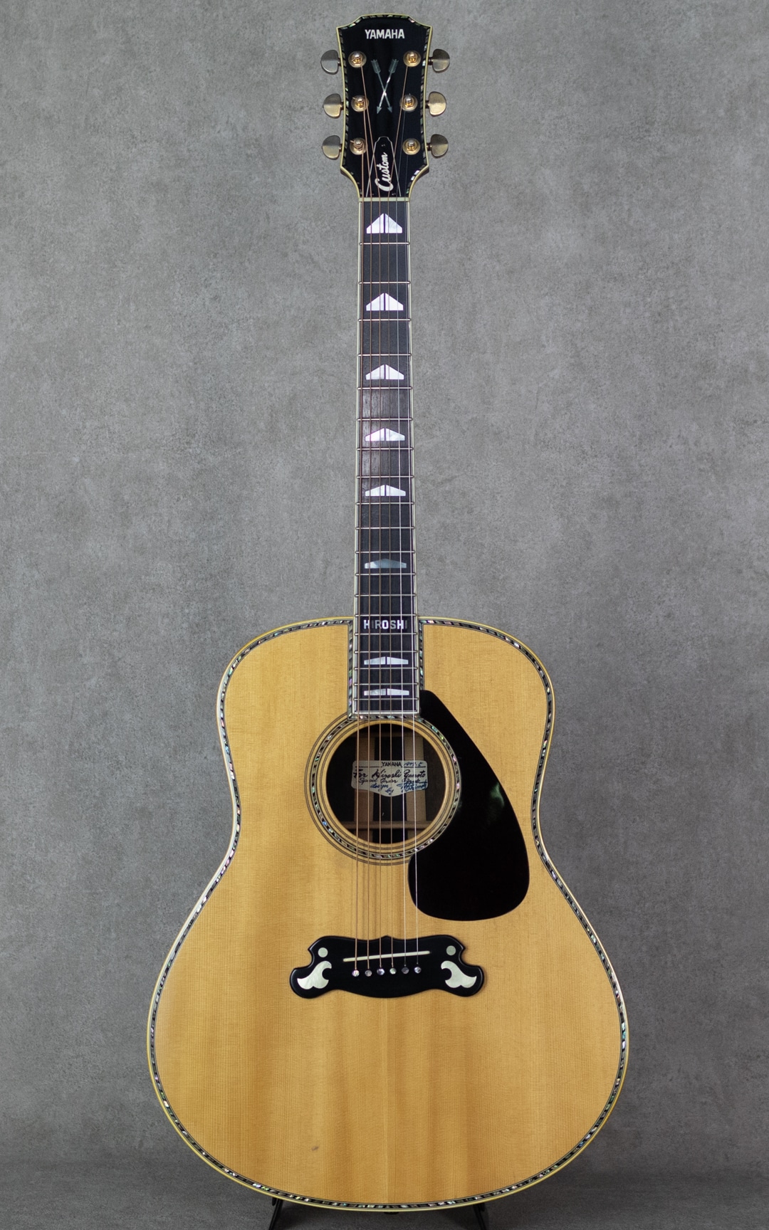 ヤマハを代表するギターとして、数多くの一流アーティストをはじめ、多くのギターファンに愛されてきたLシリーズ。“FG”シリーズの上位機種として1974年にL-31を発表して以来、時代のミュージックシーンを彩り、数多くのアーティ ストやギターファンに愛され、日本の音楽シーンを支えて参りました。"L=Luxury(豪華)"を冠にした本シリーズは、伝統を継承しながらも現代のニーズを反映させ、細部にわたり改良を施されたシリーズです。そのLシリーズにおいて各項目を好みに選び作り上げる、オンリーワンの1本をオーダーできる"スペシャルオーダーメイドシステム”。惜しまれながらも2014年にオーダーストップとなり、今なお復活を望む数多くのファンがいる大人気のオーダーシステムです。本器はカスタムメイド黎明期の四天王を基にしたハカランダカスタムモデル”L-Special Order Made Model Jacaranda”。2mmバイアストリム、ハカランダS&B、マホガニー&黒檀ネックを採用した1977年製極上USED品。目の詰まった濃淡美しいスプルーストップ、黒々としたワイルドな杢目のハカランダサイド&バック。バックは3ピース構造で、センターに黒檀が配されています。マホガニー&黒檀5ピースネック、エボニー指板&ブリッジ、白蝶貝指板インレイ、アバロン2mmバイアスのヘッド&ボディトップ&バックトリムインレイ、アバロン2mmバイアスロゼッタ、べっ甲柄ピックガード、グローバーミルクボトルゴールドペグ。ヤマハジャンボを基にアメリカンサウンドを意識した造りを狙ったと思われる本器。タイトな立ち上がりと歯切れ良いトーン、しっかりとパンチがありコシのあるまとまった響きは、ヤマハならではのグレイトサウンドです。フィンガータッチでのジャパニーズフォークのきらびやかなサウンドから、パワフルなストロークサウンドまで網羅する70sヤマハの高いポテンシャルを感じさせる1本です。ヘッドに矢をモチーフにしたインレイと、指板15f部にネームインレイが施されています。使用に伴う若干の小傷は見られますが、40数年の経年を考えると十二分にグッドコンディションの本器。板割れなどはなく、ネックコンディションも良好。弾きやすいアクションをしっかりとサドルマージンを残した持っています。ヤマハカスタムの中でも人気の高い70年代後半のハカランダモデル。ネームインレイがありますので、相場よりはお値頃な価格でのご案内となります。是非お見逃しなく。。オリジナルハードケース付属