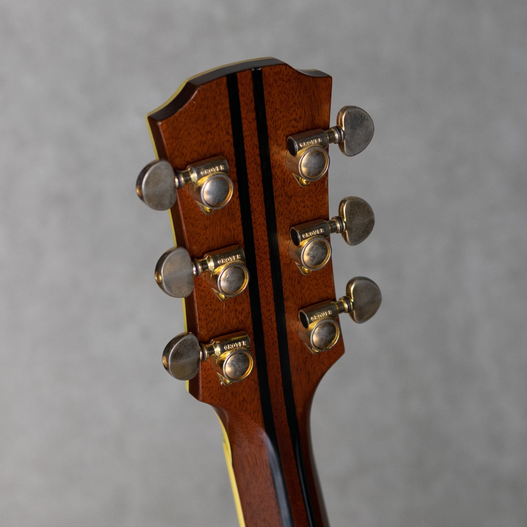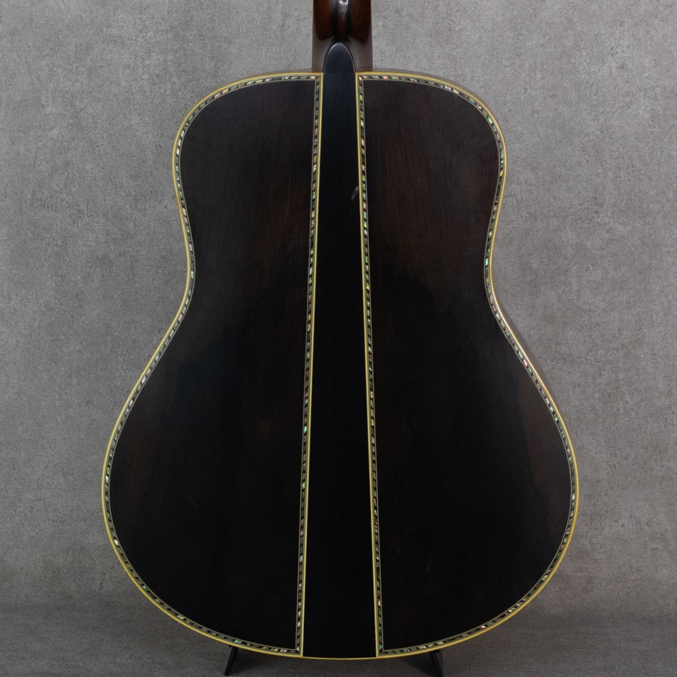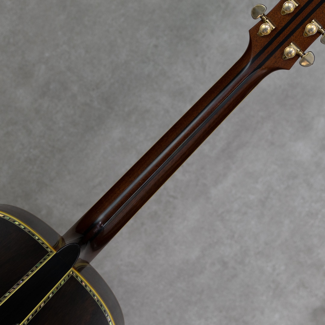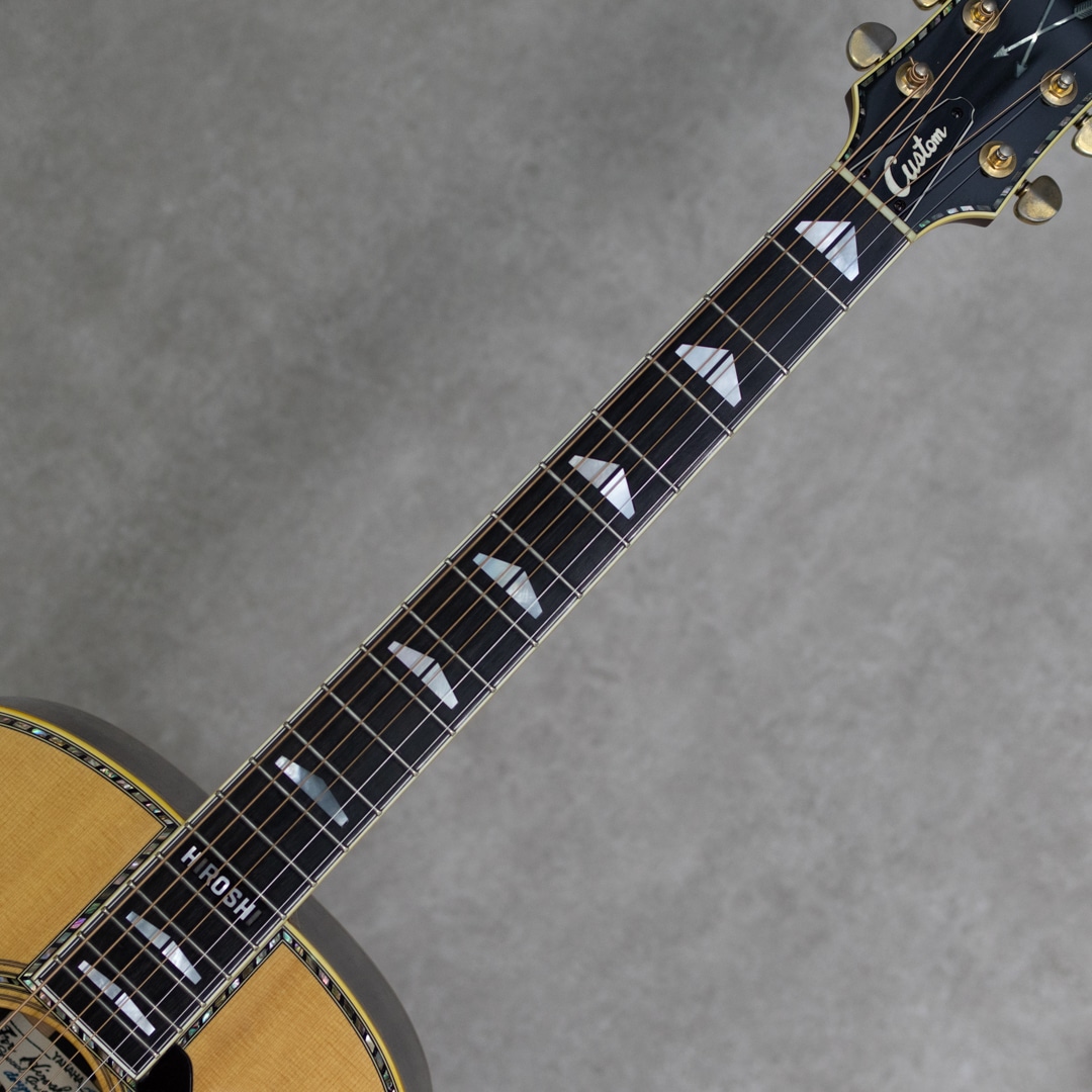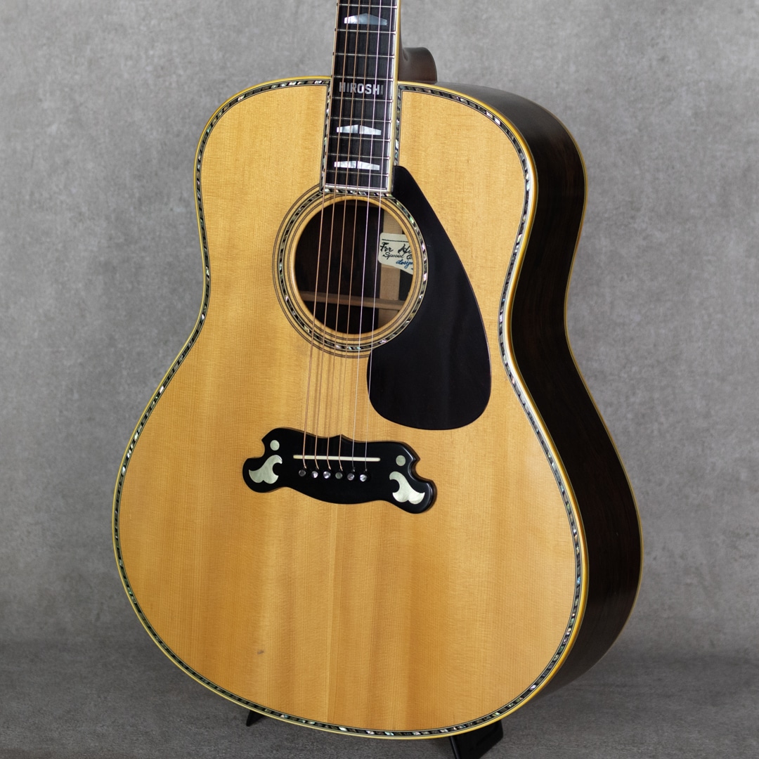 ヤマハを代表するギターとして、数多くの一流アーティストをはじめ、多くのギターファンに愛されてきたLシリーズ。“FG”シリーズの上位機種として1974年にL-31を発表して以来、時代のミュージックシーンを彩り、数多くのアーティ ストやギターファンに愛され、日本の音楽シーンを支えて参りました。"L=Luxury(豪華)"を冠にした本シリーズは、伝統を継承しながらも現代のニーズを反映させ、細部にわたり改良を施されたシリーズです。そのLシリーズにおいて各項目を好みに選び作り上げる、オンリーワンの1本をオーダーできる"スペシャルオーダーメイドシステム”。惜しまれながらも2014年にオーダーストップとなり、今なお復活を望む数多くのファンがいる大人気のオーダーシステムです。本器はカスタムメイド黎明期の四天王を基にしたハカランダカスタムモデル”L-Special Order Made Model Jacaranda”。2mmバイアストリム、ハカランダS&B、マホガニー&黒檀ネックを採用した1977年製極上USED品。目の詰まった濃淡美しいスプルーストップ、黒々としたワイルドな杢目のハカランダサイド&バック。バックは3ピース構造で、センターに黒檀が配されています。マホガニー&黒檀5ピースネック、エボニー指板&ブリッジ、白蝶貝指板インレイ、アバロン2mmバイアスのヘッド&ボディトップ&バックトリムインレイ、アバロン2mmバイアスロゼッタ、べっ甲柄ピックガード、グローバーミルクボトルゴールドペグ。ヤマハジャンボを基にアメリカンサウンドを意識した造りを狙ったと思われる本器。タイトな立ち上がりと歯切れ良いトーン、しっかりとパンチがありコシのあるまとまった響きは、ヤマハならではのグレイトサウンドです。フィンガータッチでのジャパニーズフォークのきらびやかなサウンドから、パワフルなストロークサウンドまで網羅する70sヤマハの高いポテンシャルを感じさせる1本です。ヘッドに矢をモチーフにしたインレイと、指板15f部にネームインレイが施されています。使用に伴う若干の小傷は見られますが、40数年の経年を考えると十二分にグッドコンディションの本器。板割れなどはなく、ネックコンディションも良好。弾きやすいアクションをしっかりとサドルマージンを残した持っています。ヤマハカスタムの中でも人気の高い70年代後半のハカランダモデル。ネームインレイがありますので、相場よりはお値頃な価格でのご案内となります。是非お見逃しなく。。オリジナルハードケース付属