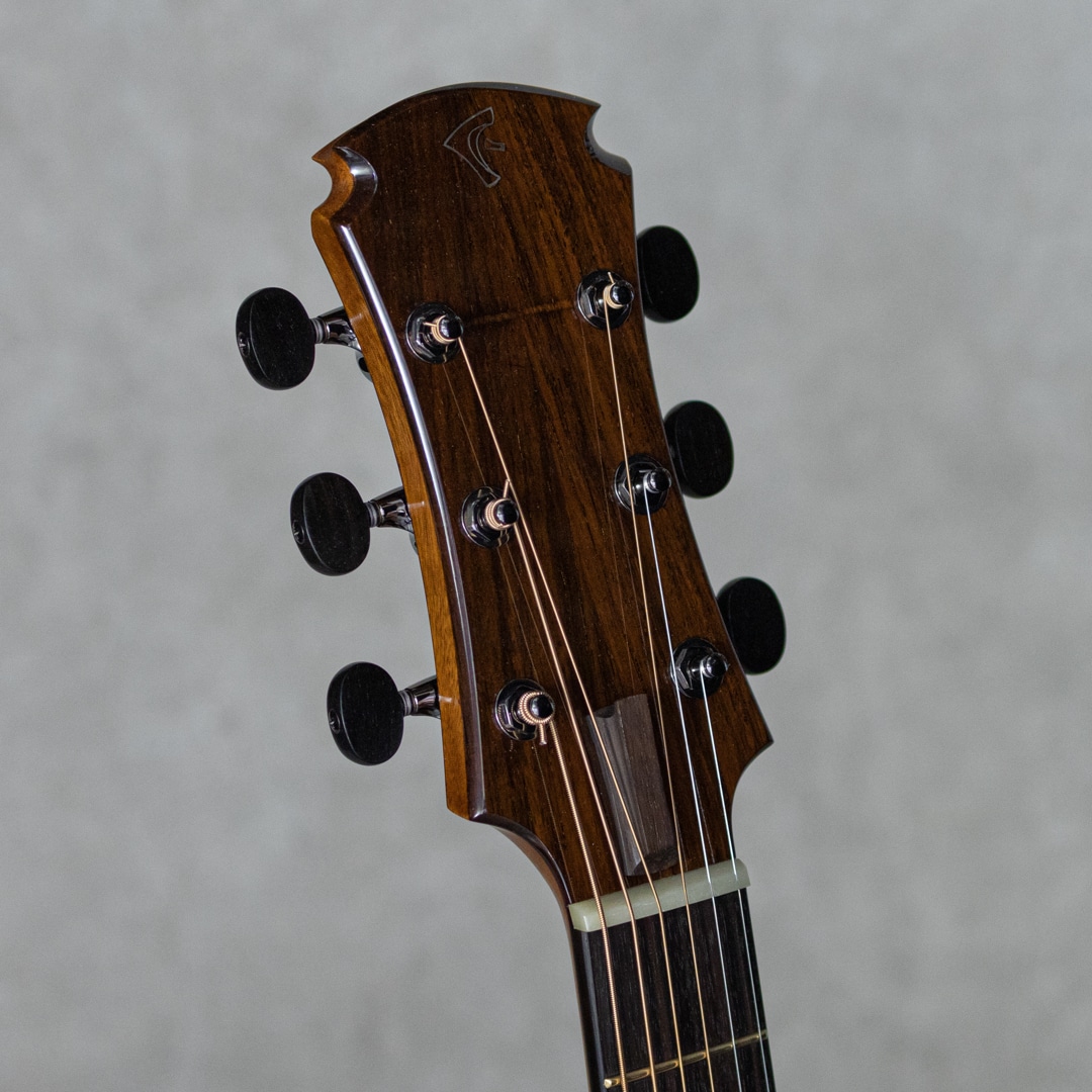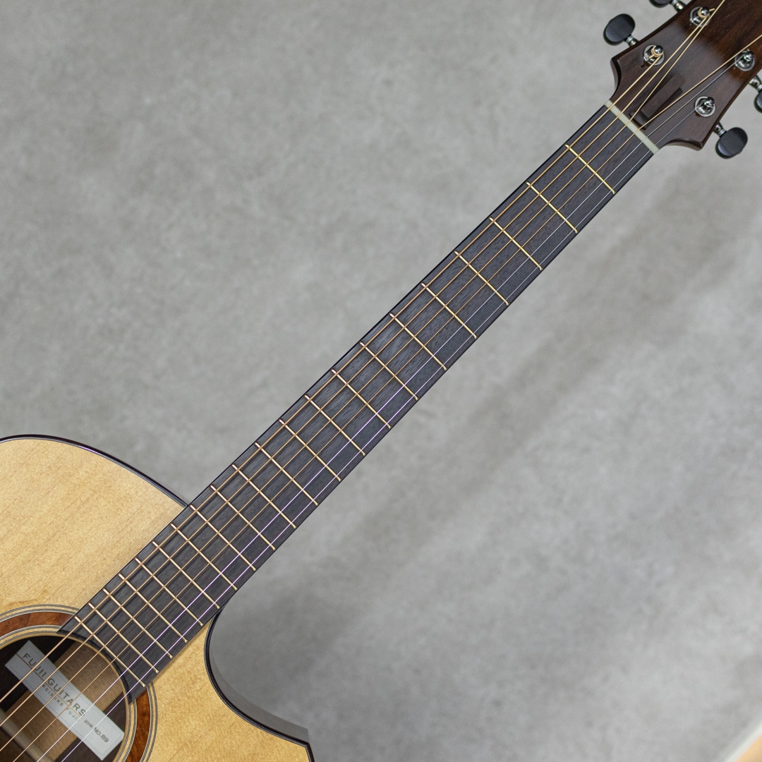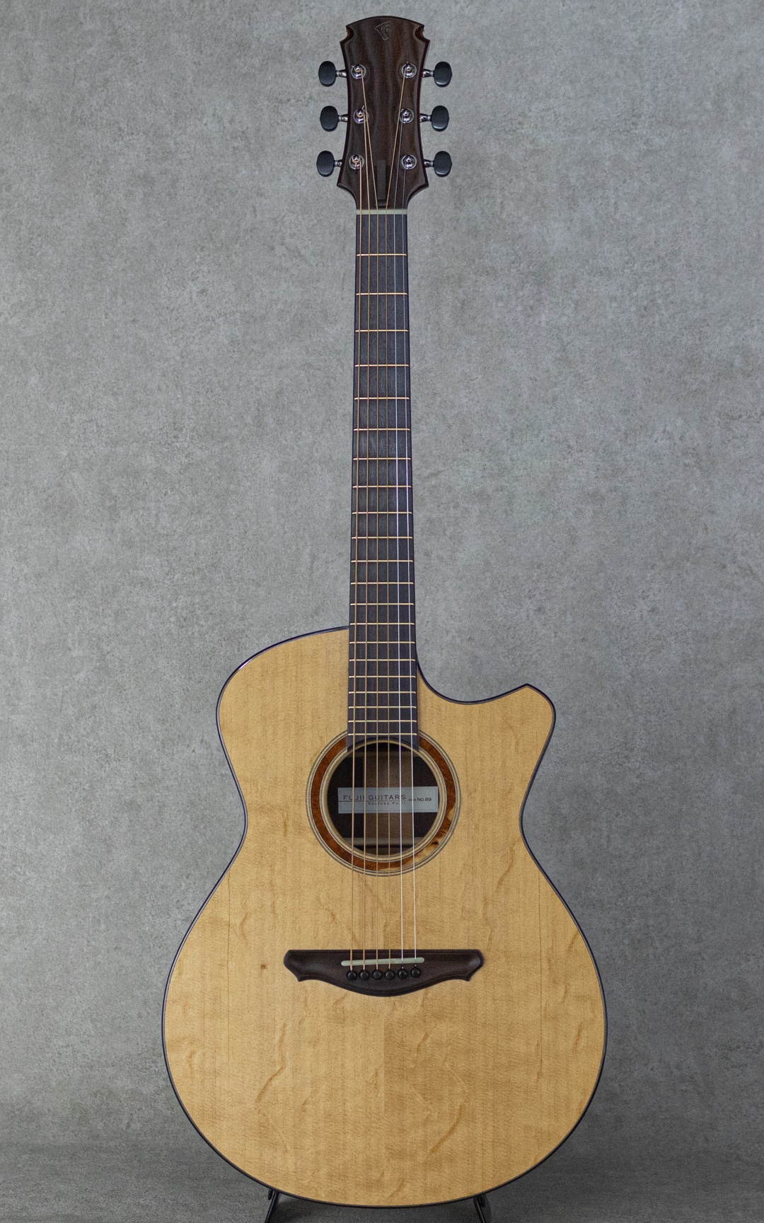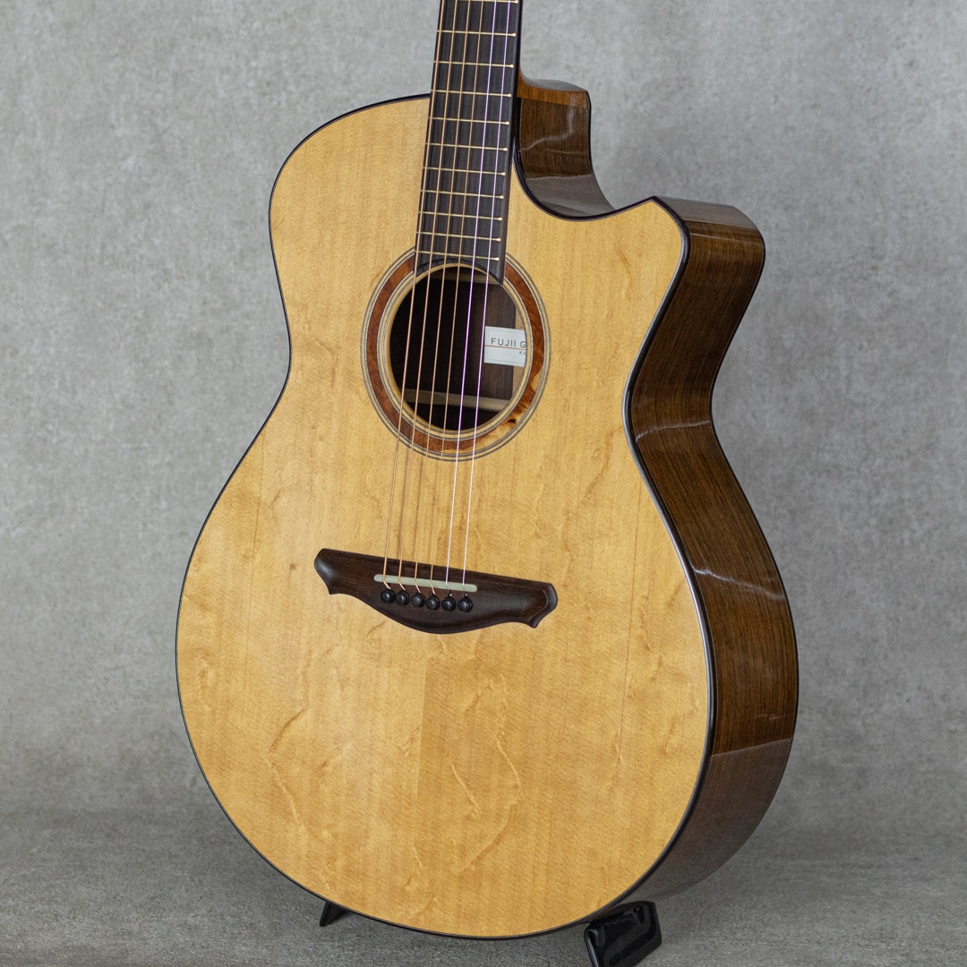 富山のルシアー藤井圭介が手掛ける”Fujii Guitars”。豊富なキャリアに裏付けされる国内屈指の卓越した技術と真摯な信念から作られるギターは、楽器としての完成度の高さはもちろん、プロミュージシャンをも唸らせる高いプレイアビリティをも備え、世界的にも非常に高い評価を得ています。本器はOMカッタウェイモデル”OM-cw Bearclaw Sitka Spruce / Amazon Rosewood”。極上マテリアルを使用した2018年製USED品。全面に杢の浮き出た美事なベアクロウ・シトカスプルース(オプション)をトップに、追柾目杢が美しいアマゾンローズウッドをサイド&バック(オプション)に使用。ホンジュラスマホガニーのワンピースネック(オプション)、エボニー指板、ハカランダブリッジ(オプション)、ゴトー510ペグ&エボニーボタン、ヘッド"F"ロゴマーク(オプション)、クリアッピックガード(オプション)、ウッドマルプルロゼッタ、ローズウッドバインディング、フローレンタインカッタウェイ(オプション)。トップ構造はXブレイシングを基としたダブルX構造のオリジナルブレイス。美事な杢のマテリアルを使用した、美しい響きとドライブ感が絶妙な本器。反応の良い力強くハリのある立ち上がり。それでいて過敏過ぎずプレイヤーを受け入れてくれる許容も持ち合わせます。フィンガータッチで十二分に反応し、シングルノートからコードワークまで幅広く対応できるポテンシャルの高い1本。アマゾンローズのほどよいレンジ感と明瞭感は、中南米ローズの中でも人気の高いマテリアルのひとつです。また、ボディエッジの面取りの丁寧さにより抱えた時の角張った感触はなく、体に吸い付く様なフィーリングも魅力です。使用に伴う若干のピッキングウェアや小傷は見られますが、大きく損なう傷はなくグッドコンディションの本器。ネックまわりも良好で反りなどもなく、氏のもうひとつの持ち味と言えば、正確なネックワークからのプレイアビリティの高さ。細身ではないネックシェイプですが太さを感じさせず手にフィットするシェイプは、弾きやすいだけでは言い尽くせない、ベテランプレイヤーも唸らせるプレイアビリティを持ち合わせます。使い込めばより楽器との一体感を得られる良き相棒の本器。様々なキャリアを経てきた彼の音色を、是非そのお手元でお確かめください。オリジナルハードケース付属