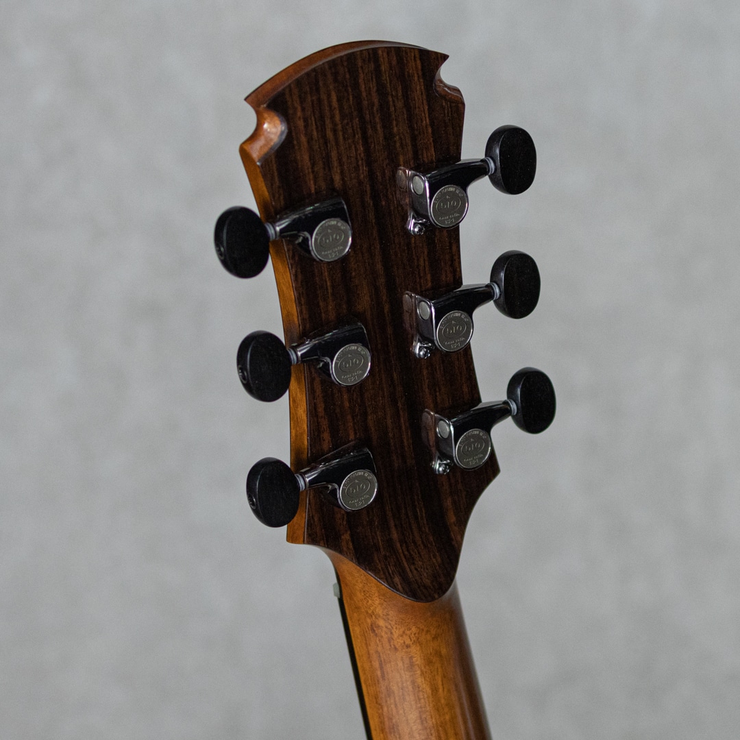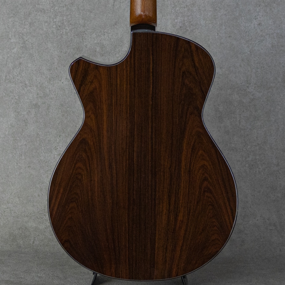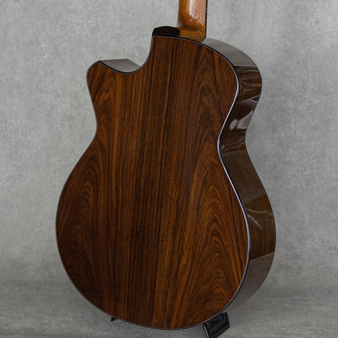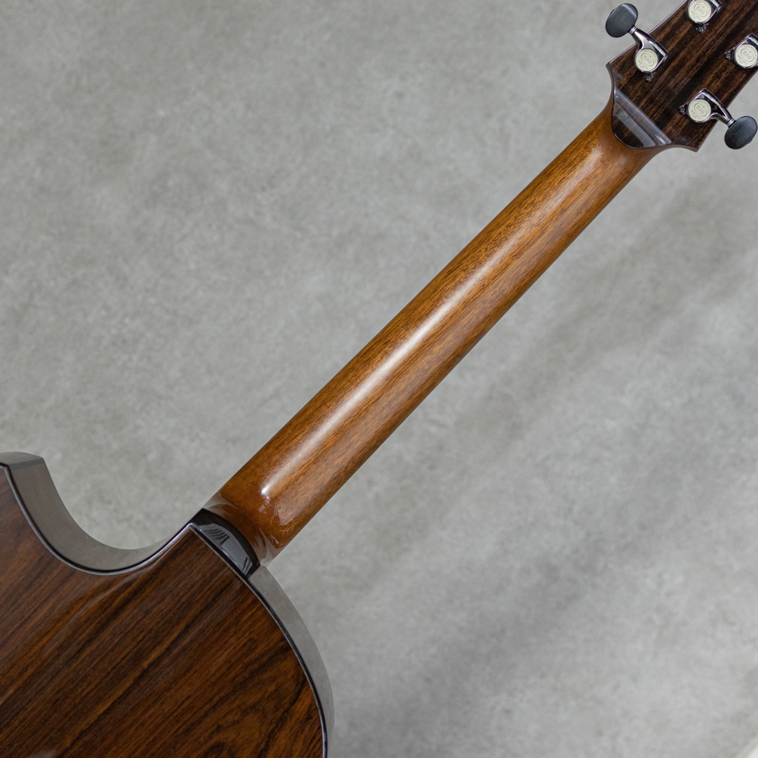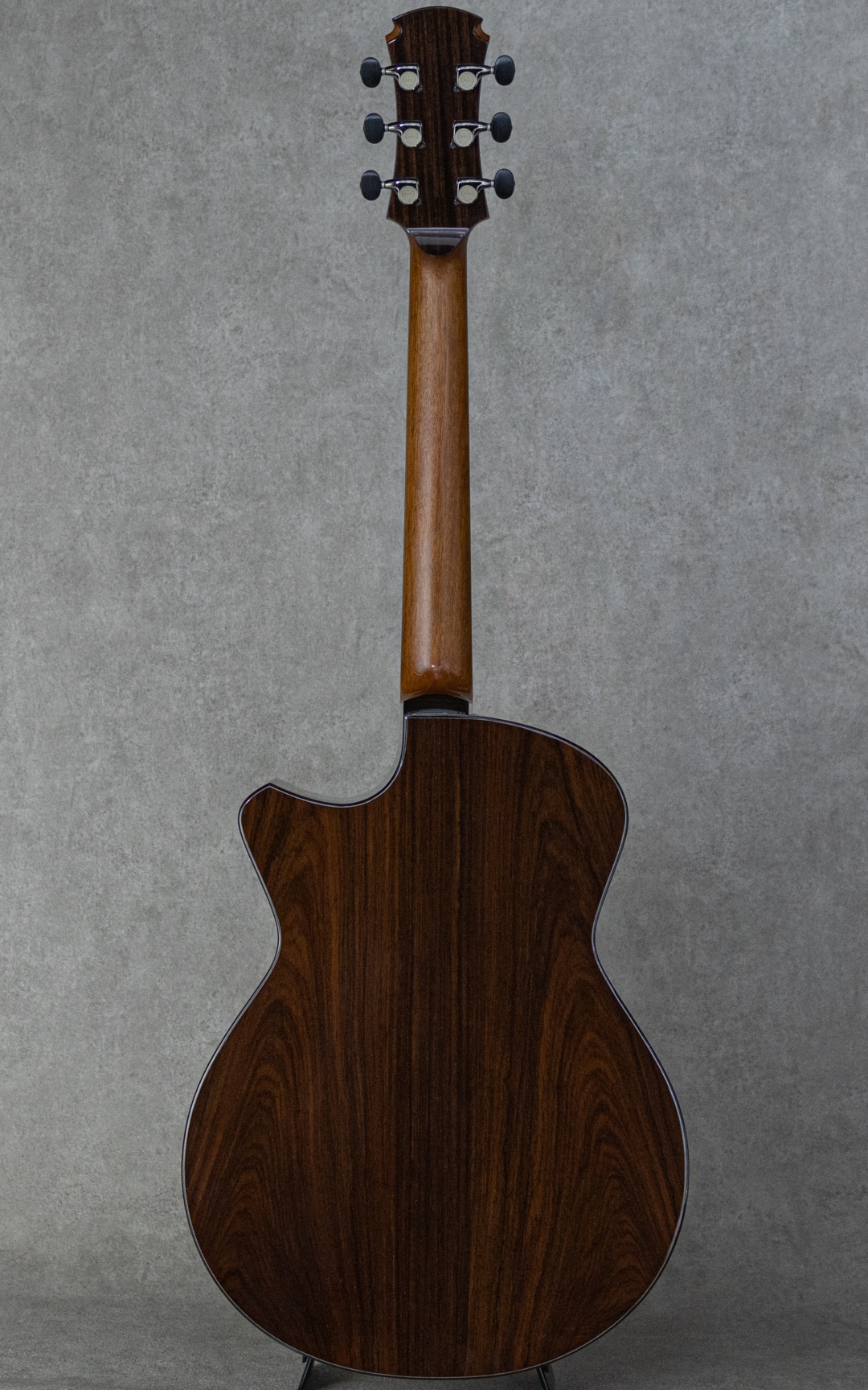 富山のルシアー藤井圭介が手掛ける”Fujii Guitars”。豊富なキャリアに裏付けされる国内屈指の卓越した技術と真摯な信念から作られるギターは、楽器としての完成度の高さはもちろん、プロミュージシャンをも唸らせる高いプレイアビリティをも備え、世界的にも非常に高い評価を得ています。本器はOMカッタウェイモデル”OM-cw Bearclaw Sitka Spruce / Amazon Rosewood”。極上マテリアルを使用した2018年製USED品。全面に杢の浮き出た美事なベアクロウ・シトカスプルース(オプション)をトップに、追柾目杢が美しいアマゾンローズウッドをサイド&バック(オプション)に使用。ホンジュラスマホガニーのワンピースネック(オプション)、エボニー指板、ハカランダブリッジ(オプション)、ゴトー510ペグ&エボニーボタン、ヘッド"F"ロゴマーク(オプション)、クリアッピックガード(オプション)、ウッドマルプルロゼッタ、ローズウッドバインディング、フローレンタインカッタウェイ(オプション)。トップ構造はXブレイシングを基としたダブルX構造のオリジナルブレイス。美事な杢のマテリアルを使用した、美しい響きとドライブ感が絶妙な本器。反応の良い力強くハリのある立ち上がり。それでいて過敏過ぎずプレイヤーを受け入れてくれる許容も持ち合わせます。フィンガータッチで十二分に反応し、シングルノートからコードワークまで幅広く対応できるポテンシャルの高い1本。アマゾンローズのほどよいレンジ感と明瞭感は、中南米ローズの中でも人気の高いマテリアルのひとつです。また、ボディエッジの面取りの丁寧さにより抱えた時の角張った感触はなく、体に吸い付く様なフィーリングも魅力です。使用に伴う若干のピッキングウェアや小傷は見られますが、大きく損なう傷はなくグッドコンディションの本器。ネックまわりも良好で反りなどもなく、氏のもうひとつの持ち味と言えば、正確なネックワークからのプレイアビリティの高さ。細身ではないネックシェイプですが太さを感じさせず手にフィットするシェイプは、弾きやすいだけでは言い尽くせない、ベテランプレイヤーも唸らせるプレイアビリティを持ち合わせます。使い込めばより楽器との一体感を得られる良き相棒の本器。様々なキャリアを経てきた彼の音色を、是非そのお手元でお確かめください。オリジナルハードケース付属