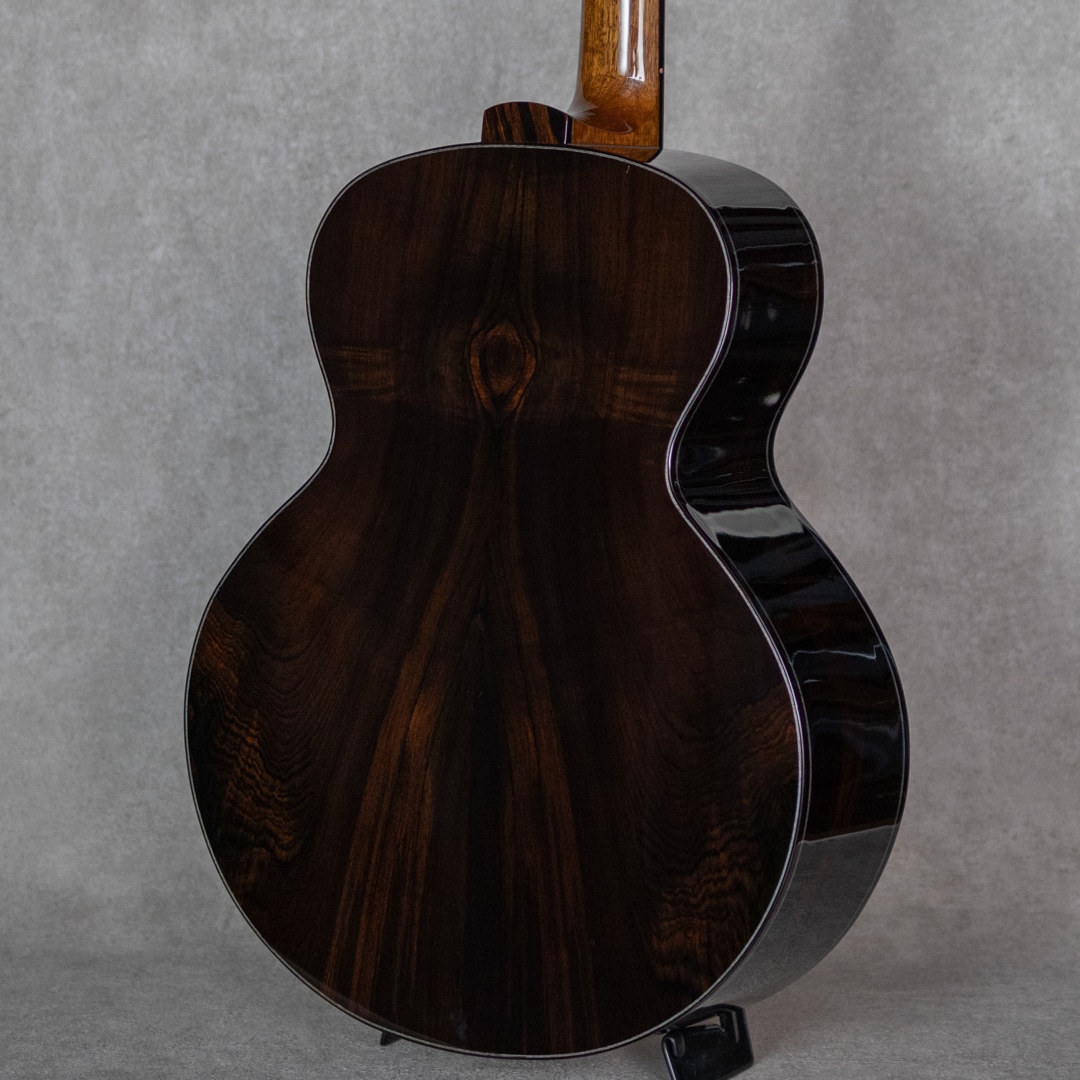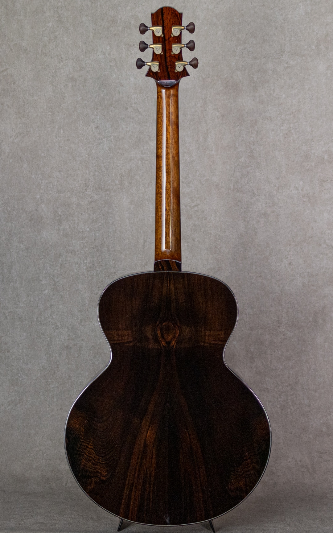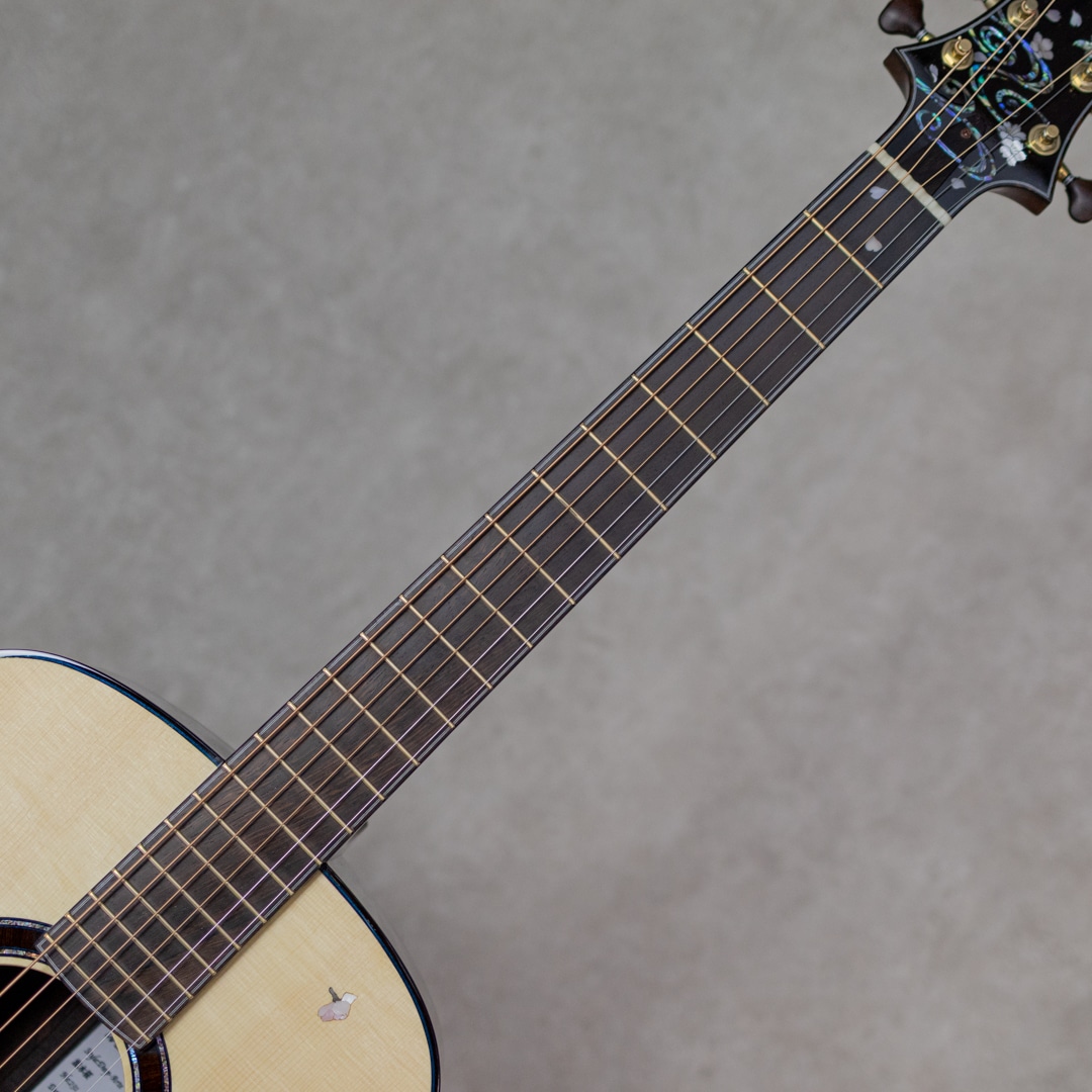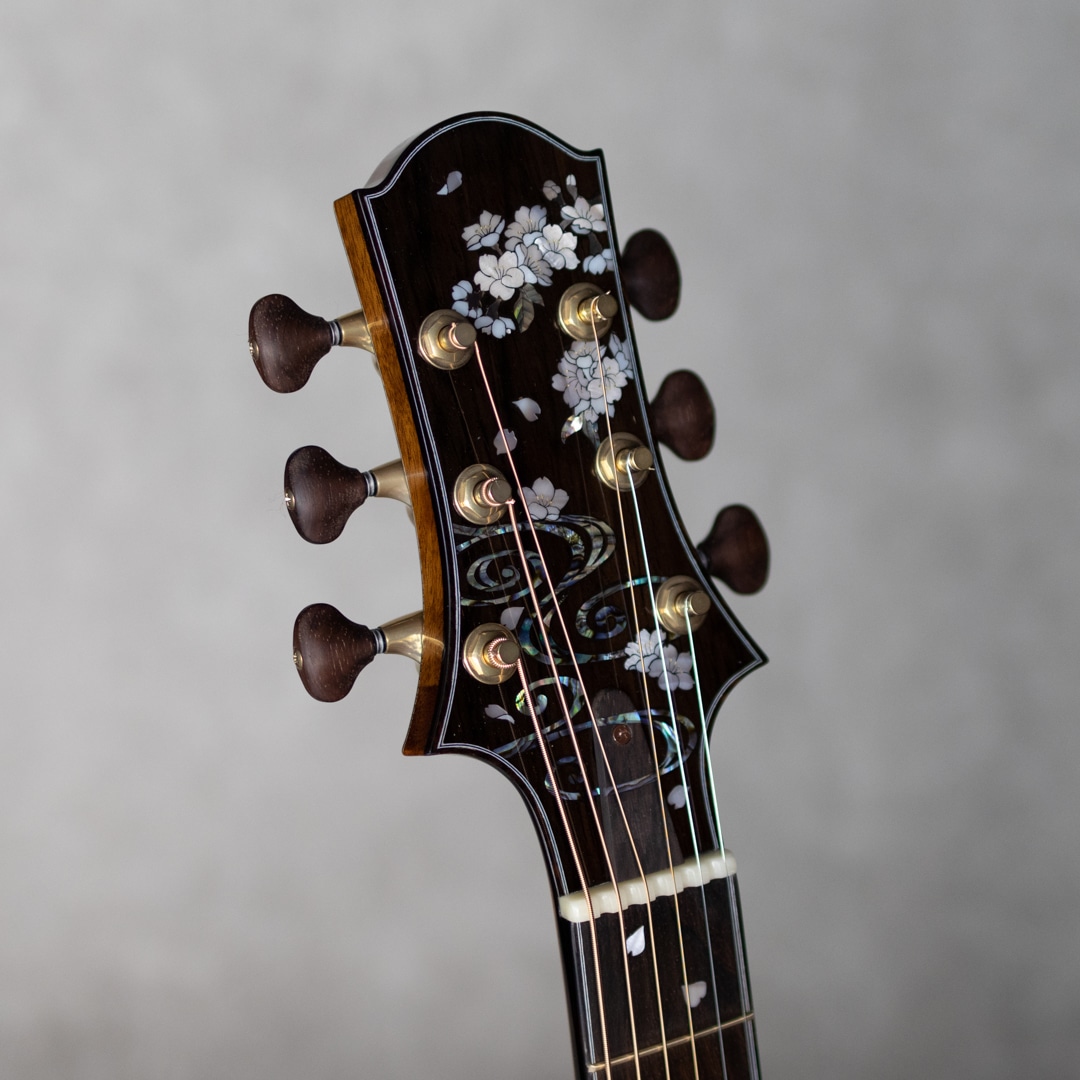 群馬にて増田明夫氏が製作する"Water Road Guitars"は、"音、弾きやすさ、デザインへのこだわり"を概念にオンリーワンのカスタムを製作しています。極上マテリアルを最大限に活かしたあふれる倍音、迫力のサウンド、稀代の天才が造り出す日本が誇るルシアーギターです。本器は、極上のシスターセットマテリアルで製作された対になる”Deep Arte”モデル。WRモデルの中でも1番人気である41cmセミ・ジャンボモデルを基に、"流水桜"をコンセプトにした極上マテリアルを持つノンカッタウェイモデル。トップには全面にびっしりと入った柾目痕とベアクロウ杢が浮き出てたベアクロウジャーマンスプルース、サイド&バックには美事な毛柾目杢の黒々としたオールドグロウスハカランダを贅沢に使用。ホンジュラスマホガニーネック、ハカランダ指板&ブリッジ、ハカランダヘッドプレート&ヘッドバックプレート、ハカランダバインディング、ハカランダ&アバロンロゼッタ、ゴールドゴトー510H.A.P.Aペグ&ハカランダウッドノブ、ゴールドフレット、クリアピックガード、ブルーカラードのトリムパーフリング&エンドグラフト。WRのお家芸でもあるインレイワークは、WRのブランドイメージにも使用される美しい”流水桜”がコンセプトで、ヘッドに美しい貝インレイとボディとブリッジに舞い散る桜が施されています。重厚で分厚いサウンド。奥深く響き、幾重にも重なった倍音が織りなすWRサウンド。ボディから溢れる倍音に負けないサスティンの聞いたトーンは、フィンガータッチでも十二分な反応を魅せる至極のサウンドです。日本が誇るルシアーギター、ウォーターロードギターの真骨頂を存分に味わえる本器。愛でてよし弾いてよしの日本が誇るベテラン製作家増田明夫氏渾身の1本。お見逃しなきよう要チェックください。日本製オリジナルハードケース(ブルーカラー)が付属します。