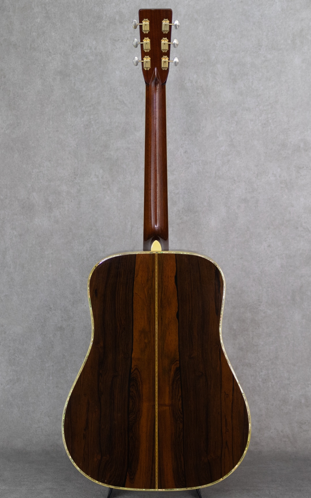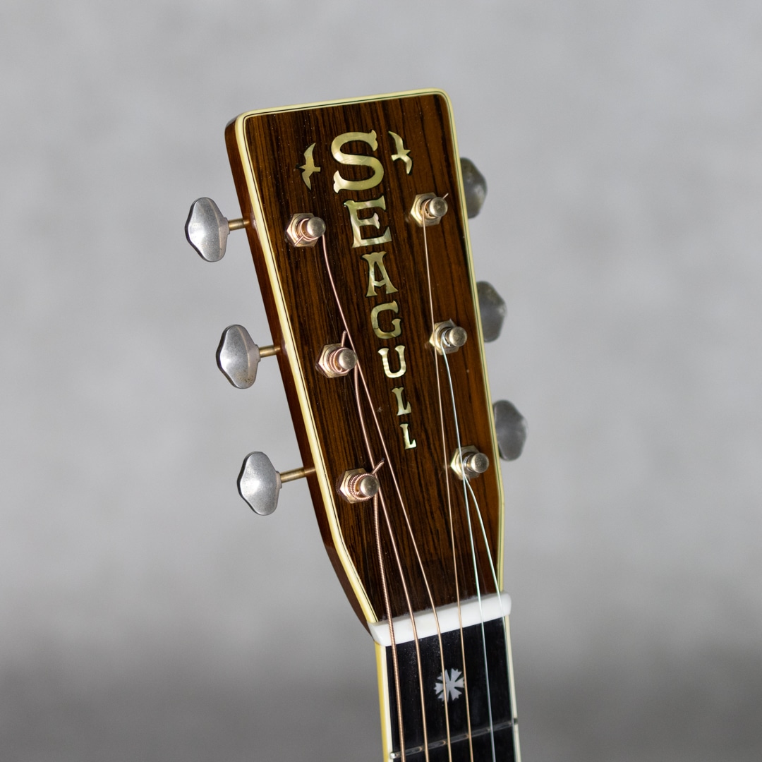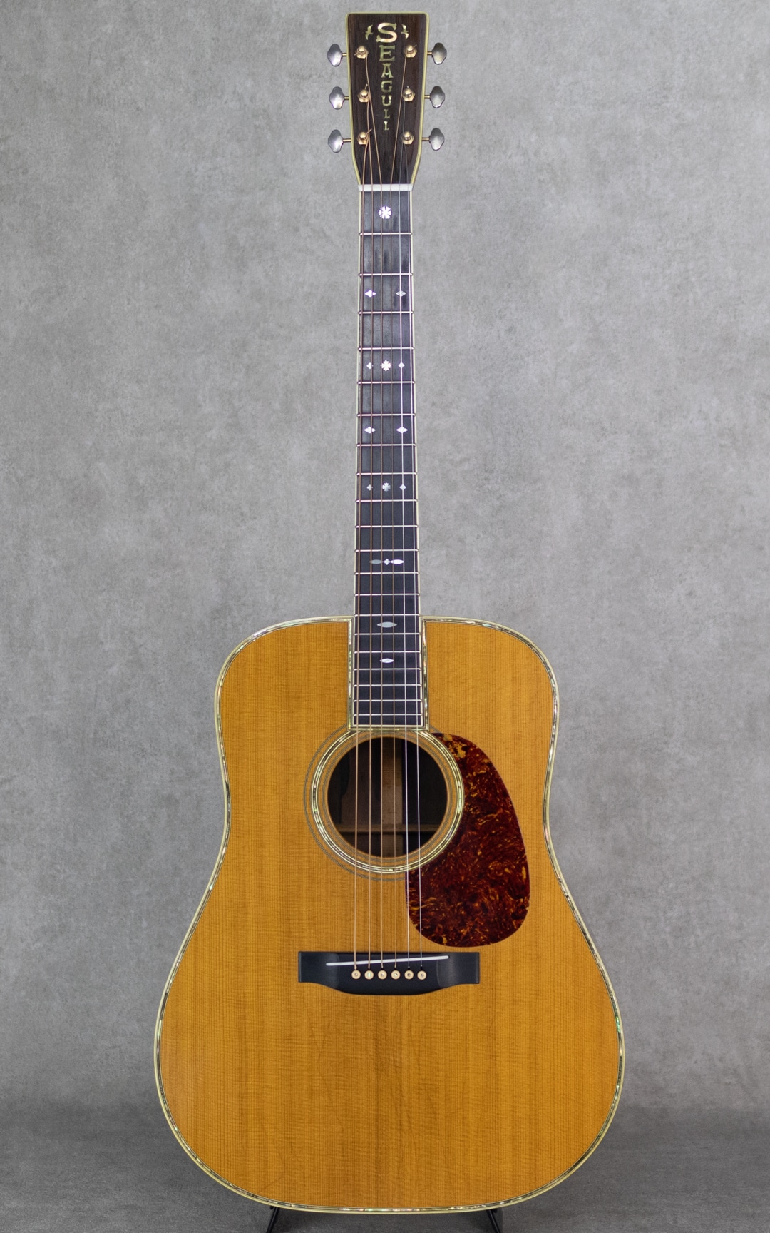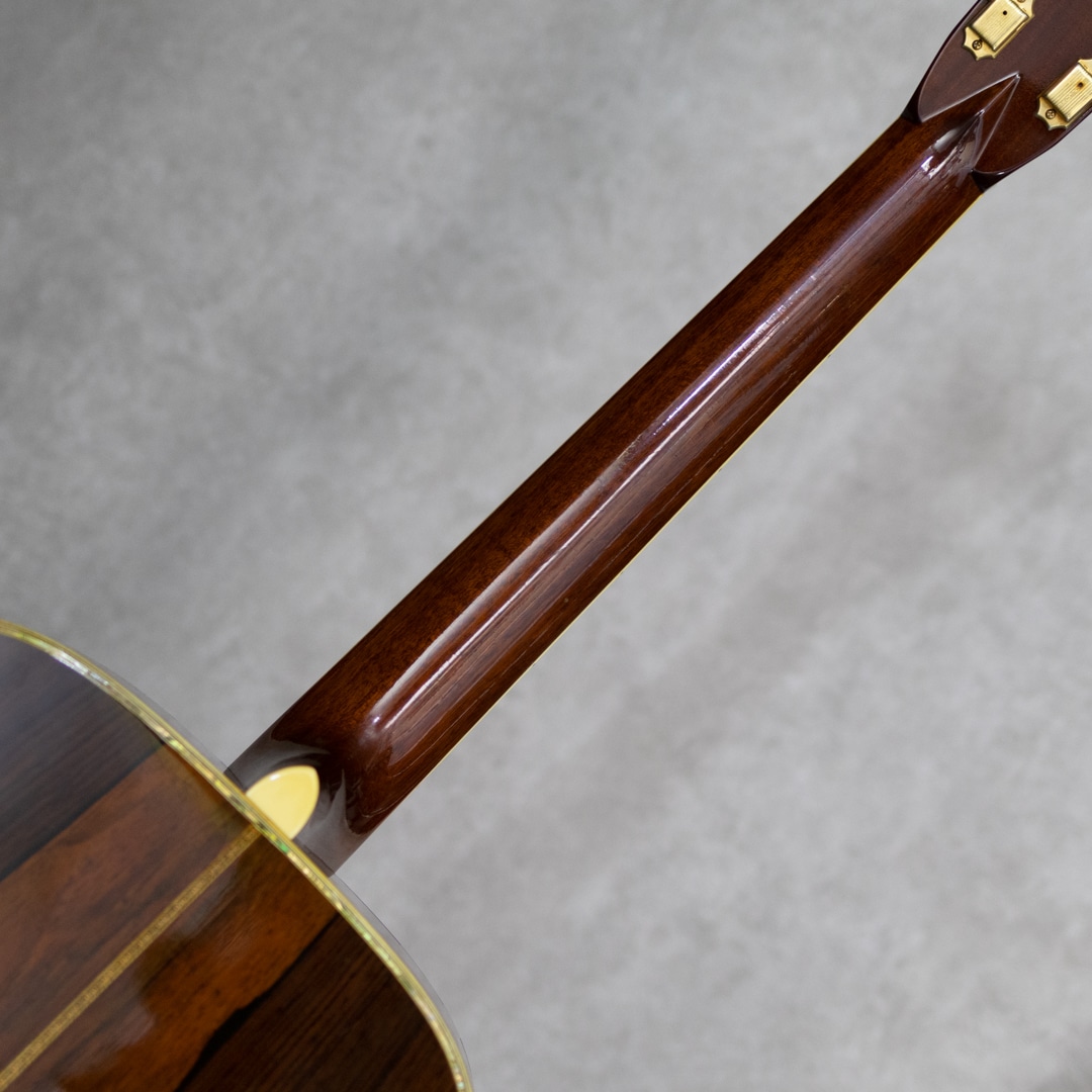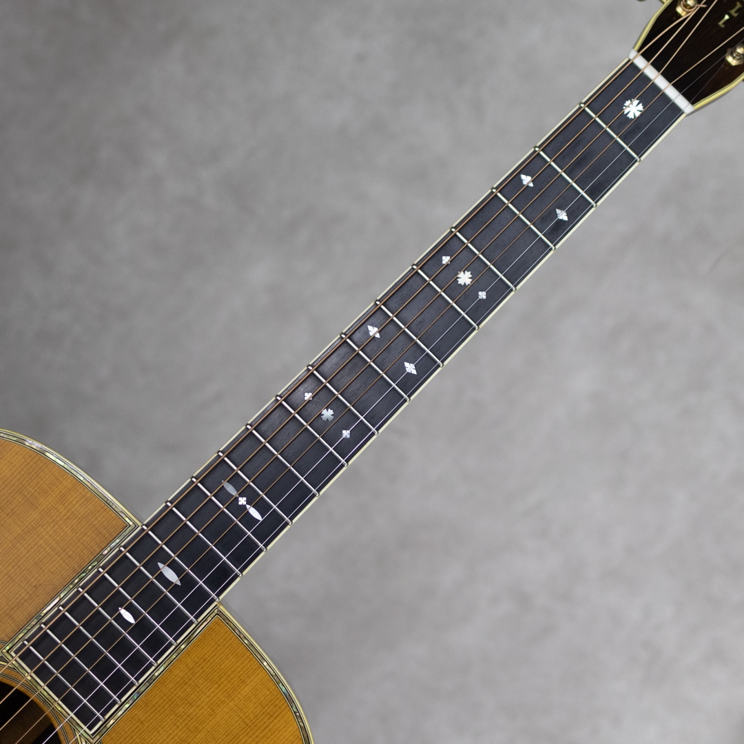 国内有数のベテランルシアー、エム・シオザキ弦楽器工房の塩崎雅亮氏による"シーガルギター"。塩崎氏は世界屈指のマーチン研究家としても知られています。塩崎氏が工房を立ち上げたのが1982年。本器は立ち上げ初期80年代製作のSD-85 Jacaranda"。スノウフレイクスのプリウォー45モデルよりインスパイアされ、独自のテイストで作り上げられています。スプルーストップ、ハカランダサイド&バック、ワンピースマホガニーネック、44.5mmナットワイド、エボニー指板&ブリッジ、クルーソンペグ、スノウフレイクス&キャッツアイ指板インレイ、トップ&サイド&バックアバロンパーフリング、アバロンロゼッタ、モザイクバックストリップ、フォワードシフテッド・スキャロップドXブレイシング、ハカランダアバロンブランドロゴ、ラッカーフィニッシュ。ダイナミックながらしなやかに伸びる低音と煌びやかな倍音による奥行のあるサウンド。繊細なタッチに対しても基音の粒立ちが良く、華やかさを持ちつつもストロークのまとまり感が心地よい弾き応え。右手の強弱にもとてもリニアに反応したボリュームをアウトプットします。全体的に細かな小傷など多少あるものの、経年を鑑みると顕著に目立った使用感やダメージはなく、塗装のチェッキングや焼けが良い雰囲気の貫禄あるルックスに仕上がっています。丁寧に使われてきたことが伺え、割れやリペア歴はなくフレット残もしっかりと残っています。ネックの状態も良好で、弾きやすいセッティングでサドルの高さを残したグッドコンディション。フォルム、音色共に高い芸術性を感じさせる塩崎氏による1本。是非、お見逃しなく。ハードケース付属。