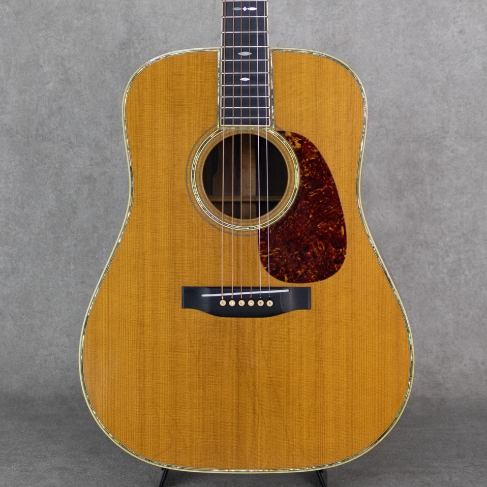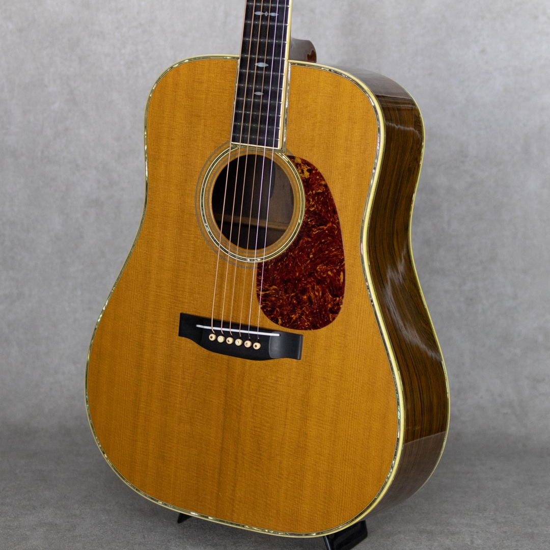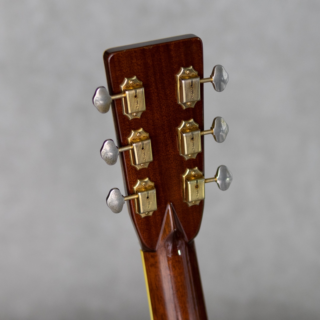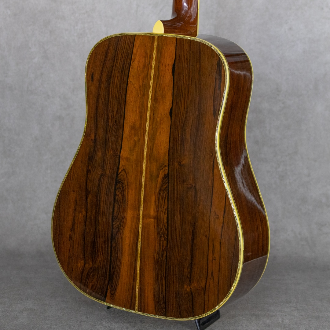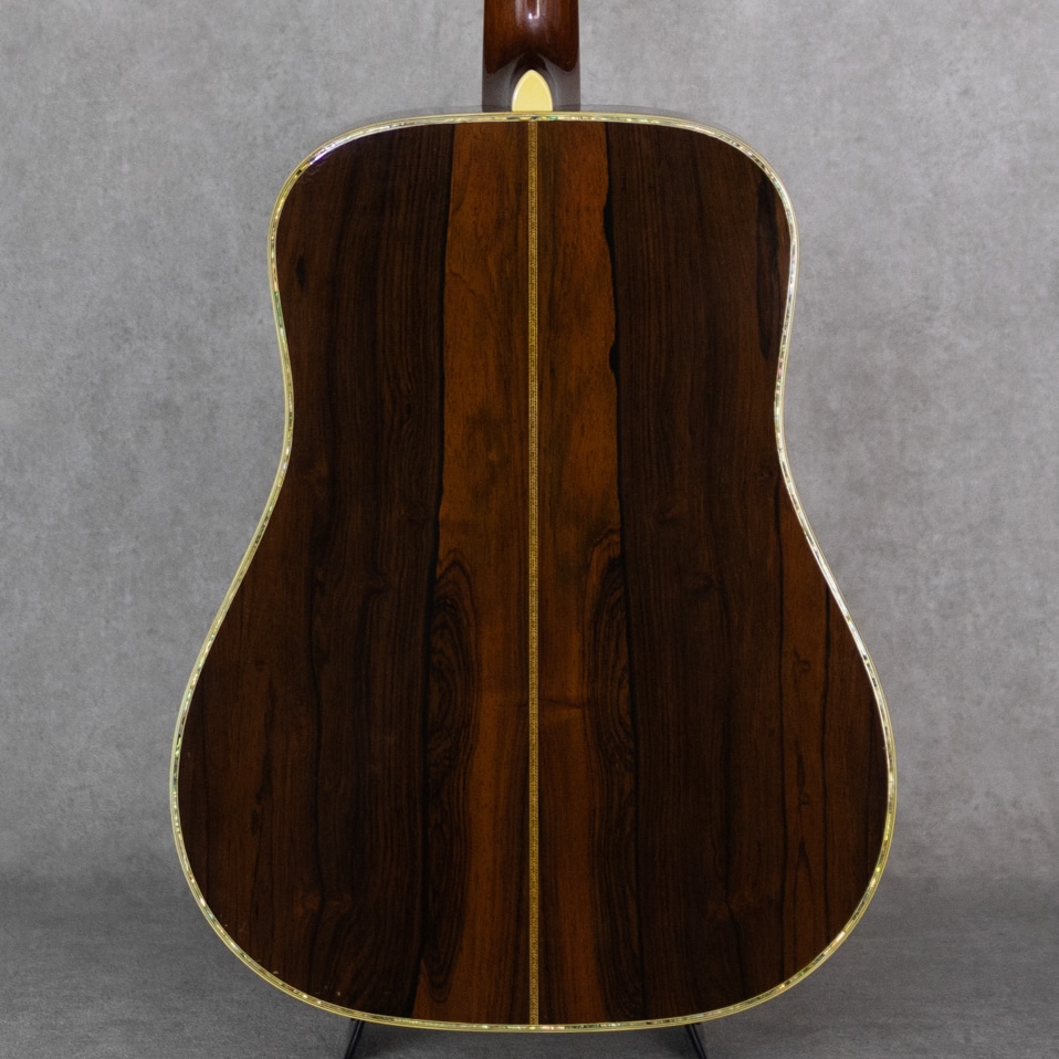 国内有数のベテランルシアー、エム・シオザキ弦楽器工房の塩崎雅亮氏による"シーガルギター"。塩崎氏は世界屈指のマーチン研究家としても知られています。塩崎氏が工房を立ち上げたのが1982年。本器は立ち上げ初期80年代製作のSD-85 Jacaranda"。スノウフレイクスのプリウォー45モデルよりインスパイアされ、独自のテイストで作り上げられています。スプルーストップ、ハカランダサイド&バック、ワンピースマホガニーネック、44.5mmナットワイド、エボニー指板&ブリッジ、クルーソンペグ、スノウフレイクス&キャッツアイ指板インレイ、トップ&サイド&バックアバロンパーフリング、アバロンロゼッタ、モザイクバックストリップ、フォワードシフテッド・スキャロップドXブレイシング、ハカランダアバロンブランドロゴ、ラッカーフィニッシュ。ダイナミックながらしなやかに伸びる低音と煌びやかな倍音による奥行のあるサウンド。繊細なタッチに対しても基音の粒立ちが良く、華やかさを持ちつつもストロークのまとまり感が心地よい弾き応え。右手の強弱にもとてもリニアに反応したボリュームをアウトプットします。全体的に細かな小傷など多少あるものの、経年を鑑みると顕著に目立った使用感やダメージはなく、塗装のチェッキングや焼けが良い雰囲気の貫禄あるルックスに仕上がっています。丁寧に使われてきたことが伺え、割れやリペア歴はなくフレット残もしっかりと残っています。ネックの状態も良好で、弾きやすいセッティングでサドルの高さを残したグッドコンディション。フォルム、音色共に高い芸術性を感じさせる塩崎氏による1本。是非、お見逃しなく。ハードケース付属。