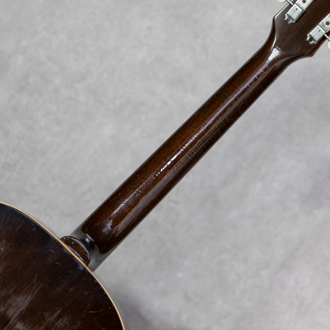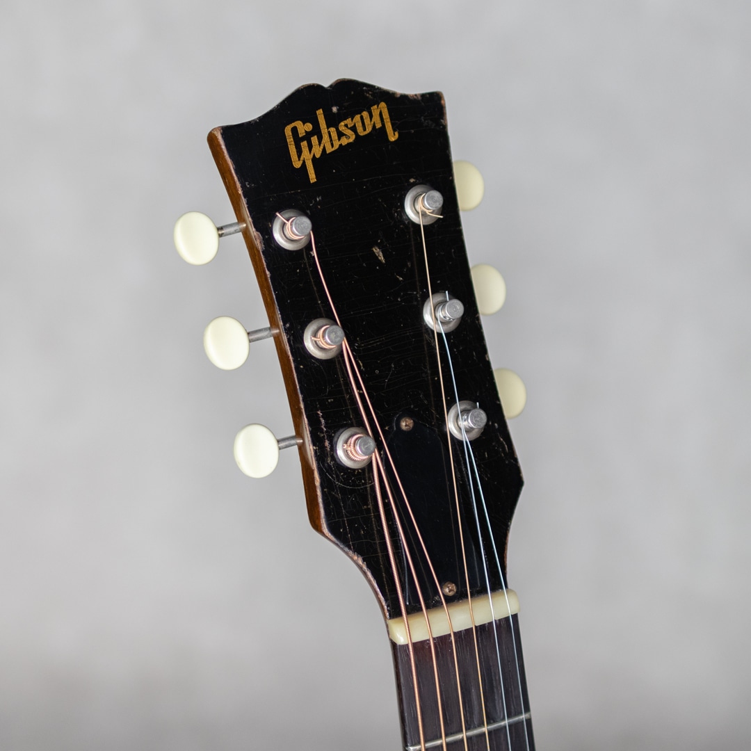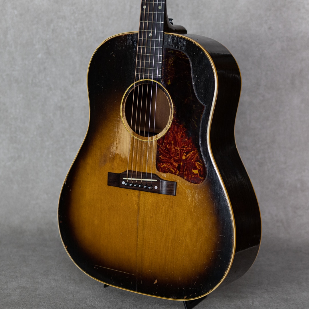 フラットトップにおけるもうひとつの憧れ、ワーキングホースGibson"J-45"。1942年に登場した"J-45"、その後幾つかのマイナーチェンジを繰り返しながらも、今尚トップシーンで欠かせないGibsonを代表するラウンドショルダーボディのジャンボモデル。本器は1955年製の1本。スプルーストップ、マホガニーサイド&バック、マホガニーネック、ハカランダ指板、シングルリングロゼッタ、スキャロップド・Xブレイシング。ペグは近年もののリプレイスメント・シングルラインクルーソンデラックスペグが搭載されています。よく弾き込まれており、肉厚で野太い響き。音量感があり、荒々しくワイルドなサウンド。乾いていながらも倍音感のあるボリューミーな1本です。経年・使用に伴い幾らかの補修歴が見られる本器。ブリッジ&ブリッジプレートのリプレイス、ピックガード交換、センターシーム補修、サウンドホール上部のクラック補修、ピックガードクラック補修、軽微なピッキングウェアのタッチアップなど。ネックも良好で、リフレットされたフレット残りもしっかりとあります。しかしながら致命傷はなく大きく損なう割れやエグレなども見られず、しっかりとお使いいただきたい1本です。まだまだ現役のオリジナル”J-45”。ビンテージをガシガシかき鳴らしてプレイされたい方、、是非お見逃しなく。。ハードケース付属。その他補修履歴など、詳細はお問い合わせください。