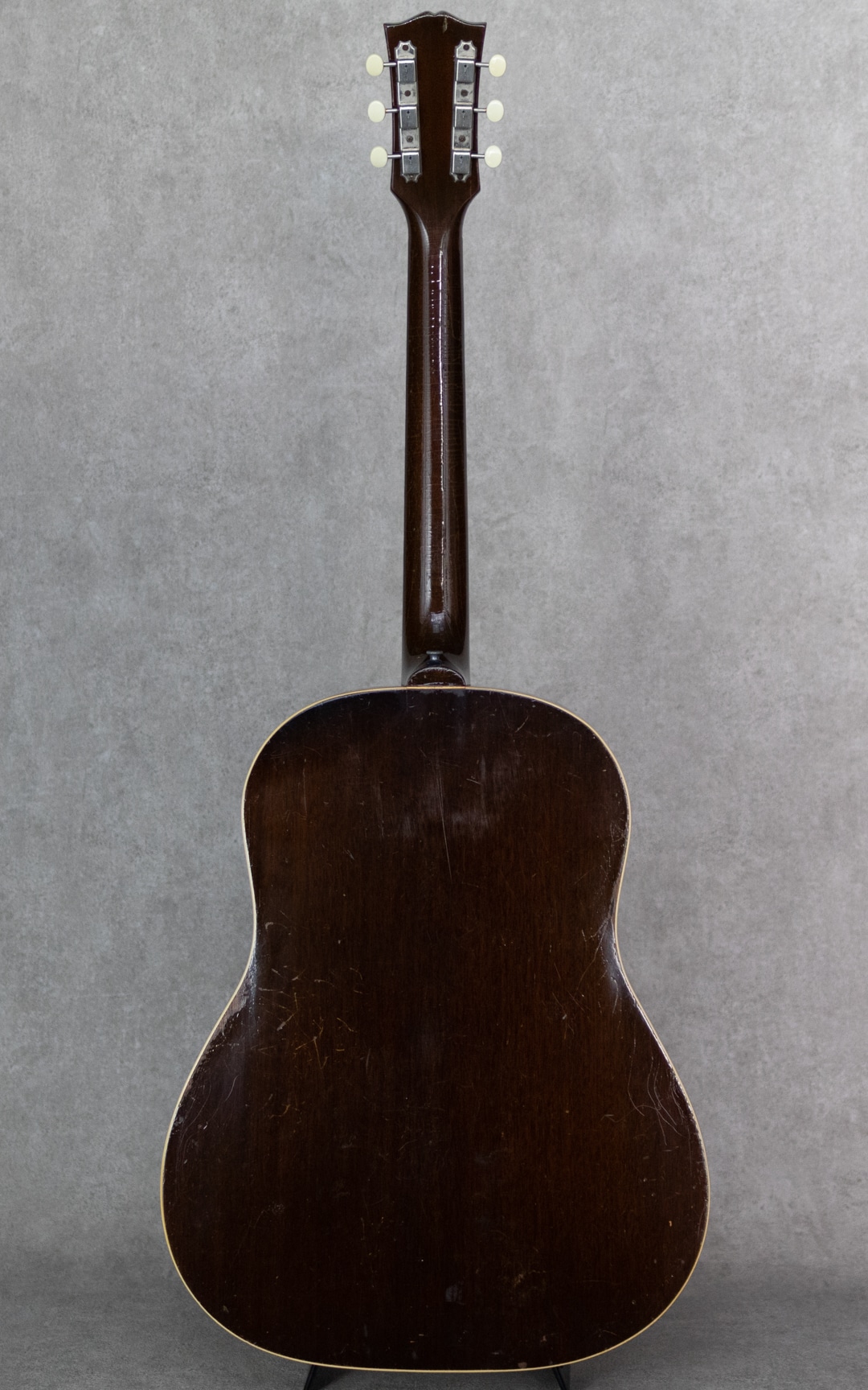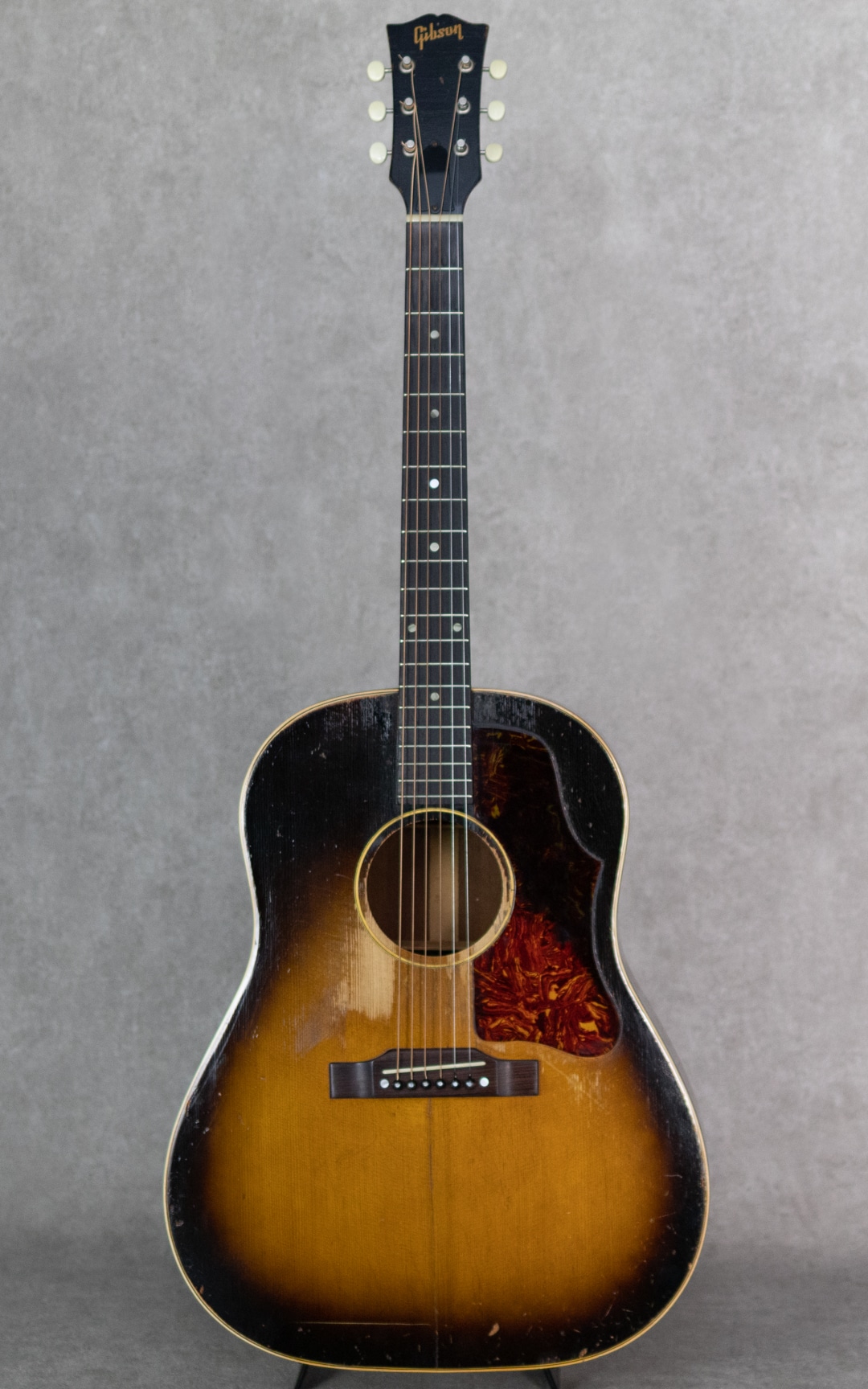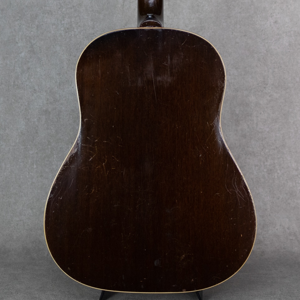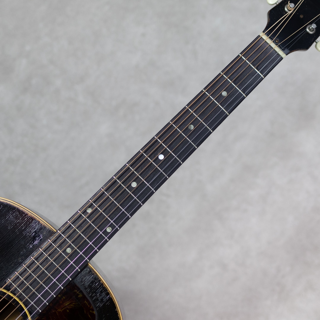 フラットトップにおけるもうひとつの憧れ、ワーキングホースGibson"J-45"。1942年に登場した"J-45"、その後幾つかのマイナーチェンジを繰り返しながらも、今尚トップシーンで欠かせないGibsonを代表するラウンドショルダーボディのジャンボモデル。本器は1955年製の1本。スプルーストップ、マホガニーサイド&バック、マホガニーネック、ハカランダ指板、シングルリングロゼッタ、スキャロップド・Xブレイシング。ペグは近年もののリプレイスメント・シングルラインクルーソンデラックスペグが搭載されています。よく弾き込まれており、肉厚で野太い響き。音量感があり、荒々しくワイルドなサウンド。乾いていながらも倍音感のあるボリューミーな1本です。経年・使用に伴い幾らかの補修歴が見られる本器。ブリッジ&ブリッジプレートのリプレイス、ピックガード交換、センターシーム補修、サウンドホール上部のクラック補修、ピックガードクラック補修、軽微なピッキングウェアのタッチアップなど。ネックも良好で、リフレットされたフレット残りもしっかりとあります。しかしながら致命傷はなく大きく損なう割れやエグレなども見られず、しっかりとお使いいただきたい1本です。まだまだ現役のオリジナル”J-45”。ビンテージをガシガシかき鳴らしてプレイされたい方、、是非お見逃しなく。。ハードケース付属。その他補修履歴など、詳細はお問い合わせください。