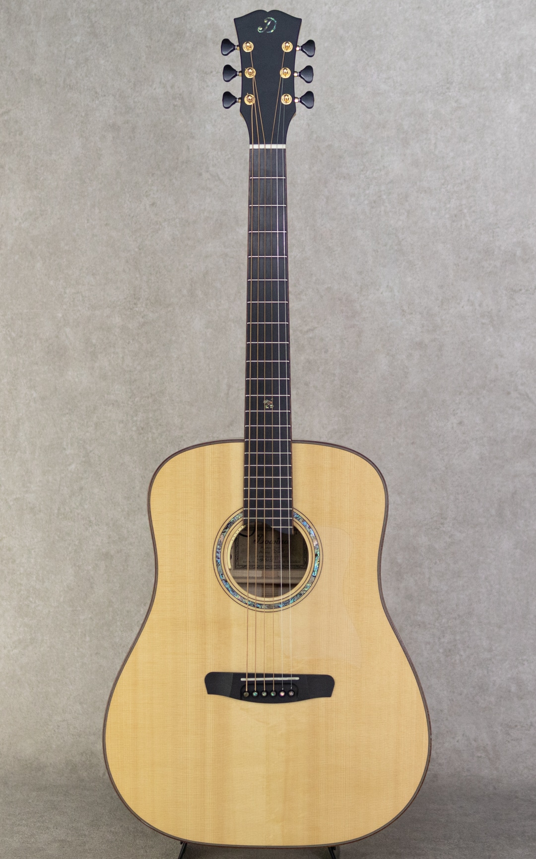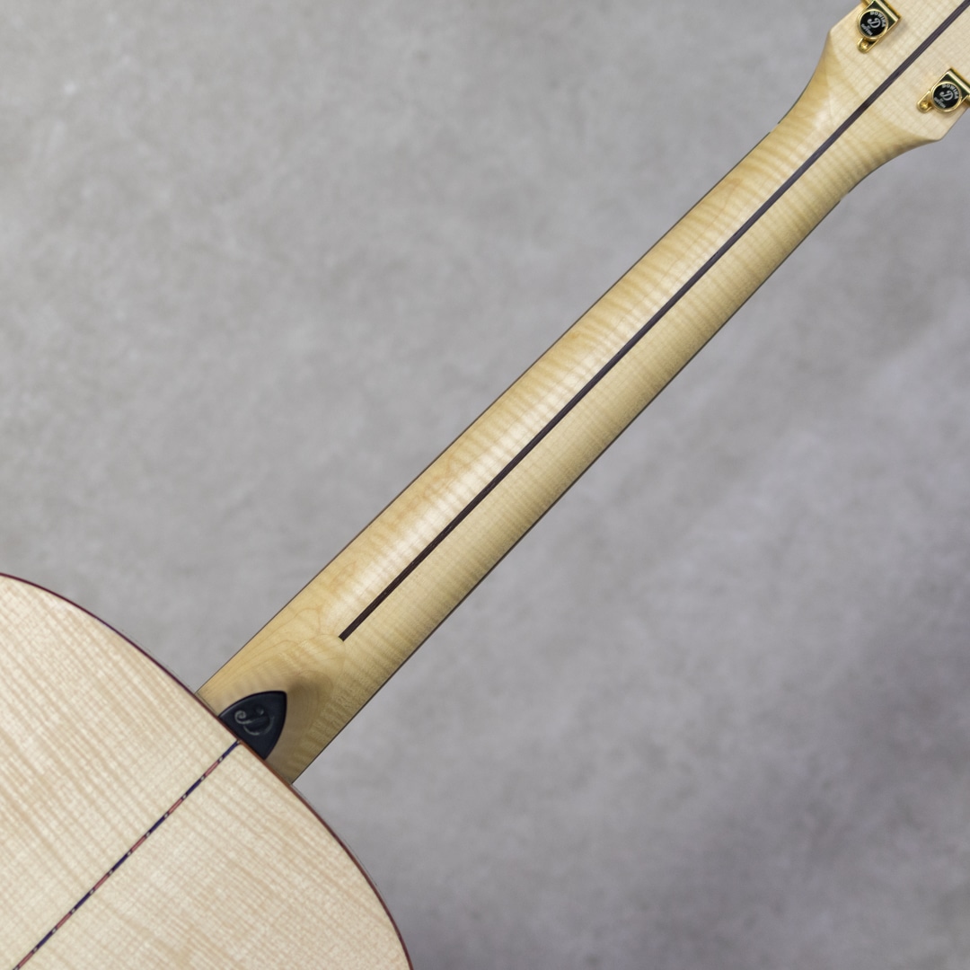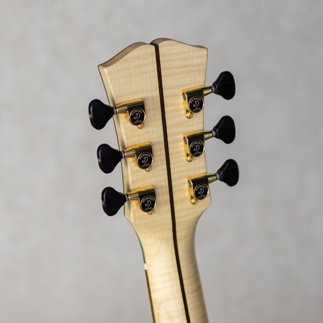 東欧のスロバキアに工房を構えるギターブランド"Dowina(ドウィナ)"。本器はトップルシアー数人が全てを手掛けるフラッグシップ・モデル、マスター・シリーズ、"ACERO(アチェロ)"モデル。ドレッドノウトボディ、ドロミテ・スプルーストップ、ソリッドフレイムメイプルサイド&バック、1pcフレイムメイプルネック、エボニー指板、エボニーブリッジ、L.R.Baggs Anthem搭載。トップは艶のあるグロス仕上げ、ネック裏とサイド&バックは艶無しサテン仕上げになっております。トップのドロミテスプルースは、北イタリアはアルプス・ドロミテ地方で産出される材で、古くから弦楽器の表板として使われ、ストラディバリがこの木を使っていたことでも知られています。白く端麗な外観にも想像が難くないオープンでクリアな出音、綺麗な高音域が魅力的なキャラクターで、ピッキングへのレスポンスも良く幅豊かな表現を可能にしてくれるポテンシャルを持った材。モデル名の"ACERO(アチェロ)"はイタリア語の楓からとられており、ネック、ボディサイド&バックと美しいフレイムメイプルを採用。タイトでコシのある低音には適度な暖かさもあり、全体的に透明感のある爽やかなトーンながら軽薄な印象は感じさせないバランスに仕上がっています。こちら軽微な拭き傷程度の使用感はございますが、顕著に目立ったダメージはございません。フレットの摩耗も少なく、良好なネックコンディション。L.R.Baggs Anthem搭載で実用性の幅も広い一本。ぜひご確認ください。オリジナルのハードケースが付属。