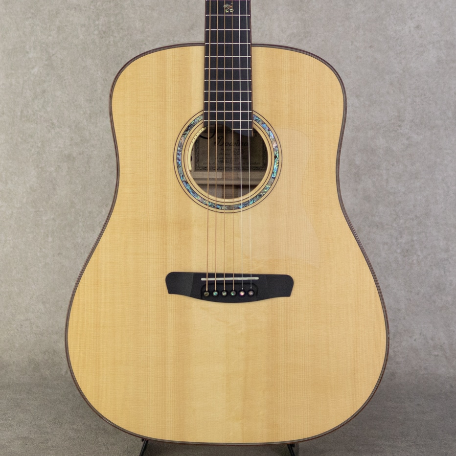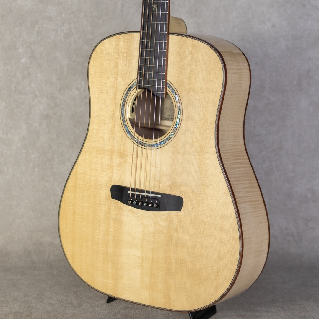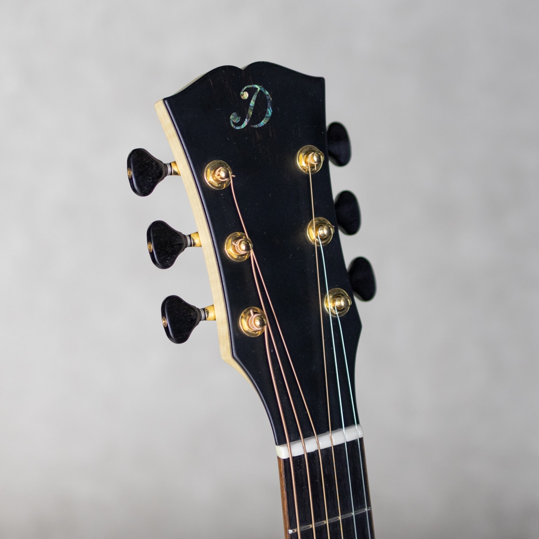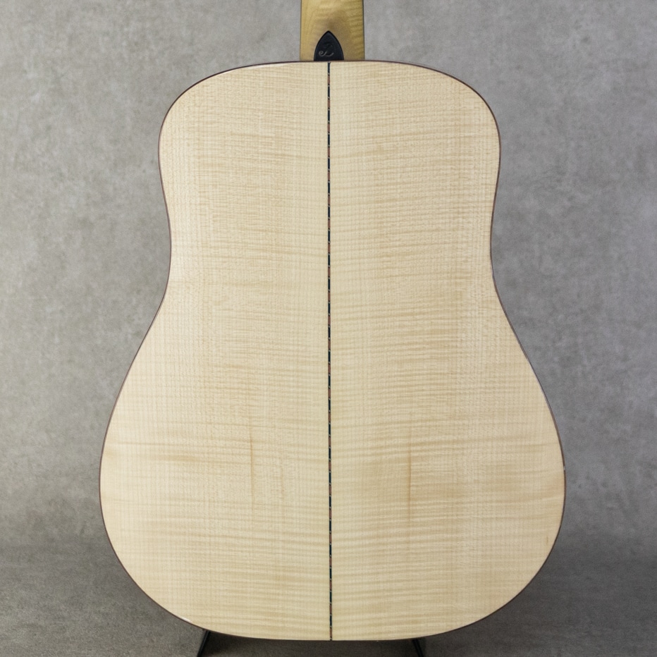 東欧のスロバキアに工房を構えるギターブランド"Dowina(ドウィナ)"。本器はトップルシアー数人が全てを手掛けるフラッグシップ・モデル、マスター・シリーズ、"ACERO(アチェロ)"モデル。ドレッドノウトボディ、ドロミテ・スプルーストップ、ソリッドフレイムメイプルサイド&バック、1pcフレイムメイプルネック、エボニー指板、エボニーブリッジ、L.R.Baggs Anthem搭載。トップは艶のあるグロス仕上げ、ネック裏とサイド&バックは艶無しサテン仕上げになっております。トップのドロミテスプルースは、北イタリアはアルプス・ドロミテ地方で産出される材で、古くから弦楽器の表板として使われ、ストラディバリがこの木を使っていたことでも知られています。白く端麗な外観にも想像が難くないオープンでクリアな出音、綺麗な高音域が魅力的なキャラクターで、ピッキングへのレスポンスも良く幅豊かな表現を可能にしてくれるポテンシャルを持った材。モデル名の"ACERO(アチェロ)"はイタリア語の楓からとられており、ネック、ボディサイド&バックと美しいフレイムメイプルを採用。タイトでコシのある低音には適度な暖かさもあり、全体的に透明感のある爽やかなトーンながら軽薄な印象は感じさせないバランスに仕上がっています。こちら軽微な拭き傷程度の使用感はございますが、顕著に目立ったダメージはございません。フレットの摩耗も少なく、良好なネックコンディション。L.R.Baggs Anthem搭載で実用性の幅も広い一本。ぜひご確認ください。オリジナルのハードケースが付属。