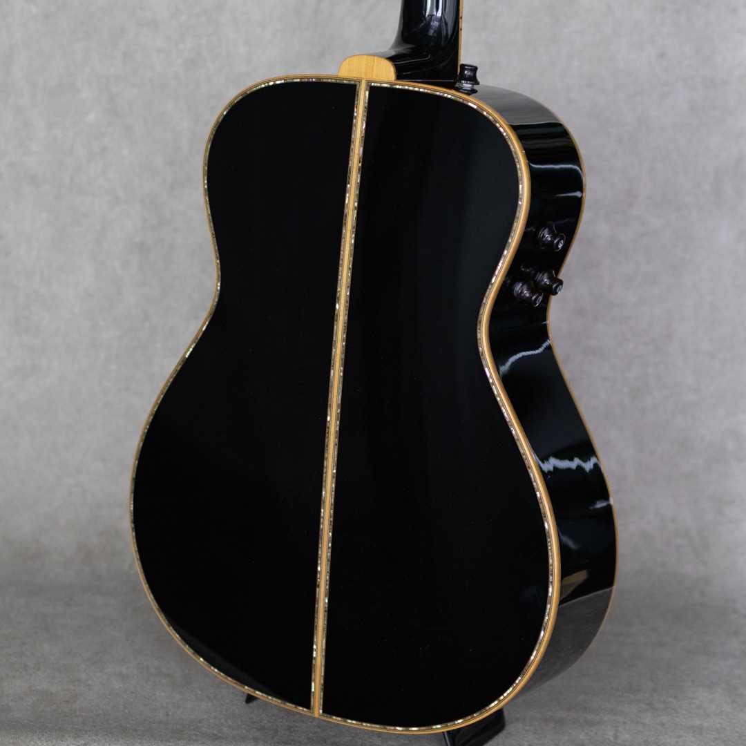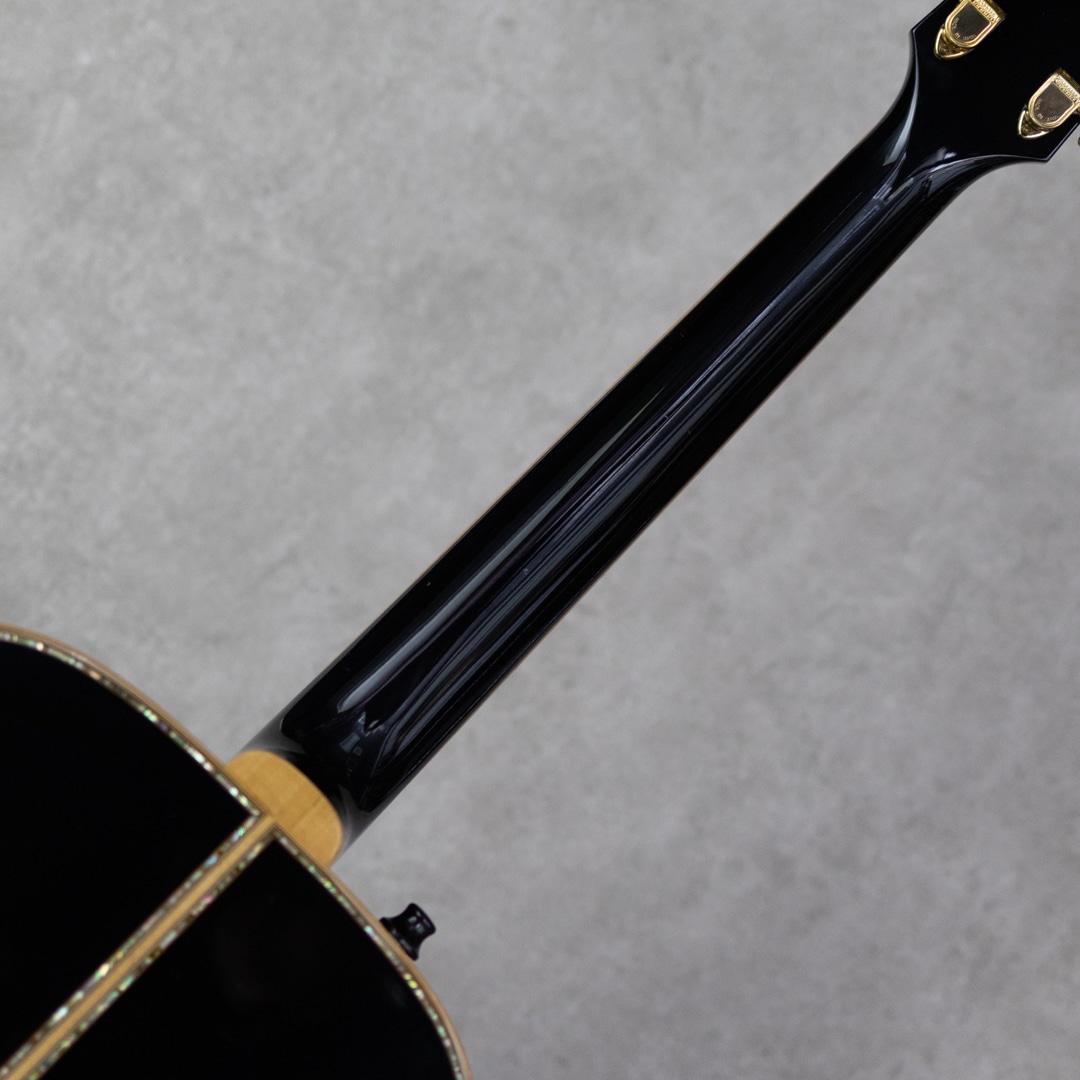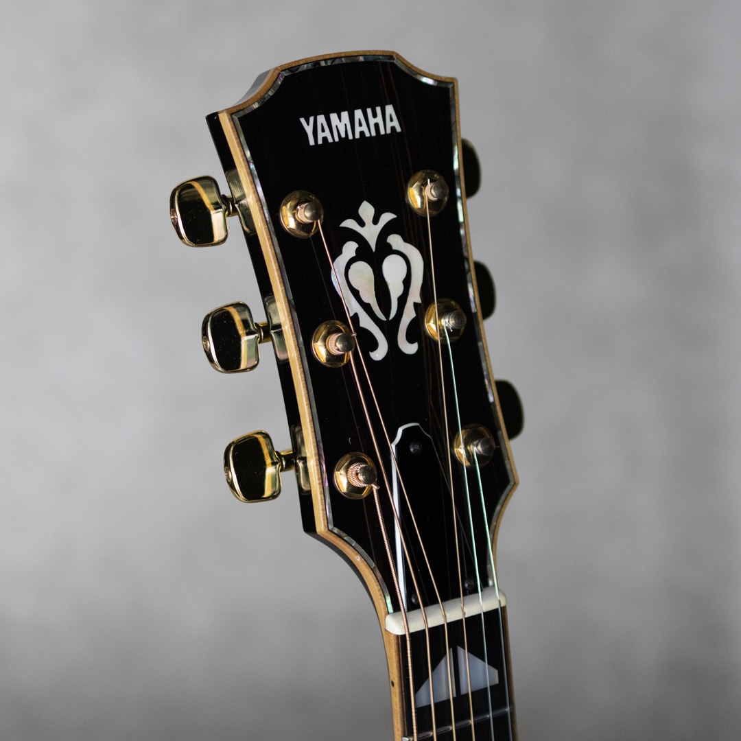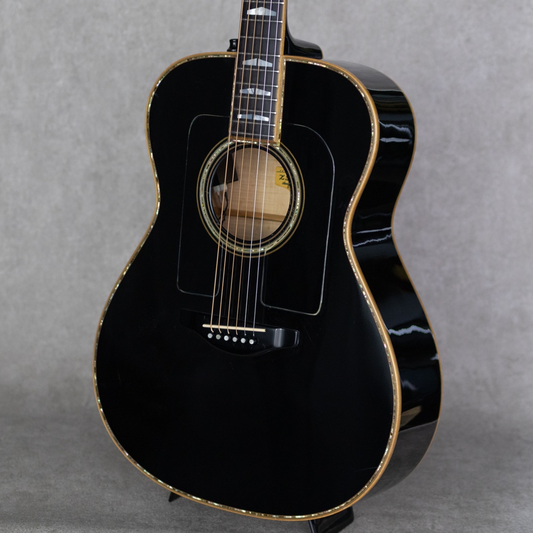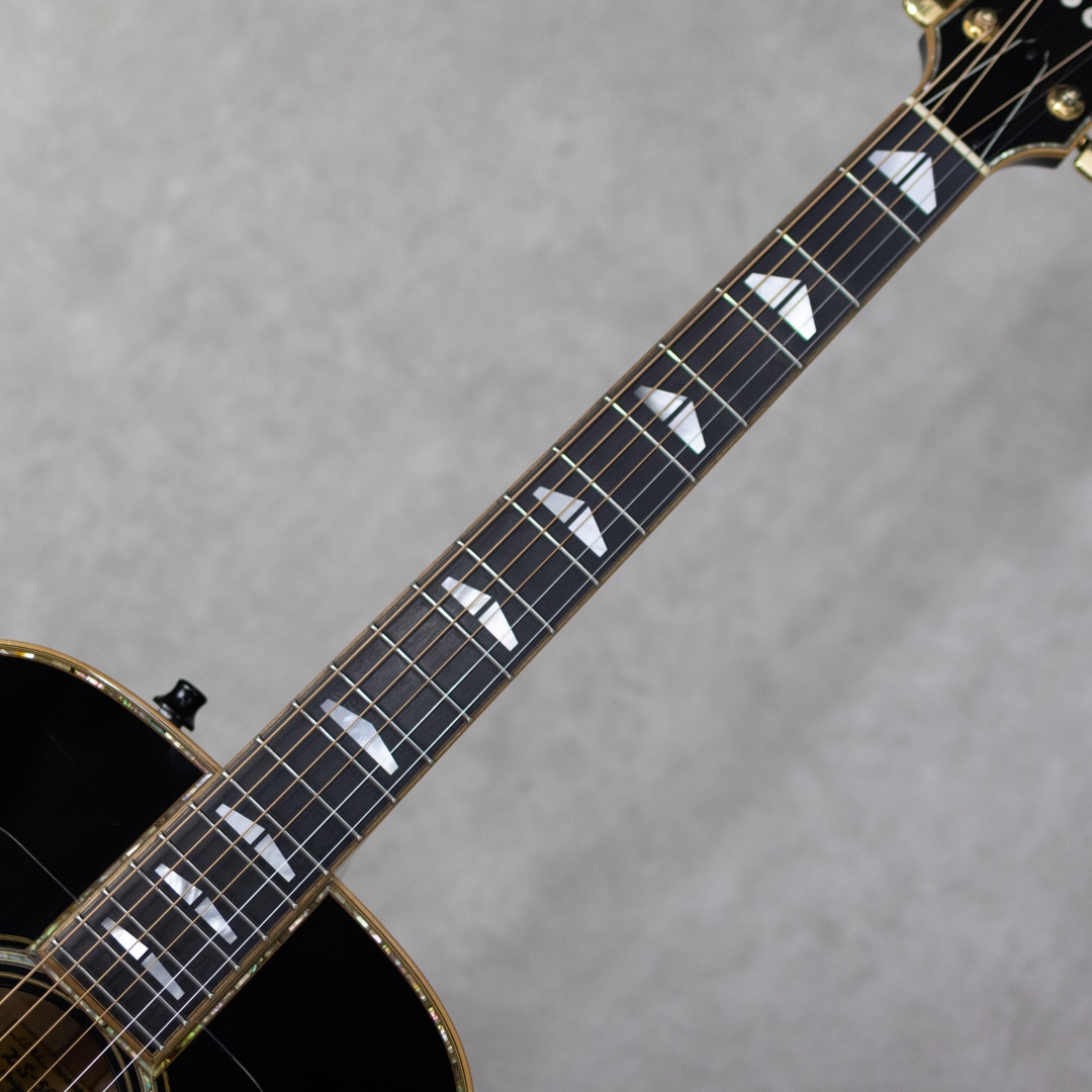 1982年のわずか半年のみ生産されていたファン垂涎のレアモデル”XS-56E”。2wayオリジナルピックアップを持つ渋いブラックフェイスのテリー中本がデザインしたエレアコモデル。本器は、1982年製USED品。スプルーストップ、メイプルサイド&バック、メイプルネック、黒檀指板&ブリッジ、TM50Gペグ、アバロントリムパーフリング&ロゼッタ、メイプルバインディング、白蝶貝&アバロン指板インレイ、透明ピックガード、ヤマハオリジナル・2wayアコースティックセンサーピックアップ。当時”XS"の名前で発表されたヤマハオリジナル・セミジャンボシリーズの最高級機種で、ボディの中の革ラベルにはテリー中本氏のサインが入っています。ヤマハ独特の漆黒カラーをまとった渋いブラックフェイスの”XS”。野太く芯のあるヤマハメイプルサウンド。しっかりと弾き込まれており反応もよく、大音量で倍音豊かな響きを魅せてくれます。サスティンに富んだトーンは、減衰の最後までキラキラと響き渡ってくれます。また30数年前のピックアップシステムですがその完成度は高く、システムもシンプルながら多彩なサウンドメイクを可能にする本システム。側板にマスターボリューム、トレブル、ベース、のツマミがあり、2種類のピックアップセンサーのミックスのツマミが別に1つあるレイアウトになっています。ちょこちょこと多少の小傷や弾き傷は見受けられますが、板割れなどの致命傷はなく良好。またネックやフレットまわりのコンディションも良好でプレイコンディションもグッドです。塗装補修の様な幾らかの塗装ムラなどが見られますが、経年数からすれば全体的なコンディションはキレイに保たれている方ではないでしょうか。極めて短命に終わってしまったモデルですが今なおファンの方は多く、コレクターの中でも呼び声高いヤマハレアモデルのひとつ。滅多に市場にも出まわりませんので、是非要チェックください。オリジナルハードケースも付属します。その他の詳細や修理履歴などもお気軽にお問い合わせください。